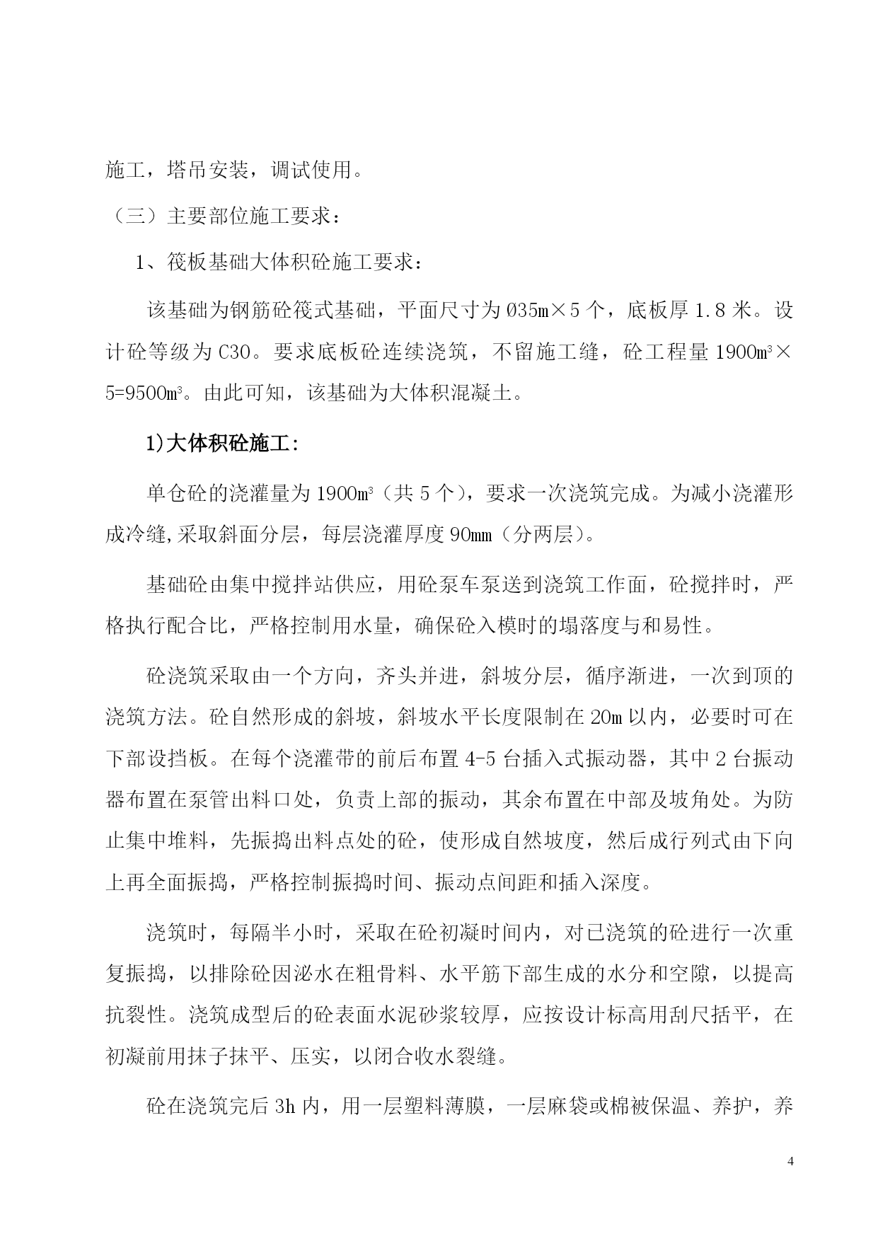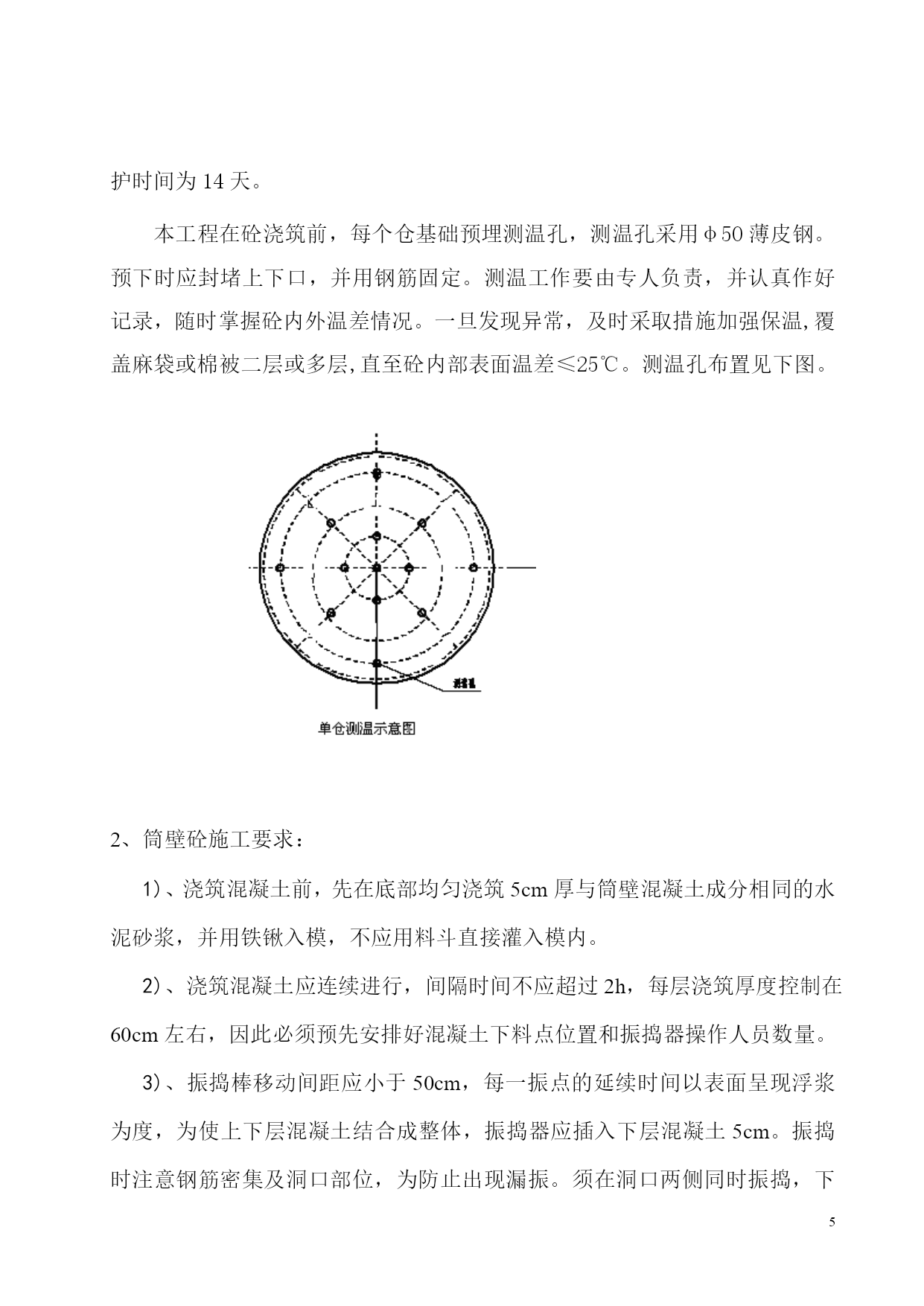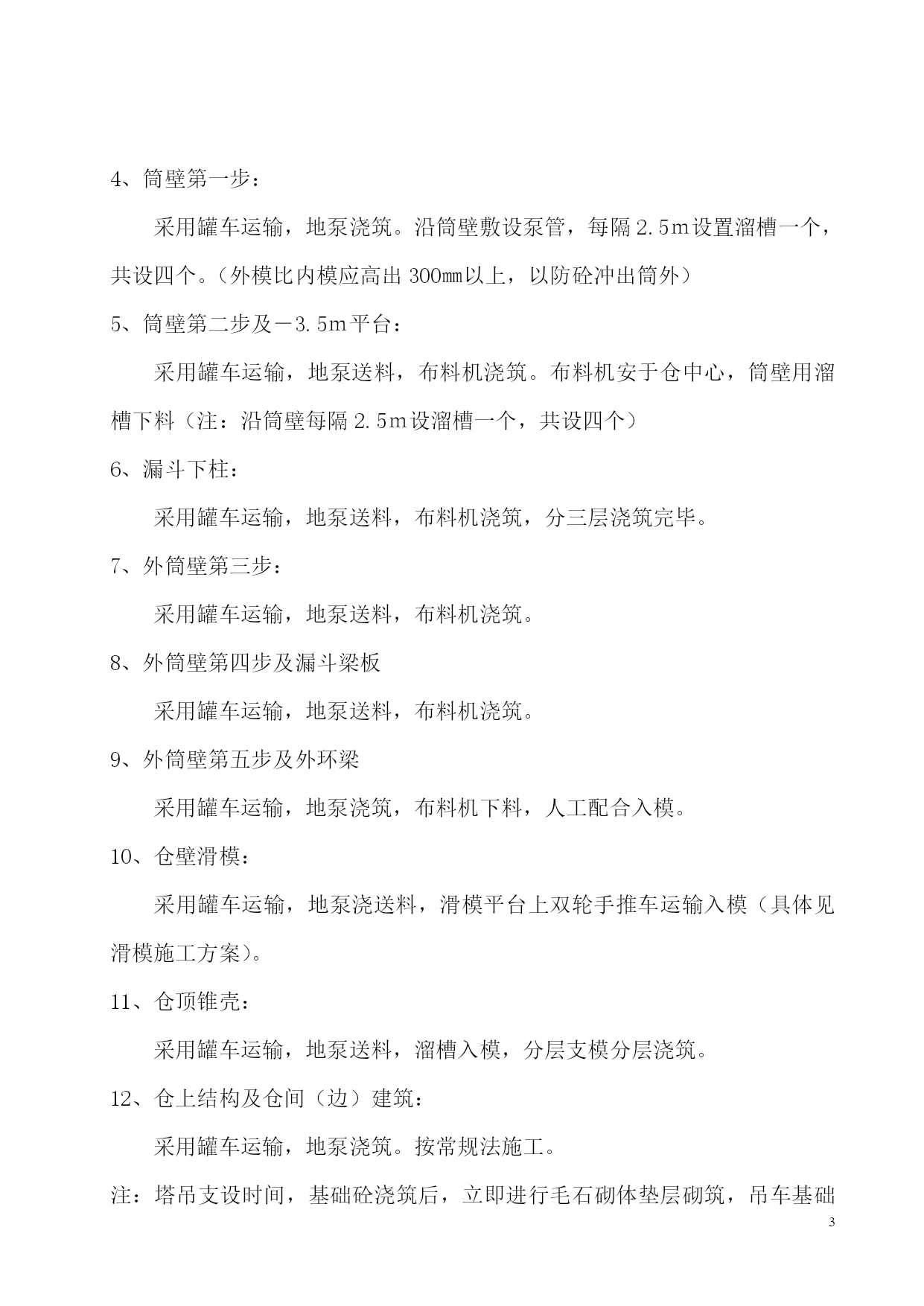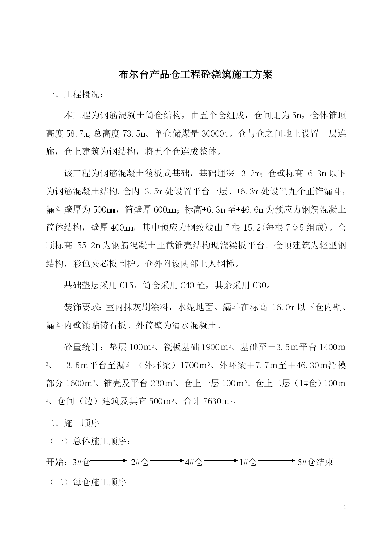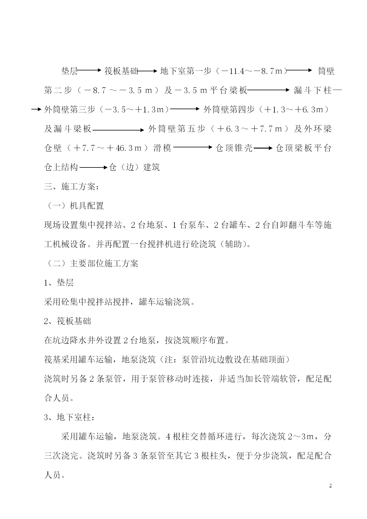 布尔台产品仓工程砼浇筑施工方案一、工程概况:本工程为钢筋混凝土筒仓结构,由五个仓组成,仓间距为5m,仓体锥顶高度58.7m,总高度73.5m。单仓储煤量30000t。仓与仓之间地上设置一层连廊,仓上建筑为钢结构,将五个仓连成整体。该工程为钢筋混凝土筏板式基础,基础埋深13.2m;仓壁标高+6.3m以下为钢筋混凝土结构,仓内-3.5m处设置平台一层、+6.3m处设置九个正锥漏斗,漏斗壁厚为500mm,筒壁厚600mm;标高+6.3m至+46.6m为预应力钢筋混凝土筒体结构,壁厚400mm,其中预应力钢绞线由7根15.2(每根7φ5组成)。仓顶标高+55.2m为钢筋混凝土正截锥壳结构现浇梁板平台。仓顶建筑为轻型钢结构,彩色夹芯板围护。仓外附设两部上人钢梯。基础垫层采用C15,筒仓采用C40砼,其余采用C30。装饰要求:室内抹灰刷涂料,水泥地面。漏斗在标高+16.0m以下仓内壁、漏斗内壁镶贴铸石板。外筒壁为清水混凝土。砼量统计:垫层100m3、筏板基础1900m3、基础至-3.5m平台1400m3、-3.5m平台至漏斗(外环梁)1700m3、外环梁+7.7m至+46.30m滑模部分1600m3、锥壳及平台230m3、仓上一层100m3、仓上二层(1#仓)100m3、仓间(边)建筑及其它500m3、合计7630m3。二、施工顺序(一)总体施工顺序:开始:3#仓2#仓4#仓1#仓5#仓结束(二)每仓施工顺序垫层筏板基础地下室第一步(-11.4~-8.7m)筒壁第二步(-8.7~-3.5m)及-3.5m平台梁板漏斗下柱外筒壁第三步(-3.5~+1.3m)外筒壁第四步(+1.3~+6.3m)及漏斗梁板外筒壁第五步(+6.3~+7.7m)及外环梁仓壁(+7.7~+46.3m)滑模仓顶锥壳仓顶梁板平台仓上结构仓(边)建筑三、施工方案:(一)机具配置现场设置集中搅拌站、2台地泵、1台泵车、2台罐车、2台自卸翻斗车等施工机械设备。并再配置一台搅拌机进行砼浇筑(辅助)。(二)主要部位施工方案1、垫层采用砼集中搅拌站搅拌,罐车运输浇筑。2、筏板基础在坑边降水井外设置2台地泵,按浇筑顺序布置。筏基采用罐车运输,地泵浇筑(注:泵管沿坑边敷设在基础顶面)浇筑时另备2条泵管,用于泵管移动时连接,并适当加长管端软管,配足配合人员。3、地下室柱:采用罐车运输,地泵浇筑。4根柱交替循环进行,每次浇筑2~3m,分三次浇完。浇筑时另备3条泵管至其它3根柱头,便于分步浇筑,配足配合人员。4、筒壁第一步:采用罐车运输,地泵浇筑。沿筒壁敷设泵管,每隔2.5m设置溜槽一个,共设四个。(外模比内模应高出300㎜以上,以防砼冲出筒外)5、筒壁第二步及-3.5m平台:采用罐车运输,地泵送料,布料机浇筑。布料机安于仓中心,筒壁用溜槽下料(注:沿筒壁每隔2.5m设溜槽一个,共设四个)6、漏斗下柱:采用罐车运输,地泵送料,布料机浇筑,分三层浇筑完毕。7、外筒壁第三步:采用罐车运输,地泵送料,布料机浇筑。8、外筒壁第四步及漏斗梁板采用罐车运输,地泵送料,布料机浇筑。9、外筒壁第五步及外环梁采用罐车运输,地泵浇筑,布料机下料,人工配合入模。10、仓壁滑模:采用罐车运输,地泵浇送料,滑模平台上双轮手推车运输入模(具体见滑模施工方案)。11、仓顶锥壳:采用罐车运输,地泵送料,溜槽入模,分层支模分层浇筑。12、仓上结构及仓间(边)建筑:采用罐车运输,地泵浇筑。按常规法施工。注:塔吊支设时间,基础砼浇筑后,立即进行毛石砌体垫层砌筑,吊车基础施工,塔吊安装,调试使用。(三)主要部位施工要求:1、筏板基础大体积砼施工要求:该基础为钢筋砼筏式基础,平面尺寸为Ø35m×5个,底板厚1.8米。设计砼等级为C30。要求底板砼连续浇筑,不留施工缝,砼工程量1900m3×5=9500m3。由此可知,该基础为大体积混凝土。1)大体积砼施工:单仓砼的浇灌量为1900m3(共5个),要求一次浇筑完成。为减小浇灌形成冷缝,采取斜面分层,每层浇灌厚度90mm(分两层)。基础砼由集中搅拌站供应,用砼泵车泵送到浇筑工作面,砼搅拌时,严格执行配合比,严格控制用水量,确保砼入模时的塌落度与和易性。砼浇筑采取由一个方向,齐头并进,斜坡分层,循序渐进,一次到顶的浇筑方法。砼自然形成的斜坡,斜坡水平长度限制在20m以内,必要时可在下部设挡板。在每个浇灌带的前后布置4-5台插入式振动器,其中2台振动器布置在泵管出料口处,负责上部的振动,其余布置在中部及坡角处。为防止集中堆料,先振捣出料点处的砼,使形成自然坡度,然后成行列式由下向上再全面振捣,严格控制振捣时间、振动点间距和插入深度。浇筑时,每隔半小时,采取在砼初凝时间内,对已浇筑的砼进行一次重复振捣,以排除砼因泌水在粗骨料、水平筋下部生成的水分和空隙,以提高抗裂