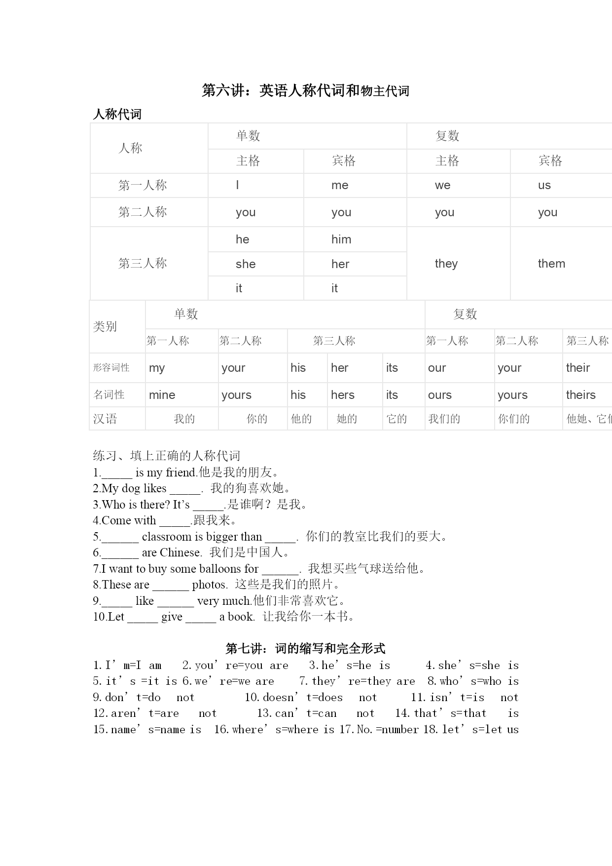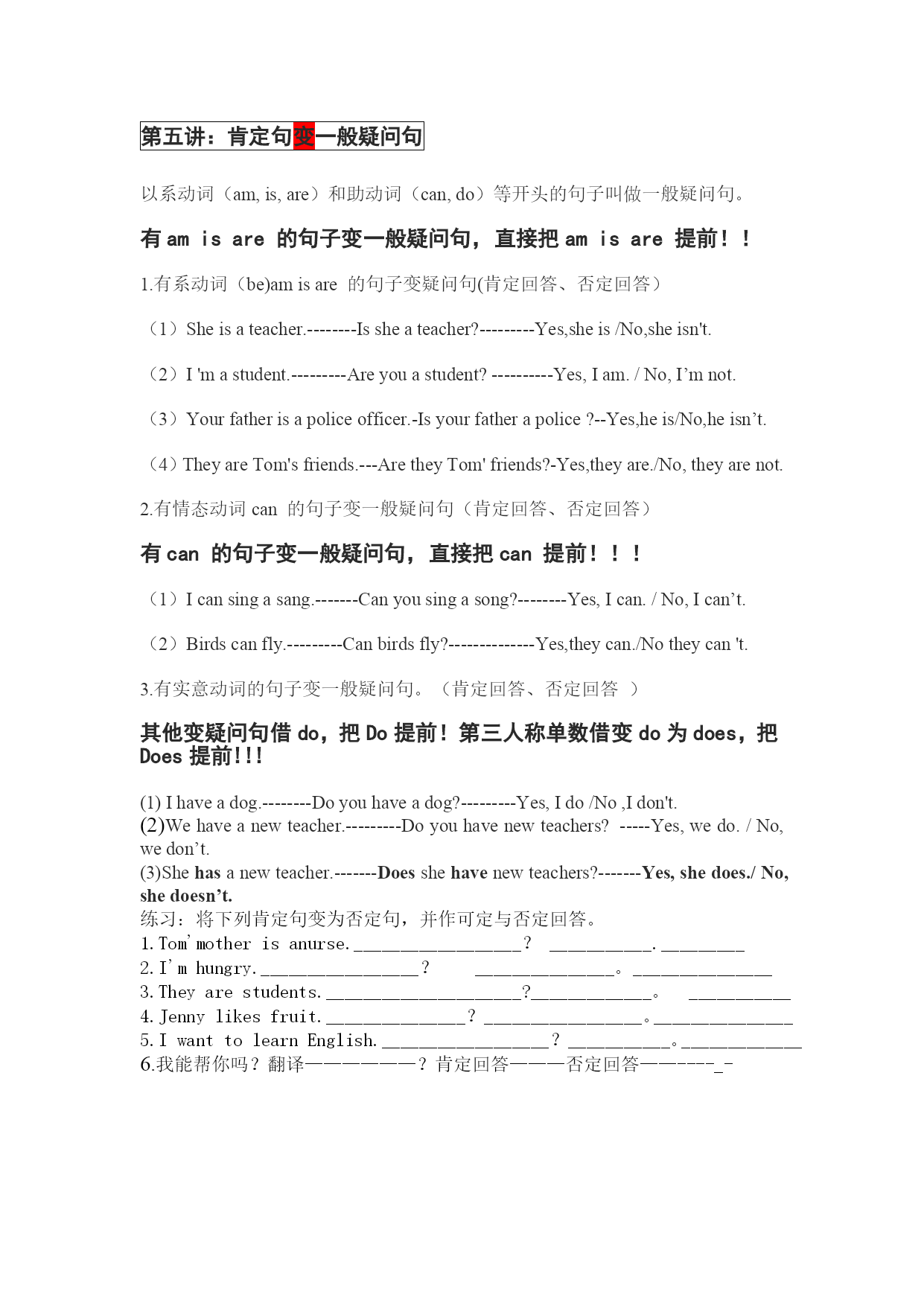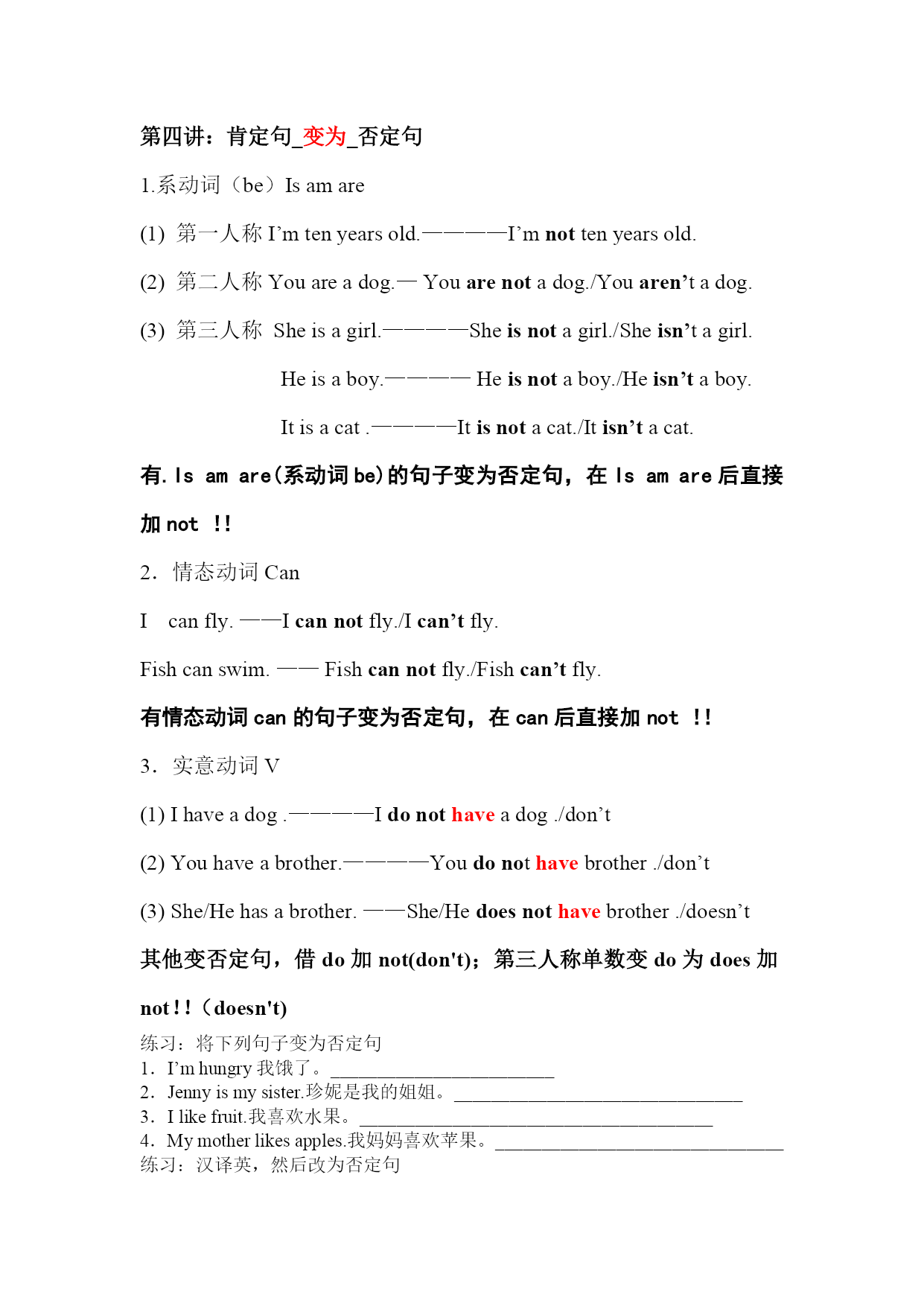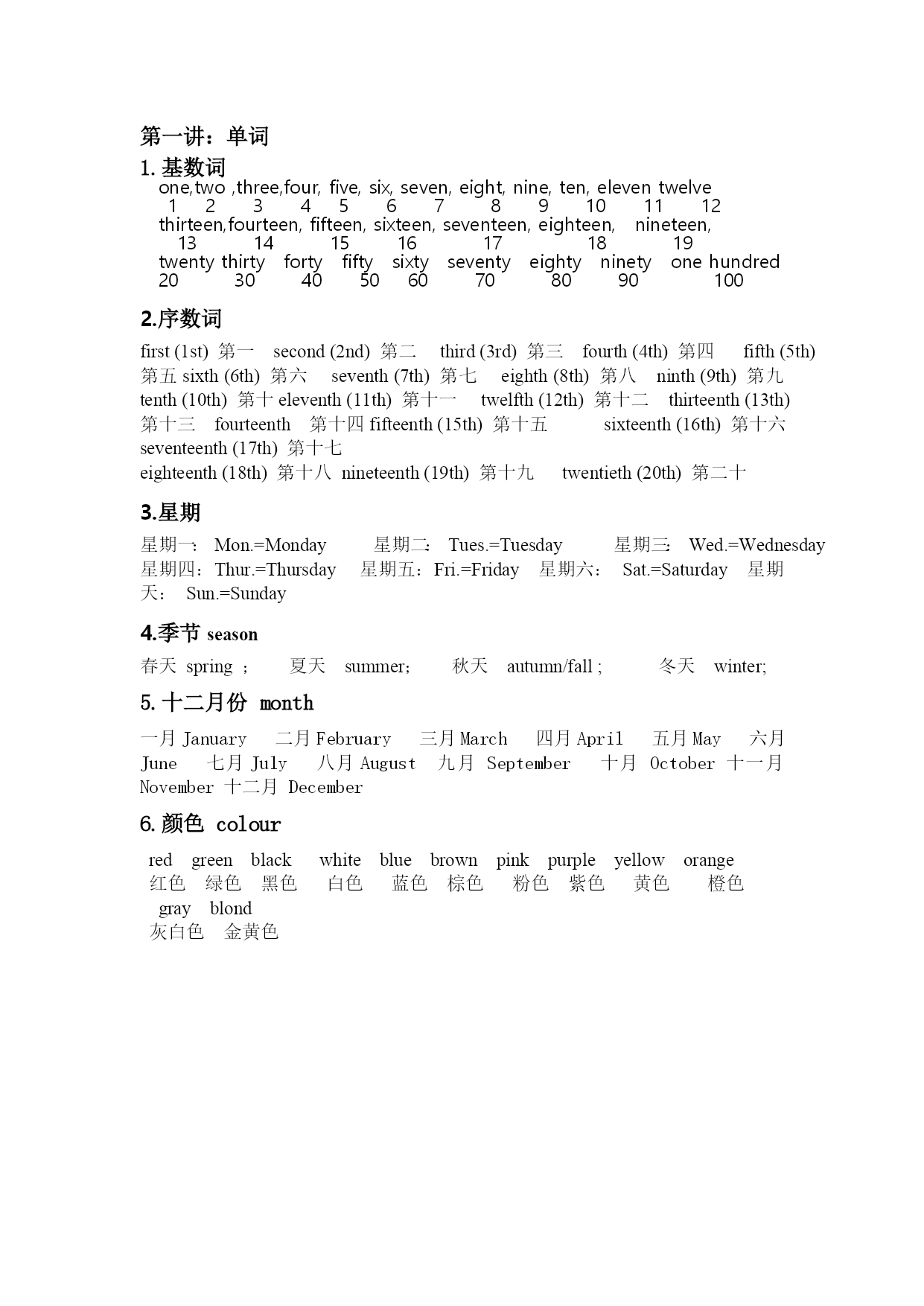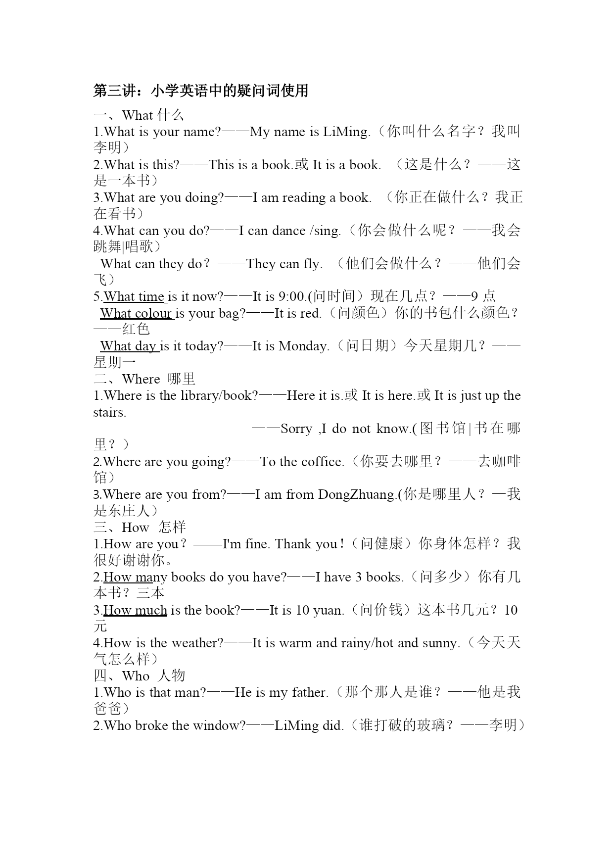 第一讲:单词1.基数词one,two,three,four,five,six,seven,eight,nine,ten,eleventwelve123456789101112thirteen,fourteen,fifteen,sixteen,seventeen,eighteen,nineteen,13141516171819twentythirtyfortyfiftysixtyseventyeightyninetyonehundred2030405060708090100序数词first(1st)第一second(2nd)第二third(3rd)第三fourth(4th)第四fifth(5th)第五sixth(6th)第六seventh(7th)第七eighth(8th)第八ninth(9th)第九tenth(10th)第十eleventh(11th)第十一twelfth(12th)第十二thirteenth(13th)第十三fourteenth第十四fifteenth(15th)第十五sixteenth(16th)第十六seventeenth(17th)第十七eighteenth(18th)第十八nineteenth(19th)第十九twentieth(20th)第二十星期星期一:Mon.=Monday星期二:Tues.=Tuesday星期三:Wed.=Wednesday星期四:Thur.=Thursday星期五:Fri.=Friday星期六:Sat.=Saturday星期天:Sun.=Sunday季节season春天spring;夏天summer;秋天autumn/fall;冬天winter;5.十二月份month一月January二月February三月March四月April五月May六月June七月July八月August九月September十月October十一月November十二月December6.颜色colourredgreenblackwhitebluebrownpinkpurpleyelloworange红色绿色黑色白色蓝色棕色粉色紫色黄色橙色grayblond灰白色金黄色第三讲:小学英语中的疑问词使用What什么Whatisyourname?——MynameisLiMing.(你叫什么名字?我叫李明)Whatisthis?——Thisisabook.或Itisabook.(这是什么?——这是一本书)Whatareyoudoing?——Iamreadingabook.(你正在做什么?我正在看书)Whatcanyoudo?——Icandance/sing.(你会做什么呢?——我会跳舞|唱歌)Whatcantheydo?——Theycanfly.(他们会做什么?——他们会飞)Whattimeisitnow?——Itis9:00.(问时间)现在几点?——9点Whatcolourisyourbag?——Itisred.(问颜色)你的书包什么颜色?——红色Whatdayisittoday?——ItisMonday.(问日期)今天星期几?——星期一Where哪里Whereisthelibrary/book?——Hereitis.或Itishere.或Itisjustupthestairs.——Sorry,Idonotknow.(图书馆|书在哪里?)Whereareyougoing?——Tothecoffice.(你要去哪里?——去咖啡馆)Whereareyoufrom?——IamfromDongZhuang.(你是哪里人?—我是东庄人)How怎样Howareyou?——I'mfine.Thankyou!(问健康)你身体怎样?我很好谢谢你。Howmanybooksdoyouhave?——Ihave3books.(问多少)你有几本书?三本Howmuchisthebook?——Itis10yuan.(问价钱)这本书几元?10元Howistheweather?——Itiswarmandrainy/hotandsunny.(今天天气怎么样)Who人物Whoisthatman?——Heismyfather.(那个那人是谁?——他是我爸爸)Whobrokethewindow?——LiMingdid.(谁打破的玻璃?——李明)第四讲:肯定句_变为_否定句1.系动词(be)Isamare(1)第一人称I’mtenyearsold.————I’mnottenyearsold.(2)第二人称Youareadog.—Youarenotadog./Youaren’tadog.(3)第三人称Sheisagirl.————Sheisnotagirl./Sheisn’tagirl.Heisaboy.————Heisnotaboy./Heisn’