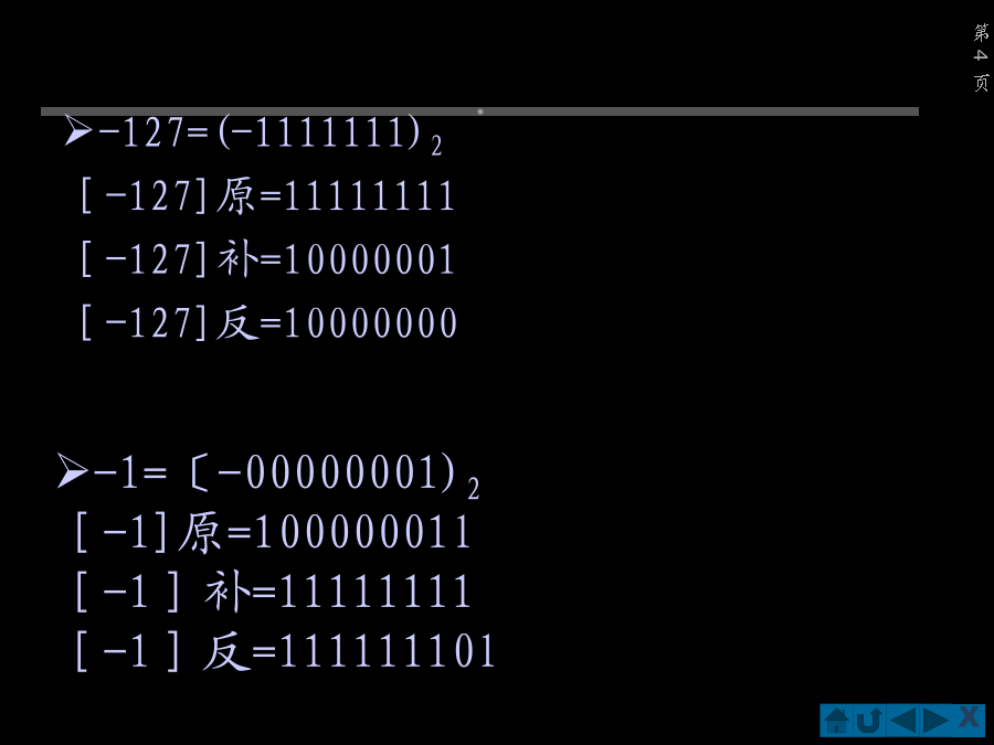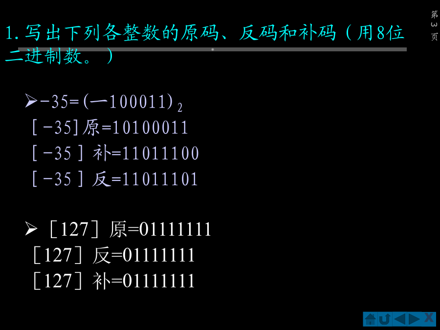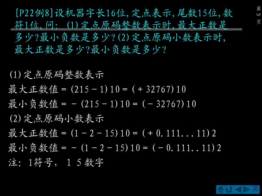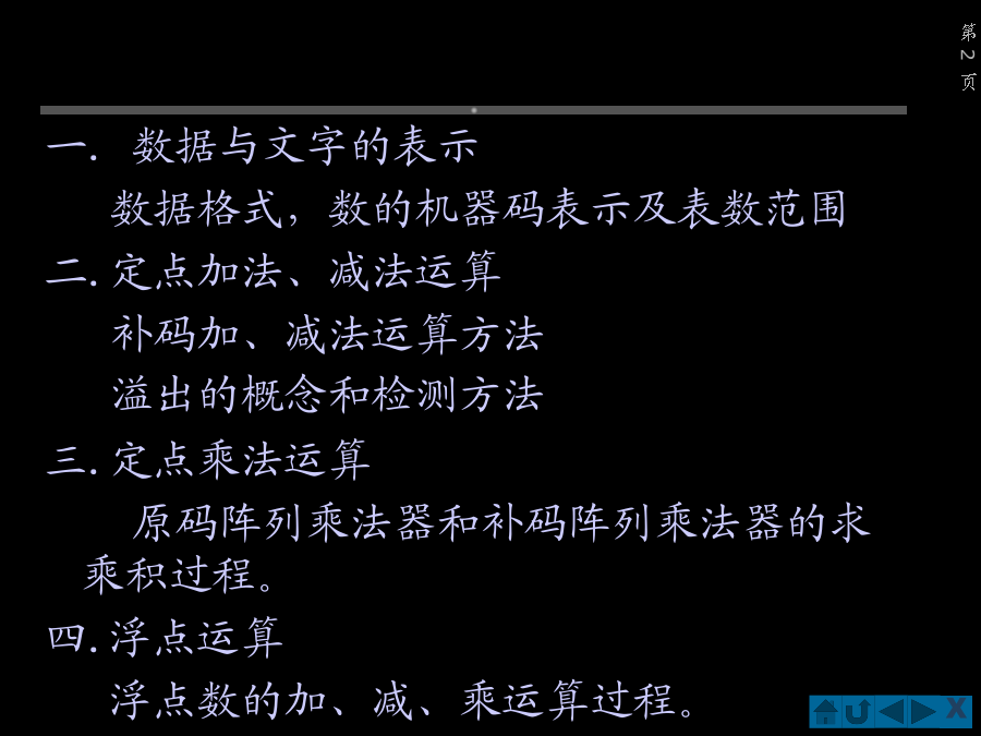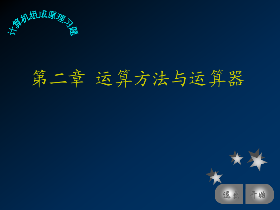 第二章运算方法与运算器一.数据与文字的表示数据格式,数的机器码表示及表数范围二.定点加法、减法运算补码加、减法运算方法溢出的概念和检测方法三.定点乘法运算原码阵列乘法器和补码阵列乘法器的求乘积过程。四.浮点运算浮点数的加、减、乘运算过程。1.写出下列各整数的原码、反码和补码(用8位二进制数。)-127=(-1111111)2[-127]原=11111111[-127]补=10000001[-127]反=10000000[P22例8]设机器字长16位,定点表示,尾数15位,数符1位,问:(1)定点原码整数表示时,最大正数是多少?最小负数是多少?(2)定点原码小数表示时,最大正数是多少?最小负数是多少?[例].在IEEE754标准中,一个规格化的32位浮点数x的真值表示为:(1)27/64=0.011011=1.1011*2-2E=-2+127=125=01111101S=0M=1011000000000000000000010111110110110000000000000000000【例】用变形补码计算x+y,同时指出结果是否溢出。(3)X=-10110y=-00001求x+y[x]补1101010+[y]补1111111_________________[x+y]补1101001【例】已知x和y,用变形补码计算x-y(3)X=11011y=-10011求x-y[x]补0011011+[-y]补0010011_________________[x-y]补0101110【例】.用原码阵列乘法器,补码阵乘法器计算x*y.解:X=11011y=-11111[x]补=011011[y]补=100001乘积符号位单独运算:xf⊕yf=1算前求补输出后:|x|=11011|y|=11111解:X=-11111y=-11011[x]原=111111[y]原=111011乘积符号位单独运算:xf⊕yf=0算前求补输出后:|x|=11111|y|=11011解:X=-11111y=-11011[x]补=100001[y]补=100101乘积符号位单独运算:xf⊕yf=0算前求补输出后:|x|=11111|y|=11011【例】x=0.1101*201y=-0.1010*211尾数和阶符都采用补码表示,都采用双符号位表示法。求x+y[x]浮=0001,00.1101[y]浮=0011,11.0110阶差=1110即为-2Mx应当右移2位,[x]浮=0011,00.0011(01)尾数和为11.1001(01)左规11.0010(10),阶码减1为0010舍入(就近舍入)11.0011丢弃10x+y=-0.1101*210【例】设有浮点数x=2-5×0.0110011,y=23×(-0.1110010),阶码用4位补码表示,尾数(含符号位)用8位原码表示。求[x×y]浮。要求用原码完成尾数乘法运算,运算结果尾数保留高8位(含符号位),并用尾数低位字长值处理舍入操作。P57例30[解:]阶码采用双符号位,尾数原码采用单符号位,则有[Mx]原=0.0110011,[My]原=1.1110010,[Ex]补=11011,[Ey]补=00011[x]浮=11011,0.0110011,[y]浮=00011,1.1110010(1)判断操作是否为”0”,求阶码和[Ex+Ey]补=[Ex]补+[Ey]补=11011+00011=11110,值为补码形式-2。(2)尾数乘法运算可采用原码阵列乘法器实现,即有[Mx]原×[My]原=[0.0110011]原×[1.1110010]原=[1.0101101,0110110]原(3)规格化处理乘积的尾数不是规格化的数,需要左规,阶码变为11101(-3),尾数变为1.1011010,1101100。(4)舍入处理尾数为负数,取尾数高位字长,按舍入规则,舍去低位字长,故尾数为1.1011011。最终相乘结果为[x×y]浮=11101,1.1011011其真值为:x×y=2-3×(-0.1011011)第三章内存储器[例]CPU的地址总线为16根(A15~A0,A0为低位),双向数据总线为8根(D7~D0),控制总线中与主存有关的信号有(允许访存,低电平有效)、(高电平为读命令,低电平为写命令)。使用4K×4位的SRAM芯片,设计一个存储容量为16K×8位的主存储器,画出主存储器与CPU的连接图。某机器中,已知配有一个地址空间为0000H---3FFFH的ROM区域,现再用一个RAM芯片(8K*8)形成一个40K*16位的ROM区域,起始地址为6000H。假设RAM芯片有CS#和WE#信号控制端,CPU地址总线为A15—A0,数据总线为D15—D0,控制信号为R/W#(读/写),MREQ#(访存),要求:(1)画出地址译码