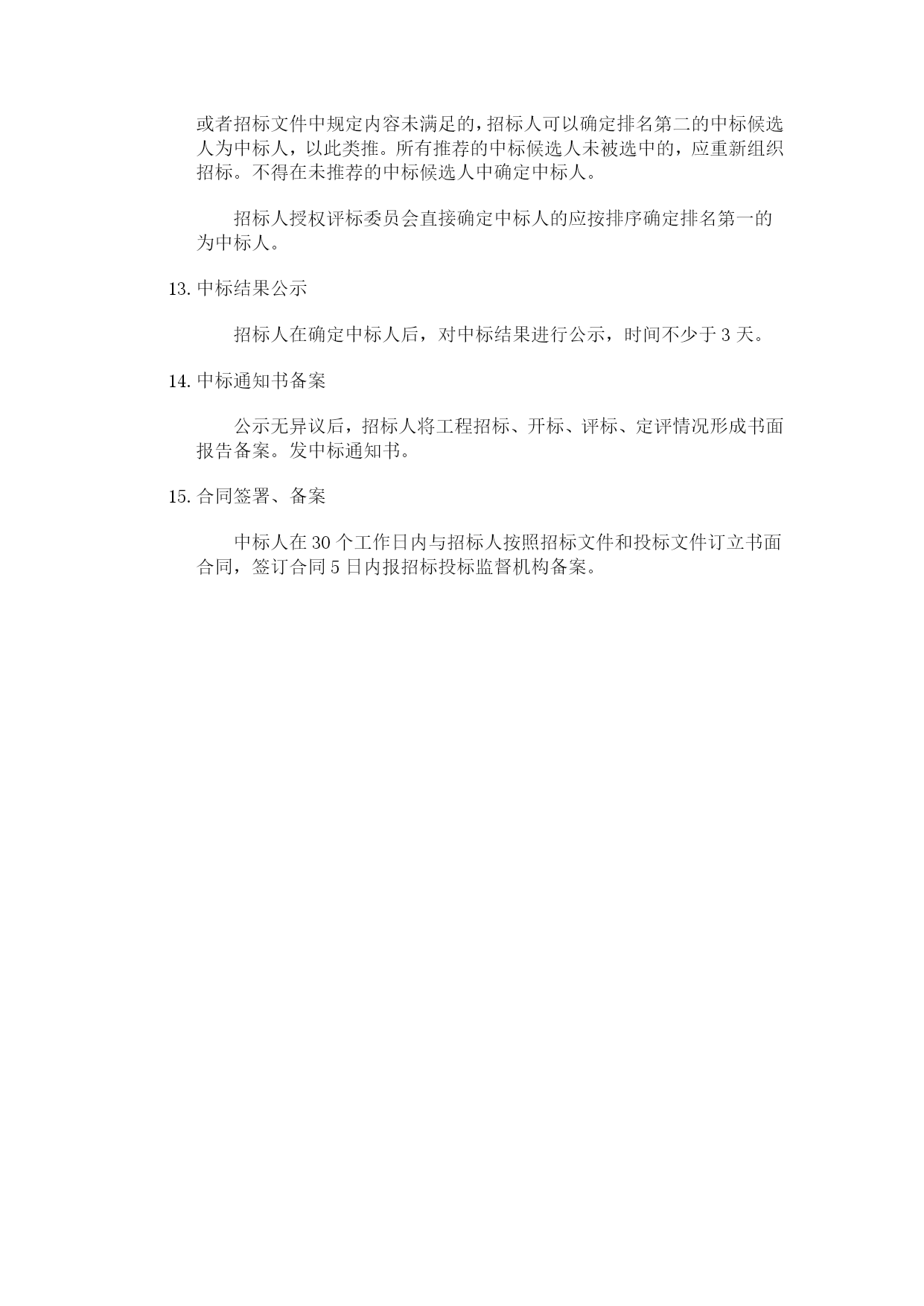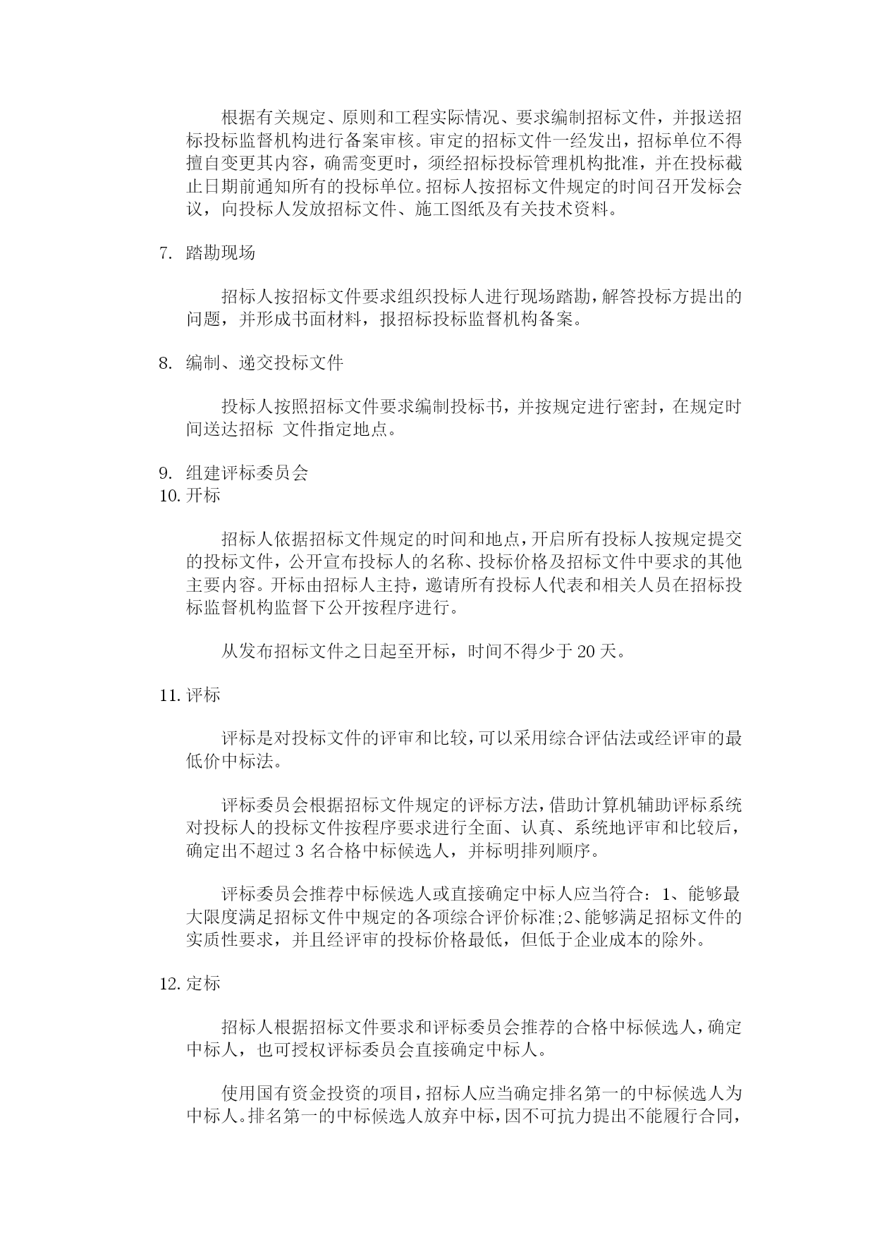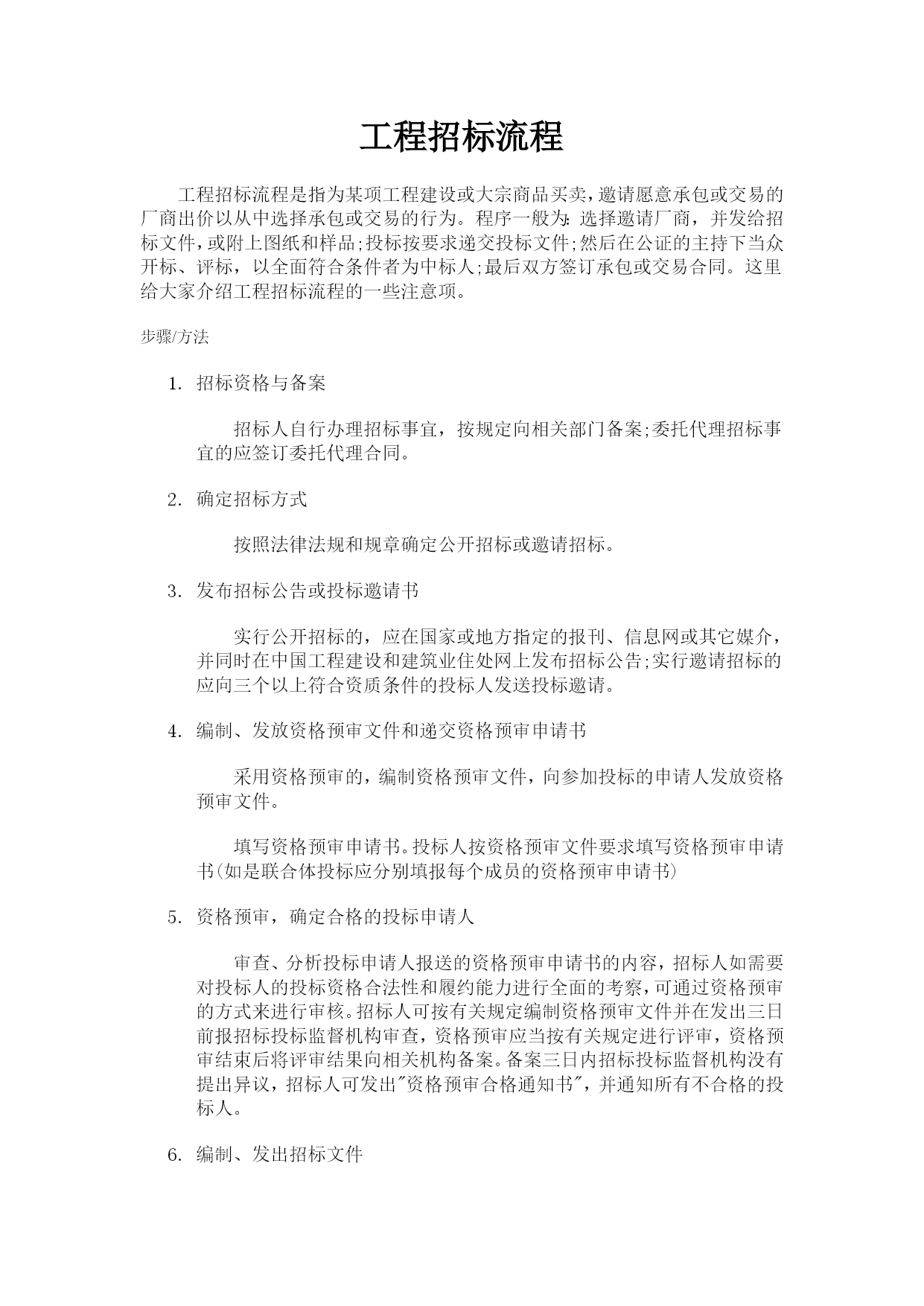 工程招标流程工程招标流程是指为某项工程建设或大宗商品买卖,邀请愿意承包或交易的厂商出价以从中选择承包或交易的行为。程序一般为:选择邀请厂商,并发给招标文件,或附上图纸和样品;投标按要求递交投标文件;然后在公证的主持下当众开标、评标,以全面符合条件者为中标人;最后双方签订承包或交易合同。这里给大家介绍工程招标流程的一些注意项。步骤/方法招标资格与备案招标人自行办理招标事宜,按规定向相关部门备案;委托代理招标事宜的应签订委托代理合同。确定招标方式按照法律法规和规章确定公开招标或邀请招标。发布招标公告或投标邀请书实行公开招标的,应在国家或地方指定的报刊、信息网或其它媒介,并同时在中国工程建设和建筑业住处网上发布招标公告;实行邀请招标的应向三个以上符合资质条件的投标人发送投标邀请。编制、发放资格预审文件和递交资格预审申请书采用资格预审的,编制资格预审文件,向参加投标的申请人发放资格预审文件。填写资格预审申请书。投标人按资格预审文件要求填写资格预审申请书(如是联合体投标应分别填报每个成员的资格预审申请书)资格预审,确定合格的投标申请人审查、分析投标申请人报送的资格预审申请书的内容,招标人如需要对投标人的投标资格合法性和履约能力进行全面的考察,可通过资格预审的方式来进行审核。招标人可按有关规定编制资格预审文件并在发出三日前报招标投标监督机构审查,资格预审应当按有关规定进行评审,资格预审结束后将评审结果向相关机构备案。备案三日内招标投标监督机构没有提出异议,招标人可发出"资格预审合格通知书",并通知所有不合格的投标人。编制、发出招标文件根据有关规定、原则和工程实际情况、要求编制招标文件,并报送招标投标监督机构进行备案审核。审定的招标文件一经发出,招标单位不得擅自变更其内容,确需变更时,须经招标投标管理机构批准,并在投标截止日期前通知所有的投标单位。招标人按招标文件规定的时间召开发标会议,向投标人发放招标文件、施工图纸及有关技术资料。踏勘现场招标人按招标文件要求组织投标人进行现场踏勘,解答投标方提出的问题,并形成书面材料,报招标投标监督机构备案。编制、递交投标文件投标人按照招标文件要求编制投标书,并按规定进行密封,在规定时间送达招标文件指定地点。组建评标委员会开标招标人依据招标文件规定的时间和地点,开启所有投标人按规定提交的投标文件,公开宣布投标人的名称、投标价格及招标文件中要求的其他主要内容。开标由招标人主持,邀请所有投标人代表和相关人员在招标投标监督机构监督下公开按程序进行。从发布招标文件之日起至开标,时间不得少于20天。评标评标是对投标文件的评审和比较,可以采用综合评估法或经评审的最低价中标法。评标委员会根据招标文件规定的评标方法,借助计算机辅助评标系统对投标人的投标文件按程序要求进行全面、认真、系统地评审和比较后,确定出不超过3名合格中标候选人,并标明排列顺序。评标委员会推荐中标候选人或直接确定中标人应当符合:1、能够最大限度满足招标文件中规定的各项综合评价标准;2、能够满足招标文件的实质性要求,并且经评审的投标价格最低,但低于企业成本的除外。定标招标人根据招标文件要求和评标委员会推荐的合格中标候选人,确定中标人,也可授权评标委员会直接确定中标人。使用国有资金投资的项目,招标人应当确定排名第一的中标候选人为中标人。排名第一的中标候选人放弃中标,因不可抗力提出不能履行合同,或者招标文件中规定内容未满足的,招标人可以确定排名第二的中标候选人为中标人,以此类推。所有推荐的中标候选人未被选中的,应重新组织招标。不得在未推荐的中标候选人中确定中标人。招标人授权评标委员会直接确定中标人的应按排序确定排名第一的为中标人。中标结果公示招标人在确定中标人后,对中标结果进行公示,时间不少于3天。中标通知书备案公示无异议后,招标人将工程招标、开标、评标、定评情况形成书面报告备案。发中标通知书。合同签署、备案中标人在30个工作日内与招标人按照招标文件和投标文件订立书面合同,签订合同5日内报招标投标监督机构备案。