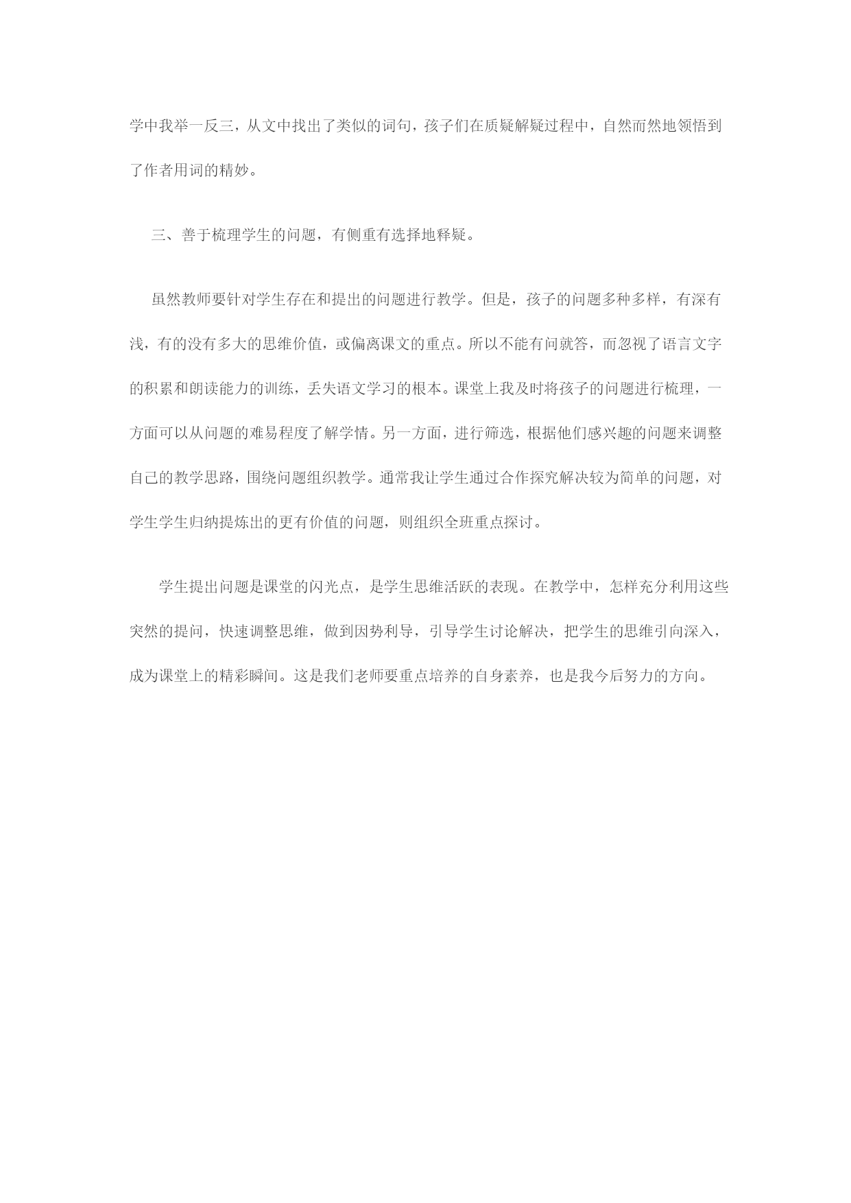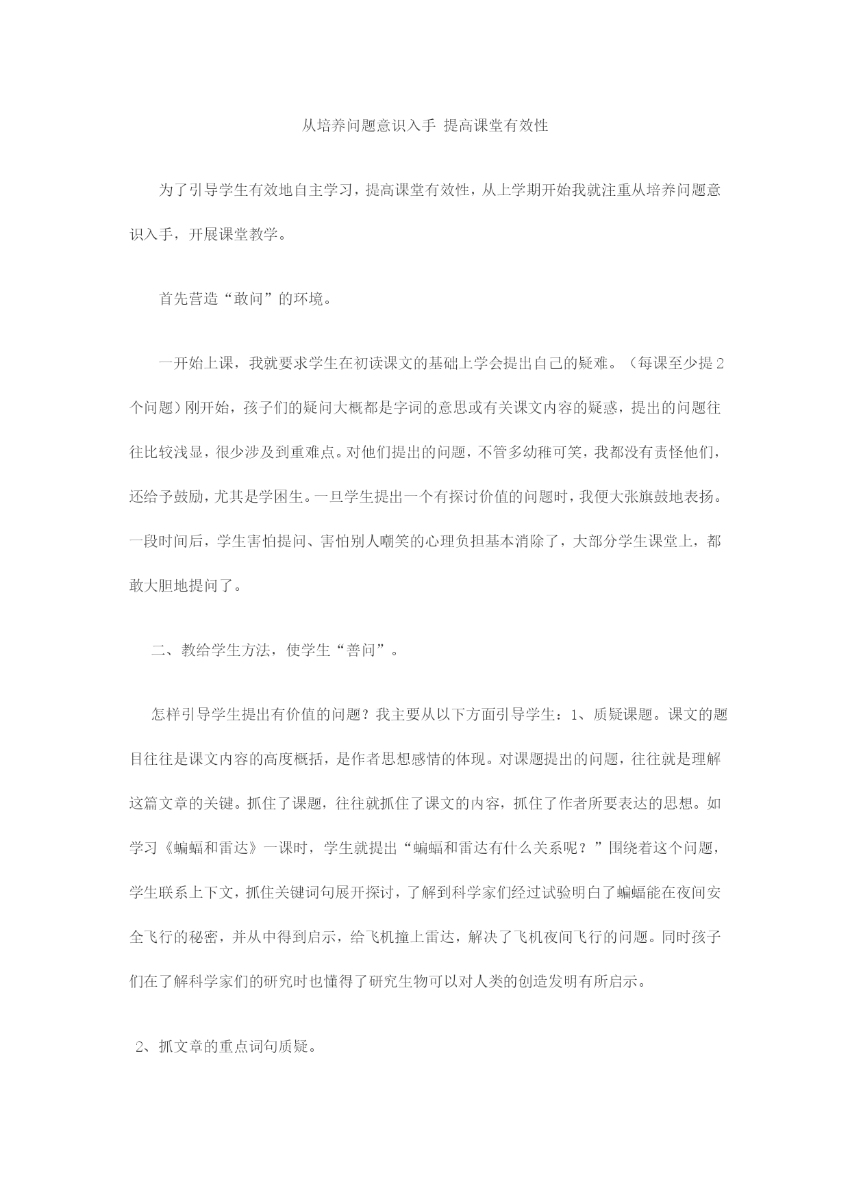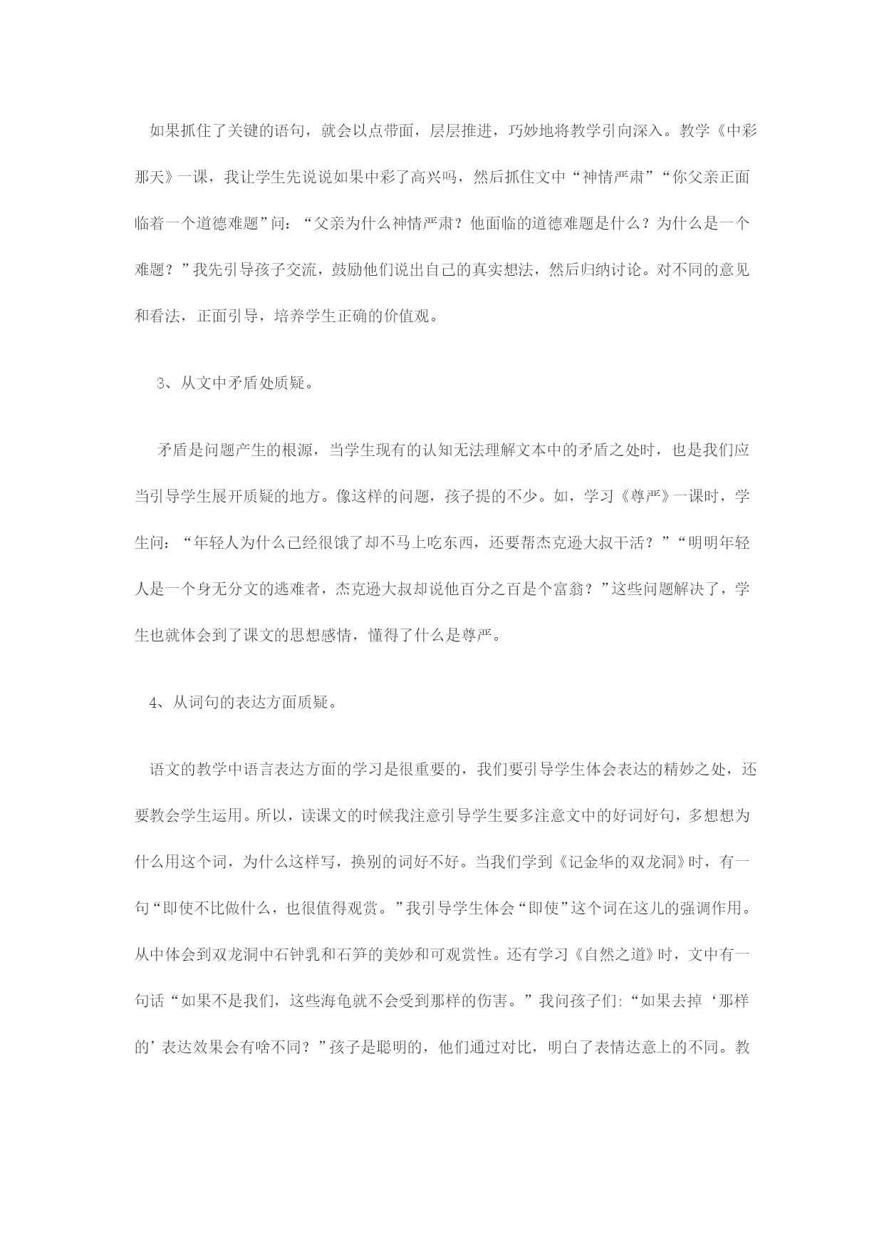从培养问题意识入手提高课堂有效性为了引导学生有效地自主学习,提高课堂有效性,从上学期开始我就注重从培养问题意识入手,开展课堂教学。首先营造“敢问”的环境。一开始上课,我就要求学生在初读课文的基础上学会提出自己的疑难。(每课至少提2个问题)刚开始,孩子们的疑问大概都是字词的意思或有关课文内容的疑惑,提出的问题往往比较浅显,很少涉及到重难点。对他们提出的问题,不管多幼稚可笑,我都没有责怪他们,还给予鼓励,尤其是学困生。一旦学生提出一个有探讨价值的问题时,我便大张旗鼓地表扬。一段时间后,学生害怕提问、害怕别人嘲笑的心理负担基本消除了,大部分学生课堂上,都敢大胆地提问了。二、教给学生方法,使学生“善问”。怎样引导学生提出有价值的问题?我主要从以下方面引导学生:1、质疑课题。课文的题目往往是课文内容的高度概括,是作者思想感情的体现。对课题提出的问题,往往就是理解这篇文章的关键。抓住了课题,往往就抓住了课文的内容,抓住了作者所要表达的思想。如学习《蝙蝠和雷达》一课时,学生就提出“蝙蝠和雷达有什么关系呢?”围绕着这个问题,学生联系上下文,抓住关键词句展开探讨,了解到科学家们经过试验明白了蝙蝠能在夜间安全飞行的秘密,并从中得到启示,给飞机撞上雷达,解决了飞机夜间飞行的问题。同时孩子们在了解科学家们的研究时也懂得了研究生物可以对人类的创造发明有所启示。2、抓文章的重点词句质疑。如果抓住了关键的语句,就会以点带面,层层推进,巧妙地将教学引向深入。教学《中彩那天》一课,我让学生先说说如果中彩了高兴吗,然后抓住文中“神情严肃”“你父亲正面临着一个道德难题”问:“父亲为什么神情严肃?他面临的道德难题是什么?为什么是一个难题?”我先引导孩子交流,鼓励他们说出自己的真实想法,然后归纳讨论。对不同的意见和看法,正面引导,培养学生正确的价值观。3、从文中矛盾处质疑。矛盾是问题产生的根源,当学生现有的认知无法理解文本中的矛盾之处时,也是我们应当引导学生展开质疑的地方。像这样的问题,孩子提的不少。如,学习《尊严》一课时,学生问:“年轻人为什么已经很饿了却不马上吃东西,还要帮杰克逊大叔干活?”“明明年轻人是一个身无分文的逃难者,杰克逊大叔却说他百分之百是个富翁?”这些问题解决了,学生也就体会到了课文的思想感情,懂得了什么是尊严。4、从词句的表达方面质疑。语文的教学中语言表达方面的学习是很重要的,我们要引导学生体会表达的精妙之处,还要教会学生运用。所以,读课文的时候我注意引导学生要多注意文中的好词好句,多想想为什么用这个词,为什么这样写,换别的词好不好。当我们学到《记金华的双龙洞》时,有一句“即使不比做什么,也很值得观赏。”我引导学生体会“即使”这个词在这儿的强调作用。从中体会到双龙洞中石钟乳和石笋的美妙和可观赏性。还有学习《自然之道》时,文中有一句话“如果不是我们,这些海龟就不会受到那样的伤害。”我问孩子们:“如果去掉‘那样的’表达效果会有啥不同?”孩子是聪明的,他们通过对比,明白了表情达意上的不同。教学中我举一反三,从文中找出了类似的词句,孩子们在质疑解疑过程中,自然而然地领悟到了作者用词的精妙。三、善于梳理学生的问题,有侧重有选择地释疑。虽然教师要针对学生存在和提出的问题进行教学。但是,孩子的问题多种多样,有深有浅,有的没有多大的思维价值,或偏离课文的重点。所以不能有问就答,而忽视了语言文字的积累和朗读能力的训练,丢失语文学习的根本。课堂上我及时将孩子的问题进行梳理,一方面可以从问题的难易程度了解学情。另一方面,进行筛选,根据他们感兴趣的问题来调整自己的教学思路,围绕问题组织教学。通常我让学生通过合作探究解决较为简单的问题,对学生学生归纳提炼出的更有价值的问题,则组织全班重点探讨。学生提出问题是课堂的闪光点,是学生思维活跃的表现。在教学中,怎样充分利用这些突然的提问,快速调整思维,做到因势利导,引导学生讨论解决,把学生的思维引向深入,成为课堂上的精彩瞬间。这是我们老师要重点培养的自身素养,也是我今后努力的方向。