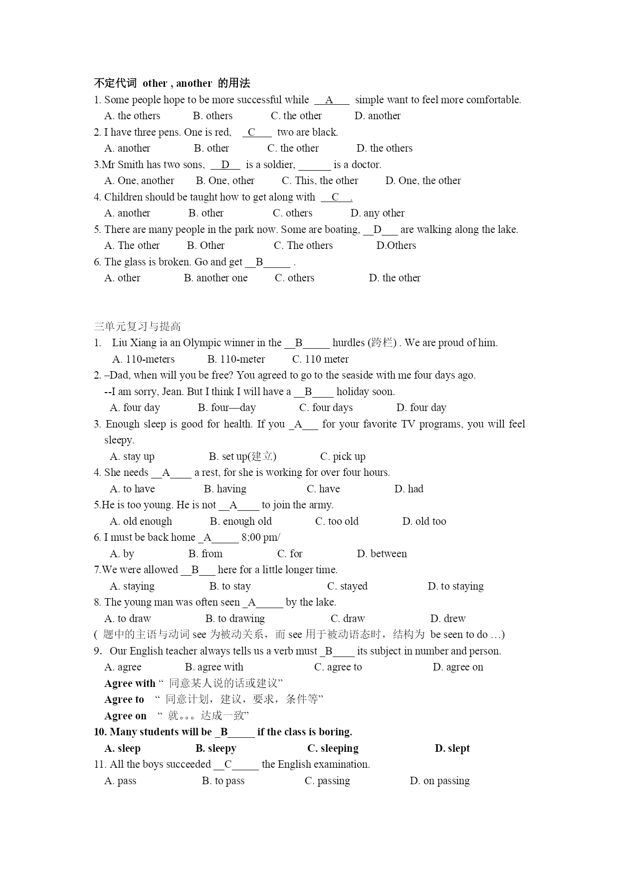 不定代词other,another的用法1.SomepeoplehopetobemoresuccessfulwhileAsimplewanttofeelmorecomfortable.A.theothersB.othersC.theotherD.another2.Ihavethreepens.Oneisred,Ctwoareblack.A.anotherB.otherC.theotherD.theothers3.MrSmithhastwosons,Disasoldier,______isadoctor.A.One,anotherB.One,otherC.This,theotherD.One,theother4.ChildrenshouldbetaughthowtogetalongwithC.A.anotherB.otherC.othersD.anyother5.Therearemanypeopleintheparknow.Someareboating,__D___arewalkingalongthelake.A.TheotherB.OtherC.TheothersD.Others6.Theglassisbroken.Goandget__B_____.A.otherB.anotheroneC.othersD.theother三单元复习与提高LiuXiangiaanOlympicwinnerinthe__B_____hurdles(跨栏).Weareproudofhim.A.110-metersB.110-meterC.110meter2.–Dad,whenwillyoubefree?Youagreedtogototheseasidewithmefourdaysago.--Iamsorry,Jean.ButIthinkIwillhavea__B____holidaysoon.A.fourdayB.four—dayC.fourdaysD.fourday3.Enoughsleepisgoodforhealth.Ifyou_A___foryourfavoriteTVprograms,youwillfeelsleepy.A.stayupB.setup(建立)C.pickup4.Sheneeds__A____arest,forsheisworkingforoverfourhours.A.tohaveB.havingC.haveD.had5.Heistooyoung.Heisnot__A____tojointhearmy.A.oldenoughB.enougholdC.toooldD.oldtoo6.Imustbebackhome_A_____8;00pm/A.byB.fromC.forD.between7.Wewereallowed__B___hereforalittlelongertime.A.stayingB.tostayC.stayedD.tostaying8.Theyoungmanwasoftenseen_A_____bythelake.A.todrawB.todrawingC.drawD.drew(题中的主语与动词see为被动关系,而see用于被动语态时,结构为beseentodo…)9.OurEnglishteacheralwaystellsusaverbmust_B____itssubjectinnumberandperson.A.agreeB.agreewithC.agreetoD.agreeonAgreewith“同意某人说的话或建议”Agreeto“同意计划,建议,要求,条件等”Agreeon“就。。。达成一致”10.Manystudentswillbe_B_____iftheclassisboring.A.sleepB.sleepyC.sleepingD.slept11.Alltheboyssucceeded__C_____theEnglishexamination.A.passB.topassC.passingD.onpassing12.Myfartherisverystrict__C______us,andheisalsostrict_______hiswork.A.to;inB.on;withC.with;inD.in;on13.Youshouldn’tdrive__A___theageof16.A.atB.inC.onD.for14.IthinkMollyshouldgethishair__A_____.A.cutB.cuttingC.tocutD.tobecut15.Peterfailed__A_____themathtestlastweek.A.topassB.passedC.passingD.pass