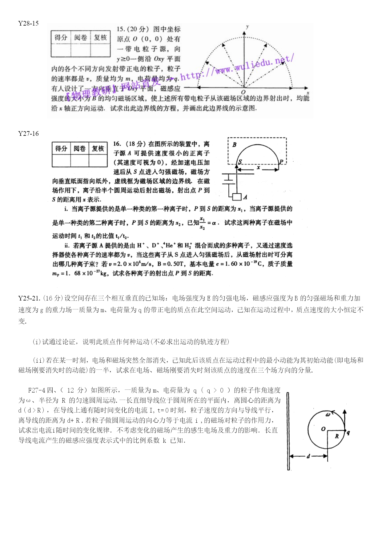 Y28-15Y27-16Y25-21.(16分)设空间存在三个相互垂直的已知场:电场强度为E的匀强电场,磁感应强度为B的匀强磁场和重力加速度为g的重力场一质量为m、电荷量为q的带正电的质点在此空间运动,己知在运动过程中,质点速度的大小恒定不变.(i)试通过论证,说明此质点作何种运动(不必求出运动的轨迹方程)(ii)若在某一时刻,电场和磁场突然全部消失,己知此后该质点在运动过程中的最小动能为其初始动能(即电场和磁场刚要消失时的动能)的一半,试求在电场、磁场刚要消失时刻该质点的速度在三个场方向的分量.F27-4四、(12分)如图所示,一质量为m、电荷量为q(q>0)的粒子作角速度为ω、半径为R的匀速圆周运动.一长直细导线位于圆周所在的平面内,离圆心的距离为d(d>R),在导线上通有随时间变化的电流I,t=0时刻,粒子速度的方向与导线平行,离导线的距离为d+R.若粒子做圆周运动的向心力等于电流i,的磁场对粒子的作用力,试求出电流i随时间的变化规律.不考虑变化的磁场产生的感生电场及重力的影响.长直导线电流产生的磁感应强度表示式中的比例系数k已知.Y28-15Y27-16Y25-2121.参考解答:(i)在空间取如图所示的直角坐标Oxyz,Ox轴沿电场方向,Oy轴沿磁场方向,Oz轴与重力方向相反。因为磁场作用于质点的洛仑兹力与磁场方向垂直,即在Oxz平面内;作用于质点的电场力和重力也在Oxz平面内,故质点在y方向不受力作用,其速度沿y方向的分速度的大小和方向都是不变的。根据题意,质点速度的大小是恒定不变的,而磁场作用于质点的洛仑兹力对质点不做功,故质点的速度沿垂直磁场方向的分速度的大小一定也是恒定不变的,故此分速度必须与电场力和重力的合力垂直。由于电场力和重力的合力的方向是不变的,故此分速度的方向也是不变的。由此可得到结论:质点速度的方向也是不变的,即质点在给定的场中做匀速直线运动,其轨迹是直线,在Oxz平面内,与电场力和重力的合力垂直。(ii)质点作匀速直线运动表明电场、磁场和重力场对质点作用力的合力F等于0。设存在电场、磁场时质点速度的大小为v0,它在坐标系中的三个分量分别为v0x、v0y和v0z,这也就是在电场、磁场刚要消失时质点的速度在三个场方向的分量,以Fx、Fy和Fz分别表示F在坐标标系中的分量,则有Fx=qE-qv0zB=0(1)Fy=0(2)Fz=-mg+qv0xB=0(3)由(1)、(3)式得(4)(5)若知道了粒子的速率v0,粒子速度的y分量为(6)因为电场和磁场消失后,粒子仅在重力作用下运动,任何时刻t质点的速度为vx=v0x(7)vy=v0y(8)vz=v0z-gt(9)当vx等于0时,粒子的动能最小,这最小动能(10)根据题意有(11)由(10)、(11)式得(12)由(4)、(5)、(6)、(12)各式得(13)F27-4