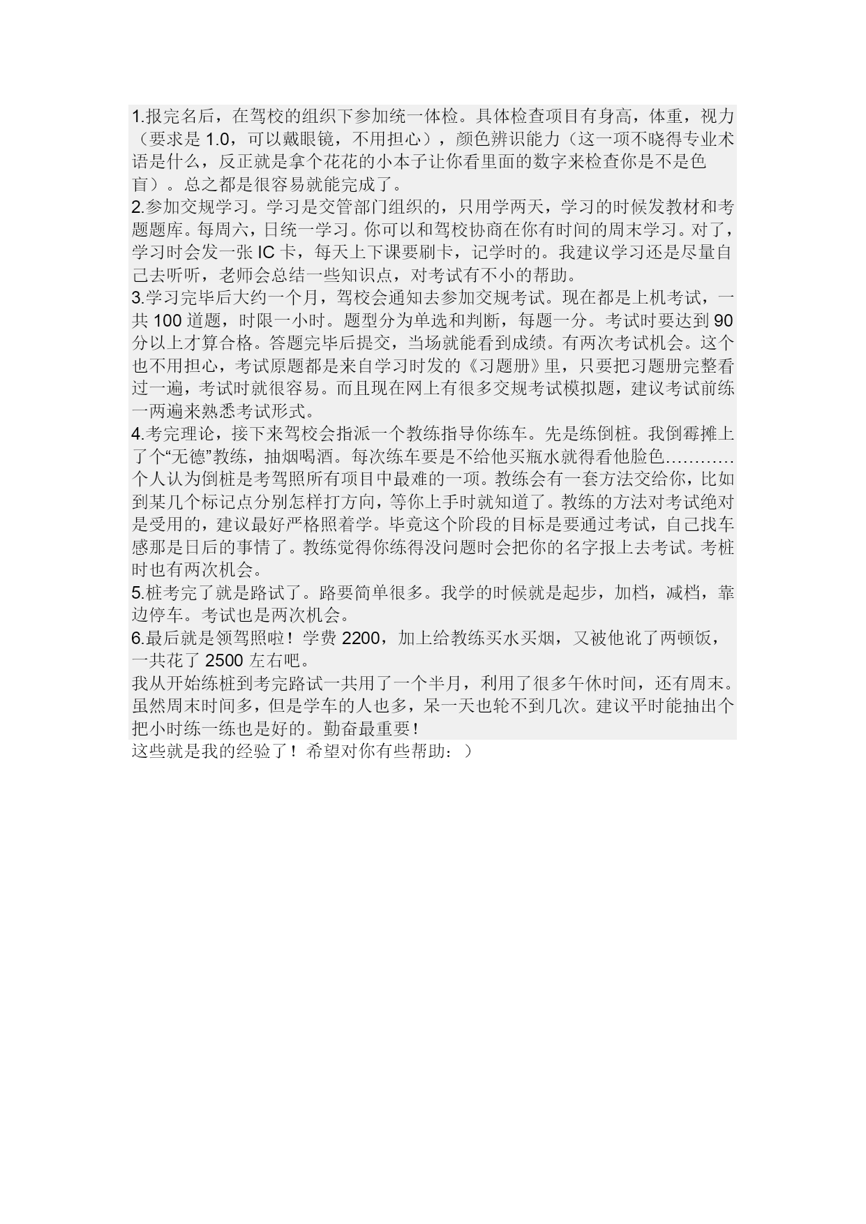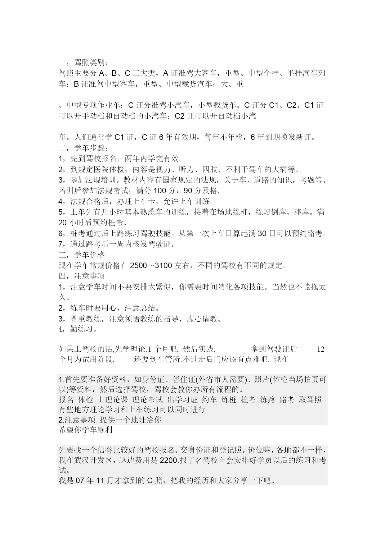 一,驾照类别:驾照主要分A、B、C三大类,A证准驾大客车,重型、中型全挂、半挂汽车列车;B证准驾中型客车,重型、中型载货汽车;大、重、中型专项作业车;C证分准驾小汽车,小型载货车。C证分C1、C2。C1证可以开手动档和自动档的小汽车;C2证可以开自动档小汽车。人们通常学C1证,C证6年有效期,每年不年检,6年到期换发新证。二,学车步骤:1,先到驾校报名;两年内学完有效。2,到规定医院体检,内容是视力、听力、四肢、不利于驾车的大病等。3,参加法规培训。教材内容有国家规定的法规,关于车、道路的知识,考题等。培训后参加法规考试,满分100分,90分及格。4,法规合格后,办理上车卡,允许上车训练。5,上车先有几小时基本熟悉车的训练,接着在场地练桩,练习倒库、移库。满20小时后预约桩考。6,桩考通过后上路练习驾驶技能。从第一次上车日算起满30日可以预约路考。7,通过路考后一周内核发驾驶证。三,学车价格现在学车常规价格在2500~3100左右,不同的驾校有不同的规定。四,注意事项1,注意学车时间不要安排太紧促,你需要时间消化各项技能。当然也不能拖太久。2,练车时要用心,注意总结。3,尊重教练,注意领悟教练的指导,虚心请教。4,勤练习。如果上驾校的话,先学理论,1个月吧,然后实践,拿到驾驶证后12个月为试用阶段,还要到车管所.不过走后门应该有点难吧.现在1.首先要准备好资料,如身份证、暂住证(外省市人需要)、照片(体检当场拍页可以)等资料,然后选择驾校,驾校会教你办所有流程的。报名体检上理论课理论考试出学习证约车练桩桩考练路路考取驾照有些地方理论学习和上车练习可以同时进行2.注意事项提供一个地址给你希望你学车顺利先要找一个信誉比较好的驾校报名。交身份证和登记照。价位嘛,各地都不一样,我在武汉开发区,这边费用是2200.报了名驾校自会安排好学员以后的练习和考试。我是07年11月才拿到的C照,把我的经历和大家分享一下吧。1.报完名后,在驾校的组织下参加统一体检。具体检查项目有身高,体重,视力(要求是1.0,可以戴眼镜,不用担心),颜色辨识能力(这一项不晓得专业术语是什么,反正就是拿个花花的小本子让你看里面的数字来检查你是不是色盲)。总之都是很容易就能完成了。2.参加交规学习。学习是交管部门组织的,只用学两天,学习的时候发教材和考题题库。每周六,日统一学习。你可以和驾校协商在你有时间的周末学习。对了,学习时会发一张IC卡,每天上下课要刷卡,记学时的。我建议学习还是尽量自己去听听,老师会总结一些知识点,对考试有不小的帮助。3.学习完毕后大约一个月,驾校会通知去参加交规考试。现在都是上机考试,一共100道题,时限一小时。题型分为单选和判断,每题一分。考试时要达到90分以上才算合格。答题完毕后提交,当场就能看到成绩。有两次考试机会。这个也不用担心,考试原题都是来自学习时发的《习题册》里,只要把习题册完整看过一遍,考试时就很容易。而且现在网上有很多交规考试模拟题,建议考试前练一两遍来熟悉考试形式。4.考完理论,接下来驾校会指派一个教练指导你练车。先是练倒桩。我倒霉摊上了个“无德”教练,抽烟喝酒。每次练车要是不给他买瓶水就得看他脸色…………个人认为倒桩是考驾照所有项目中最难的一项。教练会有一套方法交给你,比如到某几个标记点分别怎样打方向,等你上手时就知道了。教练的方法对考试绝对是受用的,建议最好严格照着学。毕竟这个阶段的目标是要通过考试,自己找车感那是日后的事情了。教练觉得你练得没问题时会把你的名字报上去考试。考桩时也有两次机会。5.桩考完了就是路试了。路要简单很多。我学的时候就是起步,加档,减档,靠边停车。考试也是两次机会。6.最后就是领驾照啦!学费2200,加上给教练买水买烟,又被他讹了两顿饭,一共花了2500左右吧。我从开始练桩到考完路试一共用了一个半月,利用了很多午休时间,还有周末。虽然周末时间多,但是学车的人也多,呆一天也轮不到几次。建议平时能抽出个把小时练一练也是好的。勤奋最重要!这些就是我的经验了!希望对你有些帮助:)