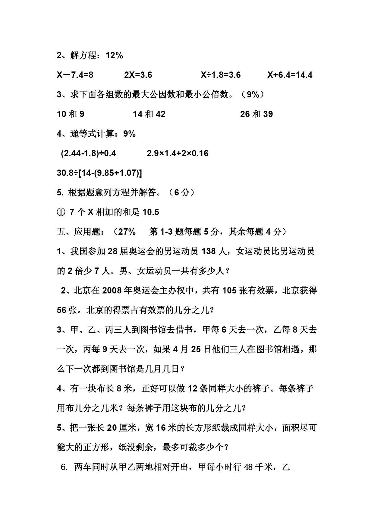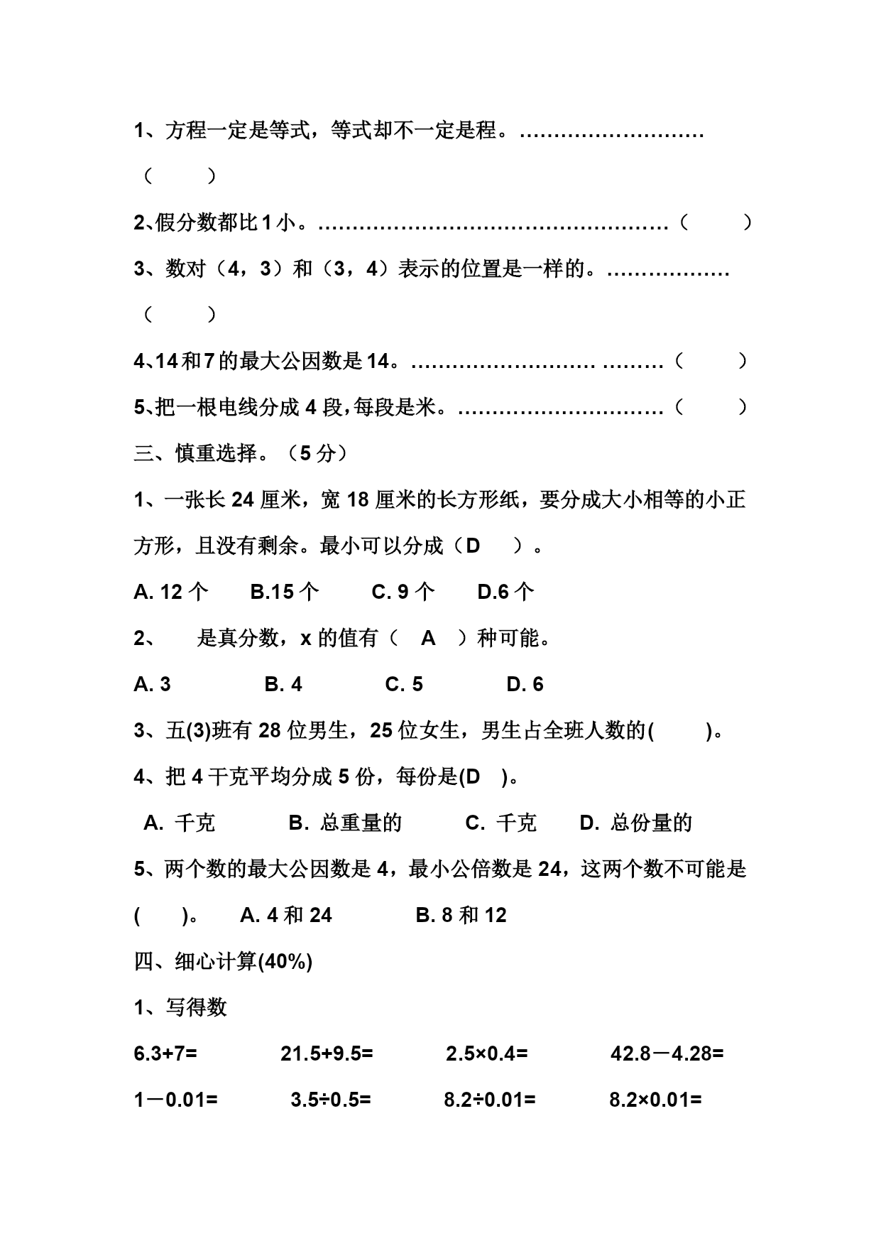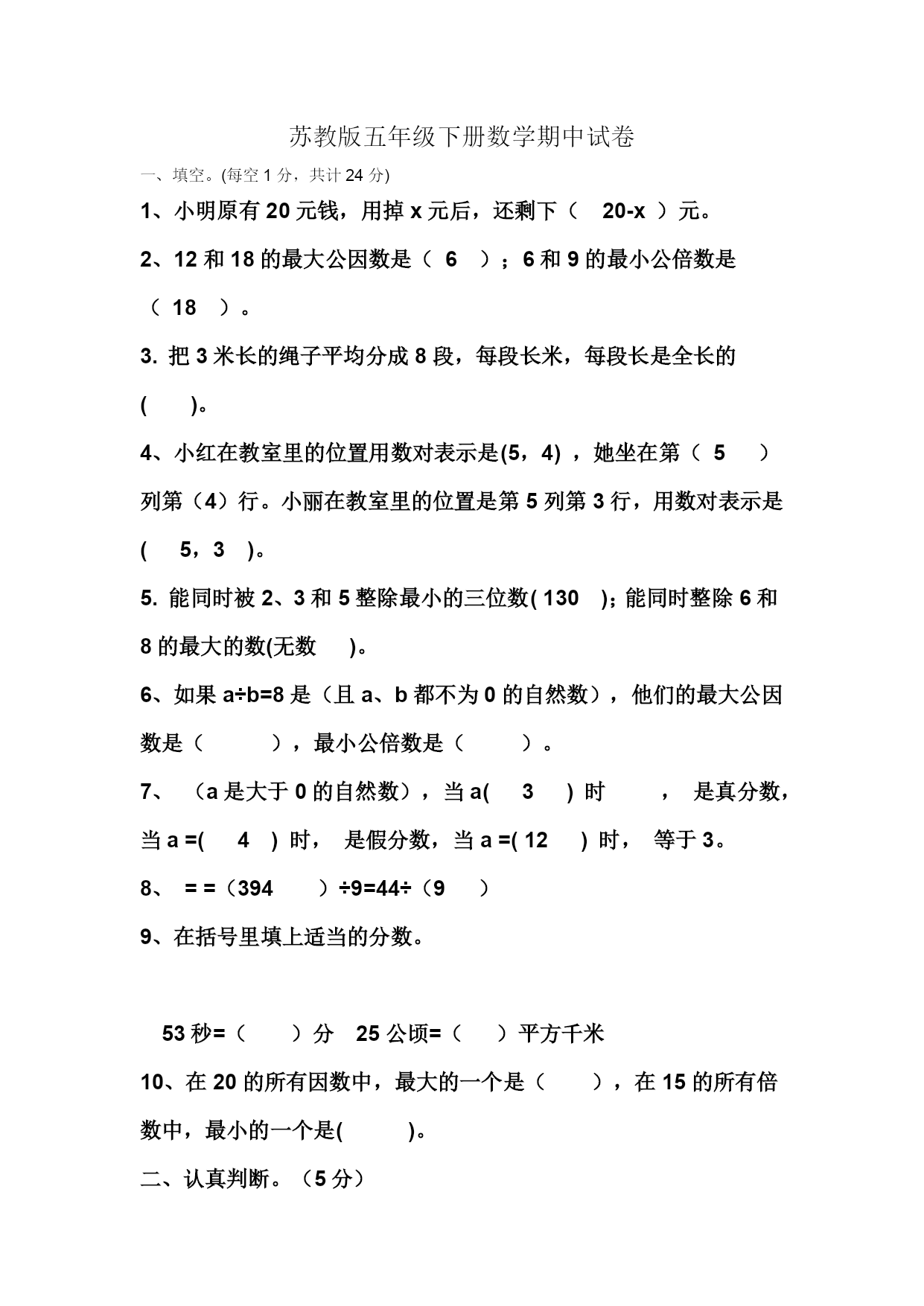 苏教版五年级下册数学期中试卷一、填空。(每空1分,共计24分)1、小明原有20元钱,用掉x元后,还剩下(20-x)元。2、12和18的最大公因数是(6);6和9的最小公倍数是(18)。3.把3米长的绳子平均分成8段,每段长米,每段长是全长的()。4、小红在教室里的位置用数对表示是(5,4),她坐在第(5)列第(4)行。小丽在教室里的位置是第5列第3行,用数对表示是(5,3)。5.能同时被2、3和5整除最小的三位数(130);能同时整除6和8的最大的数(无数)。6、如果a÷b=8是(且a、b都不为0的自然数),他们的最大公因数是(),最小公倍数是()。7、(a是大于0的自然数),当a(3)时,是真分数,当a=(4)时,是假分数,当a=(12)时,等于3。8、==(394)÷9=44÷(9)9、在括号里填上适当的分数。53秒=()分25公顷=()平方千米10、在20的所有因数中,最大的一个是(),在15的所有倍数中,最小的一个是()。二、认真判断。(5分)1、方程一定是等式,等式却不一定是程。………………………()2、假分数都比1小。……………………………………………()3、数对(4,3)和(3,4)表示的位置是一样的。………………()4、14和7的最大公因数是14。………………………………()5、把一根电线分成4段,每段是米。…………………………()三、慎重选择。(5分)1、一张长24厘米,宽18厘米的长方形纸,要分成大小相等的小正方形,且没有剩余。最小可以分成(D)。A.12个B.15个C.9个D.6个2、是真分数,x的值有(A)种可能。A.3B.4C.5D.63、五(3)班有28位男生,25位女生,男生占全班人数的()。4、把4干克平均分成5份,每份是(D)。A.千克B.总重量的C.千克D.总份量的5、两个数的最大公因数是4,最小公倍数是24,这两个数不可能是()。A.4和24B.8和12四、细心计算(40%)1、写得数6.3+7=21.5+9.5=2.5×0.4=42.8-4.28=1-0.01=3.5÷0.5=8.2÷0.01=8.2×0.01=2、解方程:12%X-7.4=82X=3.6X÷1.8=3.6X+6.4=14.43、求下面各组数的最大公因数和最小公倍数。(9%)10和914和4226和394、递等式计算:9%(2.44-1.8)÷0.42.9×1.4+2×0.1630.8÷[14-(9.85+1.07)]5.根据题意列方程并解答。(6分)①7个X相加的和是10.5五、应用题:(27%第1-3题每题5分,其余每题4分)1、我国参加28届奥运会的男运动员138人,女运动员比男运动员的2倍少7人。男、女运动员一共有多少人?2、北京在2008年奥运会主办权中,共有105张有效票,北京获得56张。北京的得票占有效票的几分之几?3、甲、乙、丙三人到图书馆去借书,甲每6天去一次,乙每8天去一次,丙每9天去一次,如果4月25日他们三人在图书馆相遇,那么下一次都到图书馆是几月几日?4、有一块布长8米,正好可以做12条同样大小的裤子。每条裤子用布几分之几米?每条裤子用这块布的几分之几?5、把一张长20厘米,宽16米的长方形纸裁成同样大小,面积尽可能大的正方形,纸没剩余,最多可裁多少个?6.两车同时从甲乙两地相对开出,甲每小时行48千米,乙车每小时行54千米,相遇时两车离中点36千米,甲乙两地相距多少千米?