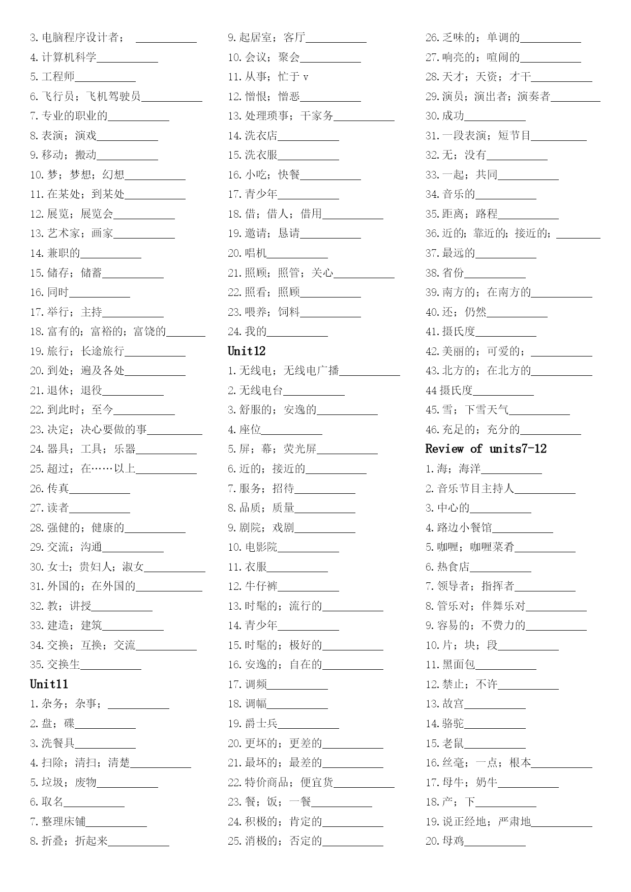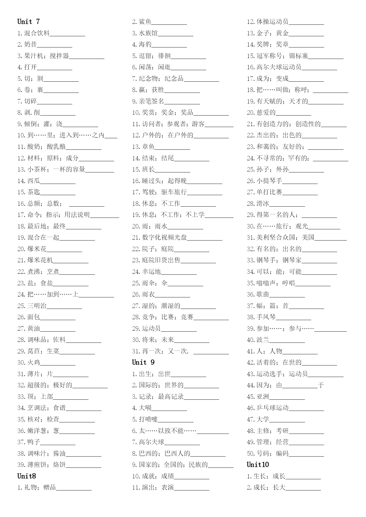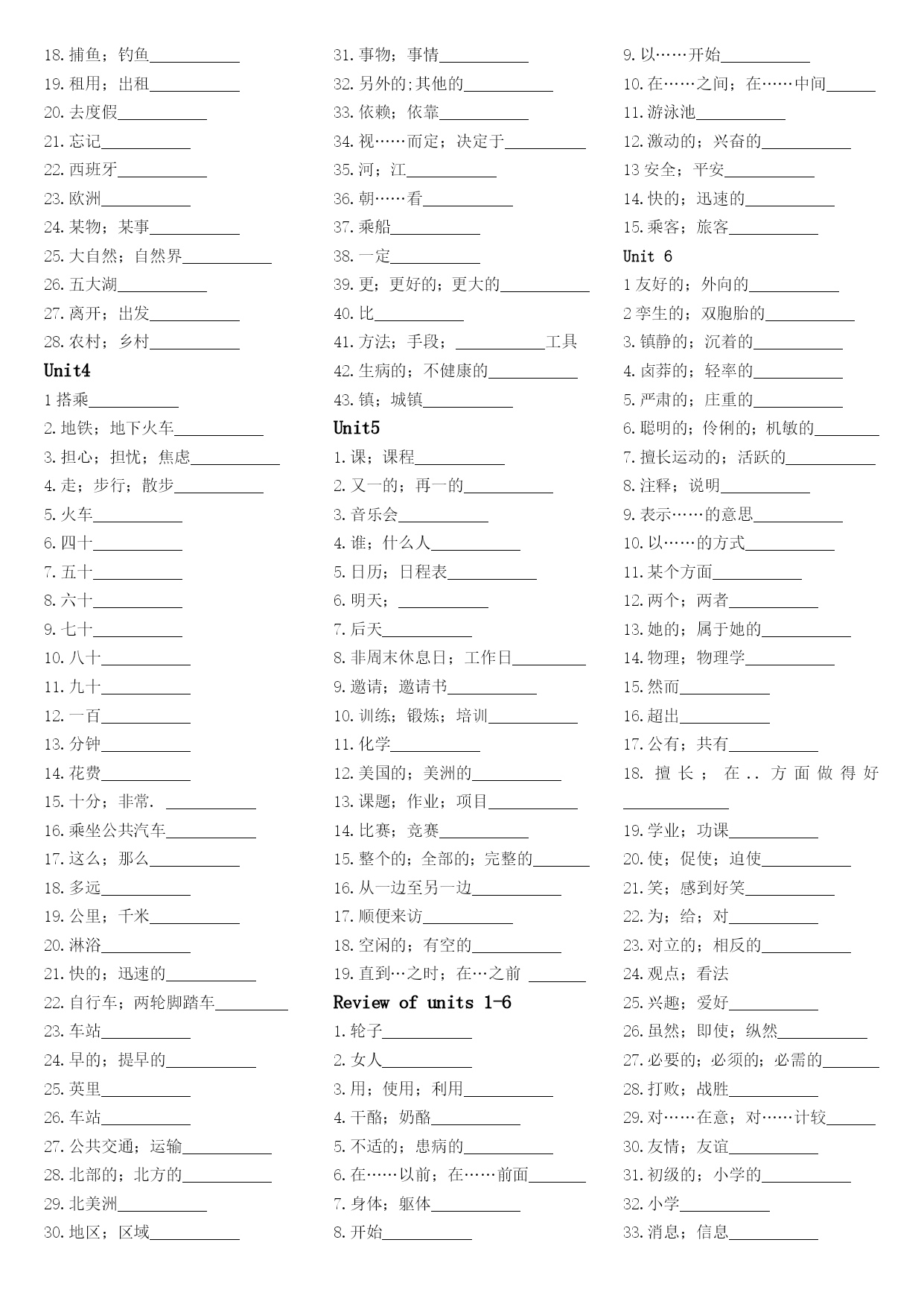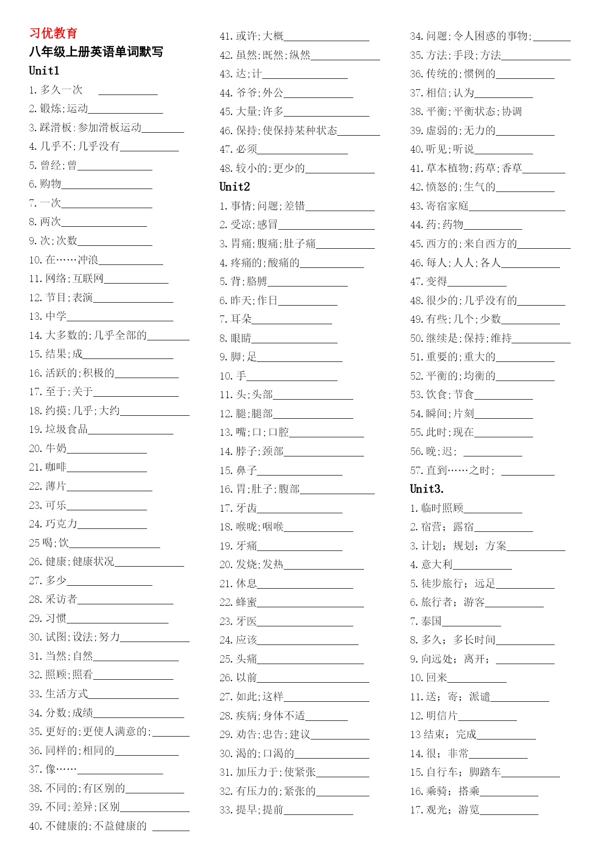 习优教育八年级上册英语单词默写Unit11.多久一次___________2.锻炼;运动______________3.踩滑板:参加滑板运动________4.几乎不;几乎没有___________5.曾经;曾______________6.购物_________________7.一次_________________8.两次________________9.次;次数______________10.在……冲浪____________11.网络;互联网____________12.节目;表演_______________13.中学____________________14.大多数的;几乎全部的________15.结果;成_________________16.活跃的;积极的____________17.至于;关于________________18.约摸;几乎;大约_____________19.垃圾食品________________20.牛奶_______________21.咖啡_______________22.薄片________________23.可乐_______________24.巧克力_____________25喝;饮_________________26.健康;健康状况_____________27.多少________________28.采访者__________________29.习惯___________________30.试图;设法;努力_____________31.当然;自然________________32.照顾;照看_______________33.生活方式_________________34.分数;成绩_________________35.更好的;更使人满意的;_______36.同样的;相同的____________37.像……________________38.不同的;有区别的___________39.不同;差异;区别_____________40.不健康的;不益健康的_______41.或许;大概________________42.虽然;既然;纵然_____________43.达;计________________44.爷爷;外公_____________45.大量;许多________________46.保持;使保持某种状态________47.必须_________________48.较小的;更少的_____________Unit21.事情;问题;差错_____________2.受凉;感冒__________________3.胃痛;腹痛;肚子痛___________4.疼痛的;酸痛的____________5.背;胳膊_______________6.昨天;作日___________7.耳朵_______________8.眼睛________________9.脚;足________________10.手_________________11.头;头部_______________12.腿;腿部_______________13.嘴;口;口腔______________14.脖子;颈部_______________15.鼻子________________16.胃;肚子;腹部______________17.牙齿________________18.喉咙;咽喉_____________19.牙痛________________20.发烧;发热_______________21.休息__________________22.蜂蜜____________________23.牙医__________________24.应该___________________25.头痛____________________26.以前_____________________27.如此;这样________________28.疾病;身体不适________29.劝告;忠告;建议___________30.渴的;口渴的______________31.加压力于;使紧张__________32.有压力的;紧张的__________33.提早;提前_____________34.问题;令人困惑的事物;_______35.方法;手段;方法_____________36.传统的;惯例的___________37.相信;认为___________38.平衡;平衡状态;协调39.虚弱的;无力的___________40.听见;听说___________41.草本植物;药草;香草________42.愤怒的;生气的___________43.寄宿家庭______