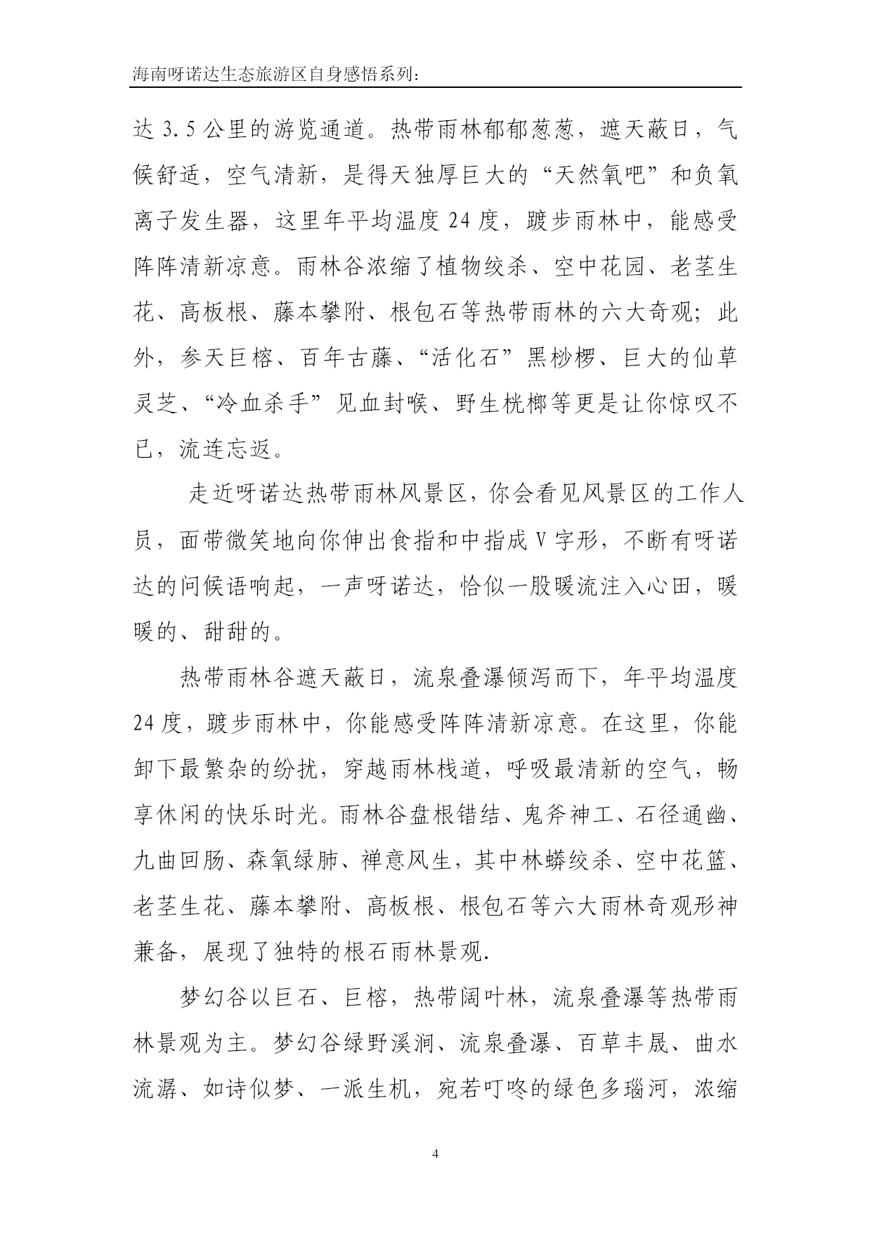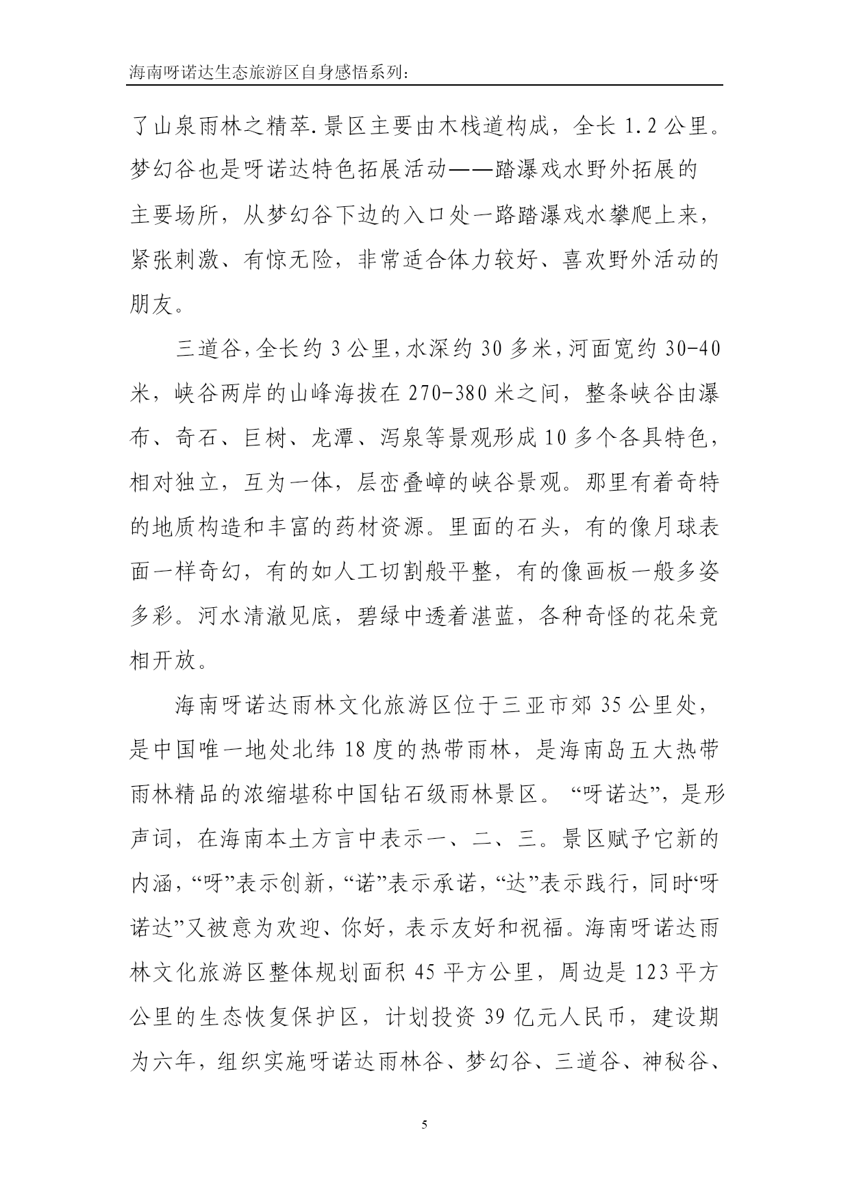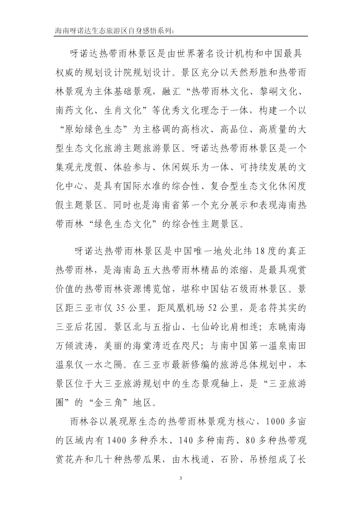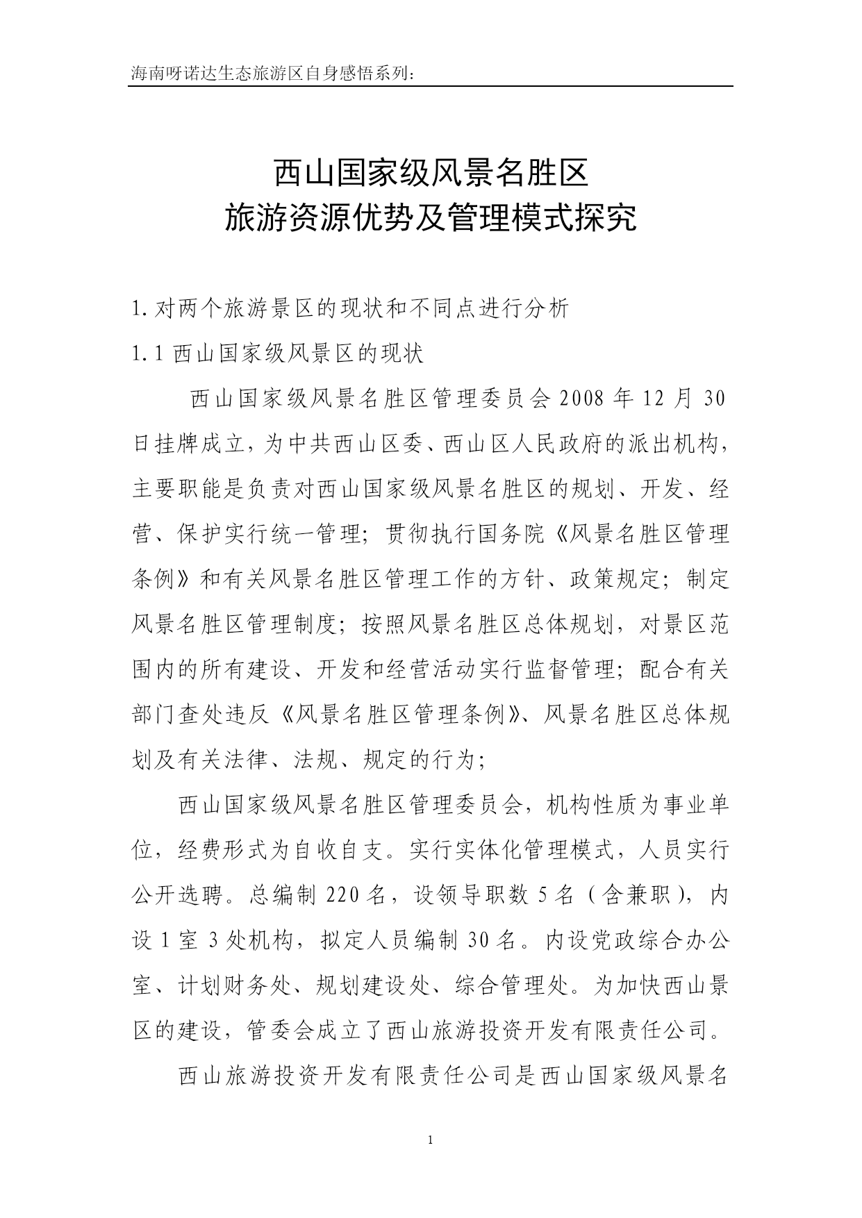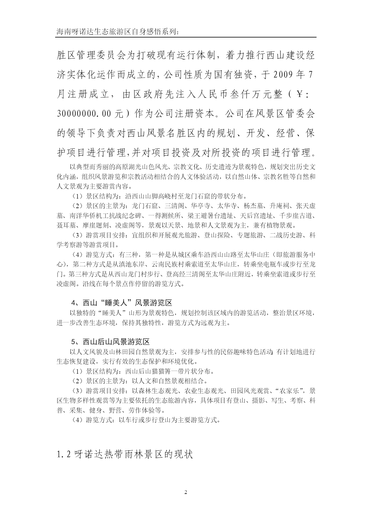 海南呀诺达生态旅游区自身感悟系列:西山国家级风景名胜区旅游资源优势及管理模式探究1.对两个旅游景区的现状和不同点进行分析1.1西山国家级风景区的现状西山国家级风景名胜区管理委员会2008年12月30日挂牌成立,为中共西山区委、西山区人民政府的派出机构,主要职能是负责对西山国家级风景名胜区的规划、开发、经营、保护实行统一管理;贯彻执行国务院《风景名胜区管理条例》和有关风景名胜区管理工作的方针、政策规定;制定风景名胜区管理制度;按照风景名胜区总体规划,对景区范围内的所有建设、开发和经营活动实行监督管理;配合有关部门查处违反《风景名胜区管理条例》、风景名胜区总体规划及有关法律、法规、规定的行为;西山国家级风景名胜区管理委员会,机构性质为事业单位,经费形式为自收自支。实行实体化管理模式,人员实行公开选聘。总编制220名,设领导职数5名(含兼职),内设1室3处机构,拟定人员编制30名。内设党政综合办公室、计划财务处、规划建设处、综合管理处。为加快西山景区的建设,管委会成立了西山旅游投资开发有限责任公司。西山旅游投资开发有限责任公司是西山国家级风景名胜区管理委员会为打破现有运行体制,着力推行西山建设经济实体化运作而成立的,公司性质为国有独资,于2009年7月注册成立,由区政府先注入人民币叁仟万元整(¥:30000000.00元)作为公司注册资本。公司在风景区管委会的领导下负责对西山风景名胜区内的规划、开发、经营、保护项目进行管理,并对项目投资及对所投资的项目进行管理。以典型而秀丽的高原湖光山色风光、宗教文化、历史遗迹为景观特色,规划突出历史文化内涵,组织风景游览和宗教活动相结合的人文体验活动,以自然山体、宗教名胜等自然和人文景观为主要游赏内容。(1)景区结构为:沿西山山脚高峣村至龙门石窟的带状分布。(2)景区的主景为:龙门石窟、三清阁、华亭寺、太华寺、杨杰墓、升庵祠、张天虚墓、南洋华侨机工抗战纪念碑、一得测候所、梁王避暑台遗址、天后宫遗址、千步崖古道、聂耳墓、摩崖题刻、凌虚阁等,景观以天景、地景和人文景观为主,兼有植物景观。(3)游赏项目安排:宜组织和开展观光旅游、登山探险、专题旅游、二战历史游、科学考察游等游赏项目。(4)游览方式:有三种,第一种是从城区乘车沿西山山路至太华山庄(即旅游服务中心),第二种方式是从滇池东岸、云南民族村乘索道至太华山庄,转乘坐电瓶车或步行至龙门。第三种方式是从西山龙门村步行、登高经三清阁至太华山庄附近,转乘坐索道或步行至凌虚阁。沿线在每个景点作停留的游览方式。4、西山“睡美人”风景游览区以独特的“睡美人”山形为景观特色,规划控制该区域内的游览活动,整治景区环境,进一步改善生态环境,保持其独特性,游览方式为远观为主。5、西山后山风景游览区以人文风貌及山林田园自然景观为主,安排参与性的民俗趣味特色活动;有计划地进行生态恢复建设,实行有效的生态保护和环境优化。(1)景区结构为:西山后山猫猫箐一带片状分布。(2)景区的主景为:以人文和自然景观相结合。(3)游赏项目安排:以森林生态观光、农业生态观光、田园风光观赏、“农家乐”,景区生物多样性观赏等为主要依托的生态旅游内容,具体项目有登山、摄影、写生、考察、科普、采集、健身、野营、劳作体验等。(4)游览方式:以车行或步行登山为主要游览方式。1.2呀诺达热带雨林景区的现状呀诺达热带雨林景区是由世界著名设计机构和中国最具权威的规划设计院规划设计。景区充分以天然形胜和热带雨林景观为主体基础景观,融汇“热带雨林文化、黎峒文化、南药文化、生肖文化”等优秀文化理念于一体,构建一个以“原始绿色生态”为主格调的高档次、高品位、高质量的大型生态文化旅游主题旅游景区。呀诺达热带雨林景区是一个集观光度假、体验参与、休闲娱乐为一体、可持续发展的文化中心,是具有国际水准的综合性、复合型生态文化休闲度假主题景区。同时也是海南省第一个充分展示和表现海南热带雨林“绿色生态文化”的综合性主题景区。呀诺达热带雨林景区是中国唯一地处北纬18度的真正热带雨林,是海南岛五大热带雨林精品的浓缩,是最具观赏价值的热带雨林资源博览馆,堪称中国钻石级雨林景区。景区距三亚市仅35公里,距凤凰机场52公里,是名符其实的三亚后花园。景区北与五指山、七仙岭比肩相连;东眺南海万倾波涛,美丽的海棠湾近在咫尺;与南中国第一温泉南田温泉仅一水之隔。在三亚市最新修编的旅游总体规划中,本景区位于大三亚旅游规划中的生态景观轴上,是“三亚旅游圈”的“金三角”地区。雨林谷以展现原生态的热带雨林景观为核心,1000多亩的区域内有1400多种乔木、140多种南药、80多种热带观赏花卉和几十种热带瓜果,由木栈道、石阶、吊桥组成了长达3.5公里的游览通道。热带雨林郁郁葱葱,遮天蔽日,气候舒适,空气清新,是得天独厚巨大的“天然氧吧”和负氧
