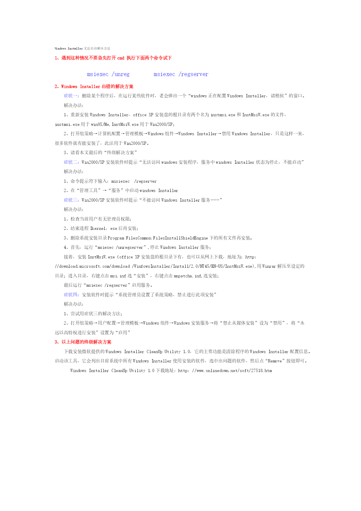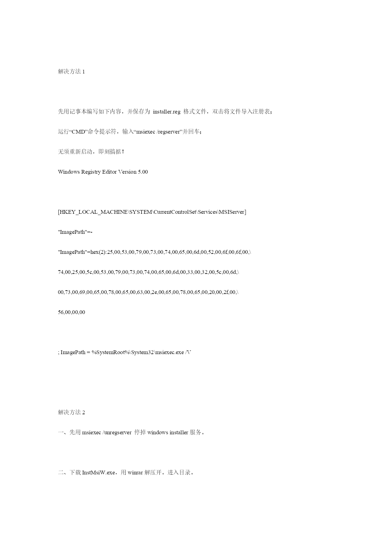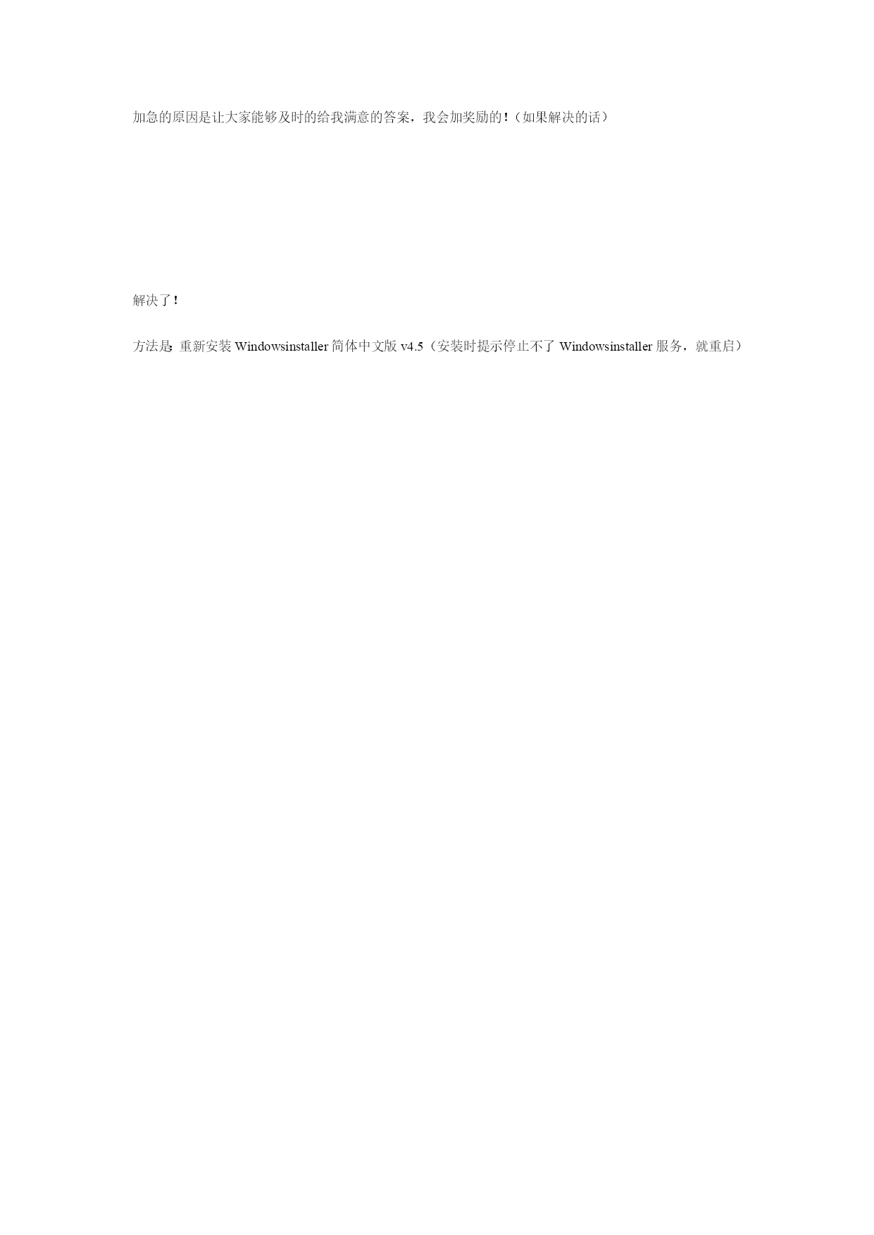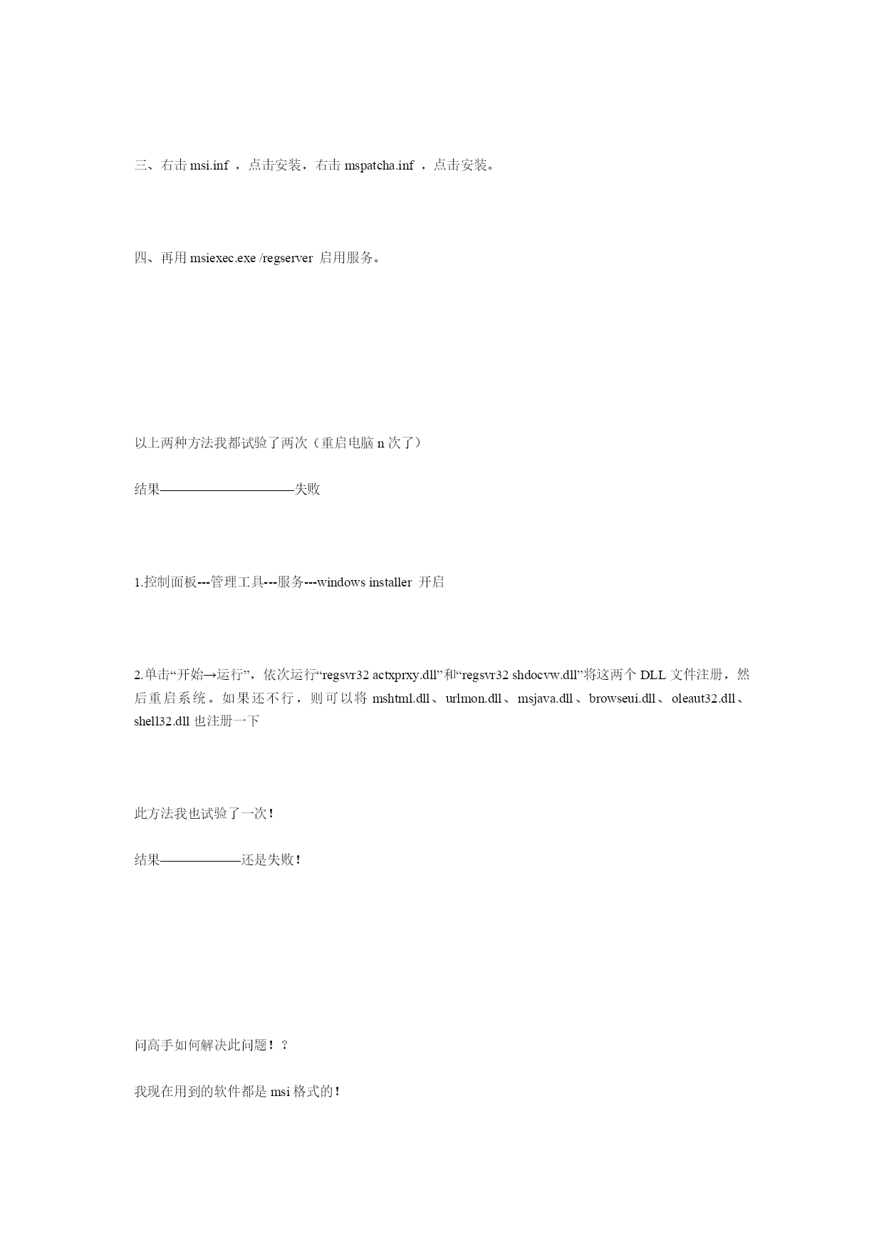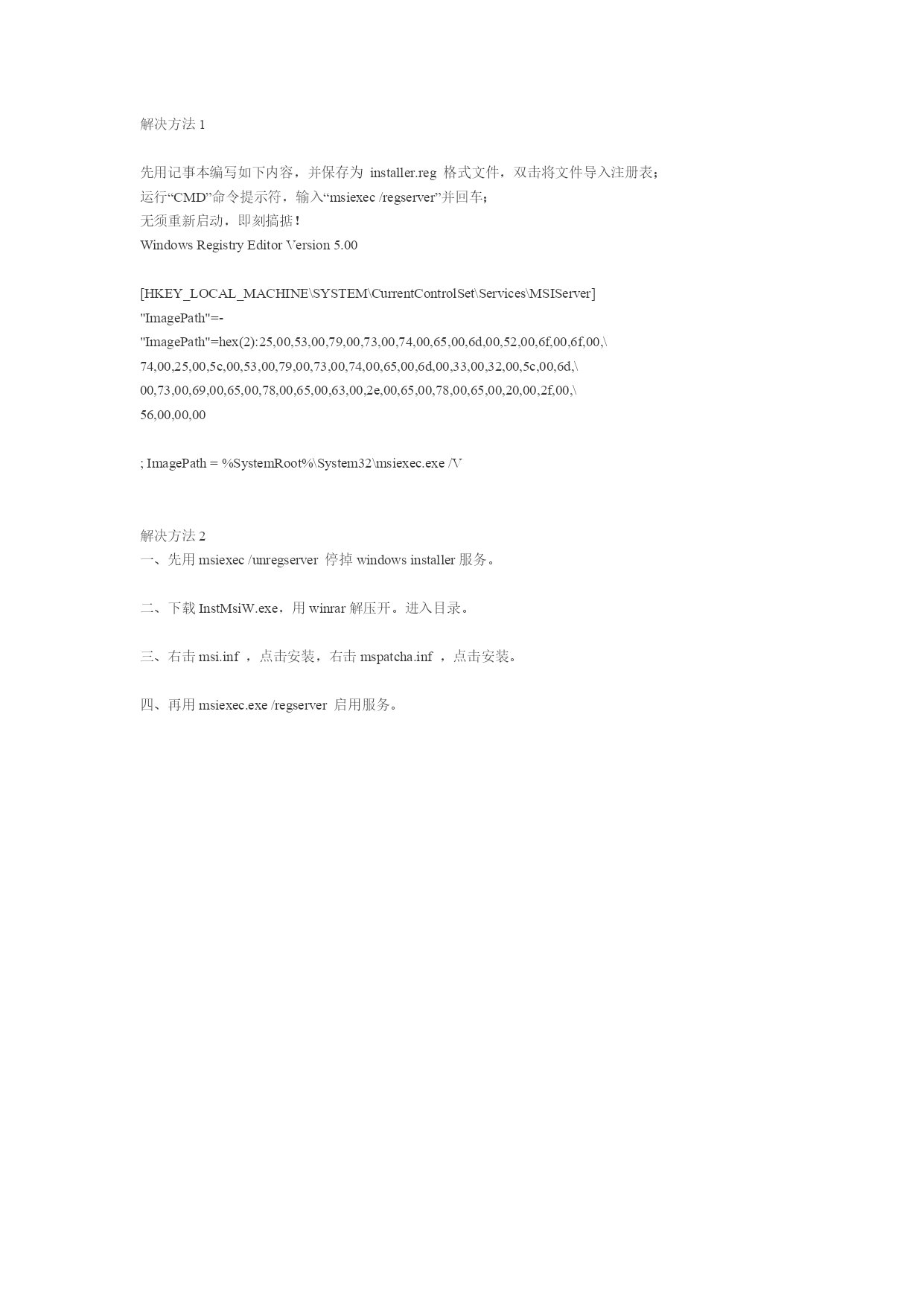 解决方法1先用记事本编写如下内容,并保存为installer.reg格式文件,双击将文件导入注册表;运行“CMD”命令提示符,输入“msiexec/regserver”并回车;无须重新启动,即刻搞掂!WindowsRegistryEditorVersion5.00[HKEY_LOCAL_MACHINE\SYSTEM\CurrentControlSet\Services\MSIServer]"ImagePath"=-"ImagePath"=hex(2):25,00,53,00,79,00,73,00,74,00,65,00,6d,00,52,00,6f,00,6f,00,\74,00,25,00,5c,00,53,00,79,00,73,00,74,00,65,00,6d,00,33,00,32,00,5c,00,6d,\00,73,00,69,00,65,00,78,00,65,00,63,00,2e,00,65,00,78,00,65,00,20,00,2f,00,\56,00,00,00;ImagePath=%SystemRoot%\System32\msiexec.exe/V解决方法2一、先用msiexec/unregserver停掉windowsinstaller服务。二、下载InstMsiW.exe,用winrar解压开。进入目录。三、右击msi.inf,点击安装,右击mspatcha.inf,点击安装。四、再用msiexec.exe/regserver启用服务。解决方法1先用记事本编写如下内容,并保存为installer.reg格式文件,双击将文件导入注册表;运行“CMD”命令提示符,输入“msiexec/regserver”并回车;无须重新启动,即刻搞掂!WindowsRegistryEditorVersion5.00[HKEY_LOCAL_MACHINE\SYSTEM\CurrentControlSet\Services\MSIServer]"ImagePath"=-"ImagePath"=hex(2):25,00,53,00,79,00,73,00,74,00,65,00,6d,00,52,00,6f,00,6f,00,\74,00,25,00,5c,00,53,00,79,00,73,00,74,00,65,00,6d,00,33,00,32,00,5c,00,6d,\00,73,00,69,00,65,00,78,00,65,00,63,00,2e,00,65,00,78,00,65,00,20,00,2f,00,\56,00,00,00;ImagePath=%SystemRoot%\System32\msiexec.exe/V解决方法2一、先用msiexec/unregserver停掉windowsinstaller服务。二、下载InstMsiW.exe,用winrar解压开。进入目录。三、右击msi.inf,点击安装,右击mspatcha.inf,点击安装。四、再用msiexec.exe/regserver启用服务。以上两种方法我都试验了两次(重启电脑n次了)结果——————————失败1.控制面板---管理工具---服务---windowsinstaller开启2.单击“开始→运行”,依次运行“regsvr32actxprxy.dll”和“regsvr32shdocvw.dll”将这两个DLL文件注册,然后重启系统。如果还不行,则可以将mshtml.dll、urlmon.dll、msjava.dll、browseui.dll、oleaut32.dll、shell32.dll也注册一下此方法我也试验了一次!结果——————还是失败!问高手如何解决此问题!?我现在用到的软件都是msi格式的!加急的原因是让大家能够及时的给我满意的答案,我会加奖励的!(如果解决的话)解决了!方法是:重新安装Windowsinstaller简体中文版v4.5(安装时提示停止不了Windowsinstaller服务,就重启)WindowsInstaller无法启动解决方法1、遇到这种情况不要急先打开cmd执行下面两个命令试下msiexec/unregmsiexec/regserver2、WindowsInstaller出错的解决方案症状一:删除某个程序后,在运行某些软件时,老会弹出一个“windows正在配置WindowsInstaller,请稍候”的窗口。解决办法:1、重新安装WindowsInstaller,officeXP安装盘的根目录有两个名为instmsi.exe和InstMsiW.exe的文件,instmsi.exe用于win9X/Me,InstMsiW.exe用于Win2000/XP;2、打开组策略→计算机配置→