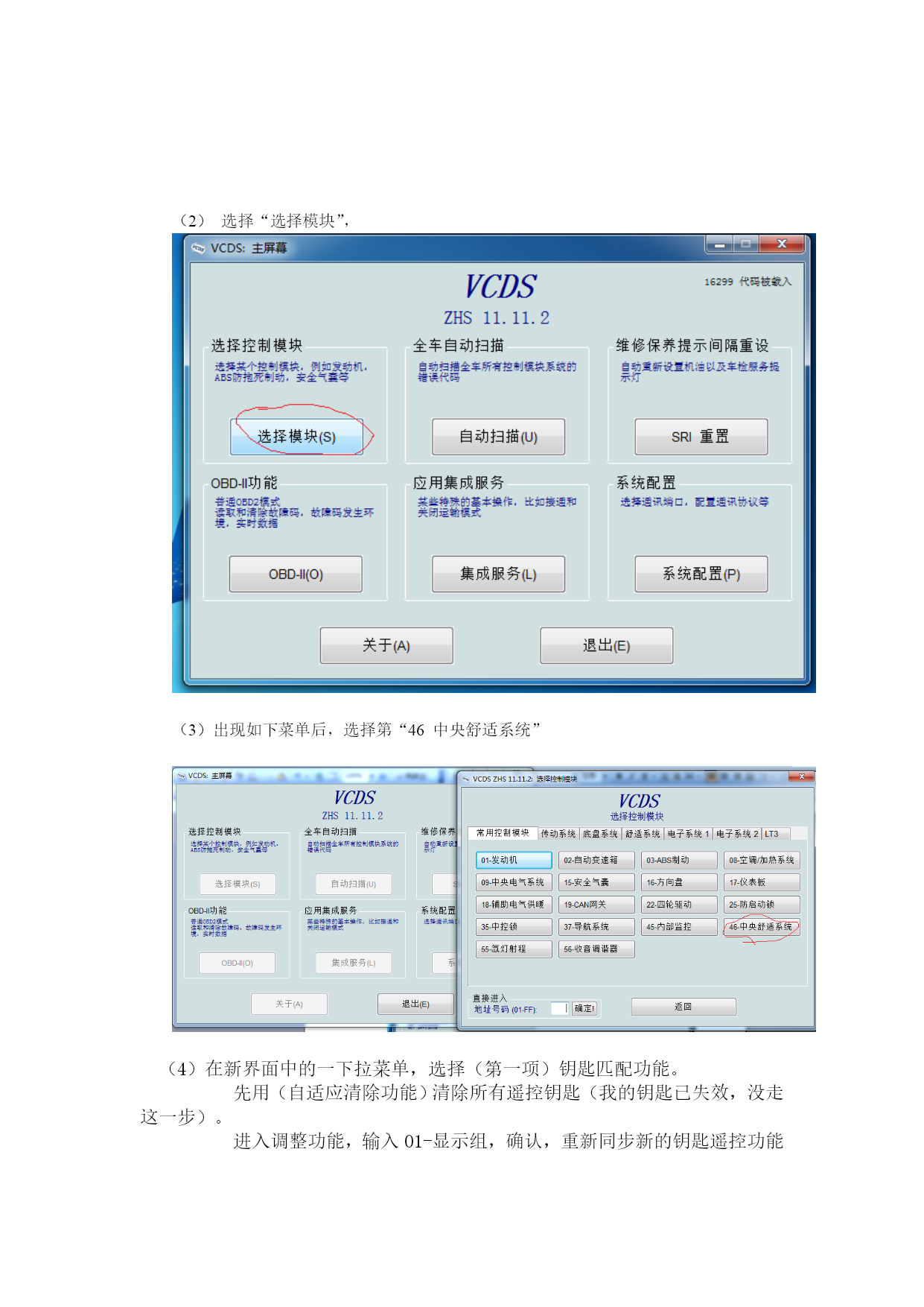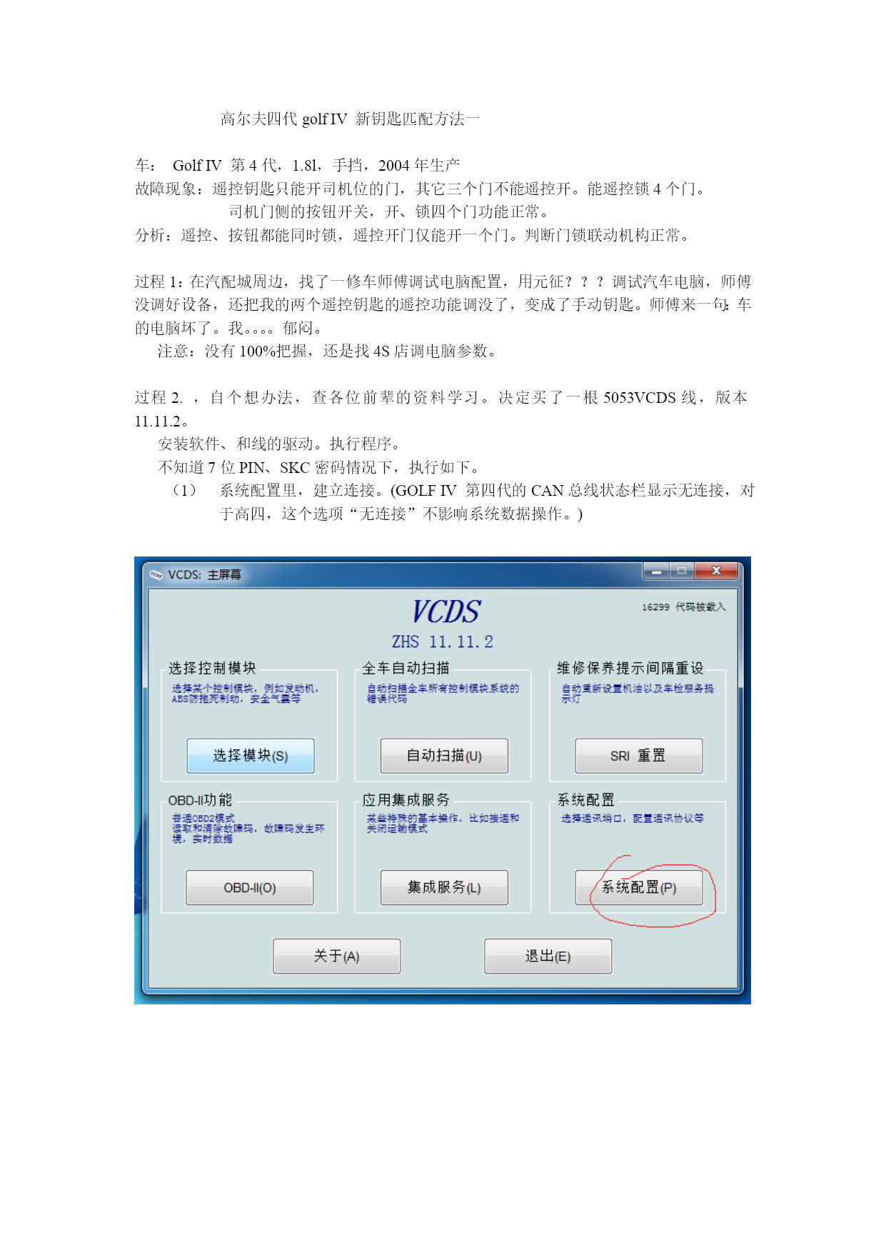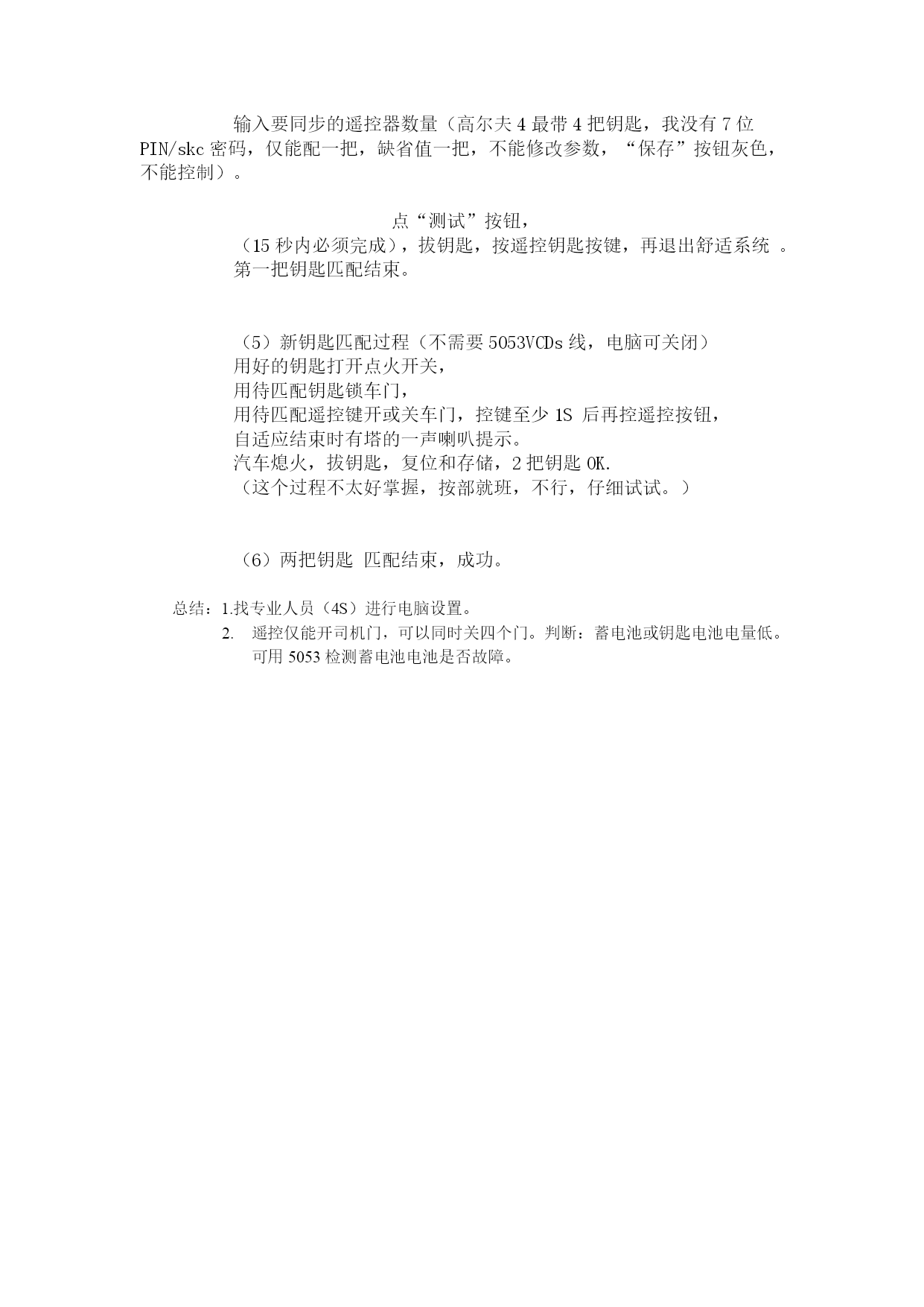 高尔夫四代golfIV新钥匙匹配方法一车:GolfIV第4代,1.8l,手挡,2004年生产故障现象:遥控钥匙只能开司机位的门,其它三个门不能遥控开。能遥控锁4个门。司机门侧的按钮开关,开、锁四个门功能正常。分析:遥控、按钮都能同时锁,遥控开门仅能开一个门。判断门锁联动机构正常。过程1:在汽配城周边,找了一修车师傅调试电脑配置,用元征???调试汽车电脑,师傅没调好设备,还把我的两个遥控钥匙的遥控功能调没了,变成了手动钥匙。师傅来一句:车的电脑坏了。我。。。。郁闷。注意:没有100%把握,还是找4S店调电脑参数。过程2.,自个想办法,查各位前辈的资料学习。决定买了一根5053VCDS线,版本11.11.2。安装软件、和线的驱动。执行程序。不知道7位PIN、SKC密码情况下,执行如下。系统配置里,建立连接。(GOLFIV第四代的CAN总线状态栏显示无连接,对于高四,这个选项“无连接”不影响系统数据操作。)(2)选择“选择模块”,(3)出现如下菜单后,选择第“46中央舒适系统”(4)在新界面中的一下拉菜单,选择(第一项)钥匙匹配功能。先用(自适应清除功能)清除所有遥控钥匙(我的钥匙已失效,没走这一步)。进入调整功能,输入01-显示组,确认,重新同步新的钥匙遥控功能输入要同步的遥控器数量(高尔夫4最带4把钥匙,我没有7位PIN/skc密码,仅能配一把,缺省值一把,不能修改参数,“保存”按钮灰色,不能控制)。点“测试”按钮,(15秒内必须完成),拔钥匙,按遥控钥匙按键,再退出舒适系统。第一把钥匙匹配结束。(5)新钥匙匹配过程(不需要5053VCDs线,电脑可关闭)用好的钥匙打开点火开关,用待匹配钥匙锁车门,用待匹配遥控键开或关车门,控键至少1S后再控遥控按钮,自适应结束时有塔的一声喇叭提示。汽车熄火,拔钥匙,复位和存储,2把钥匙OK.(这个过程不太好掌握,按部就班,不行,仔细试试。)(6)两把钥匙匹配结束,成功。总结:1.找专业人员(4S)进行电脑设置。遥控仅能开司机门,可以同时关四个门。判断:蓄电池或钥匙电池电量低。可用5053检测蓄电池电池是否故障。