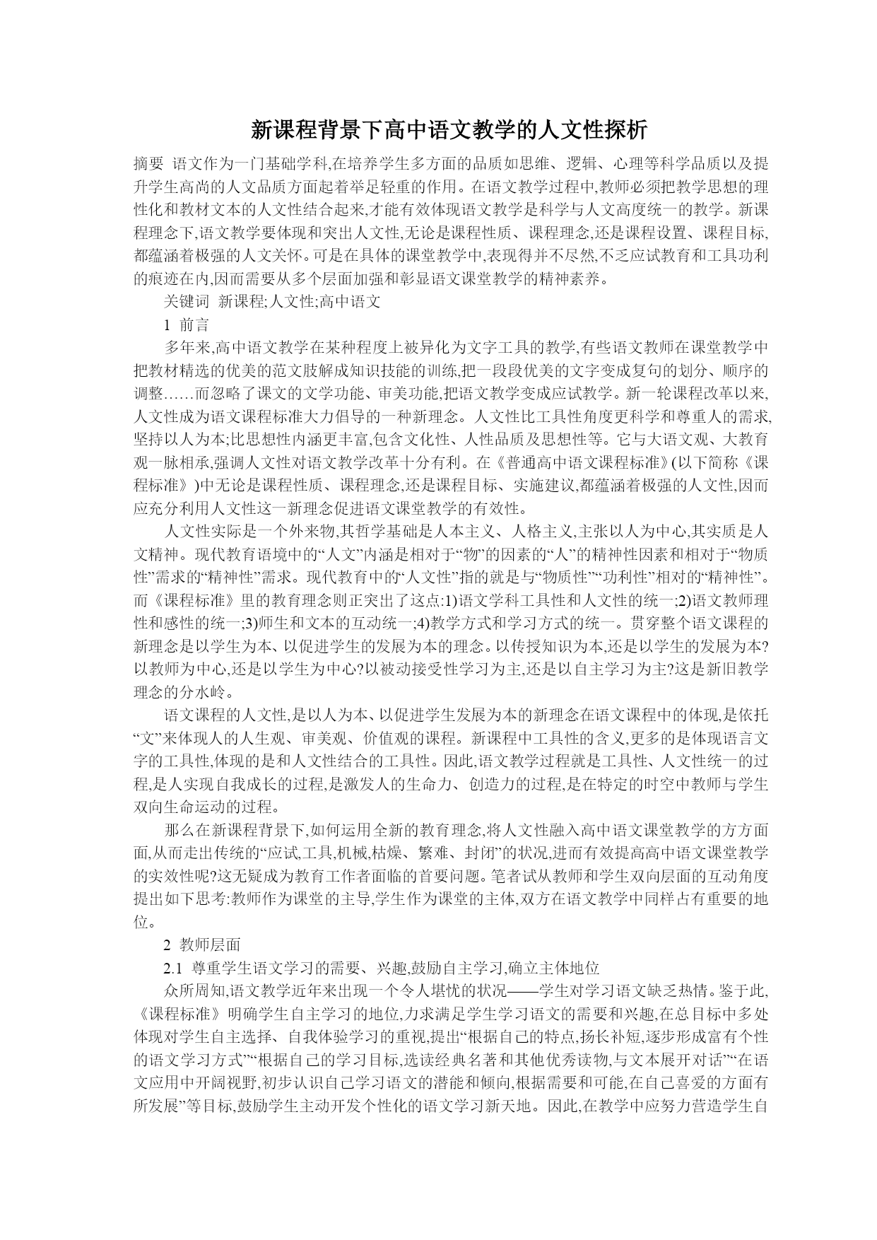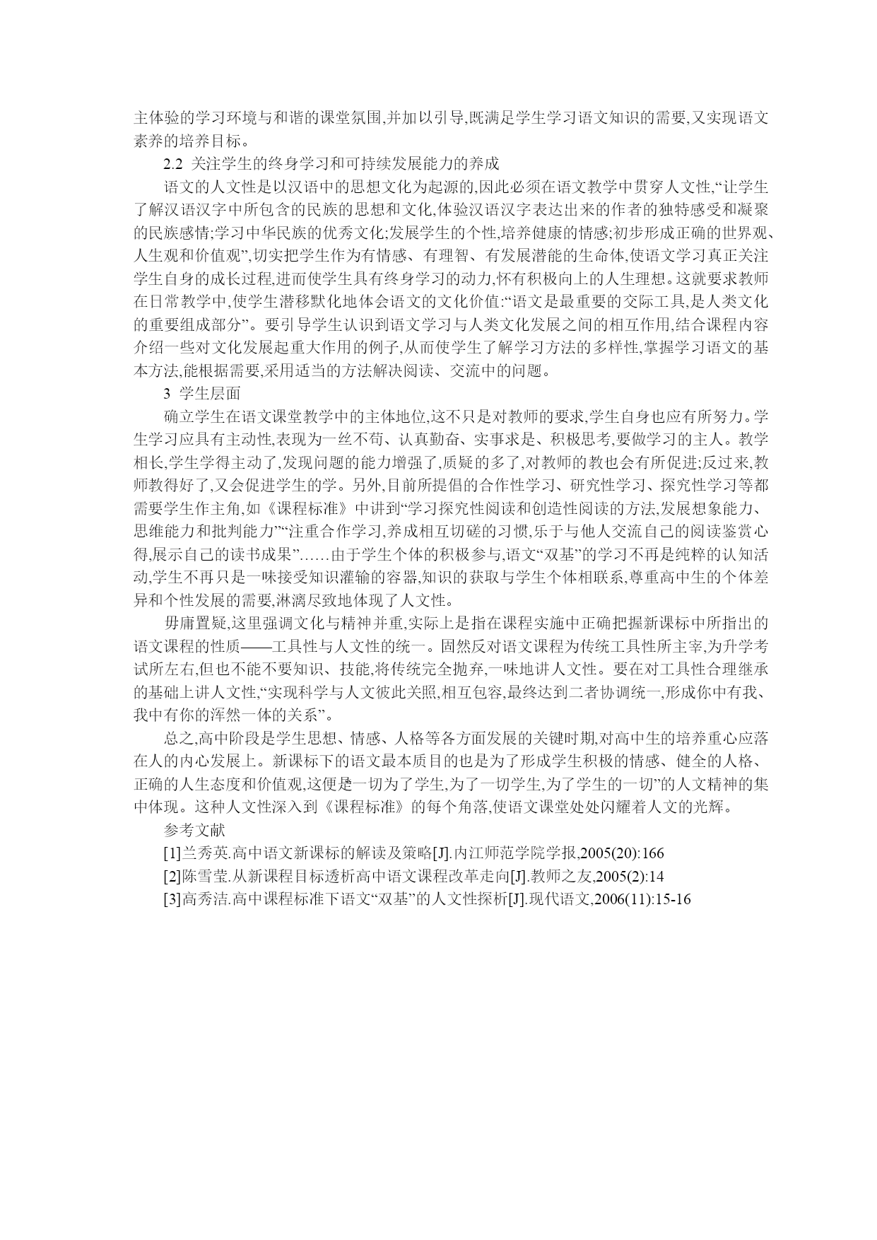 新课程背景下高中语文教学的人文性探析摘要语文作为一门基础学科,在培养学生多方面的品质如思维、逻辑、心理等科学品质以及提升学生高尚的人文品质方面起着举足轻重的作用。在语文教学过程中,教师必须把教学思想的理性化和教材文本的人文性结合起来,才能有效体现语文教学是科学与人文高度统一的教学。新课程理念下,语文教学要体现和突出人文性,无论是课程性质、课程理念,还是课程设置、课程目标,都蕴涵着极强的人文关怀。可是在具体的课堂教学中,表现得并不尽然,不乏应试教育和工具功利的痕迹在内,因而需要从多个层面加强和彰显语文课堂教学的精神素养。关键词新课程;人文性;高中语文1前言多年来,高中语文教学在某种程度上被异化为文字工具的教学,有些语文教师在课堂教学中把教材精选的优美的范文肢解成知识技能的训练,把一段段优美的文字变成复句的划分、顺序的调整……而忽略了课文的文学功能、审美功能,把语文教学变成应试教学。新一轮课程改革以来,人文性成为语文课程标准大力倡导的一种新理念。人文性比工具性角度更科学和尊重人的需求,坚持以人为本;比思想性内涵更丰富,包含文化性、人性品质及思想性等。它与大语文观、大教育观一脉相承,强调人文性对语文教学改革十分有利。在《普通高中语文课程标准》(以下简称《课程标准》)中无论是课程性质、课程理念,还是课程目标、实施建议,都蕴涵着极强的人文性,因而应充分利用人文性这一新理念促进语文课堂教学的有效性。人文性实际是一个外来物,其哲学基础是人本主义、人格主义,主张以人为中心,其实质是人文精神。现代教育语境中的“人文”内涵是相对于“物”的因素的“人”的精神性因素和相对于“物质性”需求的“精神性”需求。现代教育中的“人文性”指的就是与“物质性”“功利性”相对的“精神性”。而《课程标准》里的教育理念则正突出了这点:1)语文学科工具性和人文性的统一;2)语文教师理性和感性的统一;3)师生和文本的互动统一;4)教学方式和学习方式的统一。贯穿整个语文课程的新理念是以学生为本、以促进学生的发展为本的理念。以传授知识为本,还是以学生的发展为本?以教师为中心,还是以学生为中心?以被动接受性学习为主,还是以自主学习为主?这是新旧教学理念的分水岭。语文课程的人文性,是以人为本、以促进学生发展为本的新理念在语文课程中的体现,是依托“文”来体现人的人生观、审美观、价值观的课程。新课程中工具性的含义,更多的是体现语言文字的工具性,体现的是和人文性结合的工具性。因此,语文教学过程就是工具性、人文性统一的过程,是人实现自我成长的过程,是激发人的生命力、创造力的过程,是在特定的时空中教师与学生双向生命运动的过程。那么在新课程背景下,如何运用全新的教育理念,将人文性融入高中语文课堂教学的方方面面,从而走出传统的“应试,工具,机械,枯燥、繁难、封闭”的状况,进而有效提高高中语文课堂教学的实效性呢?这无疑成为教育工作者面临的首要问题。笔者试从教师和学生双向层面的互动角度提出如下思考:教师作为课堂的主导,学生作为课堂的主体,双方在语文教学中同样占有重要的地位。2教师层面2.1尊重学生语文学习的需要、兴趣,鼓励自主学习,确立主体地位众所周知,语文教学近年来出现一个令人堪忧的状况——学生对学习语文缺乏热情。鉴于此,《课程标准》明确学生自主学习的地位,力求满足学生学习语文的需要和兴趣,在总目标中多处体现对学生自主选择、自我体验学习的重视,提出“根据自己的特点,扬长补短,逐步形成富有个性的语文学习方式”“根据自己的学习目标,选读经典名著和其他优秀读物,与文本展开对话”“在语文应用中开阔视野,初步认识自己学习语文的潜能和倾向,根据需要和可能,在自己喜爱的方面有所发展”等目标,鼓励学生主动开发个性化的语文学习新天地。因此,在教学中应努力营造学生自主体验的学习环境与和谐的课堂氛围,并加以引导,既满足学生学习语文知识的需要,又实现语文素养的培养目标。2.2关注学生的终身学习和可持续发展能力的养成语文的人文性是以汉语中的思想文化为起源的,因此必须在语文教学中贯穿人文性,“让学生了解汉语汉字中所包含的民族的思想和文化,体验汉语汉字表达出来的作者的独特感受和凝聚的民族感情;学习中华民族的优秀文化;发展学生的个性,培养健康的情感;初步形成正确的世界观、人生观和价值观”,切实把学生作为有情感、有理智、有发展潜能的生命体,使语文学习真正关注学生自身的成长过程,进而使学生具有终身学习的动力,怀有积极向上的人生理想。这就要求教师在日常教学中,使学生潜移默化地体会语文的文化价值:“语文是最重要的交际工具,是人类文化的重要组成部分”。要引导学生认识到语文学习与人类文化发展之间的相互作用,结合课程内容介绍一些对文化发展起重大作用的例子,从而使学生了解学习方法的多样性,掌握学习语文的基本方法,能根据需要,采用适当的方法解决阅