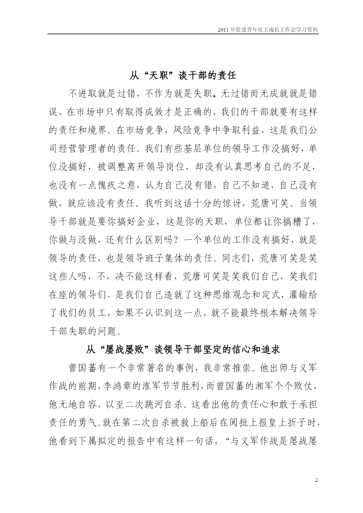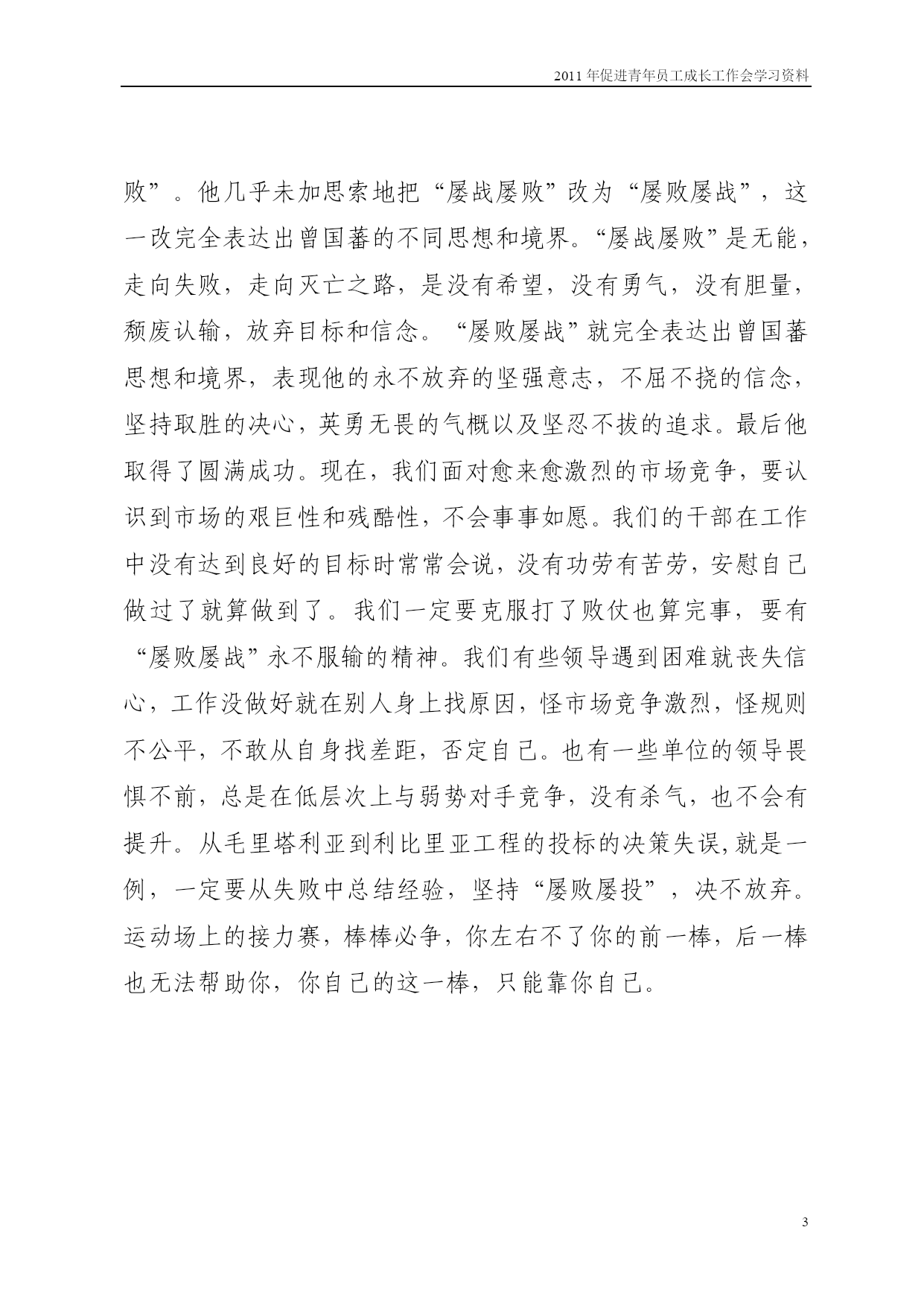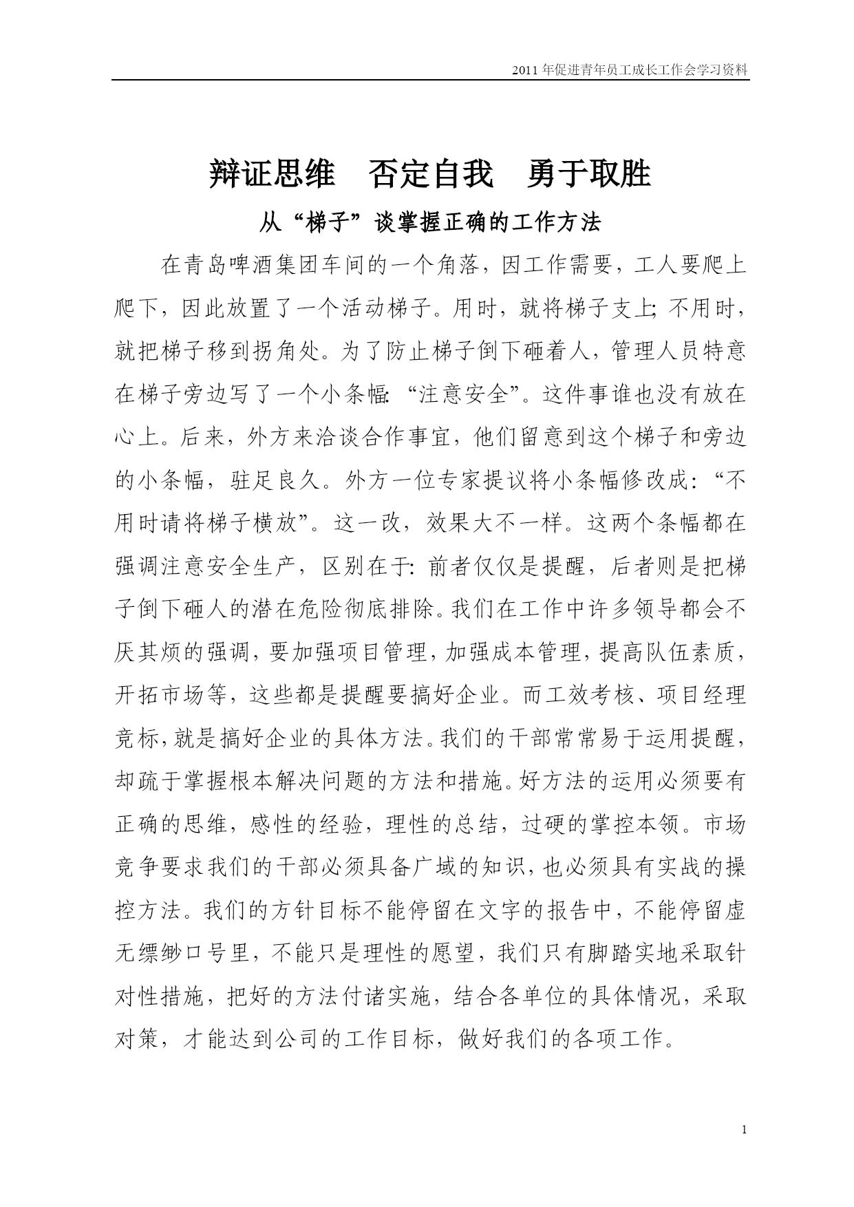 2011年促进青年员工成长工作会学习资料辩证思维否定自我勇于取胜从“梯子”谈掌握正确的工作方法在青岛啤酒集团车间的一个角落,因工作需要,工人要爬上爬下,因此放置了一个活动梯子。用时,就将梯子支上;不用时,就把梯子移到拐角处。为了防止梯子倒下砸着人,管理人员特意在梯子旁边写了一个小条幅:“注意安全”。这件事谁也没有放在心上。后来,外方来洽谈合作事宜,他们留意到这个梯子和旁边的小条幅,驻足良久。外方一位专家提议将小条幅修改成:“不用时请将梯子横放”。这一改,效果大不一样。这两个条幅都在强调注意安全生产,区别在于:前者仅仅是提醒,后者则是把梯子倒下砸人的潜在危险彻底排除。我们在工作中许多领导都会不厌其烦的强调,要加强项目管理,加强成本管理,提高队伍素质,开拓市场等,这些都是提醒要搞好企业。而工效考核、项目经理竞标,就是搞好企业的具体方法。我们的干部常常易于运用提醒,却疏于掌握根本解决问题的方法和措施。好方法的运用必须要有正确的思维,感性的经验,理性的总结,过硬的掌控本领。市场竞争要求我们的干部必须具备广域的知识,也必须具有实战的操控方法。我们的方针目标不能停留在文字的报告中,不能停留虚无缥缈口号里,不能只是理性的愿望,我们只有脚踏实地采取针对性措施,把好的方法付诸实施,结合各单位的具体情况,采取对策,才能达到公司的工作目标,做好我们的各项工作。从“天职”谈干部的责任不进取就是过错,不作为就是失职。无过错而无成就就是错误,在市场中只有取得成效才是正确的,我们的干部就要有这样的责任和境界。在市场竞争,风险竞争中争取利益,这是我们公司经营管理者的责任。我们有些基层单位的领导工作没搞好,单位没搞好,被调整离开领导岗位,却没有认真思考自己的不足,也没有一点愧疚之意,认为自己没有错,自己不知道,自己没有做,就应该没有责任。我听到这话十分的惊讶,荒唐可笑。当领导干部就是要你搞好企业,这是你的天职,单位都让你搞糟了,你做与没做,还有什么区别吗?一个单位的工作没有搞好,就是领导的责任,也是领导班子集体的责任。同志们,荒唐可笑是笑这些人吗,不,决不能这样看,荒唐可笑是笑我们自己,笑我们在座的领导们,是我们自己造就了这种思维观念和定式,灌输给了我们的员工,如果不认识到这一点,就不能最终根本解决领导干部失职的问题。从“屡战屡败”谈领导干部坚定的信心和追求曾国蕃有一个非常著名的事例,我非常推崇。他出师与义军作战的前期,李鸿章的淮军节节胜利,而曾国蕃的湘军个个败仗,他无地自容,以至二次跳河自杀。这看出他的责任心和敢于承担责任的勇气。就在第二次自杀被救上船后在阅批上报皇上折子时,他看到下属拟定的报告中有这样一句话,“与义军作战是屡战屡败”。他几乎未加思索地把“屡战屡败”改为“屡败屡战”,这一改完全表达出曾国蕃的不同思想和境界。“屡战屡败”是无能,走向失败,走向灭亡之路,是没有希望,没有勇气,没有胆量,颓废认输,放弃目标和信念。“屡败屡战”就完全表达出曾国蕃思想和境界,表现他的永不放弃的坚强意志,不屈不挠的信念,坚持取胜的决心,英勇无畏的气概以及坚忍不拔的追求。最后他取得了圆满成功。现在,我们面对愈来愈激烈的市场竞争,要认识到市场的艰巨性和残酷性,不会事事如愿。我们的干部在工作中没有达到良好的目标时常常会说,没有功劳有苦劳,安慰自己做过了就算做到了。我们一定要克服打了败仗也算完事,要有“屡败屡战”永不服输的精神。我们有些领导遇到困难就丧失信心,工作没做好就在别人身上找原因,怪市场竞争激烈,怪规则不公平,不敢从自身找差距,否定自己。也有一些单位的领导畏惧不前,总是在低层次上与弱势对手竞争,没有杀气,也不会有提升。从毛里塔利亚到利比里亚工程的投标的决策失误,就是一例,一定要从失败中总结经验,坚持“屡败屡投”,决不放弃。运动场上的接力赛,棒棒必争,你左右不了你的前一棒,后一棒也无法帮助你,你自己的这一棒,只能靠你自己。