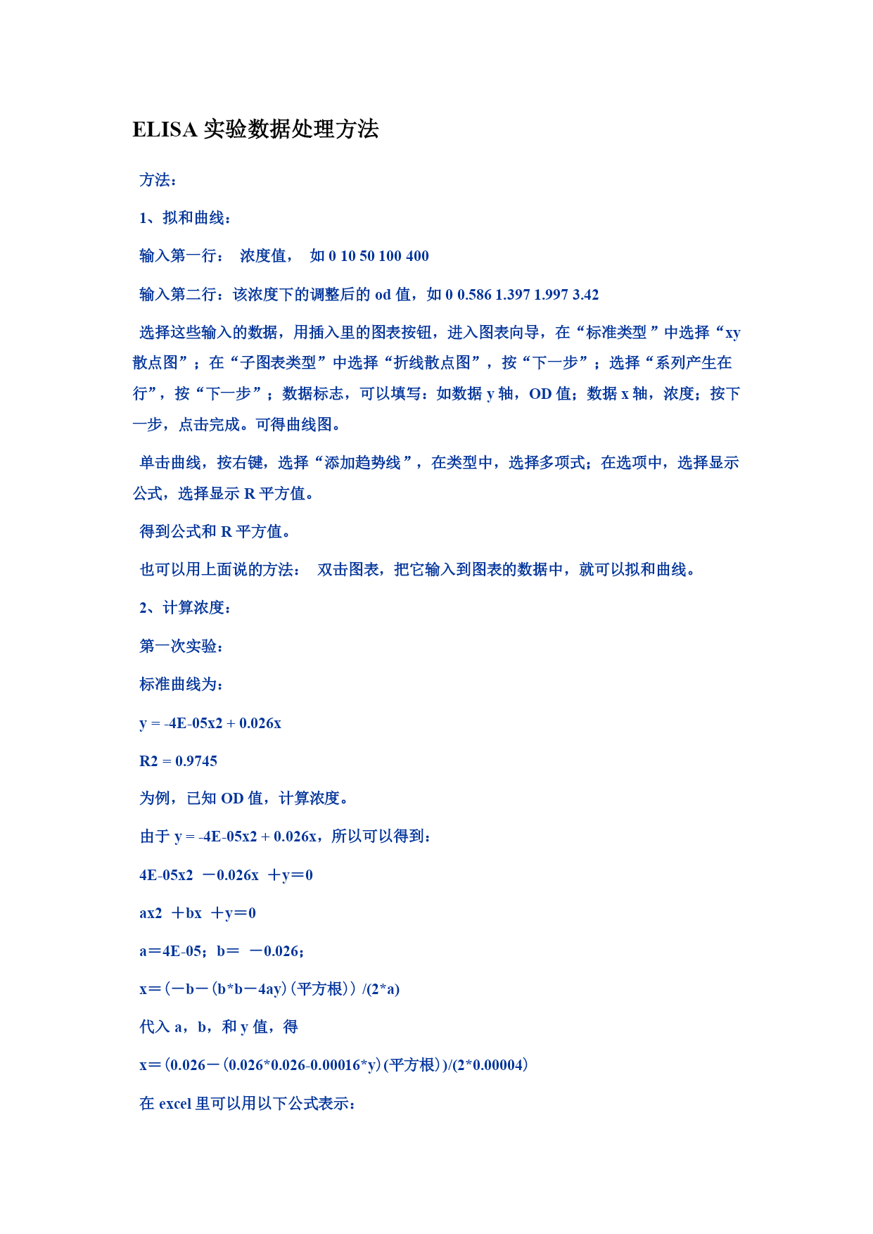 ELISA实验数据处理方法方法:1、拟和曲线:输入第一行:浓度值,如01050100400输入第二行:该浓度下的调整后的od值,如00.5861.3971.9973.42选择这些输入的数据,用插入里的图表按钮,进入图表向导,在“标准类型”中选择“xy散点图”;在“子图表类型”中选择“折线散点图”,按“下一步”;选择“系列产生在行”,按“下一步”;数据标志,可以填写:如数据y轴,OD值;数据x轴,浓度;按下一步,点击完成。可得曲线图。单击曲线,按右键,选择“添加趋势线”,在类型中,选择多项式;在选项中,选择显示公式,选择显示R平方值。得到公式和R平方值。也可以用上面说的方法:双击图表,把它输入到图表的数据中,就可以拟和曲线。2、计算浓度:第一次实验:标准曲线为:y=-4E-05x2+0.026xR2=0.9745为例,已知OD值,计算浓度。由于y=-4E-05x2+0.026x,所以可以得到:4E-05x2-0.026x+y=0ax2+bx+y=0a=4E-05;b=-0.026;x=(-b-(b*b-4ay)(平方根))/(2*a)代入a,b,和y值,得x=(0.026-(0.026*0.026-0.00016*y)(平方根))/(2*0.00004)在excel里可以用以下公式表示:x=(0.026-EXP(LN(0.026*0.026-0.00016*y)/2))/(2*0.00004)通用公式为:x=(-b-EXP(LN(b*b-4ay)/2))/(2*a)您可以应用excel的公式拷贝功能,计算所有浓度
