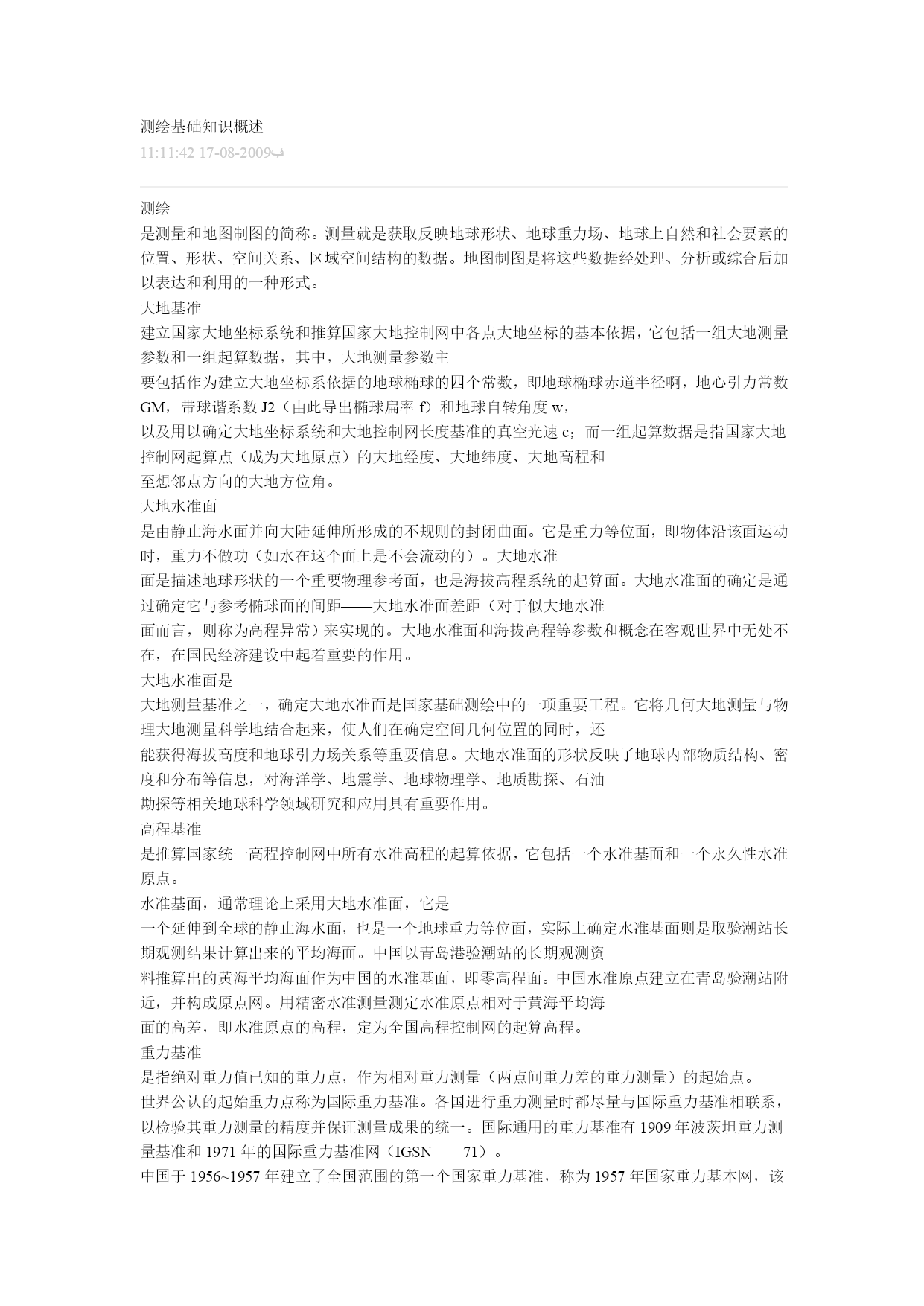 测绘基础知识概述ڣ2009-08-1711:11:42测绘是测量和地图制图的简称。测量就是获取反映地球形状、地球重力场、地球上自然和社会要素的位置、形状、空间关系、区域空间结构的数据。地图制图是将这些数据经处理、分析或综合后加以表达和利用的一种形式。大地基准建立国家大地坐标系统和推算国家大地控制网中各点大地坐标的基本依据,它包括一组大地测量参数和一组起算数据,其中,大地测量参数主要包括作为建立大地坐标系依据的地球椭球的四个常数,即地球椭球赤道半径啊,地心引力常数GM,带球谐系数J2(由此导出椭球扁率f)和地球自转角度w,以及用以确定大地坐标系统和大地控制网长度基准的真空光速c;而一组起算数据是指国家大地控制网起算点(成为大地原点)的大地经度、大地纬度、大地高程和至想邻点方向的大地方位角。大地水准面是由静止海水面并向大陆延伸所形成的不规则的封闭曲面。它是重力等位面,即物体沿该面运动时,重力不做功(如水在这个面上是不会流动的)。大地水准面是描述地球形状的一个重要物理参考面,也是海拔高程系统的起算面。大地水准面的确定是通过确定它与参考椭球面的间距——大地水准面差距(对于似大地水准面而言,则称为高程异常)来实现的。大地水准面和海拔高程等参数和概念在客观世界中无处不在,在国民经济建设中起着重要的作用。大地水准面是大地测量基准之一,确定大地水准面是国家基础测绘中的一项重要工程。它将几何大地测量与物理大地测量科学地结合起来,使人们在确定空间几何位置的同时,还能获得海拔高度和地球引力场关系等重要信息。大地水准面的形状反映了地球内部物质结构、密度和分布等信息,对海洋学、地震学、地球物理学、地质勘探、石油勘探等相关地球科学领域研究和应用具有重要作用。高程基准是推算国家统一高程控制网中所有水准高程的起算依据,它包括一个水准基面和一个永久性水准原点。水准基面,通常理论上采用大地水准面,它是一个延伸到全球的静止海水面,也是一个地球重力等位面,实际上确定水准基面则是取验潮站长期观测结果计算出来的平均海面。中国以青岛港验潮站的长期观测资料推算出的黄海平均海面作为中国的水准基面,即零高程面。中国水准原点建立在青岛验潮站附近,并构成原点网。用精密水准测量测定水准原点相对于黄海平均海面的高差,即水准原点的高程,定为全国高程控制网的起算高程。重力基准是指绝对重力值已知的重力点,作为相对重力测量(两点间重力差的重力测量)的起始点。世界公认的起始重力点称为国际重力基准。各国进行重力测量时都尽量与国际重力基准相联系,以检验其重力测量的精度并保证测量成果的统一。国际通用的重力基准有1909年波茨坦重力测量基准和1971年的国际重力基准网(IGSN——71)。中国于1956~1957年建立了全国范围的第一个国家重力基准,称为1957年国家重力基本网,该网由21个基本点和82个一等点组成。1985年,中国重新建立了国家重力基准。它由6个基准重力点,46个基本重力点和5个因点组成,称为1985年国家重力基本网。地球重力场是地球的一种物理属性。表征地球内部、表面或外部各点所受地球重力作用的空间。根据地球重力场的分布,可以研究地球内部结构、地球形状以及对航天器的影响。54国家坐标系:采用克拉索夫斯基椭球参数,又称北京坐标系。80国家坐标系:采用国际地理联合会(IGU)第十六届大会推荐的椭球参数,大地坐标原点在陕西省泾和县永乐镇的大地坐标系,又称西安坐标系。基础测绘基础测绘是指为国民经济和社会发展以及为国家各个部门和各项专业测绘提供基础地理信息而实施测绘的总称。基础测绘必须在全国或局部区域按国家统一规划和统一技术标准进行。专业测绘是指产业部门为保证本部门业务工作所进行的具有专业内容的测绘的总称。专业测绘应采用国家测绘技术标准或者行业测绘技术标准。军事测绘:具有军事内容或者为军队作战、训练、军事工程、战略准备等而实施的测绘的总称。地籍测绘是对地块权属界线的界址点坐标进行精确测定,并把地块及其附着物的位置、面积、权属关系和利用状况等要素准确地绘制在图纸上和记录在专门的表册中的测绘工作。地籍测量的成果包括数据集(控制点和界址点坐标等)、地籍图和地籍册。测量标志是在陆地和海洋标定测量控制点位置的标石、觇标以及其他标记的总称。标石一般埋于地下,用于测量和标定控制点地理坐标、高程、重力、方位、长度(距离)等方面;觇标是建在地面上或其他建筑物顶部的测量专业标架,作为观测照准目标和供升高仪器位置之用。根据用途和使用期限,测量标志可分为永久性测量标志和临时性测量标志。永久性测量标志是指设有固定标志物以供测绘单位长期使用的需永久保存的测量标志。临时性测量标志指测绘单位在测量过程中设置和使用的,工作结束后不需要长期保存的标志物和标记。如:测站点木桩、活动觇标、测旗、测杆、航空摄影测量地面标志、绘在地面或建