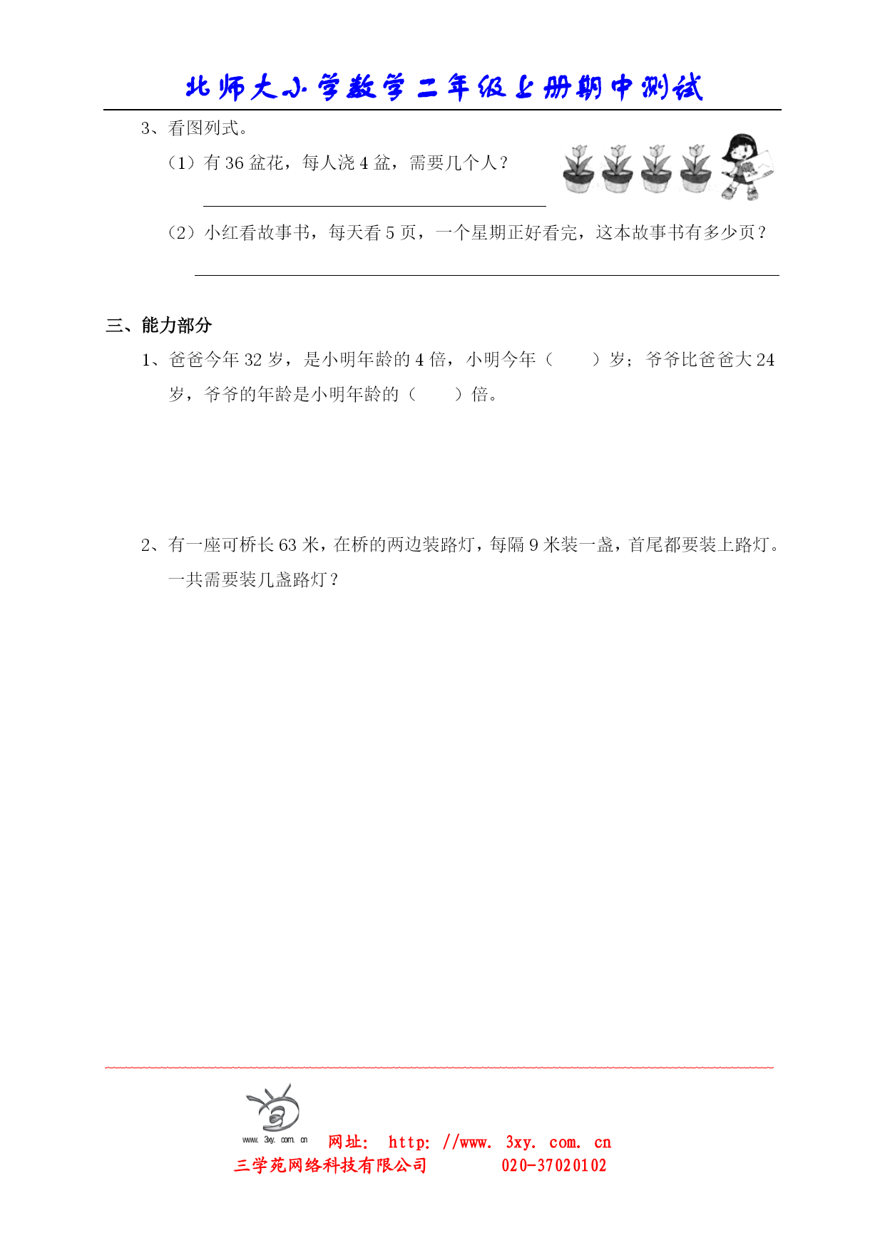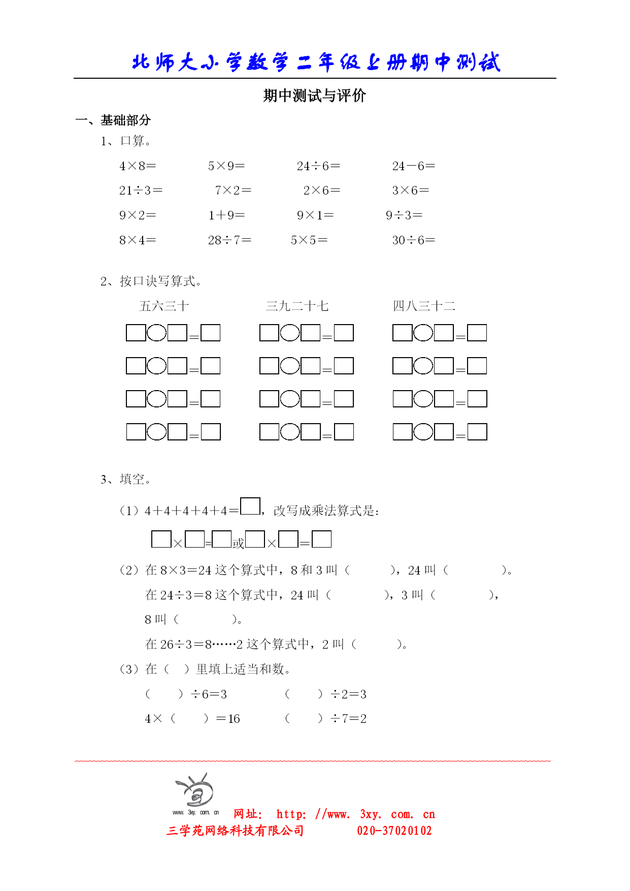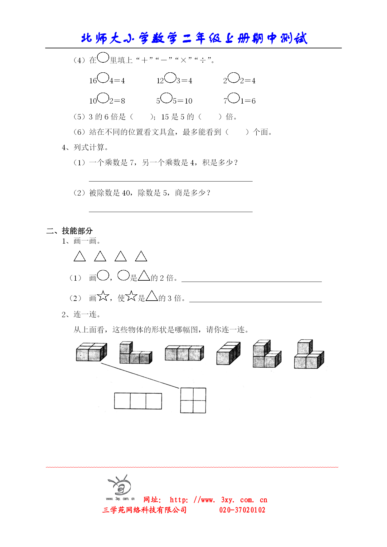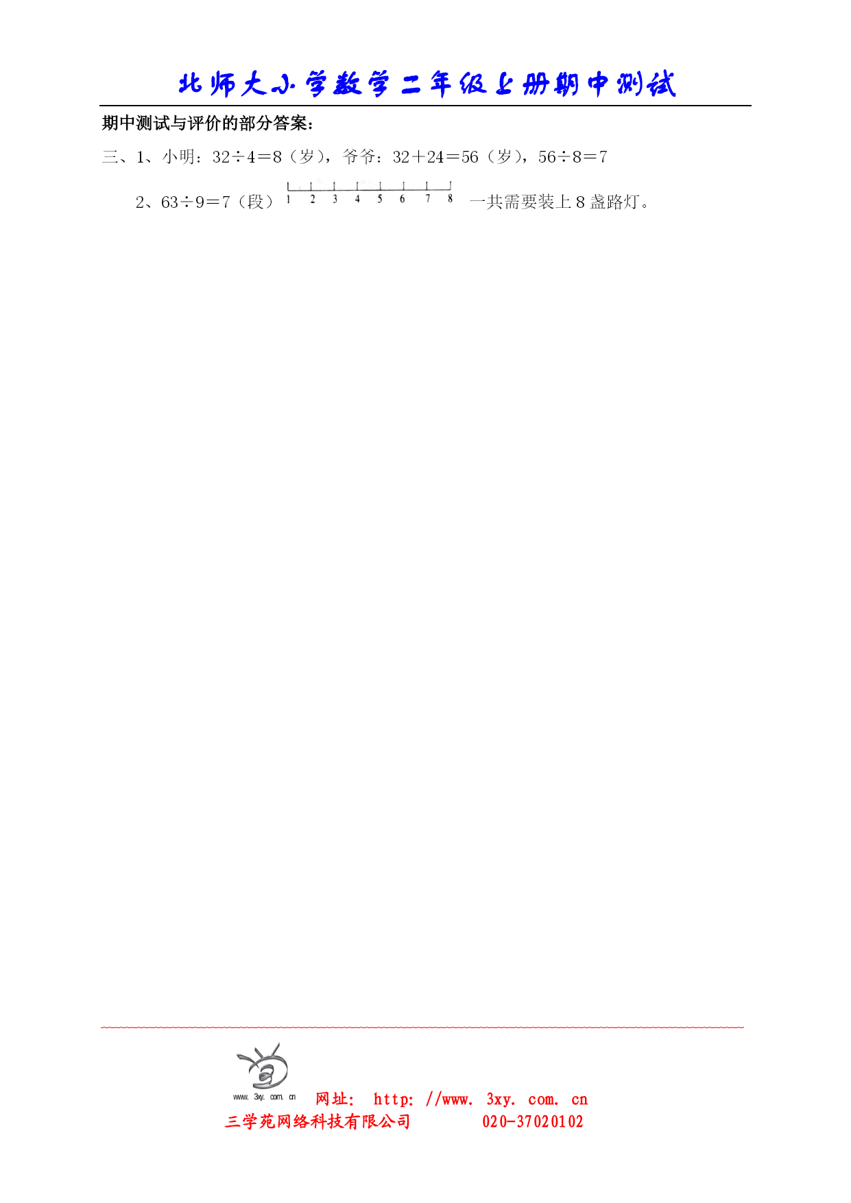 北师大小学数学二年级上册期中测试网址:http://www.3xy.com.cn三学苑网络科技有限公司020-37020102期中测试与评价一、基础部分口算。4×8=5×9=24÷6=24-6=21÷3=7×2=2×6=3×6=9×2=1+9=9×1=9÷3=8×4=28÷7=5×5=30÷6=2、按口诀写算式。五六三十三九二十七四八三十二============3、填空。(1)4+4+4+4+4=,改写成乘法算式是:×=或×=(2)在8×3=24这个算式中,8和3叫(),24叫()。在24÷3=8这个算式中,24叫(),3叫(),8叫()。在26÷3=8……2这个算式中,2叫()。(3)在()里填上适当和数。()÷6=3()÷2=34×()=16()÷7=2(4)在里填上“+”“-”“×”“÷”。164=4123=422=4102=855=1071=6(5)3的6倍是();15是5的()倍。(6)站在不同的位置看文具盒,最多能看到()个面。4、列式计算。(1)一个乘数是7,另一个乘数是4,积是多少?(2)被除数是40,除数是5,商是多少?二、技能部分画一画。画,是的2倍。画,使是的3倍。连一连。从上面看,这些物体的形状是哪幅图,请你连一连。看图列式。(1)有36盆花,每人浇4盆,需要几个人?(2)小红看故事书,每天看5页,一个星期正好看完,这本故事书有多少页?三、能力部分1、爸爸今年32岁,是小明年龄的4倍,小明今年()岁;爷爷比爸爸大24岁,爷爷的年龄是小明年龄的()倍。有一座可桥长63米,在桥的两边装路灯,每隔9米装一盏,首尾都要装上路灯。一共需要装几盏路灯?期中测试与评价的部分答案:三、1、小明:32÷4=8(岁),爷爷:32+24=56(岁),56÷8=72、63÷9=7(段)一共需要装上8盏路灯。