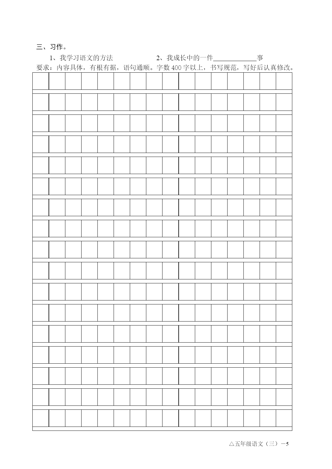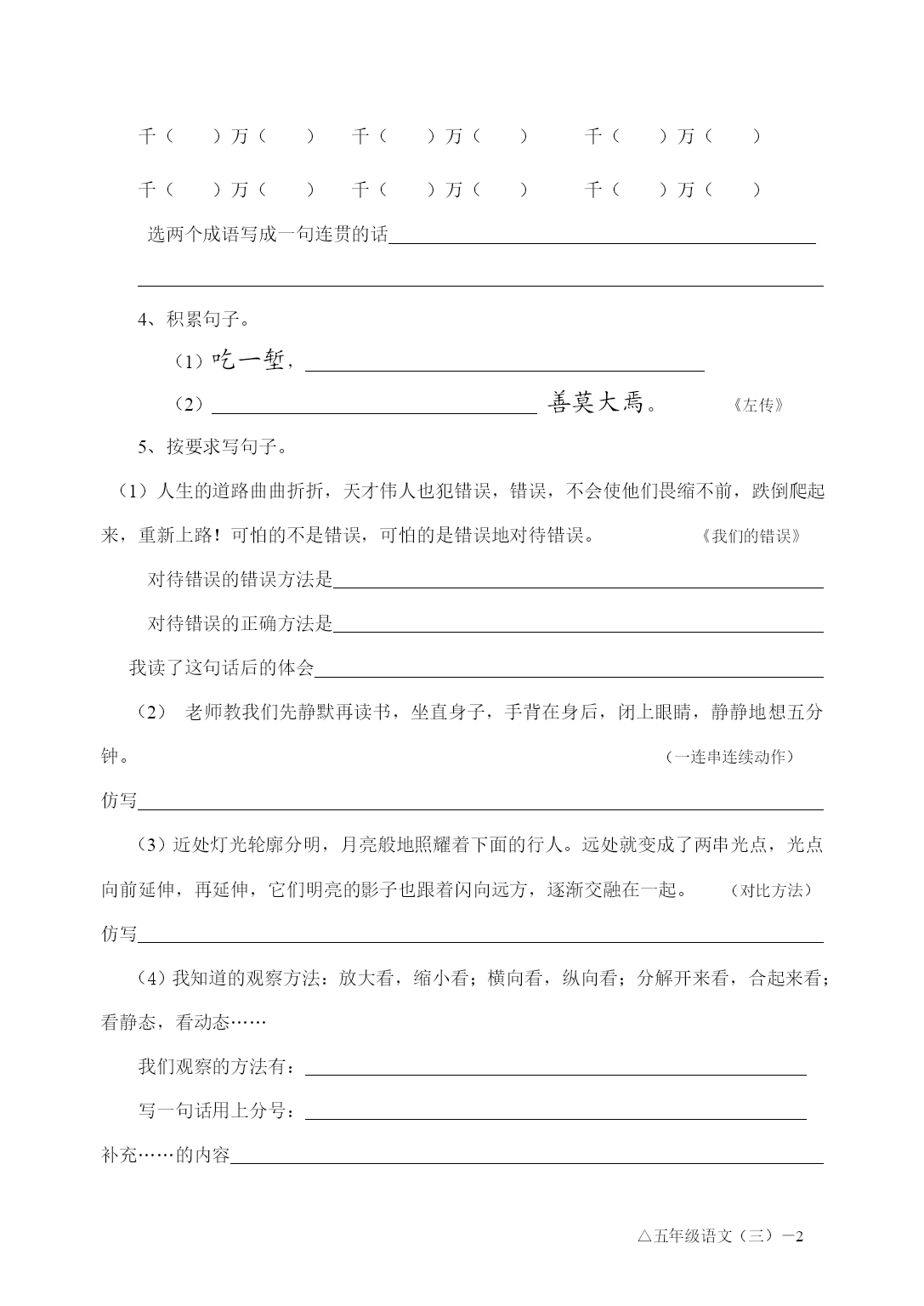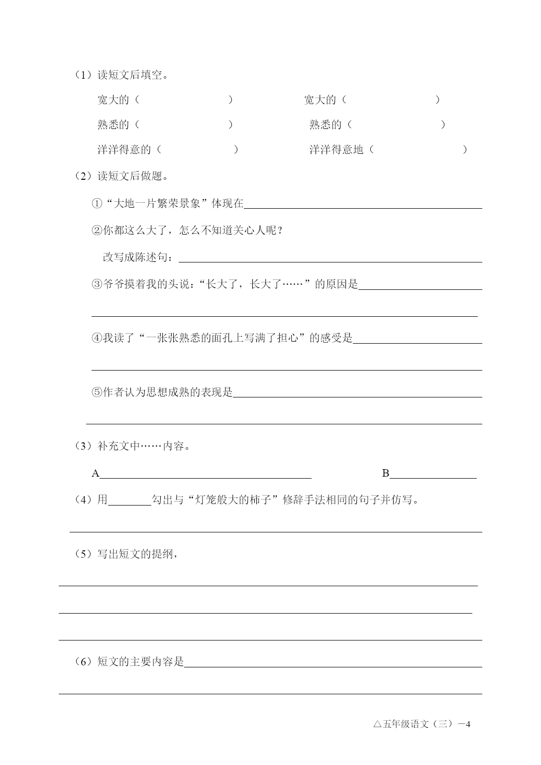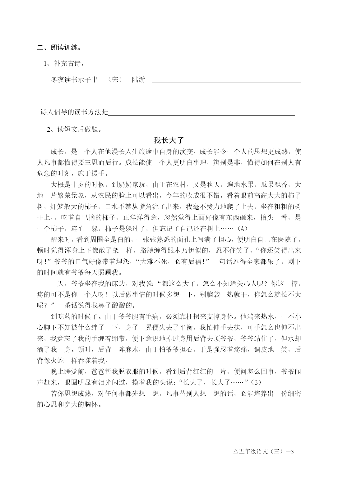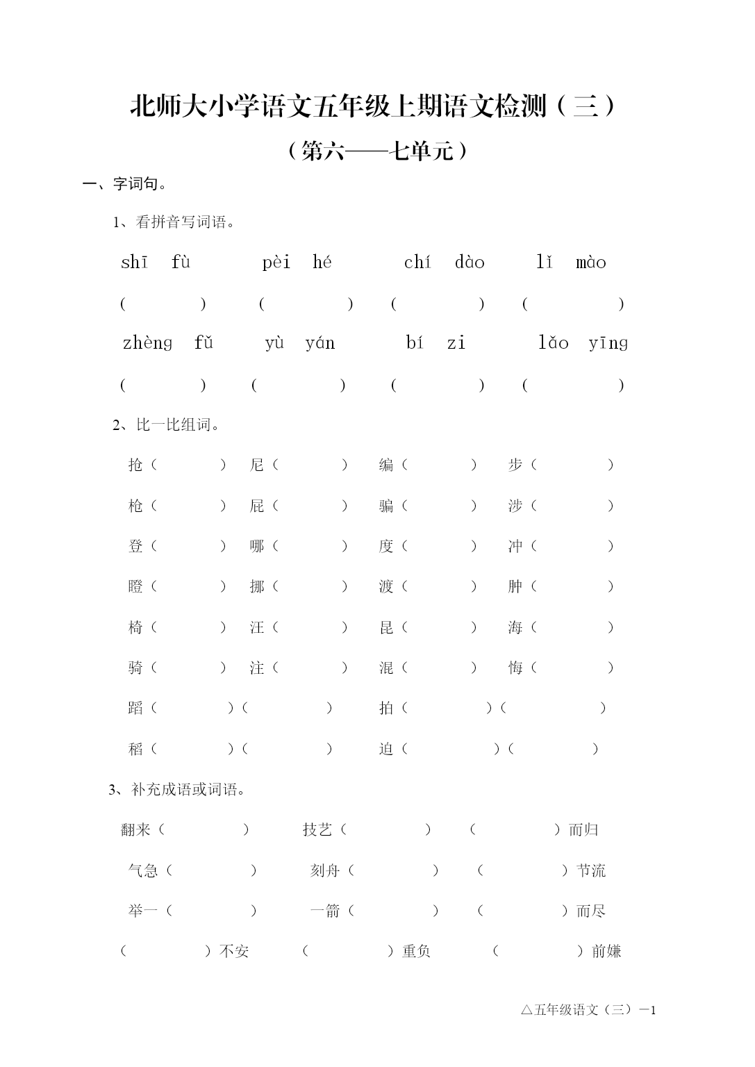 △五年级语文(三)-北师大小学语文五年级上期语文检测(三)(第六——七单元)一、字词句。1、看拼音写词语。shīfùpèihéchídàolǐmào()()()()zhènɡfǔyùyánbízilǎoyīnɡ()()()()2、比一比组词。抢()尼()编()步()枪()屁()骗()涉()登()哪()度()冲()瞪()挪()渡()肿()椅()汪()昆()海()骑()注()混()悔()蹈()()拍()()稻()()迫()()3、补充成语或词语。翻来()技艺()()而归气急()刻舟()()节流举一()一箭()()而尽()不安()重负()前嫌千()万()千()万()千()万()千()万()千()万()千()万()选两个成语写成一句连贯的话4、积累句子。(1)吃一堑,(2)善莫大焉。《左传》5、按要求写句子。(1)人生的道路曲曲折折,天才伟人也犯错误,错误,不会使他们畏缩不前,跌倒爬起来,重新上路!可怕的不是错误,可怕的是错误地对待错误。《我们的错误》对待错误的错误方法是对待错误的正确方法是我读了这句话后的体会(2)老师教我们先静默再读书,坐直身子,手背在身后,闭上眼睛,静静地想五分钟。(一连串连续动作)仿写(3)近处灯光轮廓分明,月亮般地照耀着下面的行人。远处就变成了两串光点,光点向前延伸,再延伸,它们明亮的影子也跟着闪向远方,逐渐交融在一起。(对比方法)仿写(4)我知道的观察方法:放大看,缩小看;横向看,纵向看;分解开来看,合起来看;看静态,看动态……我们观察的方法有:写一句话用上分号:补充……的内容二、阅读训练。1、补充古诗。冬夜读书示子聿(宋)陆游诗人倡导的读书方法是2、读短文后做题。我长大了成长,是一个人在他漫长人生旅途中自身的演变。成长能令一个人的思想更成熟,使人凡事都懂得要三思而后行。成长能使一个人更明白事理,辨别是非,懂得如何在别人有危急的时刻,施于援手。大概是十岁的时候,到奶奶家玩,由于在农村,又是秋天,遍地水果,瓜果飘香,大地一片繁荣景象,从农民的脸上可以看出,今年的收成很不错。看着眼前高高大大的柿子树,灯笼般大的柿子,口水不禁从嘴角流了出来,我毫不费力地爬了上去,坐在粗粗的树干上,,吃着自己摘的柿子,正洋洋得意,忽然觉得上面好像有东西砸来,抬头一看,是一个柿子,连忙一躲,柿子是躲过了,但忘记了自己还在树上……(A)醒来时,看到周围全是白的,一张张熟悉的面孔上写满了担心,便明白自己在医院了,顿时觉得浑身上下像散了架一样,胳膊缠得跟木乃伊似的,忍不住笑了,“你还笑得出来呀!”爷爷的口气好像带着埋怨,“大难不死,必有后福!”一句话逗得全家都乐了,剩下的时间就有爷爷每天照顾我。一天,爷爷坐在我的床边,对我说:“都这么大了,怎么不知道关心人呢?你这一摔,疼的可不是你一个人呀!以后做事情的时候多想一下,别脑袋一热就干,你怎么就长不大呢?”一番话说得我鼻子酸酸的。到吃药的时候了。由于爷爷腿有毛病,必须靠拄拐来支撑身体。他端来热水,一不小心脚下不知被什么绊了一下,身子一晃便失去了平衡,我忙伸手去扶,可手怎么也伸不出来,我竟忘了我的手缠着绷带,便下意识地掉过身用后背去顶爷爷,爷爷站住了,但水却洒了我一身。顿时,后背一阵麻木,由于怕爷爷担心,于是强忍着疼痛,调皮地一笑,后背像火蛇一样吞噬着我。晚上睡觉前,爸爸帮我脱衣服的时候,看到后背红红的一片,便问怎么回事,爷爷闻声赶来,眼圈明显有泪光闪过,摸着我的头说:“长大了,长大了……”(B)若你思想成熟,对任何事都先想一想,凡事替别人想一想的话,必能培养出一份细密的心思和宽大的胸怀。(1)读短文后填空。宽大的()宽大的()熟悉的()熟悉的()洋洋得意的()洋洋得意地()(2)读短文后做题。①“大地一片繁荣景象”体现在②你都这么大了,怎么不知道关心人呢?改写成陈述句:③爷爷摸着我的头说:“长大了,长大了……”的原因是④我读了“一张张熟悉的面孔上写满了担心”的感受是⑤作者认为思想成熟的表现是(3)补充文中……内容。AB(4)用勾出与“灯笼般大的柿子”修辞手法相同的句子并仿写。(5)写出短文的提纲,(6)短文的主要内容是三、习作。1、我学习语文的方法2、我成长中的一件事要求:内容具体,有根有据,语句通顺。字数400字以上,书写规范,写好后认真修改。
