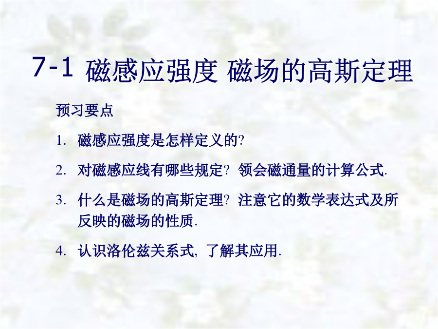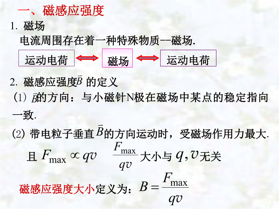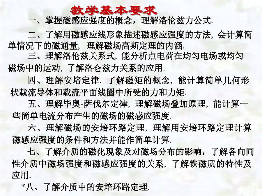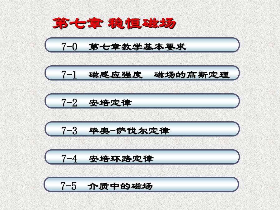 第七章稳恒磁场7-0第七章教学基本要求教学基本要求7-1磁感应强度磁场的高斯定理一、磁感应强度二、洛伦兹力三、磁场的高斯定理穿过闭合面的磁通量等于零.*四、洛伦兹关系式和应用应用:磁偏转应用:磁聚焦载流导体中的运动正电荷在洛伦兹力Fm的作用下,向A侧偏转,在导体的A侧表面积累了正电荷.运动负电荷反向偏转,将积累于A’侧表面.AA’两表面间形成霍尔电场,阻碍粒子在磁场作用下的侧向偏移,当时,两侧表面间将获得稳定的霍尔电压UH.7-2安培定律一、安培定律1.均匀磁场中长为L的载流导线(I)各电流元受力同向,则二、均匀磁场对载流线圈的作用力矩ab边受到安培力的大小:作俯视图可看出线圈受到的力矩大小为结论:均匀磁场中,任意形状刚性闭合平面载流线圈所受的力矩为.7-3毕奥-萨伐尔定律一、磁场叠加原理二、毕奥-萨伐尔定律三、应用毕奥-萨伐尔定律求电流的磁场分布5.求的分量例:一段有限长载流直导线,通有电流为I,求P处的磁感应强度.P对于无限长载流长直导线的磁场.例:一载流圆环半径为R通有电流为I,求圆环轴线上任一点P的磁感应强度.I载流圆环环心处x=0,四、运动电荷的磁场7-4安培环路定律一、安培环路定律二、安培环路定律的应用选取回路例:密绕长载流螺线管通有电流为I,线圈密度为n,求管内一点的磁感应强度.7-5介质中的磁场一、介质对磁场的影响抗磁质内磁场*二、磁场强度和磁介质中的环路定律*三、铁磁质*四、超导现象