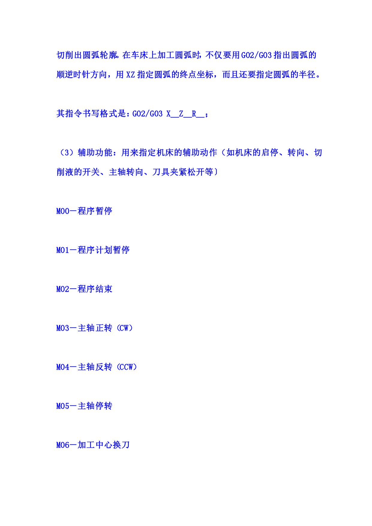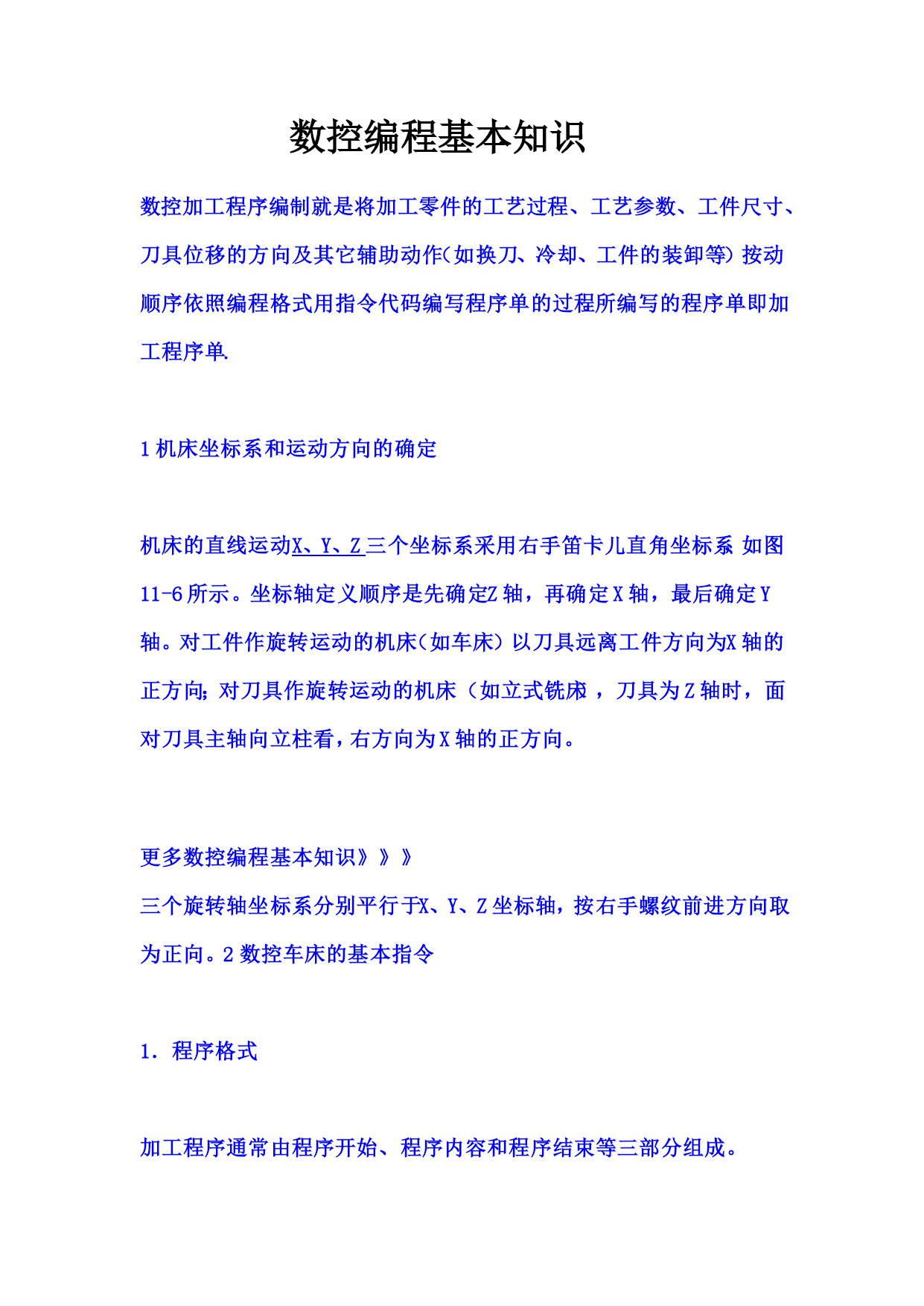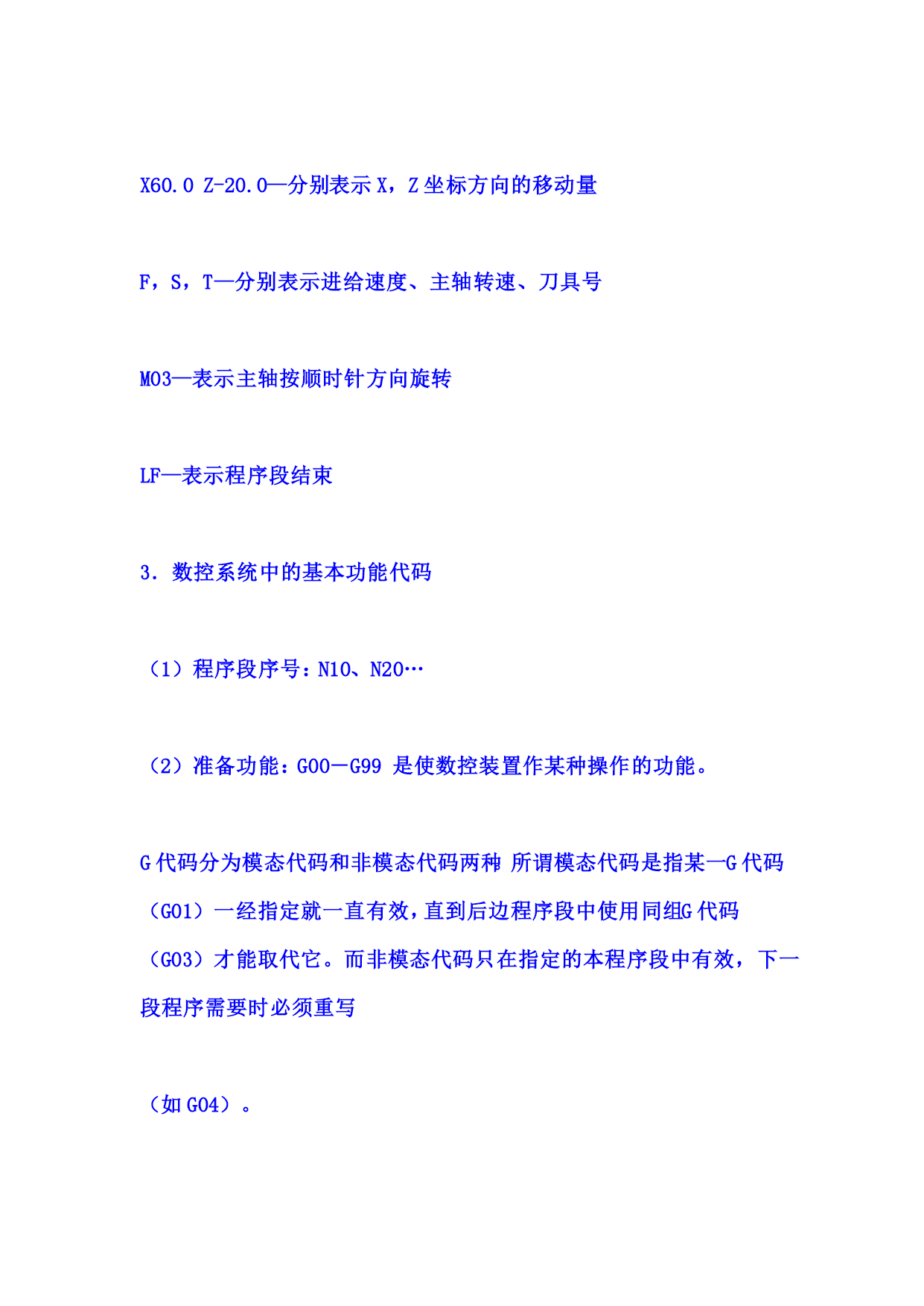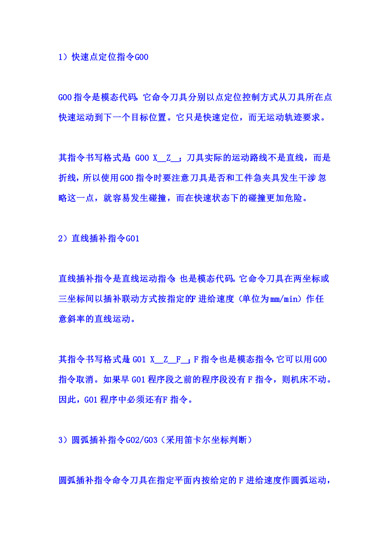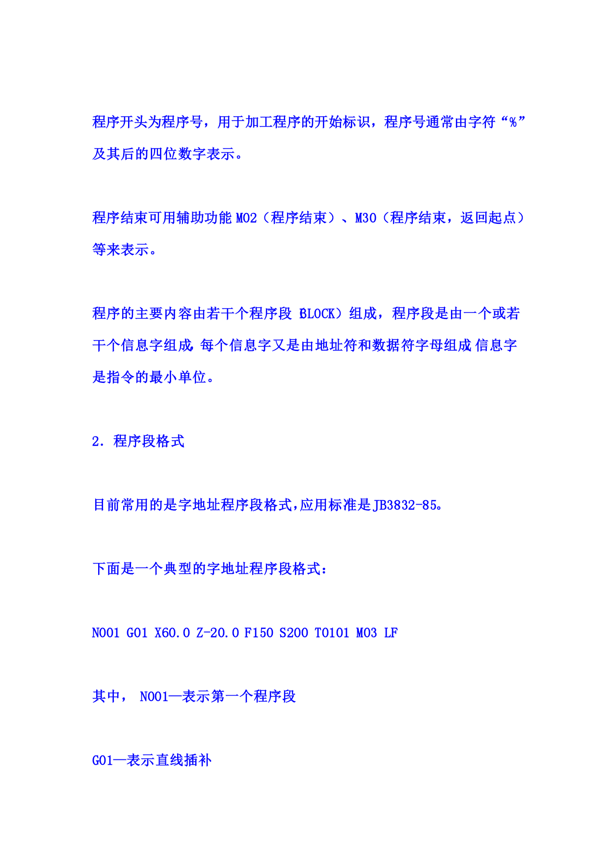 数控编程基本知识数控加工程序编制就是将加工零件的工艺过程、工艺参数、工件尺寸、刀具位移的方向及其它辅助动作(如换刀、冷却、工件的装卸等)按动顺序依照编程格式用指令代码编写程序单的过程。所编写的程序单即加工程序单.1机床坐标系和运动方向的确定机床的直线运动HYPERLINK"http://hi.baidu.com/999ting"\t"_blank"X、Y、Z三个坐标系采用右手笛卡儿直角坐标系,如图11-6所示。坐标轴定义顺序是先确定Z轴,再确定X轴,最后确定Y轴。对工件作旋转运动的机床(如车床)以刀具远离工件方向为X轴的正方向;对刀具作旋转运动的机床(如立式铣床),刀具为Z轴时,面对刀具主轴向立柱看,右方向为X轴的正方向。更多数控编程基本知识》》》三个旋转轴坐标系分别平行于X、Y、Z坐标轴,按右手螺纹前进方向取为正向。2数控车床的基本指令1.程序格式加工程序通常由程序开始、程序内容和程序结束等三部分组成。程序开头为程序号,用于加工程序的开始标识,程序号通常由字符“%”及其后的四位数字表示。程序结束可用辅助功能M02(程序结束)、M30(程序结束,返回起点)等来表示。程序的主要内容由若干个程序段(BLOCK)组成,程序段是由一个或若干个信息字组成,每个信息字又是由地址符和数据符字母组成。信息字是指令的最小单位。2.程序段格式目前常用的是字地址程序段格式,应用标准是JB3832-85。下面是一个典型的字地址程序段格式:N001G01X60.0Z-20.0F150S200T0101M03LF其中,N001—表示第一个程序段G01—表示直线插补X60.0Z-20.0—分别表示X,Z坐标方向的移动量F,S,T—分别表示进给速度、主轴转速、刀具号M03—表示主轴按顺时针方向旋转LF—表示程序段结束3.数控系统中的基本功能代码(1)程序段序号:N10、N20…(2)准备功能:G00-G99是使数控装置作某种操作的功能。G代码分为模态代码和非模态代码两种。所谓模态代码是指某一G代码(G01)一经指定就一直有效,直到后边程序段中使用同组G代码(G03)才能取代它。而非模态代码只在指定的本程序段中有效,下一段程序需要时必须重写(如G04)。1)快速点定位指令G00G00指令是模态代码,它命令刀具分别以点定位控制方式从刀具所在点快速运动到下一个目标位置。它只是快速定位,而无运动轨迹要求。其指令书写格式是:G00X_Z_;刀具实际的运动路线不是直线,而是折线,所以使用G00指令时要注意刀具是否和工件急夹具发生干涉,忽略这一点,就容易发生碰撞,而在快速状态下的碰撞更加危险。2)直线插补指令G01直线插补指令是直线运动指令,也是模态代码。它命令刀具在两坐标或三坐标间以插补联动方式按指定的F进给速度(单位为mm/min)作任意斜率的直线运动。其指令书写格式是:G01X_Z_F_;F指令也是模态指令,它可以用G00指令取消。如果早G01程序段之前的程序段没有F指令,则机床不动。因此,G01程序中必须还有F指令。3)圆弧插补指令G02/G03(采用笛卡尔坐标判断)圆弧插补指令命令刀具在指定平面内按给定的F进给速度作圆弧运动,切削出圆弧轮廓。在车床上加工圆弧时,不仅要用G02/G03指出圆弧的顺逆时针方向,用XZ指定圆弧的终点坐标,而且还要指定圆弧的半径。其指令书写格式是:G02/G03X_Z_R_;(3)辅助功能:用来指定机床的辅助动作(如机床的启停、转向、切削液的开关、主轴转向、刀具夹紧松开等〕M00-程序暂停M01-程序计划暂停M02-程序结束M03-主轴正转(CW)M04-主轴反转(CCW)M05-主轴停转M06-加工中心换刀M07、M08-冷却液开M09-冷却液关M10-工件夹紧M11-工件松开M30-程序结束,返回起点M03和M04指令之间必须用M05指令使主轴停转后进行。(4)进给功能F如果采用直接指定法,在F后面直接写上要求的进给速度,如F1000,表示进给量是1000mm/min);车螺纹、攻丝和套扣时,由于进给速度与主轴转速有关,F后面数字是指定的导程。(5)主轴功能SS指定主轴转速,如S800,表示主轴转速为800r/min。(6)刀具功能T指令数控系统进行换刀,用地址T和其后的4位数字来指定刀具号和刀具补偿号(刀具偏置号)。前2位是刀具序号:0~99,后2位是刀具补偿号:0~32。每一刀具加工结束后,必须取消刀具补偿。刀具序号可以和刀盘上的刀位号相对应;刀具补偿包括形状补偿和磨损补偿;刀具序号和刀具补偿号不必相同,为方便起见也可一致。在数控装置中,程序的记录是靠程序号来辨别的,即调用程序或者编辑程序都要通过程序号来调出。1.程序编号的结构:O;“O”后面数字用4位数(1~9999)表示,不允许为“0”。2.程序段顺序号:在程序段前加
