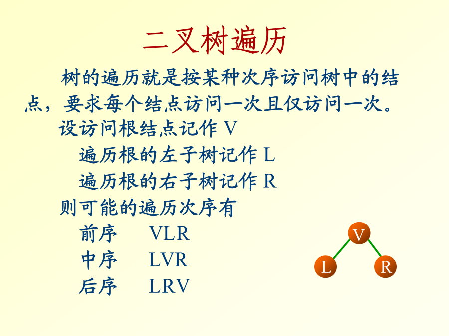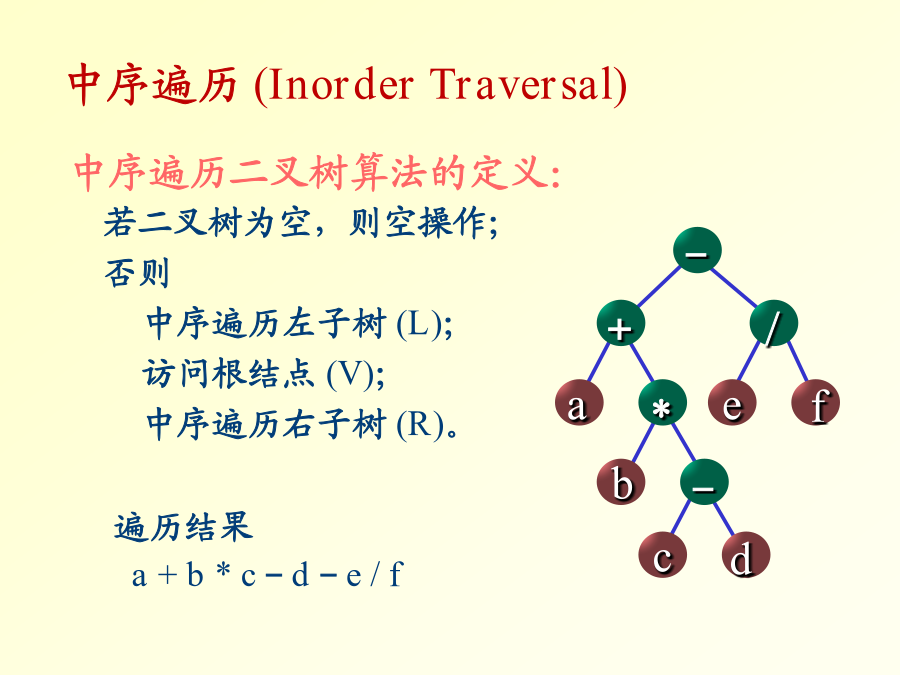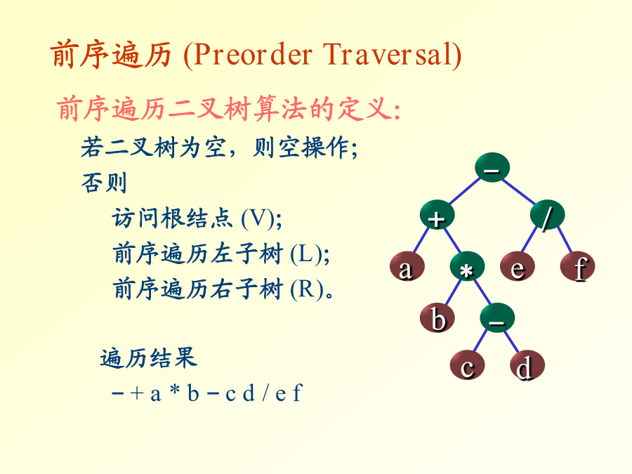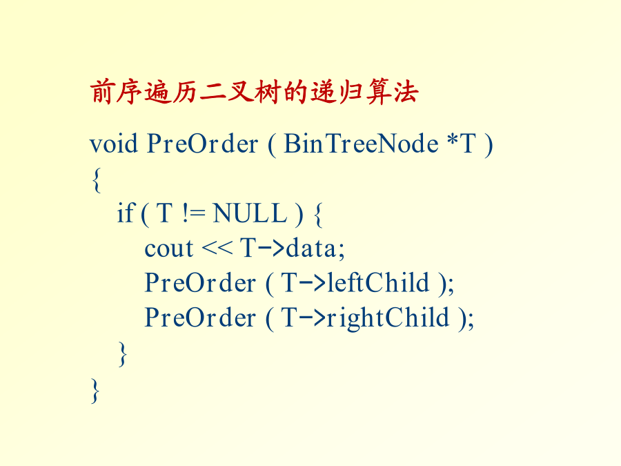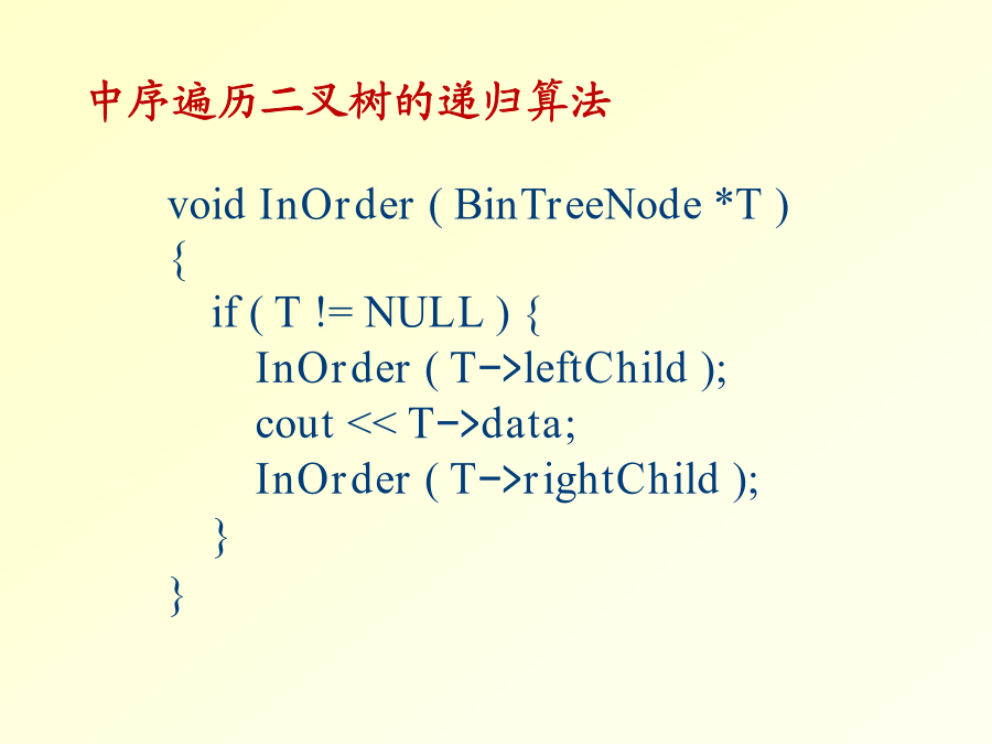 二叉树遍历中序遍历二叉树算法的定义:若二叉树为空,则空操作;否则中序遍历左子树(L);访问根结点(V);中序遍历右子树(R)。遍历结果a+b*c-d-e/fvoidInOrder(BinTreeNode*T){if(T!=NULL){InOrder(T->leftChild);cout<<T->data;InOrder(T->rightChild);}}前序遍历二叉树算法的定义:若二叉树为空,则空操作;否则访问根结点(V);前序遍历左子树(L);前序遍历右子树(R)。遍历结果-+a*b-cd/ef前序遍历二叉树的递归算法voidPreOrder(BinTreeNode*T){if(T!=NULL){cout<<T->data;PreOrder(T->leftChild);PreOrder(T->rightChild);}}后序遍历二叉树算法的定义:若二叉树为空,则空操作;否则后序遍历左子树(L);后序遍历右子树(R);访问根结点(V)。遍历结果abcd-*+ef/-后序遍历二叉树的递归算法:voidPostOrder(BinTreeNode*T){if(T!=NULL){PostOrder(T->leftChild);PostOrder(T->rightChild);cout<<T->data;}}二叉树遍历应用intCount(BinTreeNode*T){if(T==NULL)return0;elsereturn1+Count(T->leftChild)+Count(T->rightChild);}intLeaf_Count(BitreeT){//求二叉树中叶子结点的数目if(!T)return0;//空树没有叶子elseif(!T->lchild&&!T->rchild)return1;//叶子结点elsereturnLeaf_Count(T-lchild)+Leaf_Count(T-rchild);//左子树的叶子数加上右子树的叶子数}intHeight(BinTreeNode*T){if(T==NULL)return0;else{intm=Height(T->leftChild);intn=Height(T->rightChild));return(m>n)?m+1:n+1;}}复制二叉树(递归算法)判断二叉树等价(递归算法)线索二叉树(ThreadedBinaryTree)0Lchild域指示结点的左孩子Ltag=1Lchild域指示结点的遍历前驱二叉树以及它的中序线索二叉树在中根遍历的线索树中查找前驱结点在中根遍历的线索树中查找后继结点树的存储结构双亲表示以一组连续空间存储树的结点,同时在结点中附设一个指针,存放双亲结点在链表中的位置。用双亲表示实现的树定义A结点结构typedefcharTreeData;typedefstructnode{TreeDatadata;structnode*firstChild,*nextSibling;}TreeNode;typedefTreeNode*Tree;T1T2T3树的二叉树表示:树的遍历树的后根次序遍历:霍夫曼树(HuffmanTree)1带权路径长度(WeightedPathLength,WPL)二叉树的带权(外部)路径长度是树的各叶结点所带的权值wi与该结点到根的路径长度li的乘积的和。WPL=2*2+WPL=2*1+WPL=7*1+4*2+5*2+4*2+5*3+5*2+2*3+7*2=367*3=464*3=35霍夫曼树(2)重复以下步骤,直到F中仅剩下一棵树为止:①在F中选取两棵根结点的权值最小的扩充二叉树,做为左、右子树构造一棵新的二叉树。置新的二叉树的根结点的权值为其左、右子树上根结点的权值之和。②在F中删去这两棵二叉树。③把新的二叉树加入F。5555constintn=20;//叶结点数constintm=2*n-1;//结点数typedefstruct{floatweight;intparent,leftChild,rightChild;}HTNode;typedefHTNodeHuffmanTree[m];哈夫曼树的应用最佳判定树学生成绩的分布呈正态分布即:中等成绩的学生较多,而较好或较差学生均比较少。设其分布规律如下表:若采用图(a)来进行判断,则80%以上的数据要进行三次或三次以上的比较才能得到结果。而如果我们以各分数段人数的占总人数的比例5、15、40、30、10为权值构造哈夫曼树,可得到如图(b)所示的判定树来进行判断,就可以使大部分数据经过比较少次数的比较得到结果。霍夫曼编码若按各个字符出现的概率不同而给予不等长编码,可望减少总编码长度。各字符出现概率为{2/18,7/18,4/18,5/18},化整为{2,7,4,5}。以它们为各叶结点