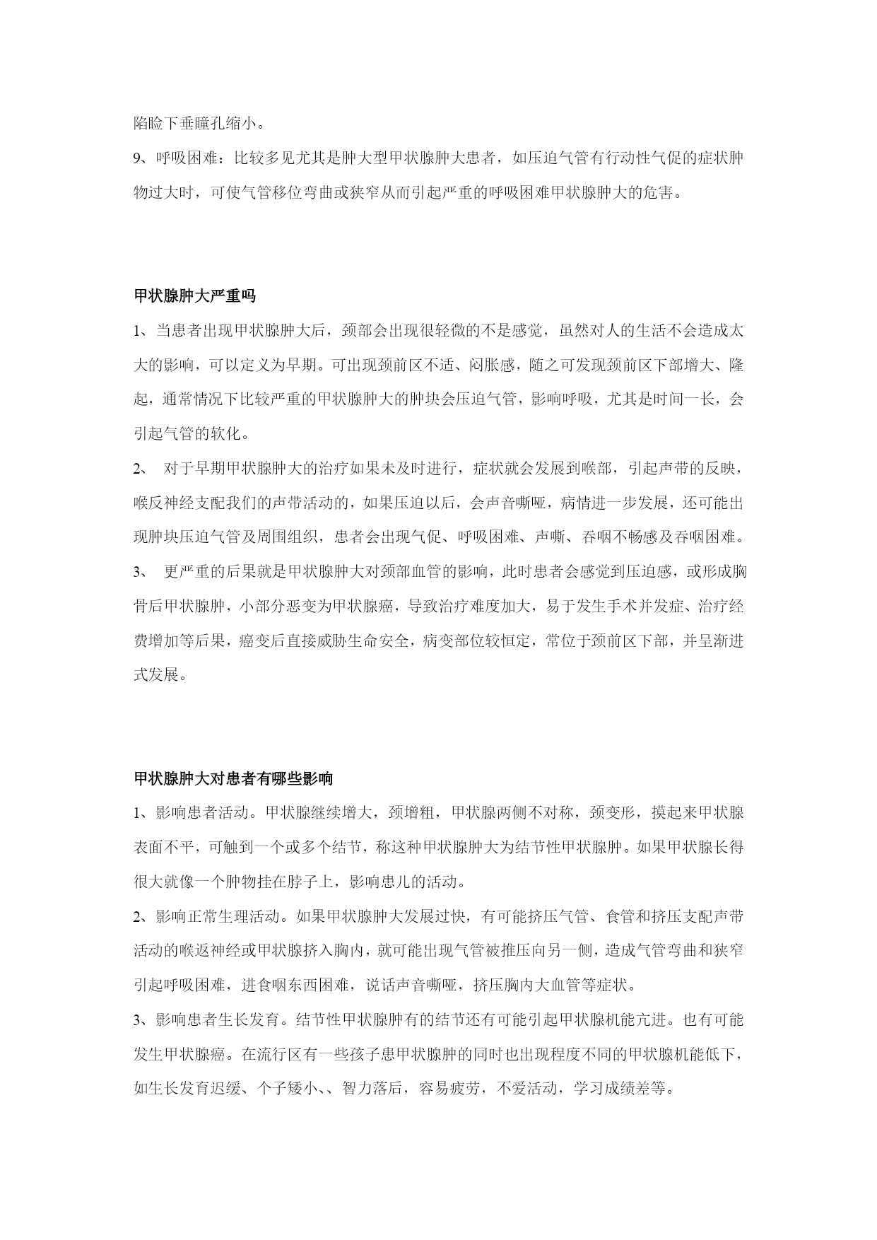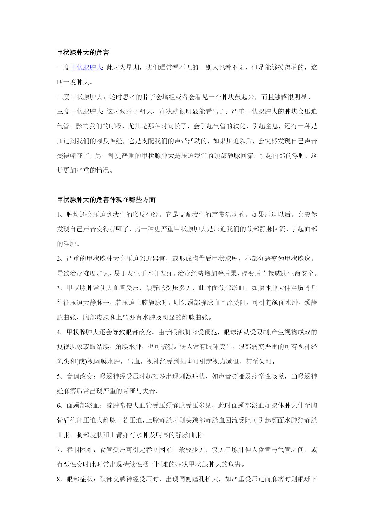 甲状腺肿大的危害一度HYPERLINK"http://www.gxjk120.com/jzxzd/"甲状腺肿大:此时为早期,我们通常看不见的,别人也看不见,但是能够摸得着的,这叫一度肿大。二度甲状腺肿大:这时患者的脖子会增粗或者会看见一个肿块鼓起来,而且触感很明显。三度甲状腺肿大:这时候脖子粗大,症状就很明显能看出了。严重甲状腺肿大的肿块会压迫气管,影响我们的呼吸,尤其是那种时间长了,会引起气管的软化,引起窒息,还有一种是压迫到我们的喉反神经,它是支配我们的声带活动的,如果压迫以后,会突然发现自己声音变得嘶哑了,另一种更严重的甲状腺肿大是压迫我们的颈部静脉回流,引起面部的浮肿,这是更加严重的情况。甲状腺肿大的危害体现在哪些方面1、肿块还会压迫到我们的喉反神经,它是支配我们的声带活动的,如果压迫以后,会突然发现自己声音变得嘶哑了,另一种更严重甲状腺肿大是压迫我们的颈部静脉回流,引起面部的浮肿。2、严重的甲状腺肿大会压迫邻近器官,或形成胸骨后甲状腺肿,小部分恶变为甲状腺癌,导致治疗难度加大,易于发生手术并发症、治疗经费增加等后果,癌变后直接威胁生命安全。3、甲状腺肿常使大血管受压,颈静脉受压多见,此时面颈部淤血。如腺体肿大伸至胸骨后往往压迫大静脉干,若压迫上腔静脉时,则头颈部静脉血回流受阻,可引起颜面水肿、颈静脉曲张、胸部皮肤和上臂亦有水肿及明显的静脉曲张。4、甲状腺肿大还会导致眼部改变。由于眼部肌肉受侵犯,眼球活动受限制,产生视物成双的复视现象或眼结膜,角膜水肿,也可破溃。病人常有眼球突出,眼部病变严重的可有视神经乳头和(或)视网膜水肿,出血,视神经受到损害可引起视力减退,甚至失明。5、音调改变:喉返神经受压时起初多出现刺激症状,如声音嘶哑及痉挛性咳嗽,当喉返神经麻痹后常出现严重的嘶哑与失音。6、面颈部淤血:腺肿常使大血管受压颈静脉受压多见,此时面颈部淤血如腺体肿大伸至胸骨后往往压迫大静脉干若压迫,上腔静脉时则头颈部静脉血回流受阻可引起颜面水肿颈静脉曲张,胸部皮肤和上臂亦有水肿及明显的静脉曲张。7、吞咽困难:食管受压可引起吞咽困难一般较少见,仅见于腺肿伸人食管与气管之间,或有恶性变时此时常出现持续性咽下困难的症状甲状腺肿大的危害。8、眼部症状:颈部交感神经受压时,出现同侧瞳孔扩大,如严重受压迫而麻痹时则眼球下陷睑下垂瞳孔缩小。9、呼吸困难:比较多见尤其是肿大型甲状腺肿大患者,如压迫气管有行动性气促的症状肿物过大时,可使气管移位弯曲或狭窄从而引起严重的呼吸困难甲状腺肿大的危害。甲状腺肿大严重吗1、当患者出现甲状腺肿大后,颈部会出现很轻微的不是感觉,虽然对人的生活不会造成太大的影响,可以定义为早期。可出现颈前区不适、闷胀感,随之可发现颈前区下部增大、隆起,通常情况下比较严重的甲状腺肿大的肿块会压迫气管,影响呼吸,尤其是时间一长,会引起气管的软化。2、对于早期甲状腺肿大的治疗如果未及时进行,症状就会发展到喉部,引起声带的反映,喉反神经支配我们的声带活动的,如果压迫以后,会声音嘶哑,病情进一步发展,还可能出现肿块压迫气管及周围组织,患者会出现气促、呼吸困难、声嘶、吞咽不畅感及吞咽困难。3、更严重的后果就是甲状腺肿大对颈部血管的影响,此时患者会感觉到压迫感,或形成胸骨后甲状腺肿,小部分恶变为甲状腺癌,导致治疗难度加大,易于发生手术并发症、治疗经费增加等后果,癌变后直接威胁生命安全,病变部位较恒定,常位于颈前区下部,并呈渐进式发展。甲状腺肿大对患者有哪些影响1、影响患者活动。甲状腺继续增大,颈增粗,甲状腺两侧不对称,颈变形,摸起来甲状腺表面不平,可触到一个或多个结节,称这种甲状腺肿大为结节性甲状腺肿。如果甲状腺长得很大就像一个肿物挂在脖子上,影响患儿的活动。2、影响正常生理活动。如果甲状腺肿大发展过快,有可能挤压气管、食管和挤压支配声带活动的喉返神经或甲状腺挤入胸内,就可能出现气管被推压向另一侧,造成气管弯曲和狭窄引起呼吸困难,进食咽东西困难,说话声音嘶哑,挤压胸内大血管等症状。3、影响患者生长发育。结节性甲状腺肿有的结节还有可能引起甲状腺机能亢进。也有可能发生甲状腺癌。在流行区有一些孩子患甲状腺肿的同时也出现程度不同的甲状腺机能低下,如生长发育迟缓、个子矮小、、智力落后,容易疲劳,不爱活动,学习成绩差等。甲状腺肿大的预防1、保持平常心态对预防甲状腺疾病很重要。虽然甲状腺疾病有一定的遗传倾向,但这仅仅是易发因素,关键还在于个人的心理素质和处世态度,因为不良的情绪轻则影响食欲、睡眠,重则影响免疫功能和身体健康。2、提供足够的热量:因为甲状腺机能亢进,会使身体新陈代谢率提高,所以每天可增加所需的热量。3、适当的加碘:碘是是合成甲状腺素的原料,甲状腺肿大者给予碘化合物,可以增加甲状腺素贮存量并减少释出。4、补充必要的维生素:因为热量提高,所