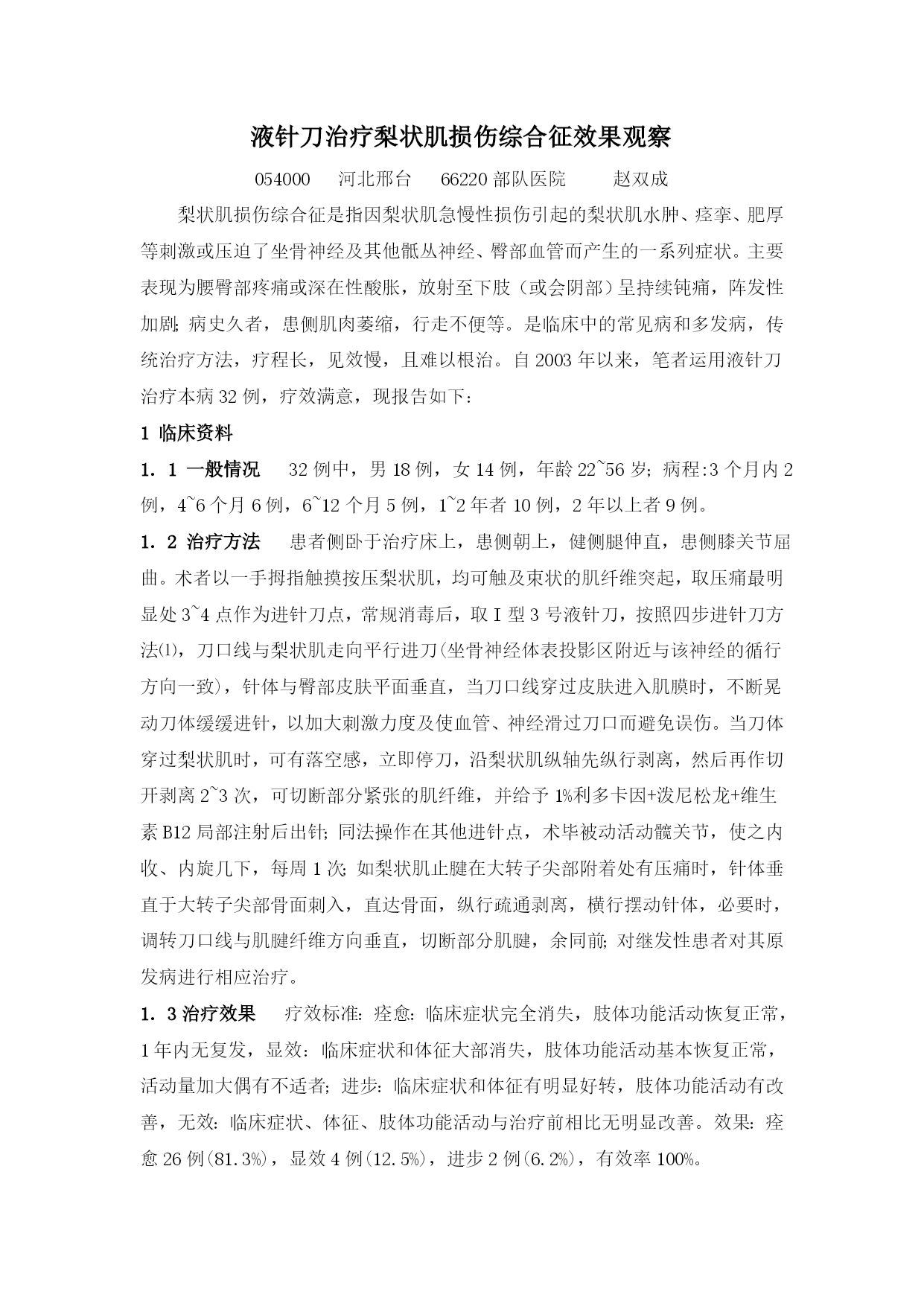 液针刀治疗梨状肌损伤综合征效果观察054000河北邢台66220部队医院赵双成梨状肌损伤综合征是指因梨状肌急慢性损伤引起的梨状肌水肿、痉挛、肥厚等刺激或压迫了坐骨神经及其他骶丛神经、臀部血管而产生的一系列症状。主要表现为腰臀部疼痛或深在性酸胀,放射至下肢(或会阴部)呈持续钝痛,阵发性加剧;病史久者,患侧肌肉萎缩,行走不便等。是临床中的常见病和多发病,传统治疗方法,疗程长,见效慢,且难以根治。自2003年以来,笔者运用液针刀治疗本病32例,疗效满意,现报告如下:1临床资料1.1一般情况32例中,男18例,女14例,年龄22~56岁;病程:3个月内2例,4~6个月6例,6~12个月5例,1~2年者10例,2年以上者9例。1.2治疗方法患者侧卧于治疗床上,患侧朝上,健侧腿伸直,患侧膝关节屈曲。术者以一手拇指触摸按压梨状肌,均可触及束状的肌纤维突起,取压痛最明显处3~4点作为进针刀点,常规消毒后,取I型3号液针刀,按照四步进针刀方法⑴,刀口线与梨状肌走向平行进刀(坐骨神经体表投影区附近与该神经的循行方向一致),针体与臀部皮肤平面垂直,当刀口线穿过皮肤进入肌膜时,不断晃动刀体缓缓进针,以加大刺激力度及使血管、神经滑过刀口而避免误伤。当刀体穿过梨状肌时,可有落空感,立即停刀,沿梨状肌纵轴先纵行剥离,然后再作切开剥离2~3次,可切断部分紧张的肌纤维,并给予1%利多卡因+泼尼松龙+维生素B12局部注射后出针;同法操作在其他进针点,术毕被动活动髋关节,使之内收、内旋几下,每周1次;如梨状肌止腱在大转子尖部附着处有压痛时,针体垂直于大转子尖部骨面刺入,直达骨面,纵行疏通剥离,横行摆动针体,必要时,调转刀口线与肌腱纤维方向垂直,切断部分肌腱,余同前;对继发性患者对其原发病进行相应治疗。1.3治疗效果疗效标准:痊愈:临床症状完全消失,肢体功能活动恢复正常,1年内无复发,显效:临床症状和体征大部消失,肢体功能活动基本恢复正常,活动量加大偶有不适者;进步:临床症状和体征有明显好转,肢体功能活动有改善,无效:临床症状、体征、肢体功能活动与治疗前相比无明显改善。效果:痊愈26例(81.3%),显效4例(12.5%),进步2例(6.2%),有效率100%。2讨论梨状肌受到主动或被动超负荷牵拉可致急性损伤,出现肿痛和肌痉挛。迁延日久,梨状肌充血肿胀,甚至变性、结疤粘连、肌束变粗隆起,压迫临近的神经、血管而出现一系列综合症状⑵。液针刀具有中医的针刺效应,又有针刀的切割、松解、剥离、闭合性手术的作用,还可注射相关药物,是治疗急、慢性损伤的理想器械;通过液针刀的松解剥离、一方面可加强梨状肌周围血管通透性,改善血液循环,缓解痉挛疼痛,使充血、水肿等消退,另一方面可将梨状肌的纤维突起、结疤粘连部分切割疏导,剥开粘连,可直接消除肿胀,减轻其对局部压力,同时,术后患处注射利多卡因、泼尼松龙、维生素B12混合液可达到即时止痛、缓解症状、控制病变周围无菌性炎症、促进渗出、水肿的吸收效果;从而减少病灶对周围神经、血管的压迫及刺激,使气血流通、肌肉舒张、解痉止痛,使功能恢复正常。参考文献:⑴朱汉章,主编.针刀医学原理.第1版.北京:人民卫生出版社,2002.104—105.⑵党东旭,主编.多功能新针刀疗法.第1版.北京:人民军医出版社,2003.156—161.