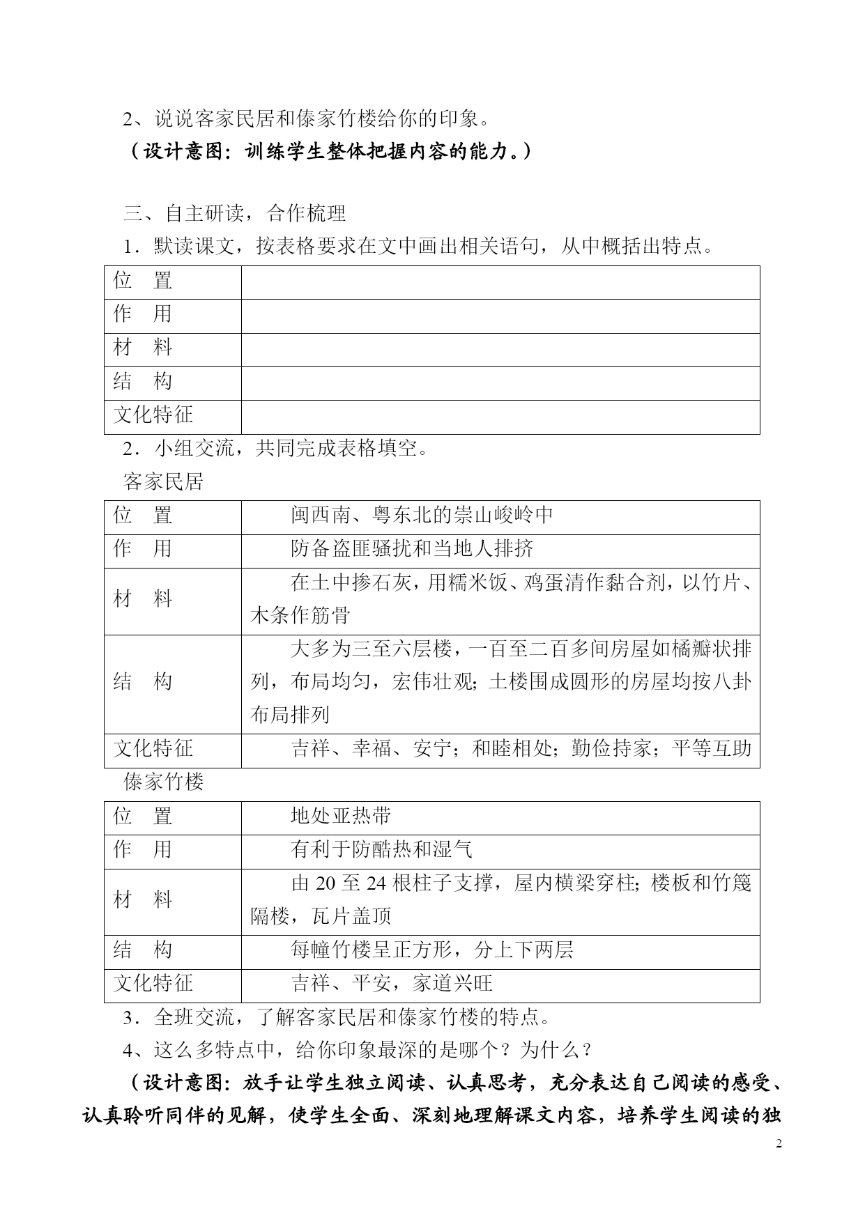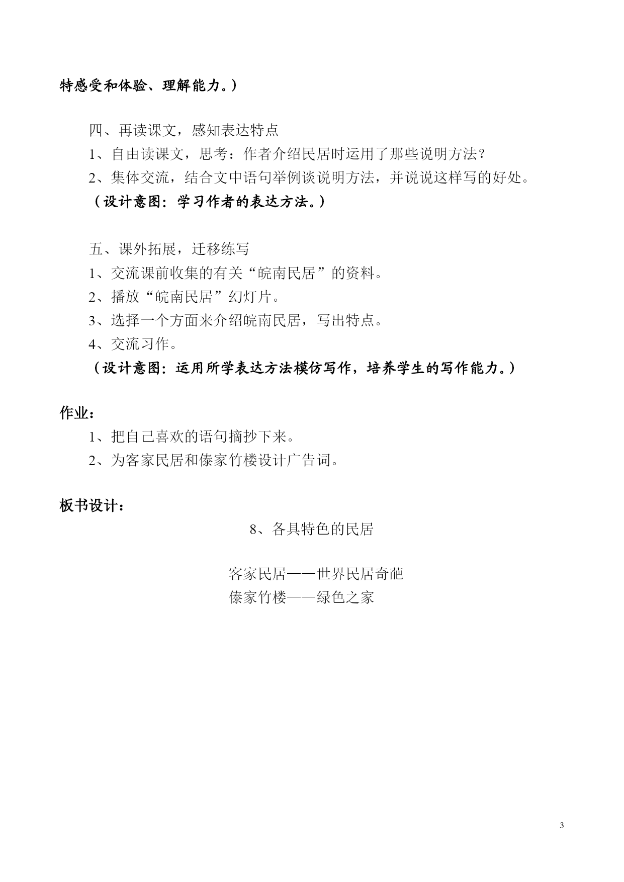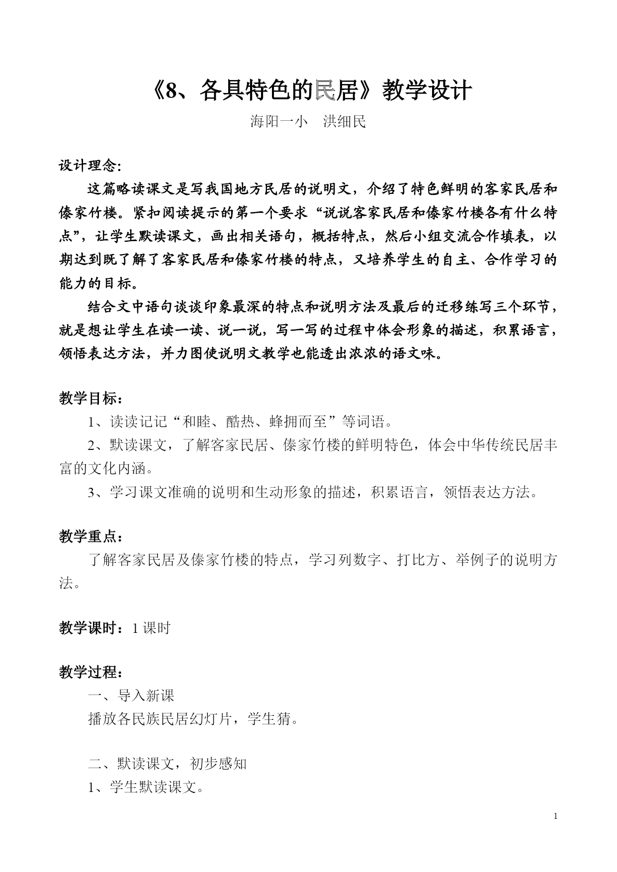 《8、各具特色的民居》教学设计海阳一小洪细民设计理念:这篇略读课文是写我国地方民居的说明文,介绍了特色鲜明的客家民居和傣家竹楼。紧扣阅读提示的第一个要求“说说客家民居和傣家竹楼各有什么特点”,让学生默读课文,画出相关语句,概括特点,然后小组交流合作填表,以期达到既了解了客家民居和傣家竹楼的特点,又培养学生的自主、合作学习的能力的目标。结合文中语句谈谈印象最深的特点和说明方法及最后的迁移练写三个环节,就是想让学生在读一读、说一说,写一写的过程中体会形象的描述,积累语言,领悟表达方法,并力图使说明文教学也能透出浓浓的语文味。教学目标:1、读读记记“和睦、酷热、蜂拥而至”等词语。2、默读课文,了解客家民居、傣家竹楼的鲜明特色,体会中华传统民居丰富的文化内涵。3、学习课文准确的说明和生动形象的描述,积累语言,领悟表达方法。教学重点:了解客家民居及傣家竹楼的特点,学习列数字、打比方、举例子的说明方法。教学课时:1课时教学过程:一、导入新课播放各民族民居幻灯片,学生猜。二、默读课文,初步感知1、学生默读课文。2、说说客家民居和傣家竹楼给你的印象。(设计意图:训练学生整体把握内容的能力。)三、自主研读,合作梳理1.默读课文,按表格要求在文中画出相关语句,从中概括出特点。位置作用材料结构文化特征2.小组交流,共同完成表格填空。客家民居位置闽西南、粤东北的崇山峻岭中作用防备盗匪骚扰和当地人排挤材料在土中掺石灰,用糯米饭、鸡蛋清作黏合剂,以竹片、木条作筋骨结构大多为三至六层楼,一百至二百多间房屋如橘瓣状排列,布局均匀,宏伟壮观;土楼围成圆形的房屋均按八卦布局排列文化特征吉祥、幸福、安宁;和睦相处;勤俭持家;平等互助傣家竹楼位置地处亚热带作用有利于防酷热和湿气材料由20至24根柱子支撑,屋内横梁穿柱;楼板和竹篾隔楼,瓦片盖顶结构每幢竹楼呈正方形,分上下两层文化特征吉祥、平安,家道兴旺3.全班交流,了解客家民居和傣家竹楼的特点。4、这么多特点中,给你印象最深的是哪个?为什么?(设计意图:放手让学生独立阅读、认真思考,充分表达自己阅读的感受、认真聆听同伴的见解,使学生全面、深刻地理解课文内容,培养学生阅读的独特感受和体验、理解能力。)四、再读课文,感知表达特点1、自由读课文,思考:作者介绍民居时运用了那些说明方法?2、集体交流,结合文中语句举例谈说明方法,并说说这样写的好处。(设计意图:学习作者的表达方法。)五、课外拓展,迁移练写1、交流课前收集的有关“皖南民居”的资料。2、播放“皖南民居”幻灯片。3、选择一个方面来介绍皖南民居,写出特点。4、交流习作。(设计意图:运用所学表达方法模仿写作,培养学生的写作能力。)作业:1、把自己喜欢的语句摘抄下来。2、为客家民居和傣家竹楼设计广告词。板书设计:8、各具特色的民居客家民居——世界民居奇葩傣家竹楼——绿色之家