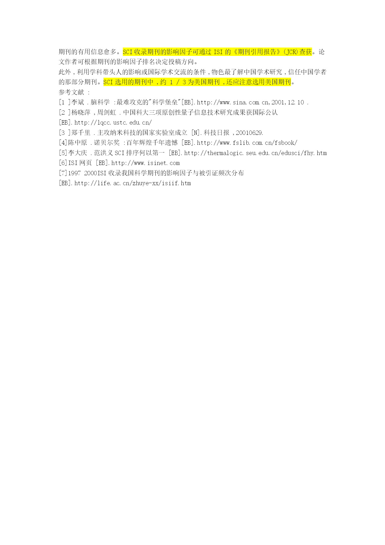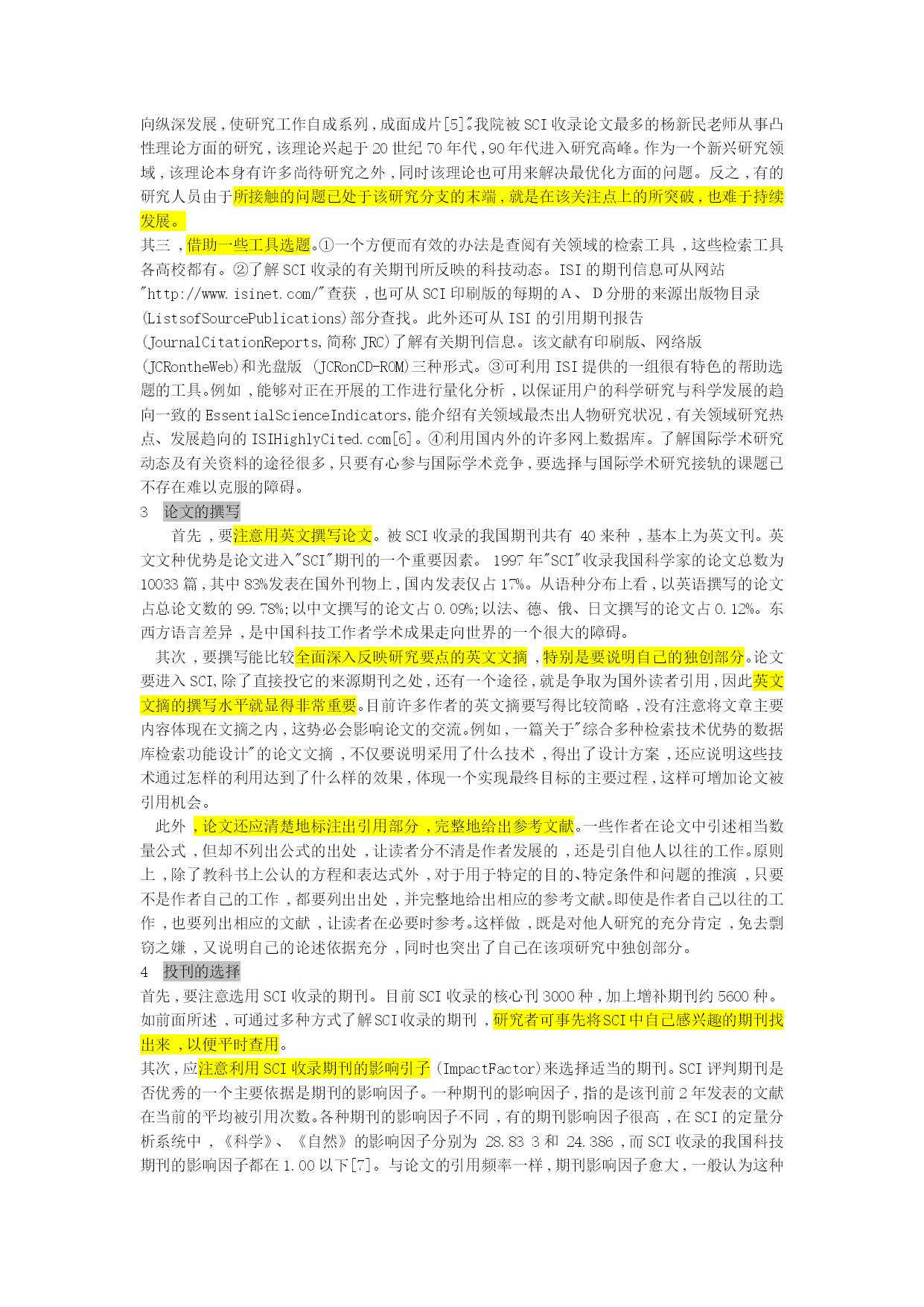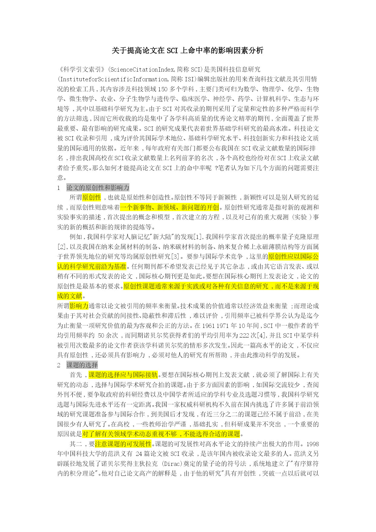 关于提高论文在SCI上命中率的影响因素分析《科学引文索引》(ScienceCitationIndex,简称SCI)是美国科技信息研究(InstituteforSciientificInformation,简称ISI)编辑出版社的用来查询科技文献及其引用情况的检索工具,其内容涉及科技领域150多个学科,主要门类可归为数学、物理学、化学、生物学、微生物学、农业、分子生物学与遗传学、临床医学、神经学、药学、计算机科学、生态与环境等,其中以基础科学研究为主。由于SCI对其收录的期刊采用了定量和定性的多种严格而科学的方法筛选,因而它所收载的均是集中了各学科高质量的优秀论文精萃的期刊,全面覆盖了世界最重要、最有影响的研究成果。SCI的研究成果代表着世界基础学科研究的最高水准。科技论文被SCI收录和引用,成为评价其国际学术地位、基础科学研究水平、科技创新实力和科技论文质量的国际通用的依据。近年来,每年政府有关部门都要公布我国在SCI收录文献数量的国际排名,排出我国高校在SCI收录文献数量上名列前茅的名次,各个高校也纷纷对在SCI上收录文献者给予重奖。那么如何才能提高论文在SCI上的命中率呢?笔者认为如下几个方面的问题需要注意。1论文的原创性和影响力所谓原创性,也就是原始性和创造性。原创性不等同于新颖性,新颖性可以是别人研究的延续,而原创性则意味着一个新事物、新领域、新问题的开创。原创性研究通常是指对新的观测和实验事实的描述,首次提出的概念和模型,首次建立的方程,以及对已有的重大观测(实验)事实的新的概括和新的规律的提炼等。例如,我国科学家对人脑记忆"新大陆"的发现[1],我国科学家首次提出的概率量子克隆原理[2],以及我国在纳米金属材料的制备、纳米碳材料的制备、纳米复合稀上永磁薄膜结构等方面属于世界领先地位的研究等均属原创性研究[3]。要参与国际学术竞争,这里的原创性应以国际公认的科学研究前沿为基准。任何期刊都不希望发表已经见于其它杂志,或由其它语言发表、或以稍有不同的形式发表的论文,国际核心期刊更是如此。要想在国际核心期刊上发表论文,论文的原创性是最基本的要求。原创性课题通常来源于实践或对各种有关信息的研究,而不是来源于现成的文献。所谓影响力通常以论文被引用的频率来衡量。技术成果的价值通常以经济效益来衡量;而理论成果由于其对社会贡献的间接性、隐蔽性和滞后性,难以评价,引用频率已被科学界公认为是迄今为止衡量一项研究价值的最为客观和公正的方法。在19611971年10年间,SCI中一般作者的平均引用频率约50余次,而同期诺贝尔奖获得者们的平均引用率为222次[4],并且SCI中某学科被引用次数最多的论文作者获该学科诺贝尔奖的情形多次发生。因此一篇高水平的论文,不仅应具有原创性,还必须具有影响力,必须对他人的研究有所帮助,并由此推动科学的发展。2课题的选择首先,课题的选择应与国际接轨。要想在国际核心期刊上发表文献,就必须了解国际上有关研究的动态,选择与国际学术研究合拍的课题。由于多方面因素的影响,如国际交流较少,查阅外刊不便,要争取政府的科研经费以及中国学者所适应的学科专业及选题习惯等,我国科学研究选题与国际先进水平还有一定距离。我国一家权威科研机构不久前在国内挑选了许多属于前沿领域的研究课题准备参与国际合作,到美国后才发现,有近三分之二的课题已经不属于前沿,在美国很少有人研究了。在高校,一些教师治学严谨,基础扎实,但科研成果并不突出,一个重要的原因就是对了解有关领域学术动态重视不够,不能选得合适的课题。其二,要注意课题的可发展性。课题的可发展性对高水平论文的持续产出极大的作用。1998年中国科技大学的范洪义有24篇论文被SCI收录,是该年国内被收录论文最多的人。范洪义另辟蹊径地发展了诺贝尔奖得主狄拉克(Dirac)奠定的量子论的符号法,系统地建立了"有序算符内的积分理论"。他对自己论文高产的解释是,由于他的研究"具有开创性,突破一点以后就可以向纵深发展,使研究工作自成系列,成面成片[5]。"我院被SCI收录论文最多的杨新民老师从事凸性理论方面的研究,该理论兴起于20世纪70年代,90年代进入研究高峰。作为一个新兴研究领域,该理论本身有许多尚待研究之外,同时该理论也可用来解决最优化方面的问题。反之,有的研究人员由于所接触的问题已处于该研究分支的末端,就是在该关注点上的所突破,也难于持续发展。其三,借助一些工具选题。①一个方便而有效的办法是查阅有关领域的检索工具,这些检索工具各高校都有。②了解SCI收录的有关期刊所反映的科技动态。ISI的期刊信息可从网站"http://www.isinet.com/"查获,也可从SCI印刷版的每期的A、D分册的来源出版物目录(ListsofSourcePublications)部分查找。此外还可从ISI的引用期刊