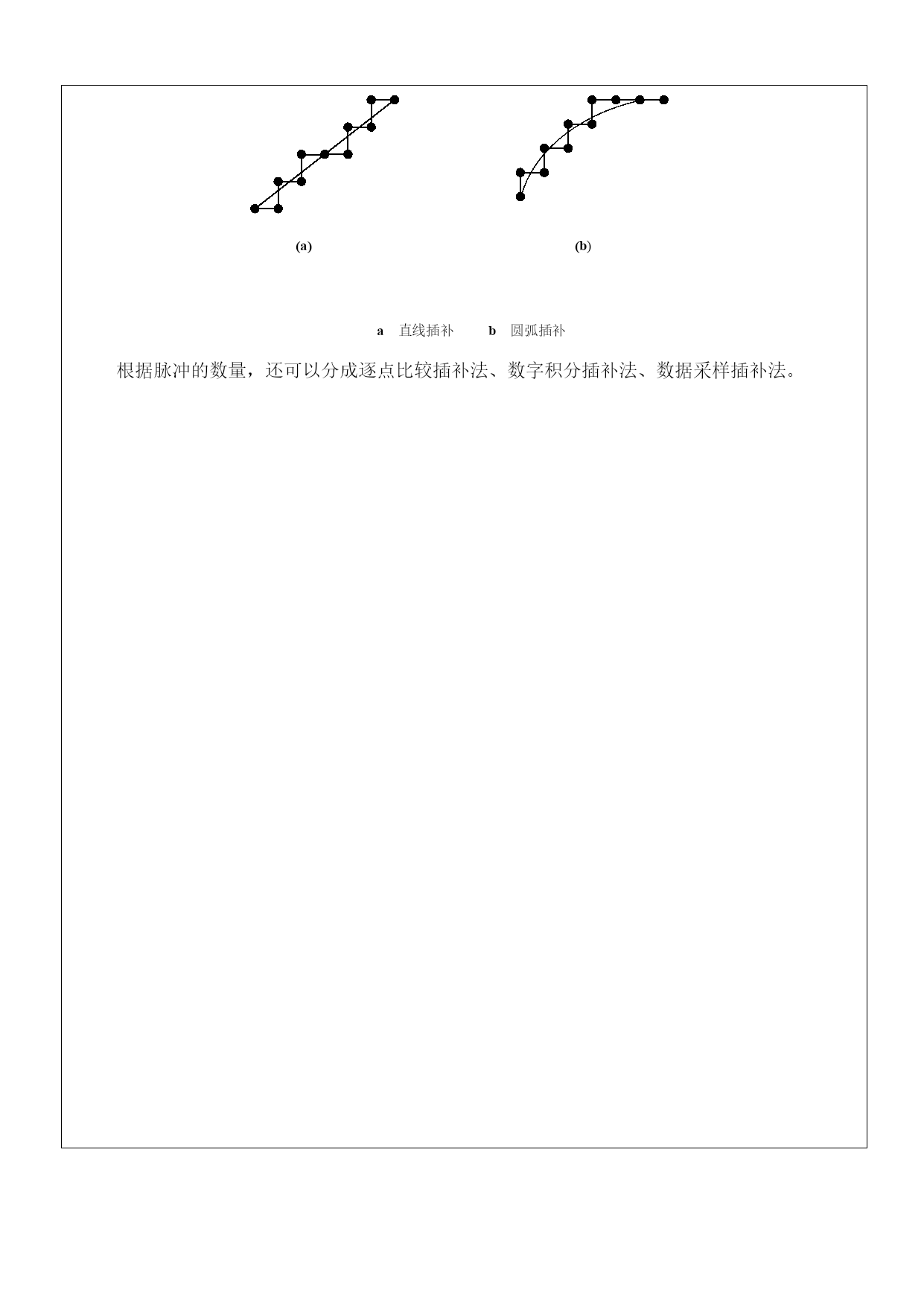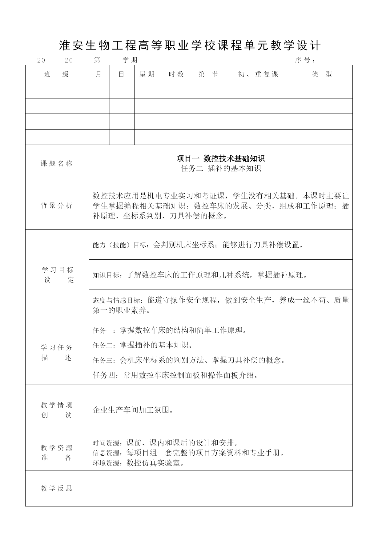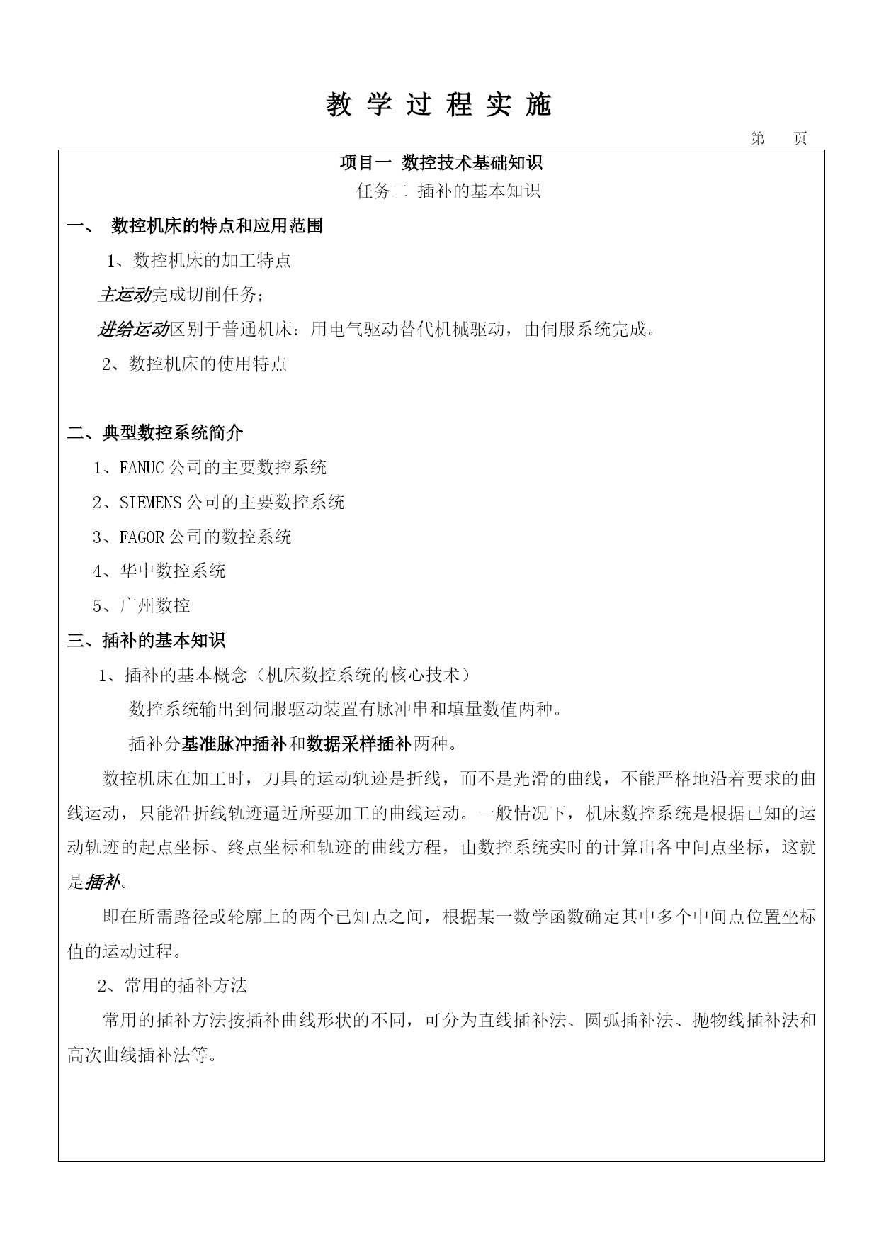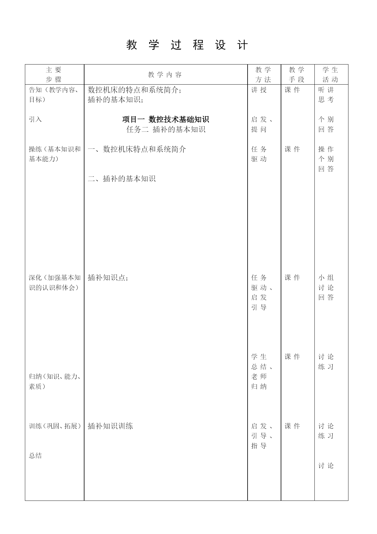 淮安生物工程高等职业学校课程单元教学设计20-20第学期序号:班级月日星期时数第节初、重复课类型课题名称项目一数控技术基础知识任务二插补的基本知识背景分析数控技术应用是机电专业实习和考证课,学生没有相关基础。本课时主要让学生掌握编程相关基础知识:数控车床的发展、分类、组成和工作原理;插补原理、坐标系判别、刀具补偿的概念。学习目标设定能力(技能)目标:会判别机床坐标系;能够进行刀具补偿设置。知识目标:了解数控车床的工作原理和几种系统,掌握插补原理。态度与情感目标:能遵守操作安全规程,做到安全生产,养成一丝不苟、质量第一的职业素养。学习任务描述任务一:掌握数控车床的结构和简单工作原理。任务二:掌握插补的基本知识。任务三:会机床坐标系的判别方法、掌握刀具补偿的概念。任务四:常用数控车床控制面板和操作面板介绍。教学情境创设企业生产车间加工氛围。教学资源准备时间资源:课前、课内和课后的设计和安排。信息资源:每项目组一套完整的项目方案资料和专业手册。环境资源:数控仿真实验室。教学反思教学过程设计主要步骤教学内容教学方法教学手段学生活动告知(教学内容、目标)引入操练(基本知识和基本能力)深化(加强基本知识的认识和体会)归纳(知识、能力、素质)训练(巩固、拓展)总结数控机床的特点和系统简介;插补的基本知识;项目一数控技术基础知识任务二插补的基本知识一、数控机床特点和系统简介二、插补的基本知识插补知识点;插补知识训练讲授启发、提问任务驱动任务驱动、启发引导学生总结、老师归纳启发、引导、指导课件课件课件课件课件听讲思考个别回答操作个别回答小组讨论回答讨论练习讨论练习讨论教学过程实施第页项目一数控技术基础知识任务二插补的基本知识一、数控机床的特点和应用范围1、数控机床的加工特点主运动完成切削任务;进给运动区别于普通机床:用电气驱动替代机械驱动,由伺服系统完成。2、数控机床的使用特点二、典型数控系统简介1、FANUC公司的主要数控系统2、SIEMENS公司的主要数控系统3、FAGOR公司的数控系统4、华中数控系统5、广州数控三、插补的基本知识1、插补的基本概念(机床数控系统的核心技术)数控系统输出到伺服驱动装置有脉冲串和填量数值两种。插补分基准脉冲插补和数据采样插补两种。数控机床在加工时,刀具的运动轨迹是折线,而不是光滑的曲线,不能严格地沿着要求的曲线运动,只能沿折线轨迹逼近所要加工的曲线运动。一般情况下,机床数控系统是根据已知的运动轨迹的起点坐标、终点坐标和轨迹的曲线方程,由数控系统实时的计算出各中间点坐标,这就是插补。即在所需路径或轮廓上的两个已知点之间,根据某一数学函数确定其中多个中间点位置坐标值的运动过程。2、常用的插补方法常用的插补方法按插补曲线形状的不同,可分为直线插补法、圆弧插补法、抛物线插补法和高次曲线插补法等。b圆弧插补a直线插补(b)(a)根据脉冲的数量,还可以分成逐点比较插补法、数字积分插补法、数据采样插补法。