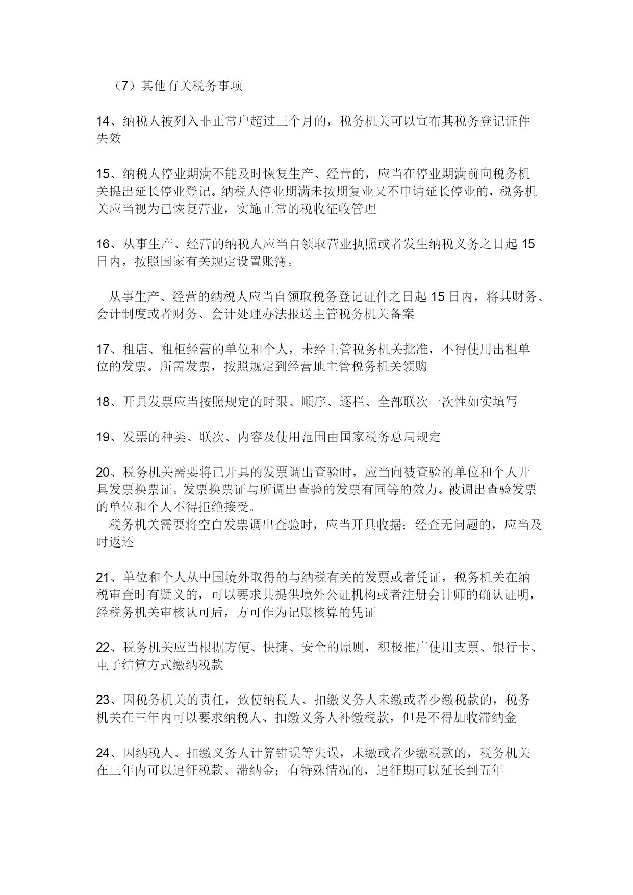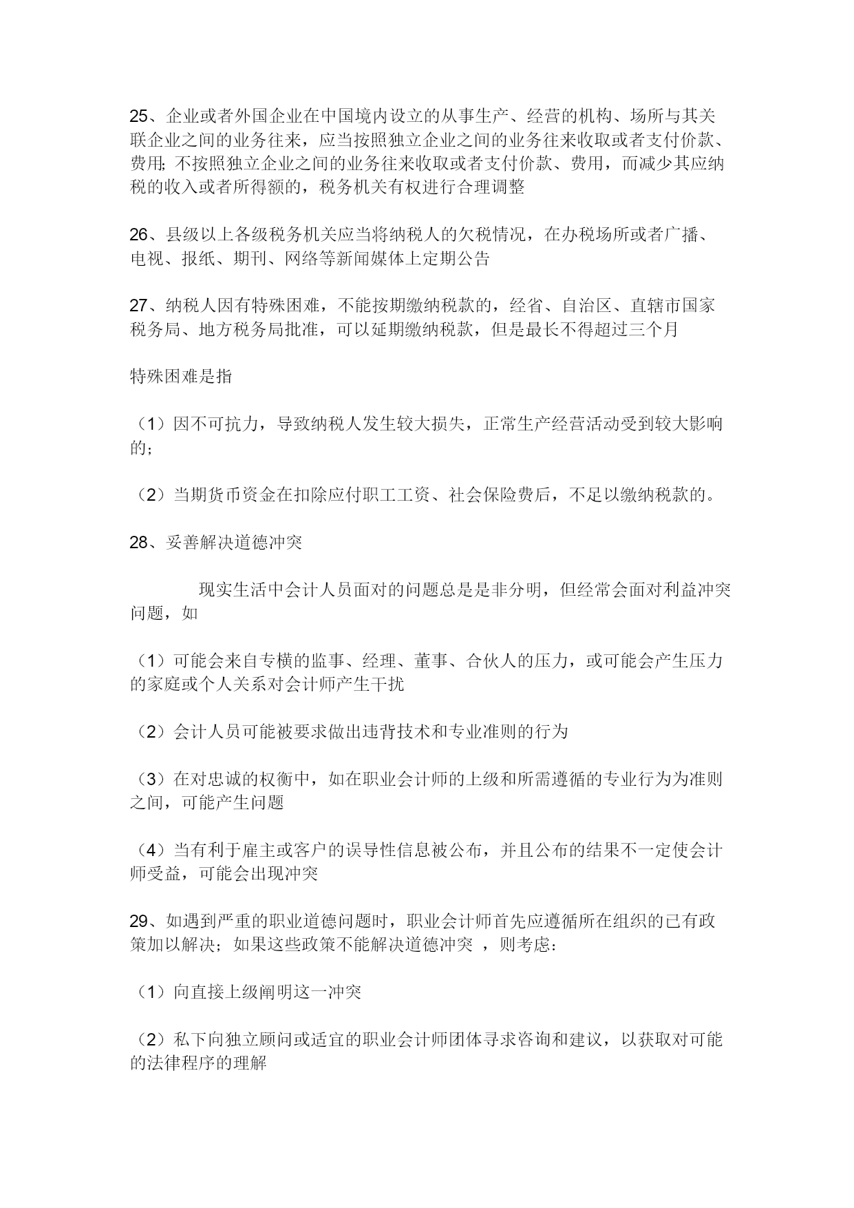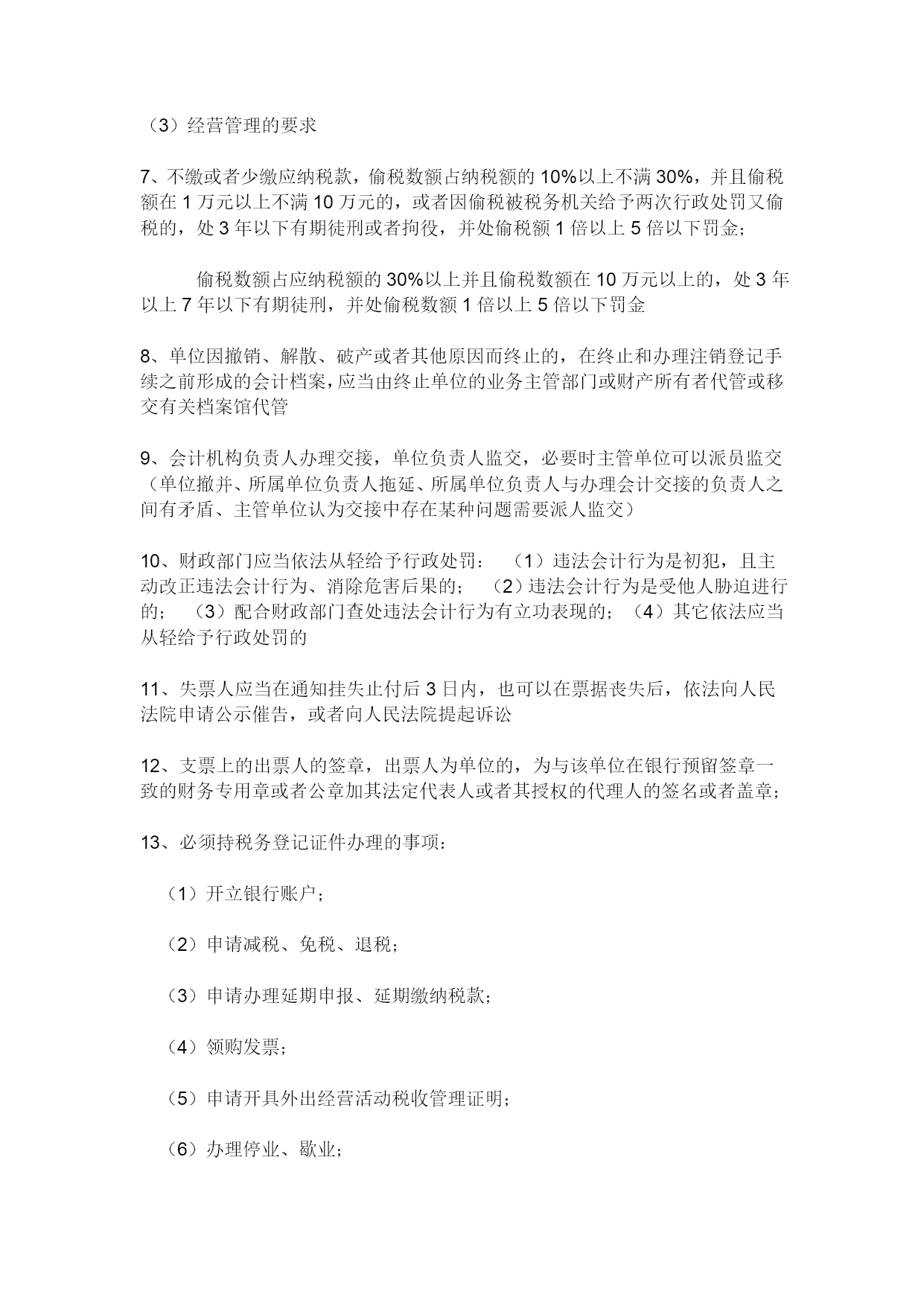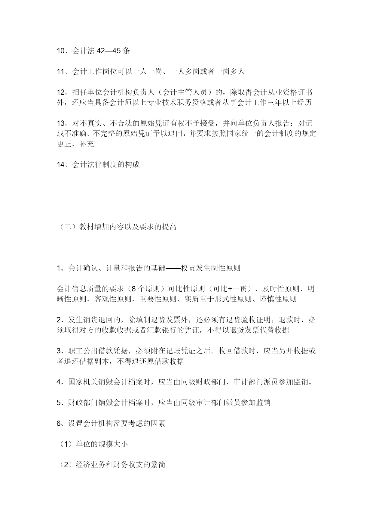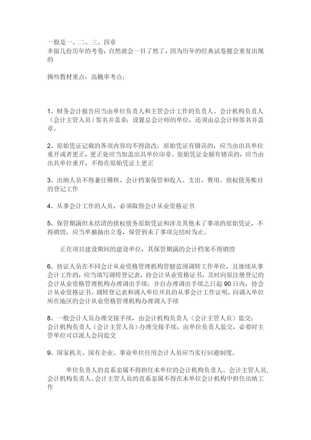一般是一、二、三、四章多做几份历年的考卷,自然就会一目了然了,因为历年的经典试卷题会重复出现的摘些教材重点:高概率考点:1、财务会计报告应当由单位负责人和主管会计工作的负责人、会计机构负责人(会计主管人员)签名并盖章;设置总会计师的单位,还须由总会计师签名并盖章。2、原始凭证记载的各项内容均不得涂改;原始凭证有错误的,应当由出具单位重开或者更正,更正处应当加盖出具单位印章。原始凭证金额有错误的,应当由出具单位重开,不得在原始凭证上更正3、出纳人员不得兼任稽核、会计档案保管和收入、支出、费用、债权债务账目的登记工作4、从事会计工作的人员,必须取得会计从业资格证书5、保管期满但未结清的债权债务原始凭证和涉及其他未了事项的原始凭证,不得销毁,应当单独抽出立卷,保管到未了事项完结时为止。正在项目建设期间的建设单位,其保管期满的会计档案不得销毁6、持证人员在不同会计从业资格管理机构管辖范围调转工作单位,且继续从事会计工作的,应当填写调转登记表,持会计从业资格证书,及时向原注册登记的会计从业资格管理机构办理调出手续;并自办理调出手续之日起90日内,持会计从业资格证书、调转登记表和调入单位开具的从事会计工作证明,向调入单位所在地区的会计从业资格管理机构办理调入手续8、一般会计人员办理交接手续,由会计机构负责人(会计主管人员)监交;会计机构负责人(会计主管人员)办理交接手续,由单位负责人监交,必要时主管单位可以派人会同监交9、国家机关、国有企业、事业单位任用会计人员应当实行回避制度。单位负责人的直系亲属不得担任本单位的会计机构负责人、会计主管人员,会计机构负责人、会计主管人员的直系亲属不得在本单位会计机构中担任出纳工作10、会计法42—45条11、会计工作岗位可以一人一岗、一人多岗或者一岗多人12、担任单位会计机构负责人(会计主管人员)的,除取得会计从业资格证书外,还应当具备会计师以上专业技术职务资格或者从事会计工作三年以上经历13、对不真实、不合法的原始凭证有权不予接受,并向单位负责人报告;对记载不准确、不完整的原始凭证予以退回,并要求按照国家统一的会计制度的规定更正、补充14、会计法律制度的构成(二)教材增加内容以及要求的提高1、会计确认、计量和报告的基础——权责发生制性原则会计信息质量的要求(8个原则)可比性原则(可比+一贯)、及时性原则、明晰性原则、客观性原则、重要性原则、实质重于形式性原则、谨慎性原则2、发生销货退回的,除填制退货发票外,还必须有退货验收证明;退款时,必须取得对方的收款收据或者汇款银行的凭证,不得以退货发票代替收据3、职工公出借款凭据,必须附在记账凭证之后。收回借款时,应当另开收据或者退还借据副本,不得退还原借款收据4、国家机关销毁会计档案时,应当由同级财政部门、审计部门派员参加监销。5、财政部门销毁会计档案时,应当由同级审计部门派员参加监销6、设置会计机构需要考虑的因素(1)单位的规模大小(2)经济业务和财务收支的繁简(3)经营管理的要求7、不缴或者少缴应纳税款,偷税数额占纳税额的10%以上不满30%,并且偷税额在1万元以上不满10万元的,或者因偷税被税务机关给予两次行政处罚又偷税的,处3年以下有期徒刑或者拘役,并处偷税额1倍以上5倍以下罚金;偷税数额占应纳税额的30%以上并且偷税数额在10万元以上的,处3年以上7年以下有期徒刑,并处偷税数额1倍以上5倍以下罚金8、单位因撤销、解散、破产或者其他原因而终止的,在终止和办理注销登记手续之前形成的会计档案,应当由终止单位的业务主管部门或财产所有者代管或移交有关档案馆代管9、会计机构负责人办理交接,单位负责人监交,必要时主管单位可以派员监交(单位撤并、所属单位负责人拖延、所属单位负责人与办理会计交接的负责人之间有矛盾、主管单位认为交接中存在某种问题需要派人监交)10、财政部门应当依法从轻给予行政处罚:(1)违法会计行为是初犯,且主动改正违法会计行为、消除危害后果的;(2)违法会计行为是受他人胁迫进行的;(3)配合财政部门查处违法会计行为有立功表现的;(4)其它依法应当从轻给予行政处罚的11、失票人应当在通知挂失止付后3日内,也可以在票据丧失后,依法向人民法院申请公示催告,或者向人民法院提起诉讼12、支票上的出票人的签章,出票人为单位的,为与该单位在银行预留签章一致的财务专用章或者公章加其法定代表人或者其授权的代理人的签名或者盖章;13、必须持税务登记证件办理的事项:(1)开立银行账户;(2)申请减税、免税、退税;(3)申请办理延期申报、延期缴纳税款;(4)领购发票;(5)申请开具外出经营活动税收管理证明;(6)办理停业、歇业;(7)其他有关税务事项14、纳税人被列入非正常户超过三个月的,税务机关可以宣布其税务登记证件失效15、纳税人停业期满不能及时恢复生产、经营的,应当在