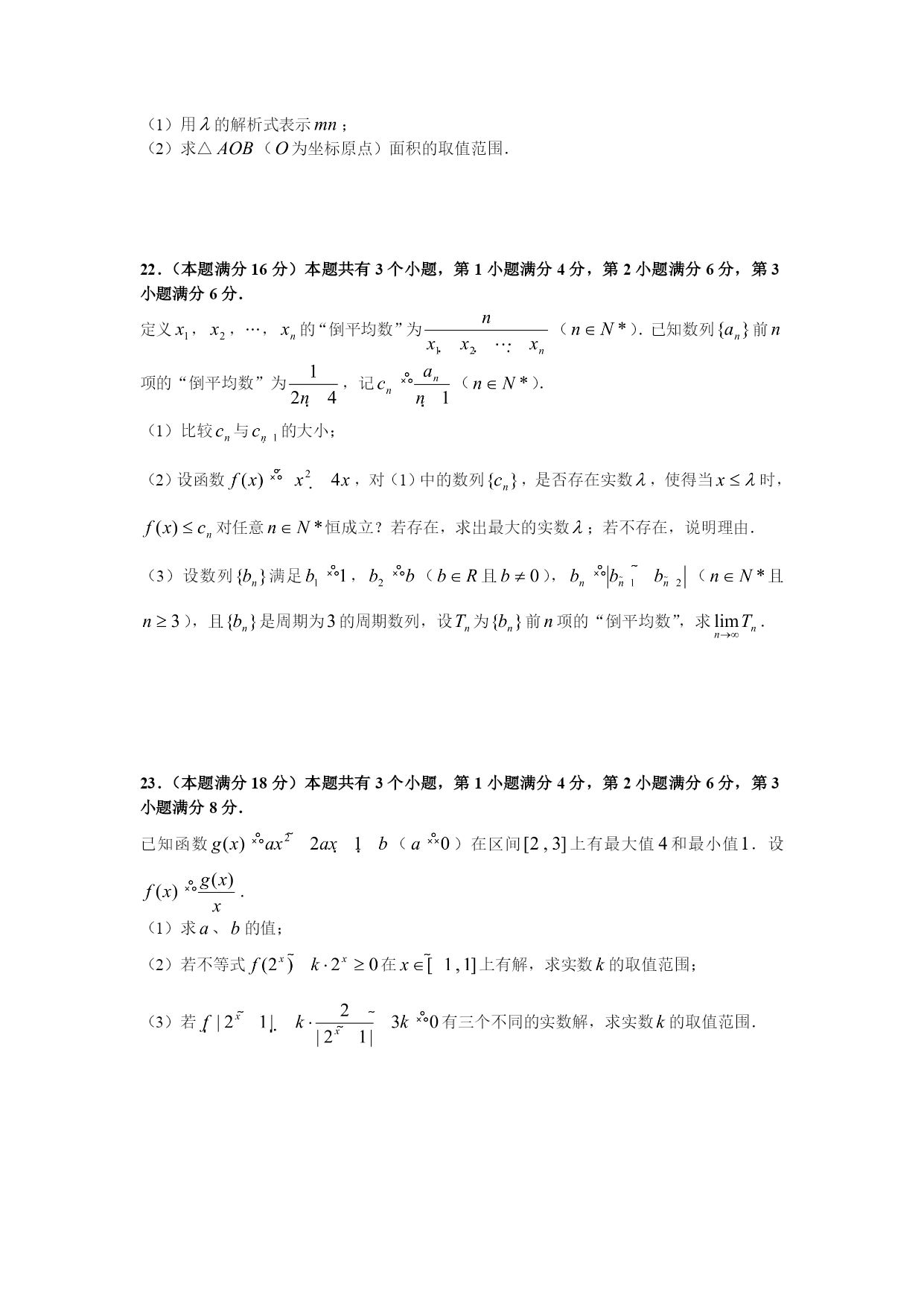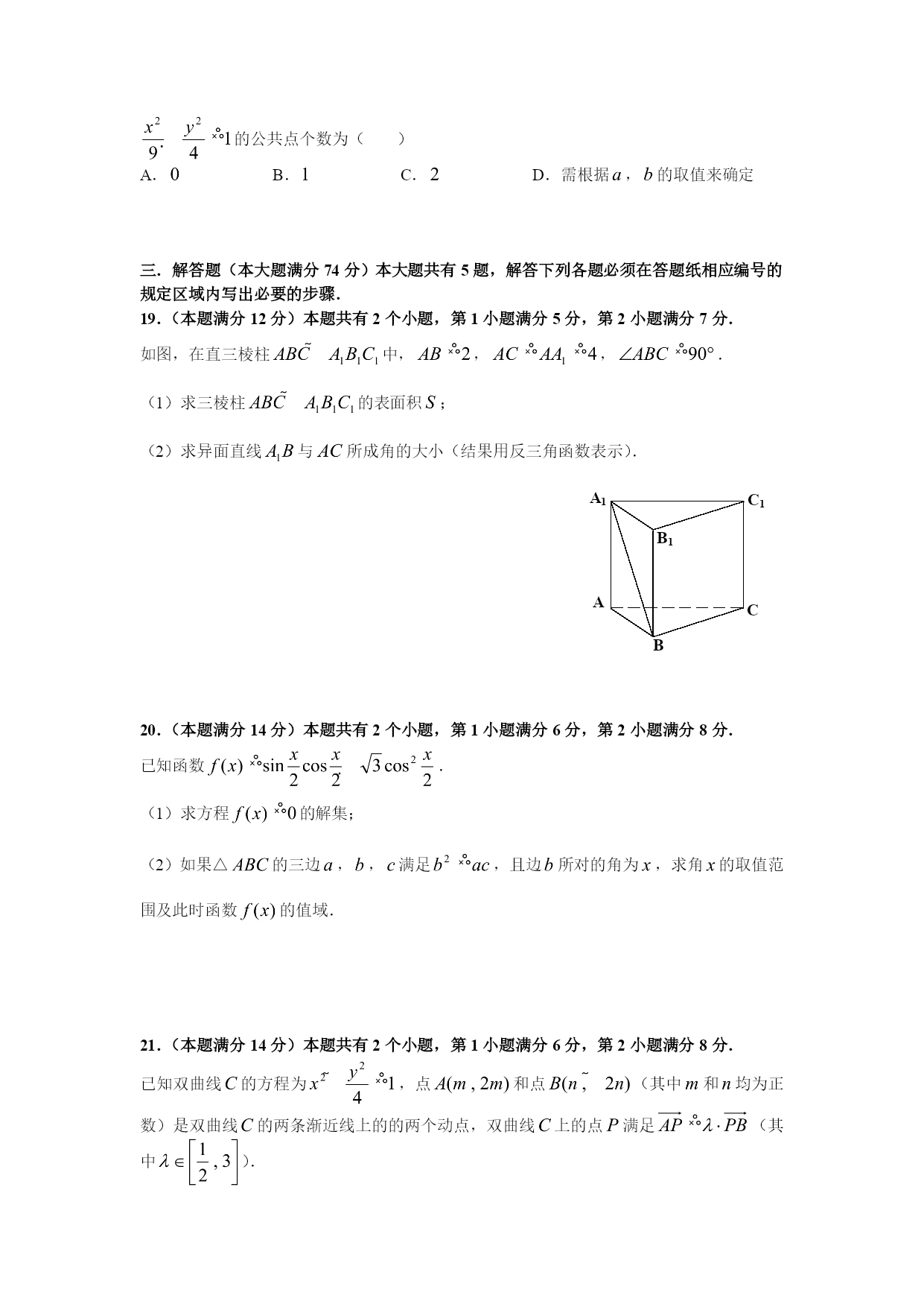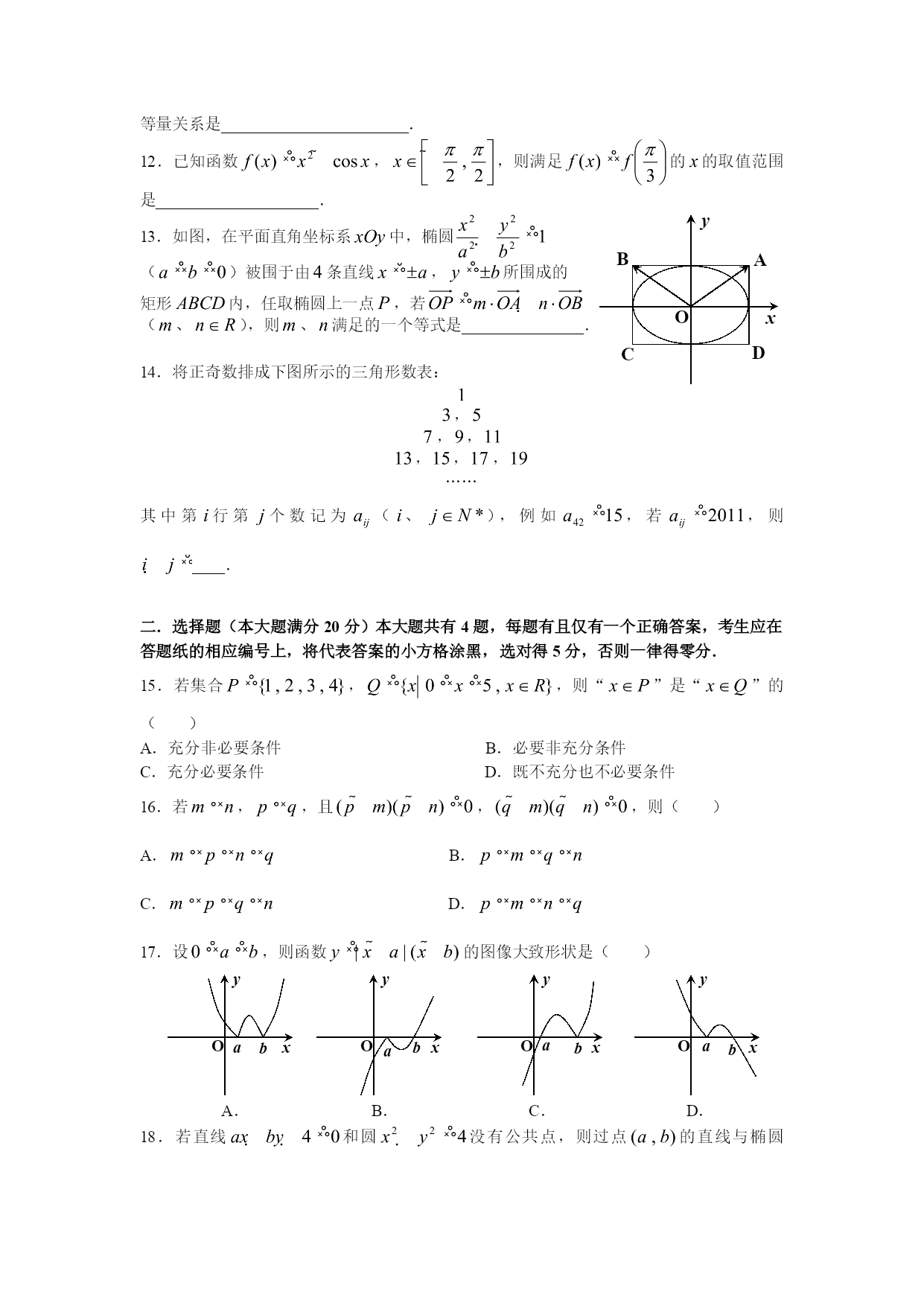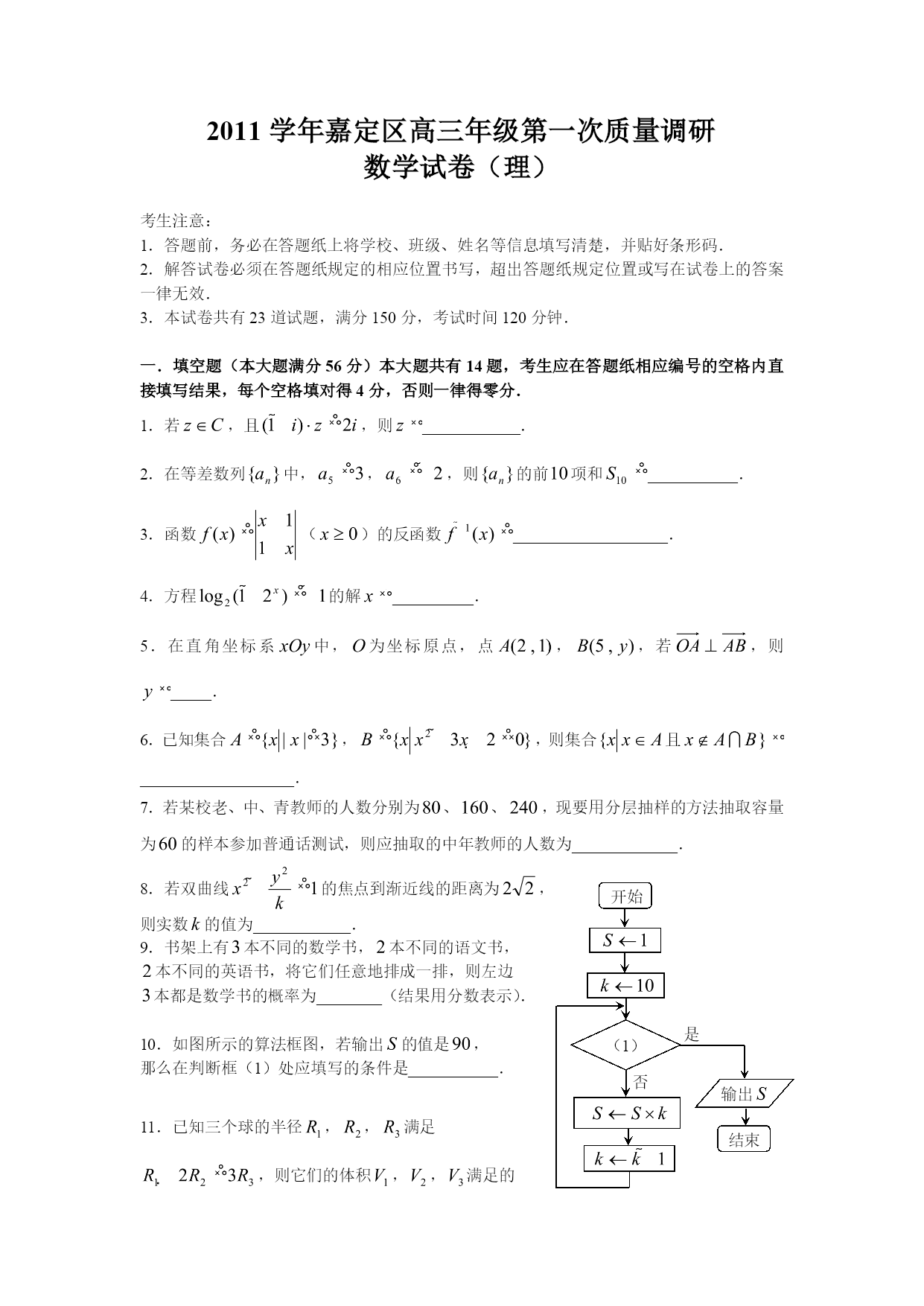 2011学年嘉定区高三年级第一次质量调研数学试卷(理)考生注意:1.答题前,务必在答题纸上将学校、班级、姓名等信息填写清楚,并贴好条形码.2.解答试卷必须在答题纸规定的相应位置书写,超出答题纸规定位置或写在试卷上的答案一律无效.3.本试卷共有23道试题,满分150分,考试时间120分钟.一.填空题(本大题满分56分)本大题共有14题,考生应在答题纸相应编号的空格内直接填写结果,每个空格填对得4分,否则一律得零分.1.若,且,则____________.2.在等差数列中,,,则的前项和___________.3.函数()的反函数___________________.4.方程的解__________.5.在直角坐标系中,为坐标原点,点,,若,则_____.6.已知集合,,则集合且___________________.7.若某校老、中、青教师的人数分别为、、,现要用分层抽样的方法抽取容量为的样本参加普通话测试,则应抽取的中年教师的人数为_____________.否结束开始输出是(1)8.若双曲线的焦点到渐近线的距离为,则实数的值为____________.9.书架上有本不同的数学书,本不同的语文书,本不同的英语书,将它们任意地排成一排,则左边本都是数学书的概率为________(结果用分数表示).10.如图所示的算法框图,若输出的值是,那么在判断框(1)处应填写的条件是___________.11.已知三个球的半径,,满足,则它们的体积,,满足的等量关系是_______________________.ABCDOyx12.已知函数,,则满足的的取值范围是____________________.13.如图,在平面直角坐标系中,椭圆()被围于由条直线,所围成的矩形内,任取椭圆上一点,若(、),则、满足的一个等式是_______________.14.将正奇数排成下图所示的三角形数表:,,,,,,……其中第行第个数记为(、),例如,若,则____.二.选择题(本大题满分20分)本大题共有4题,每题有且仅有一个正确答案,考生应在答题纸的相应编号上,将代表答案的小方格涂黑,选对得5分,否则一律得零分.15.若集合,,则“”是“”的()A.充分非必要条件B.必要非充分条件C.充分必要条件D.既不充分也不必要条件16.若,,且,,则()A.B.C.D.OxyabbaOxybaOxyOaby17.设,则函数的图像大致形状是()xA.B.C.D.18.若直线和圆没有公共点,则过点的直线与椭圆的公共点个数为()A.B.C.D.需根据,的取值来确定三.解答题(本大题满分74分)本大题共有5题,解答下列各题必须在答题纸相应编号的规定区域内写出必要的步骤.19.(本题满分12分)本题共有2个小题,第1小题满分5分,第2小题满分7分.如图,在直三棱柱中,,,.(1)求三棱柱的表面积;(2)求异面直线与所成角的大小(结果用反三角函数表示).ABCA1B1C120.(本题满分14分)本题共有2个小题,第1小题满分6分,第2小题满分8分.已知函数.(1)求方程的解集;(2)如果△的三边,,满足,且边所对的角为,求角的取值范围及此时函数的值域.21.(本题满分14分)本题共有2个小题,第1小题满分6分,第2小题满分8分.已知双曲线的方程为,点和点(其中和均为正数)是双曲线的两条渐近线上的的两个动点,双曲线上的点满足(其中).(1)用的解析式表示;(2)求△(为坐标原点)面积的取值范围.22.(本题满分16分)本题共有3个小题,第1小题满分4分,第2小题满分6分,第3小题满分6分.定义,,…,的“倒平均数”为().已知数列前项的“倒平均数”为,记().(1)比较与的大小;(2)设函数,对(1)中的数列,是否存在实数,使得当时,对任意恒成立?若存在,求出最大的实数;若不存在,说明理由.(3)设数列满足,(且),(且),且是周期为的周期数列,设为前项的“倒平均数”,求.23.(本题满分18分)本题共有3个小题,第1小题满分4分,第2小题满分6分,第3小题满分8分.已知函数()在区间上有最大值和最小值.设.(1)求、的值;(2)若不等式在上有解,求实数的取值范围;(3)若有三个不同的实数解,求实数的取值范围.