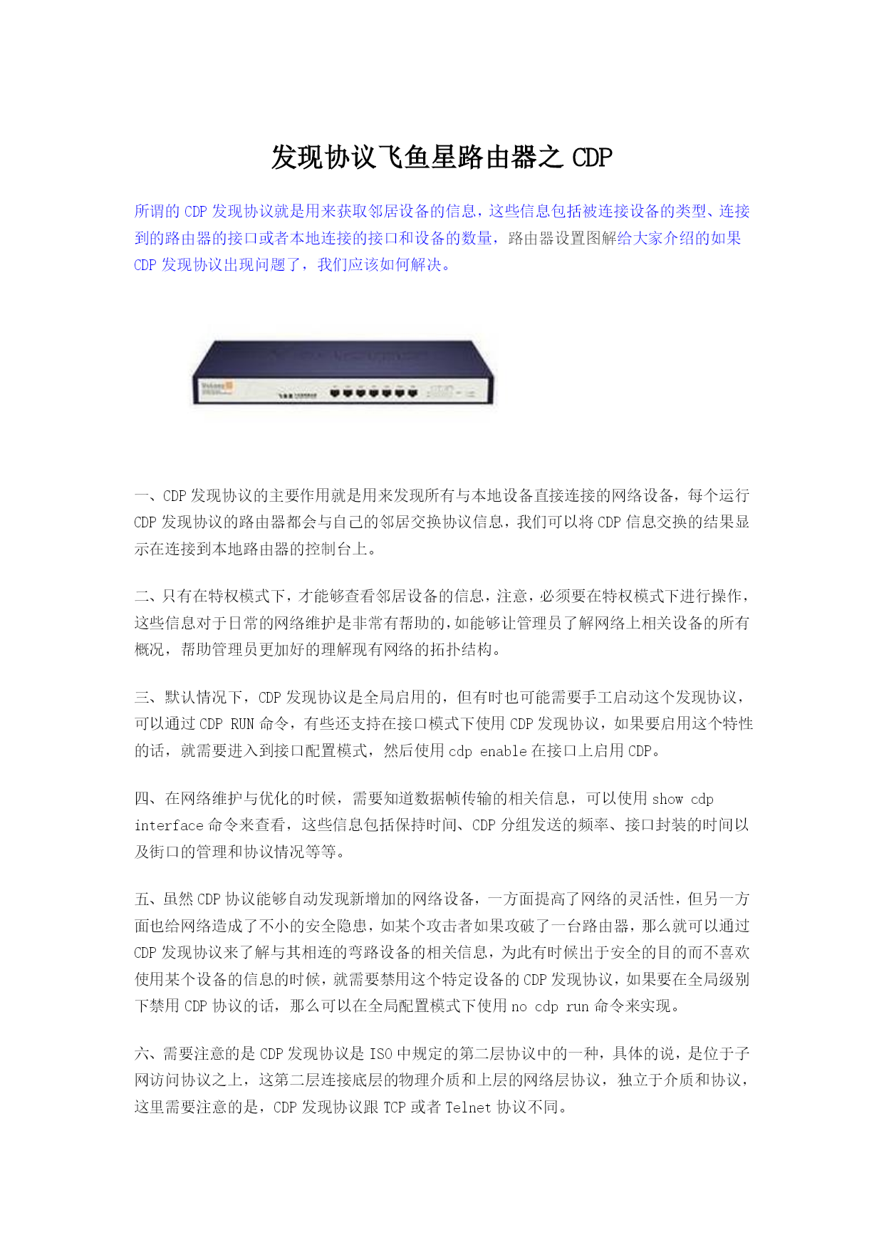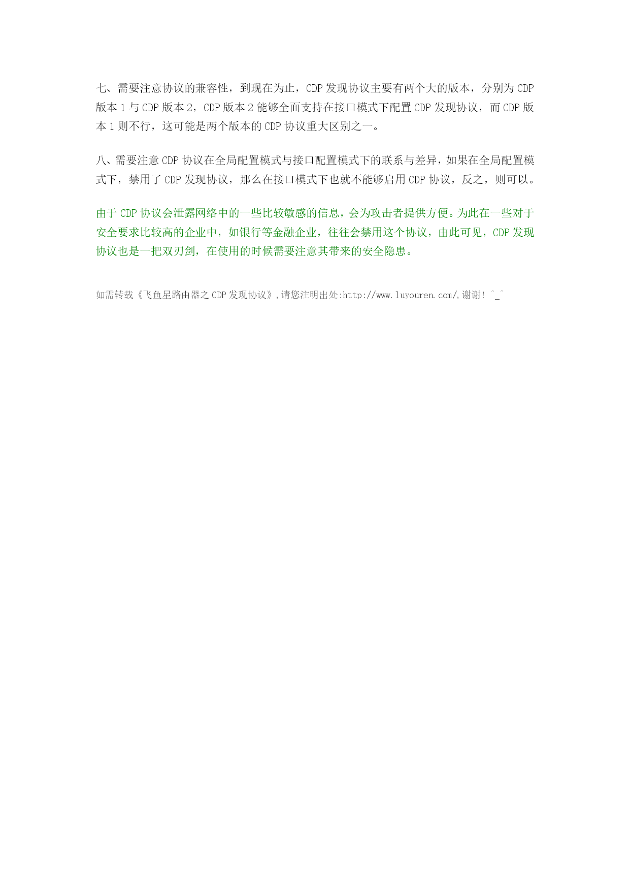 发现协议飞鱼星路由器之CDP所谓的CDP发现协议就是用来获取邻居设备的信息,这些信息包括被连接设备的类型、连接到的路由器的接口或者本地连接的接口和设备的数量,HYPERLINK"http://www.luyouren.com/"路由器设置图解给大家介绍的如果CDP发现协议出现问题了,我们应该如何解决。一、CDP发现协议的主要作用就是用来发现所有与本地设备直接连接的网络设备,每个运行CDP发现协议的路由器都会与自己的邻居交换协议信息,我们可以将CDP信息交换的结果显示在连接到本地路由器的控制台上。二、只有在特权模式下,才能够查看邻居设备的信息,注意,必须要在特权模式下进行操作,这些信息对于日常的网络维护是非常有帮助的,如能够让管理员了解网络上相关设备的所有概况,帮助管理员更加好的理解现有网络的拓扑结构。三、默认情况下,CDP发现协议是全局启用的,但有时也可能需要手工启动这个发现协议,可以通过CDPRUN命令,有些还支持在接口模式下使用CDP发现协议,如果要启用这个特性的话,就需要进入到接口配置模式,然后使用cdpenable在接口上启用CDP。四、在网络维护与优化的时候,需要知道数据帧传输的相关信息,可以使用showcdpinterface命令来查看,这些信息包括保持时间、CDP分组发送的频率、接口封装的时间以及街口的管理和协议情况等等。五、虽然CDP协议能够自动发现新增加的网络设备,一方面提高了网络的灵活性,但另一方面也给网络造成了不小的安全隐患,如某个攻击者如果攻破了一台路由器,那么就可以通过CDP发现协议来了解与其相连的弯路设备的相关信息,为此有时候出于安全的目的而不喜欢使用某个设备的信息的时候,就需要禁用这个特定设备的CDP发现协议,如果要在全局级别下禁用CDP协议的话,那么可以在全局配置模式下使用nocdprun命令来实现。六、需要注意的是CDP发现协议是ISO中规定的第二层协议中的一种,具体的说,是位于子网访问协议之上,这第二层连接底层的物理介质和上层的网络层协议,独立于介质和协议,这里需要注意的是,CDP发现协议跟TCP或者Telnet协议不同。七、需要注意协议的兼容性,到现在为止,CDP发现协议主要有两个大的版本,分别为CDP版本1与CDP版本2,CDP版本2能够全面支持在接口模式下配置CDP发现协议,而CDP版本1则不行,这可能是两个版本的CDP协议重大区别之一。八、需要注意CDP协议在全局配置模式与接口配置模式下的联系与差异,如果在全局配置模式下,禁用了CDP发现协议,那么在接口模式下也就不能够启用CDP协议,反之,则可以。由于CDP协议会泄露网络中的一些比较敏感的信息,会为攻击者提供方便。为此在一些对于安全要求比较高的企业中,如银行等金融企业,往往会禁用这个协议,由此可见,CDP发现协议也是一把双刃剑,在使用的时候需要注意其带来的安全隐患。如需转载HYPERLINK"http://www.luyouren.com/1/1121.html"《飞鱼星路由器之CDP发现协议》,请您注明出处:HYPERLINK"http://www.luyouren.com/"http://www.luyouren.com/,谢谢!^_^HYPERLINK"http://www.luyouren.com/1/547.html"\t"_blank"飞鱼星路由器下接三层交换机设...2012-03HYPERLINK"http://www.luyouren.com/1/803.html"\t"_blank"阿尔法路由器端口映射失败2012-05HYPERLINK"http://www.luyouren.com/2/128.html"\t"_blank"netgear无线路由器设置全图解教程2011-11HYPERLINK"http://www.luyouren.com/1/480.html"\t"_blank"volans路由器设置点对网VPN注意...2012-02HYPERLINK"http://www.luyouren.com/6/890.html"\t"_blank"阿尔法路由器分类详解2012-06HYPERLINK"http://www.luyouren.com/1/762.html"\t"_blank"灵科系统之VPN连接设置2012-05HYPERLINK"http://www.luyouren.com/1/17.html"\t"_blank"有线宽频、天威视讯的路由器设...2011-10HYPERLINK"http://www.luyouren.com/5/46.html"\t"_blank"影响无线信号质量的成因及改善方法2011-10HYPERL