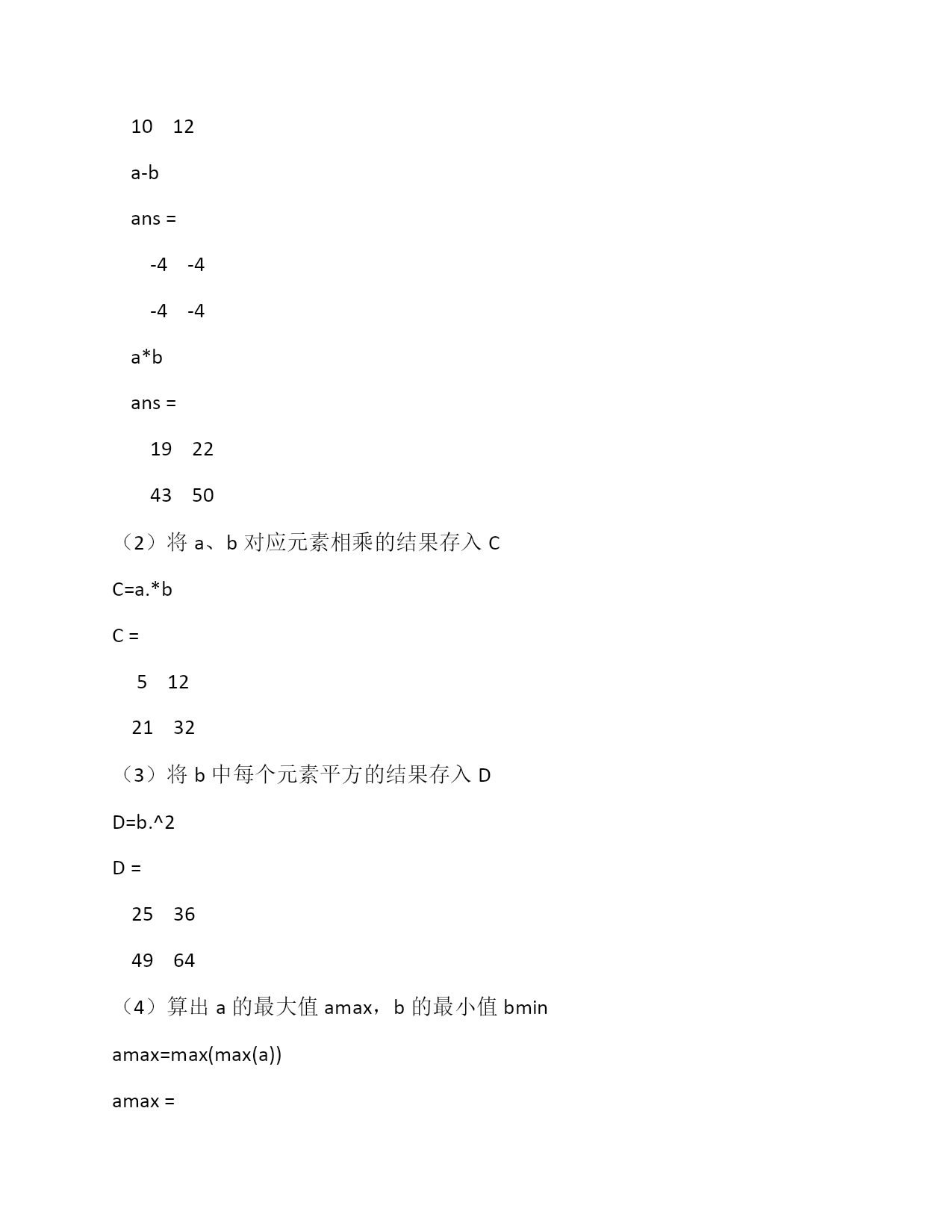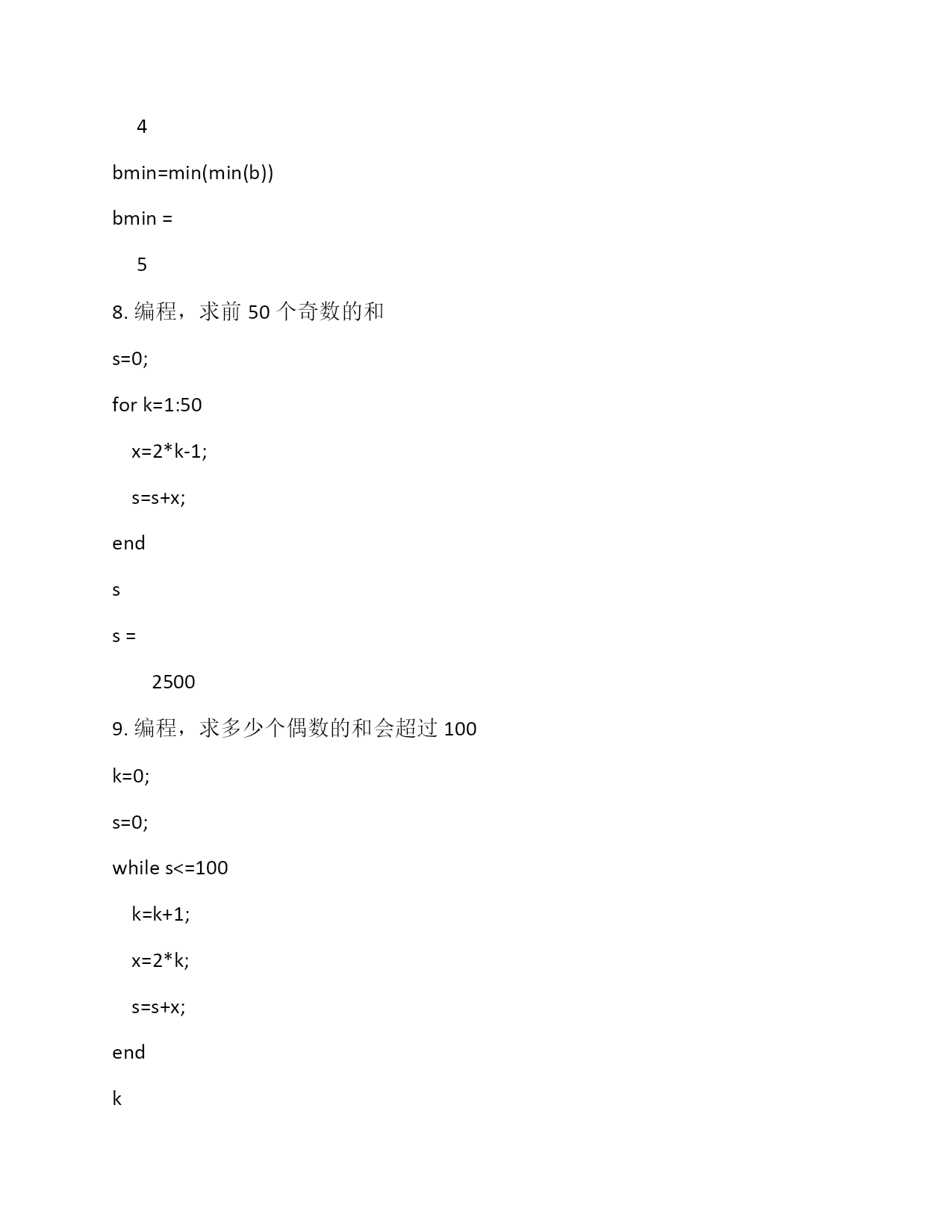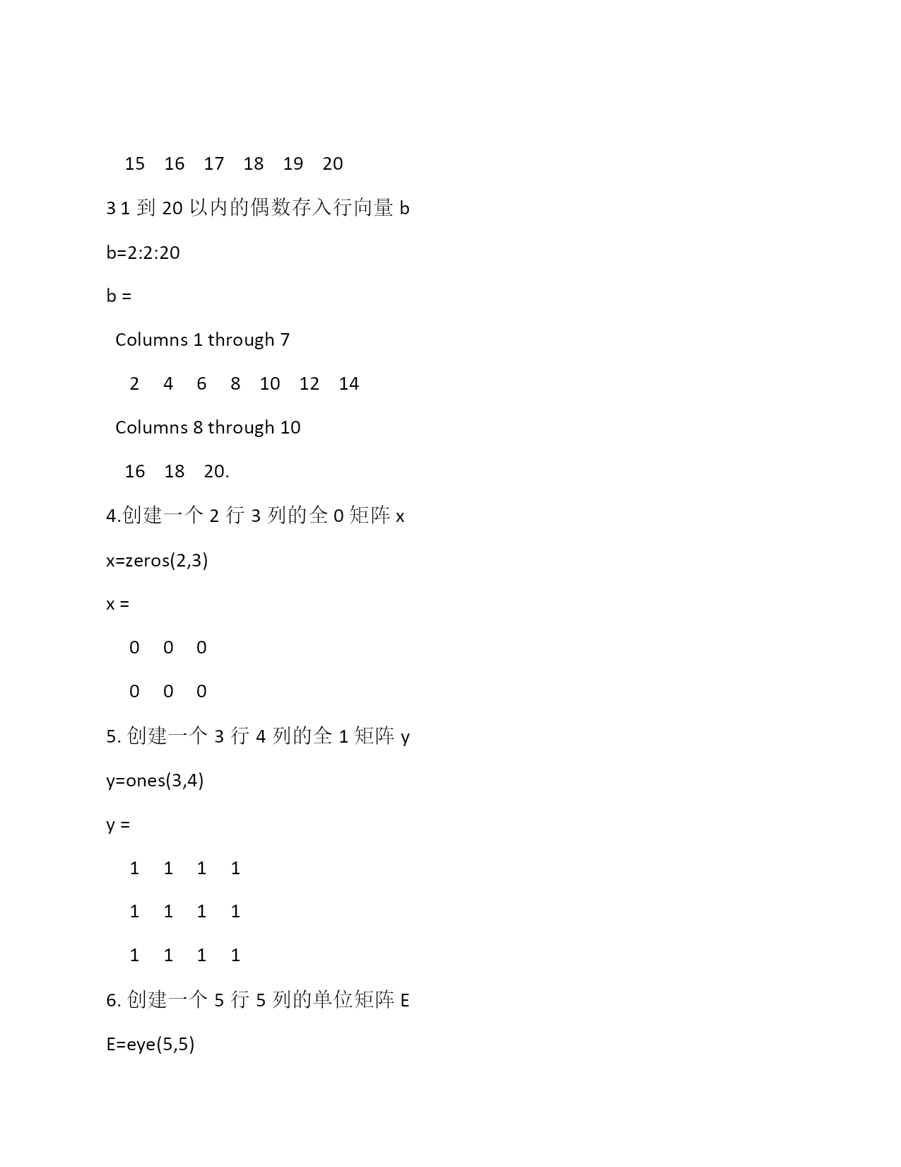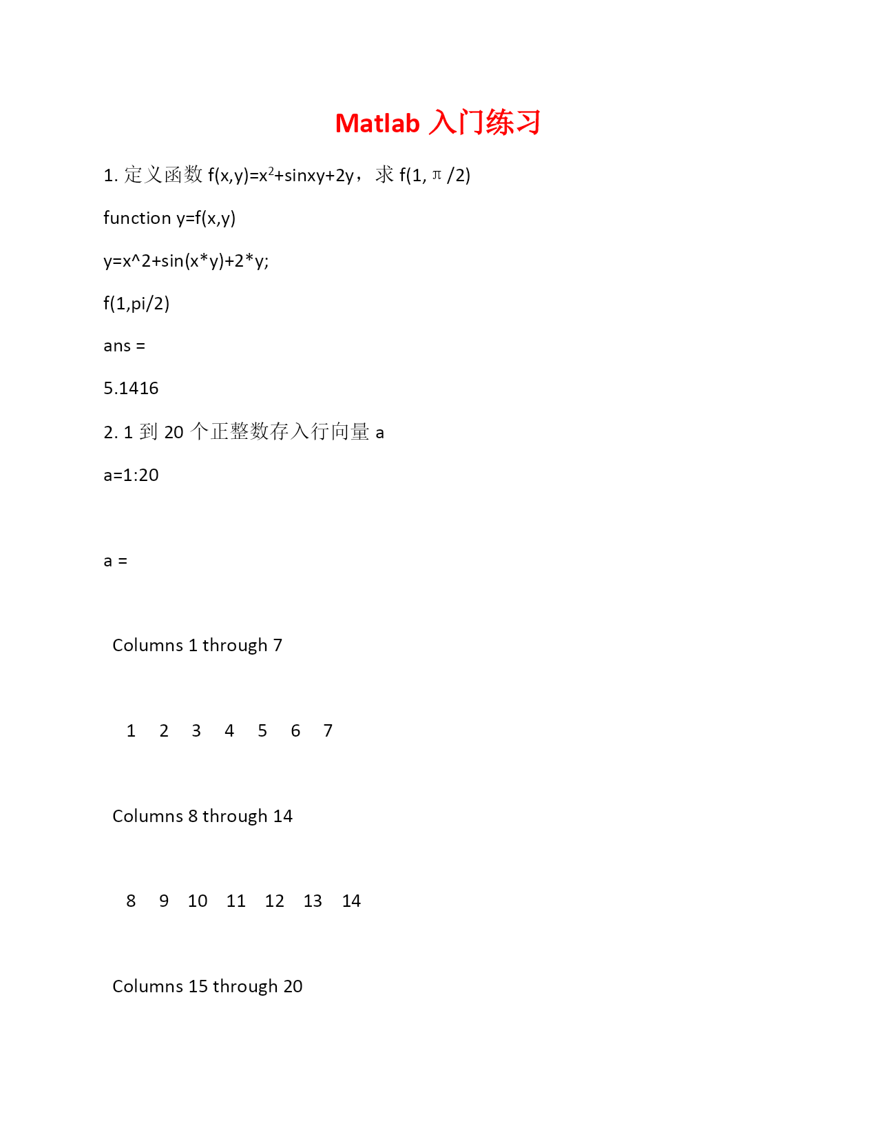Matlab入门练习1.定义函数f(x,y)=x2+sinxy+2y,求f(1,π/2)functiony=f(x,y)y=x^2+sin(x*y)+2*y;f(1,pi/2)ans=5.14162.1到20个正整数存入行向量aa=1:20a=Columns1through71234567Columns8through14891011121314Columns15through2015161718192031到20以内的偶数存入行向量bb=2:2:20b=Columns1through72468101214Columns8through10161820.4.创建一个2行3列的全0矩阵xx=zeros(2,3)x=0000005.创建一个3行4列的全1矩阵yy=ones(3,4)y=1111111111116.创建一个5行5列的单位矩阵EE=eye(5,5)E=10000010000010000010000017.a=1234b=5678(1)计算a+b,a-b,aba=[12;34]a=1234>>b=[56;78]b=5678>>a+bans=681012a-bans=-4-4-4-4a*bans=19224350(2)将a、b对应元素相乘的结果存入CC=a.*bC=5122132(3)将b中每个元素平方的结果存入DD=b.^2D=25364964(4)算出a的最大值amax,b的最小值bminamax=max(max(a))amax=4bmin=min(min(b))bmin=58.编程,求前50个奇数的和s=0;fork=1:50x=2*k-1;s=s+x;endss=25009.编程,求多少个偶数的和会超过100k=0;s=0;whiles<=100k=k+1;x=2*k;s=s+x;endkk=1010.编程,输入某个分数值,自动输出“优秀”或者“及格”或者“挂科”m=input('pleaseinputgread:')ifm>=85y='优秀';elseifm>=60y='及格';elsey='挂科';endendypleaseinputgread:90m=90y=优秀