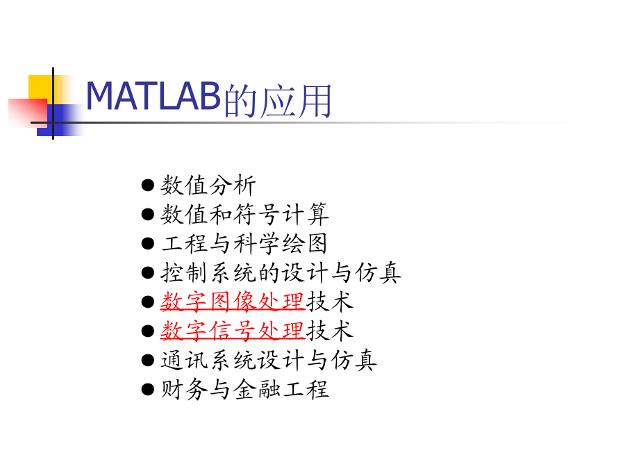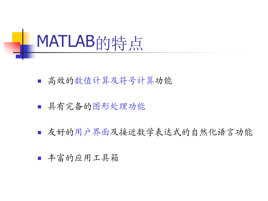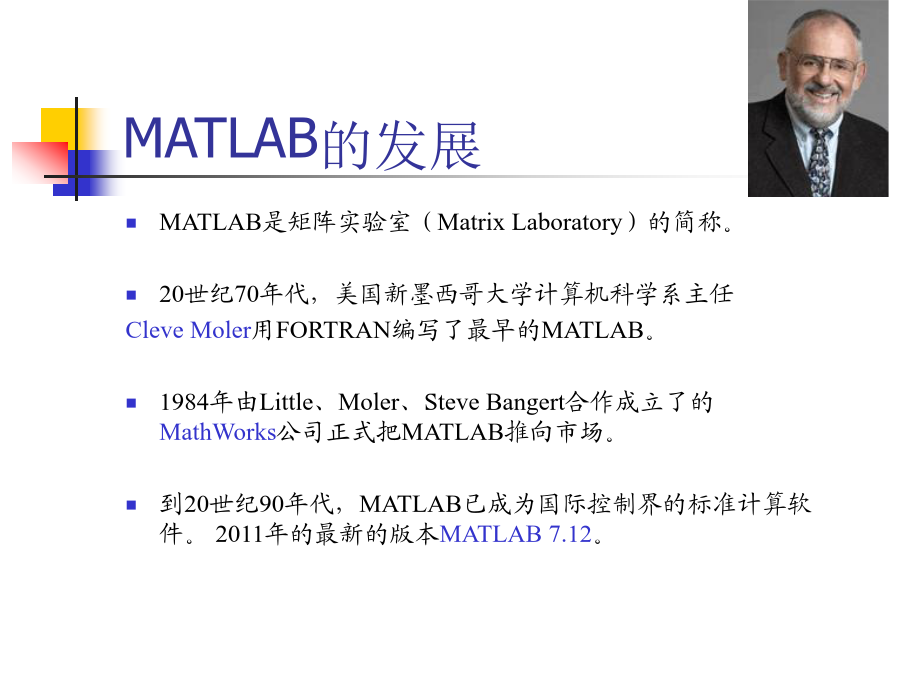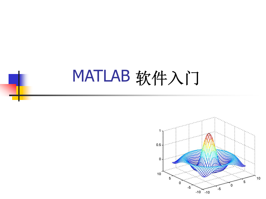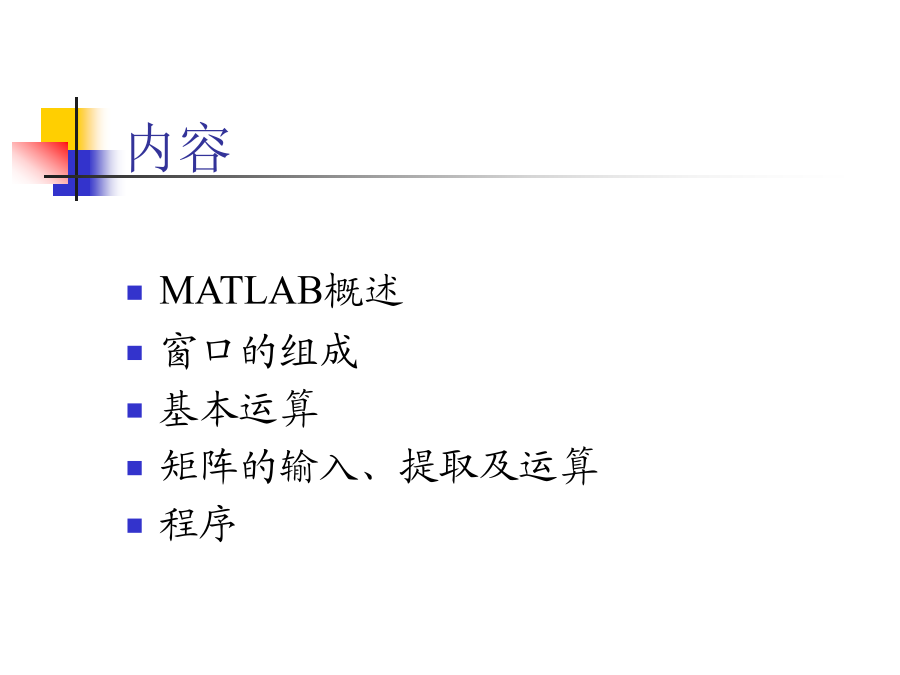 MATLAB软件入门内容MATLAB的发展MATLAB的应用MATLAB的特点一、MATLAB的窗口组成命令窗口-----CommandWindow工作空间-----Workspace命令历史窗口----CommandHistory编辑窗口----editor图形窗口---figure二、基本运算练习format命令三、矩阵的输入、提取及运算3、矩阵的基本运算(1)算数运算矩阵的加减运算:+(加)、-(减)矩阵乘法:*(乘)矩阵除法:/(右除)、\(左除)矩阵的乘方:^(乘方)矩阵转置:'(转置运算符)练习四、程序练习: