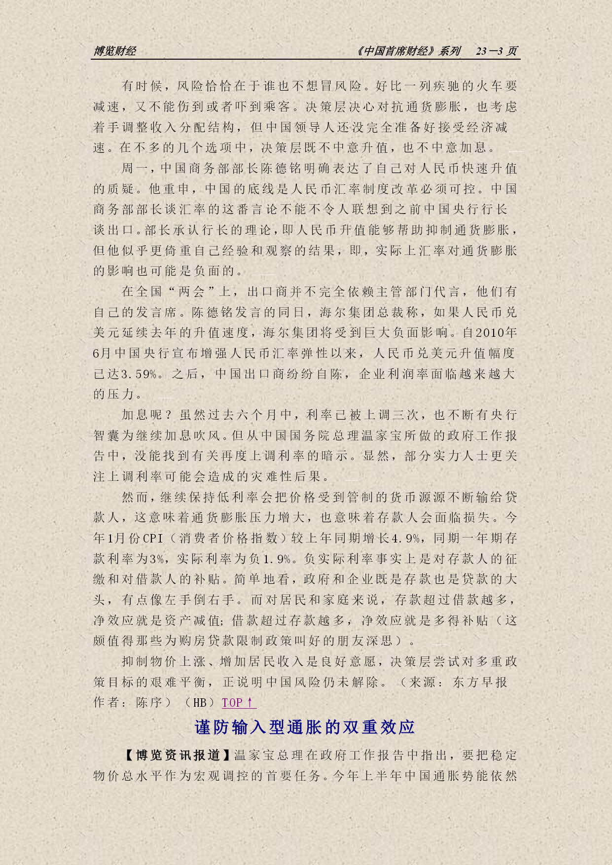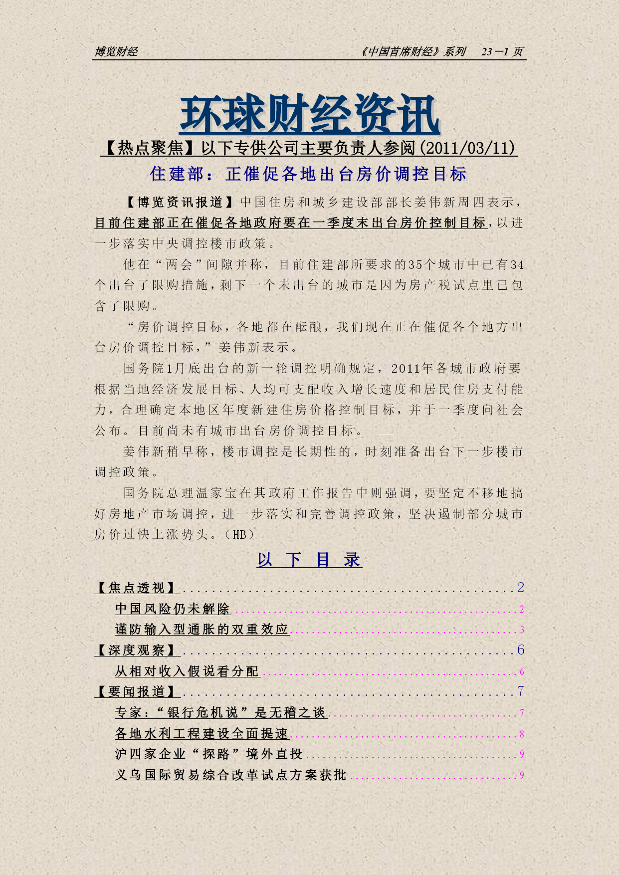 博览财经《中国首席财经》系列NUMPAGES23-页环球财经资讯【热点聚焦】以下专供公司主要负责人参阅(2011/03/11)住建部:正催促各地出台房价调控目标【博览资讯报道】中国住房和城乡建设部部长姜伟新周四表示,目前住建部正在催促各地政府要在一季度末出台房价控制目标,以进一步落实中央调控楼市政策。他在“两会”间隙并称,目前住建部所要求的35个城市中已有34个出台了限购措施,剩下一个未出台的城市是因为房产税试点里已包含了限购。“房价调控目标,各地都在酝酿,我们现在正在催促各个地方出台房价调控目标,”姜伟新表示。国务院1月底出台的新一轮调控明确规定,2011年各城市政府要根据当地经济发展目标、人均可支配收入增长速度和居民住房支付能力,合理确定本地区年度新建住房价格控制目标,并于一季度向社会公布。目前尚未有城市出台房价调控目标。QQcABlVzRBpFVh9bXwwcAV8=姜伟新稍早称,楼市调控是长期性的,时刻准备出台下一步楼市调控政策。国务院总理温家宝在其政府工作报告中则强调,要坚定不移地搞好房地产市场调控,进一步落实和完善调控政策,坚决遏制部分城市房价过快上涨势头。(HB)以下目录TOC\o"1-3"\h\z\uHYPERLINK\l"_Toc287554903"【焦点透视】PAGEREF_Toc287554903\h2HYPERLINK\l"_Toc287554904"中国风险仍未解除PAGEREF_Toc287554904\h2HYPERLINK\l"_Toc287554905"谨防输入型通胀的双重效应PAGEREF_Toc287554905\h3HYPERLINK\l"_Toc287554906"【深度观察】PAGEREF_Toc287554906\h6HYPERLINK\l"_Toc287554907"从相对收入假说看分配PAGEREF_Toc287554907\h6HYPERLINK\l"_Toc287554908"【要闻报道】PAGEREF_Toc287554908\h7HYPERLINK\l"_Toc287554909"专家:“银行危机说”是无稽之谈PAGEREF_Toc287554909\h7HYPERLINK\l"_Toc287554910"各地水利工程建设全面提速PAGEREF_Toc287554910\h8HYPERLINK\l"_Toc287554911"沪四家企业“探路”境外直投PAGEREF_Toc287554911\h9HYPERLINK\l"_Toc287554912"义乌国际贸易综合改革试点方案获批PAGEREF_Toc287554912\h9HYPERLINK\l"_Toc287554913"【国际聚焦】PAGEREF_Toc287554913\h10HYPERLINK\l"_Toc287554914"韩国央行再次加息以抑通胀PAGEREF_Toc287554914\h10HYPERLINK\l"_Toc287554915"“债王”清空美国国债PAGEREF_Toc287554915\h10HYPERLINK\l"_Toc287554916"美政府已回收70%救助资金PAGEREF_Toc287554916\h11HYPERLINK\l"_Toc287554917"若卡扎菲继续执政,欧盟或扩大制裁PAGEREF_Toc287554917\h12HYPERLINK\l"_Toc287554918"欧债风波再起穆迪再度发难希腊与西班牙PAGEREF_Toc287554918\h12HYPERLINK\l"_Toc287554919"日本下修2010年四季度GDPPAGEREF_Toc287554919\h13HYPERLINK\l"_Toc287554920"【国际观察】PAGEREF_Toc287554920\h13HYPERLINK\l"_Toc287554921"欧洲迈出“退出”第一步PAGEREF_Toc287554921\h13HYPERLINK\l"_Toc287554922"美国两房改革内幕揭秘PAGEREF_Toc287554922\h14HYPERLINK\l"_Toc287554923"骆家辉的华裔背景:优势抑或劣势?PAGEREF_Toc287554923\h16HYPERLINK\l"_Toc287554924"【新视野】PAGEREF_Toc2