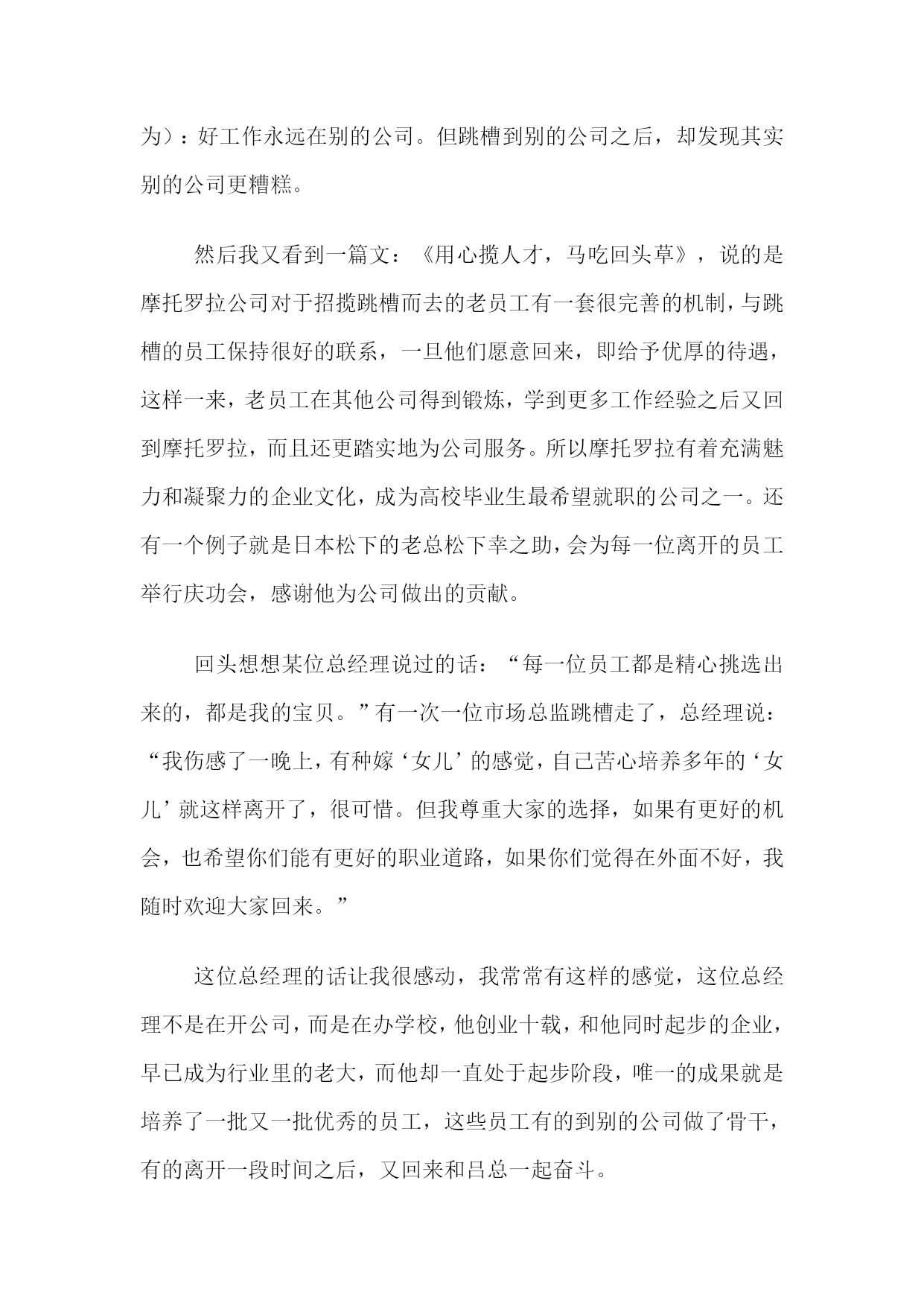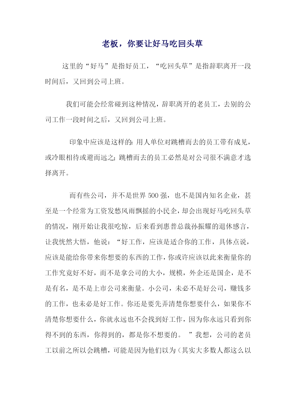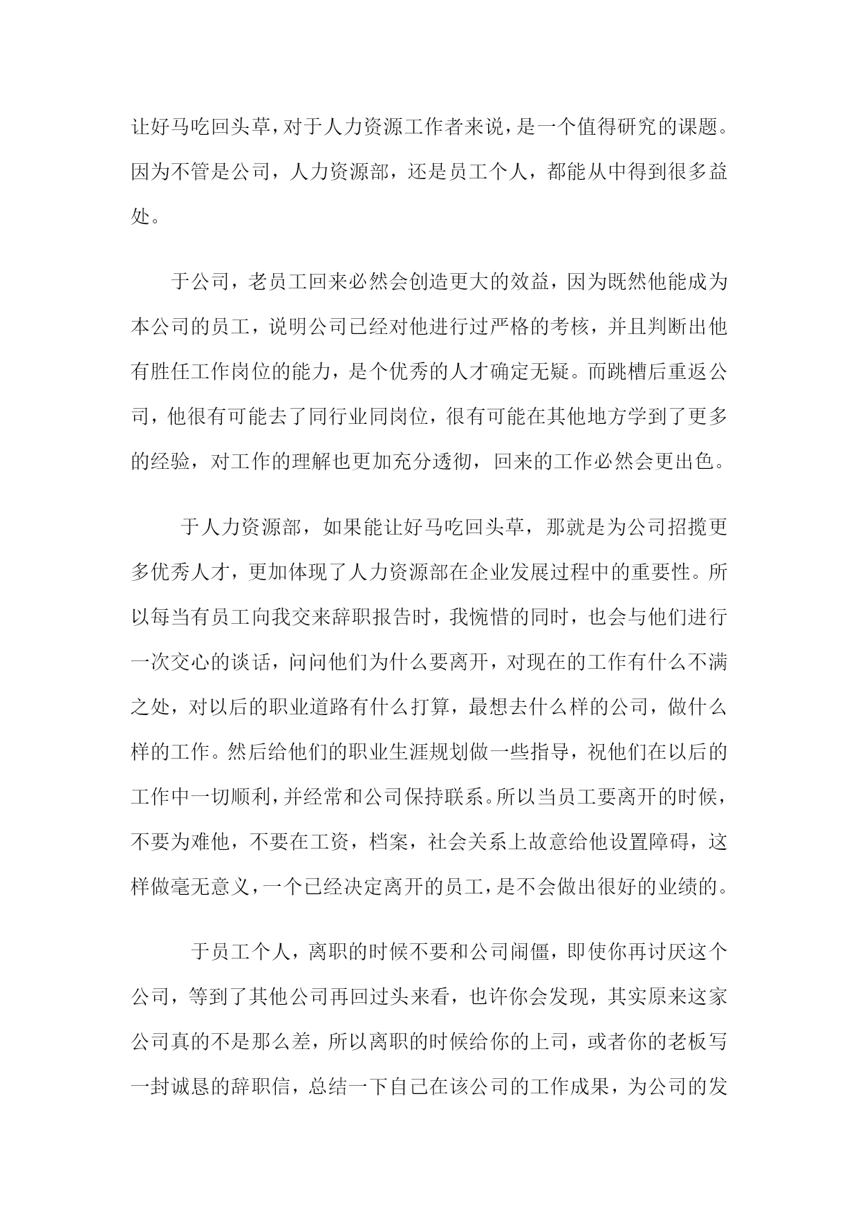 老板,你要让好马吃回头草这里的“好马”是指好员工,“吃回头草”是指辞职离开一段时间后,又回到公司上班。我们可能会经常碰到这种情况,辞职离开的老员工,去别的公司工作一段时间之后,又回到公司上班。印象中应该是这样的:用人单位对跳槽而去的员工带有成见,或冷眼相待或避而远之;跳槽而去的员工必然是对公司很不满意才选择离开。而有些公司,并不是世界500强,也不是国内知名企业,甚至是一个经常为工资发愁风雨飘摇的小民企,却会出现好马吃回头草的情况,刚开始让我很吃惊,后来看到惠普总裁孙振耀的退休感言,让我恍然大悟,他说:“好工作,应该是适合你的工作,具体点说,应该是能给你带来你想要的东西的工作,你或许应该以此来衡量你的工作究竟好不好,而不是拿公司的大小,规模,外企还是国企,是不是有名,是不是上市公司来衡量。小公司,未必不是好公司,赚钱多的工作,也未必是好工作。你还是要先弄清楚你想要什么,如果你不清楚你想要什么,你就永远也不会找到好工作,因为你永远只看到你得不到的东西,你得到的,都是你不想要的。”我想,公司的老员工以前之所以会跳槽,可能是因为他们以为(其实大多数人都这么以为):好工作永远在别的公司。但跳槽到别的公司之后,却发现其实别的公司更糟糕。然后我又看到一篇文:《用心揽人才,马吃回头草》,说的是摩托罗拉公司对于招揽跳槽而去的老员工有一套很完善的机制,与跳槽的员工保持很好的联系,一旦他们愿意回来,即给予优厚的待遇,这样一来,老员工在其他公司得到锻炼,学到更多工作经验之后又回到摩托罗拉,而且还更踏实地为公司服务。所以摩托罗拉有着充满魅力和凝聚力的企业文化,成为高校毕业生最希望就职的公司之一。还有一个例子就是日本松下的老总松下幸之助,会为每一位离开的员工举行庆功会,感谢他为公司做出的贡献。回头想想某位总经理说过的话:“每一位员工都是精心挑选出来的,都是我的宝贝。”有一次一位市场总监跳槽走了,总经理说:“我伤感了一晚上,有种嫁‘女儿’的感觉,自己苦心培养多年的‘女儿’就这样离开了,很可惜。但我尊重大家的选择,如果有更好的机会,也希望你们能有更好的职业道路,如果你们觉得在外面不好,我随时欢迎大家回来。”这位总经理的话让我很感动,我常常有这样的感觉,这位总经理不是在开公司,而是在办学校,他创业十载,和他同时起步的企业,早已成为行业里的老大,而他却一直处于起步阶段,唯一的成果就是培养了一批又一批优秀的员工,这些员工有的到别的公司做了骨干,有的离开一段时间之后,又回来和吕总一起奋斗。让好马吃回头草,对于人力资源工作者来说,是一个值得研究的课题。因为不管是公司,人力资源部,还是员工个人,都能从中得到很多益处。于公司,老员工回来必然会创造更大的效益,因为既然他能成为本公司的员工,说明公司已经对他进行过严格的考核,并且判断出他有胜任工作岗位的能力,是个优秀的人才确定无疑。而跳槽后重返公司,他很有可能去了同行业同岗位,很有可能在其他地方学到了更多的经验,对工作的理解也更加充分透彻,回来的工作必然会更出色。于人力资源部,如果能让好马吃回头草,那就是为公司招揽更多优秀人才,更加体现了人力资源部在企业发展过程中的重要性。所以每当有员工向我交来辞职报告时,我惋惜的同时,也会与他们进行一次交心的谈话,问问他们为什么要离开,对现在的工作有什么不满之处,对以后的职业道路有什么打算,最想去什么样的公司,做什么样的工作。然后给他们的职业生涯规划做一些指导,祝他们在以后的工作中一切顺利,并经常和公司保持联系。所以当员工要离开的时候,不要为难他,不要在工资,档案,社会关系上故意给他设置障碍,这样做毫无意义,一个已经决定离开的员工,是不会做出很好的业绩的。于员工个人,离职的时候不要和公司闹僵,即使你再讨厌这个公司,等到了其他公司再回过头来看,也许你会发现,其实原来这家公司真的不是那么差,所以离职的时候给你的上司,或者你的老板写一封诚恳的辞职信,总结一下自己在该公司的工作成果,为公司的发展提一些建议,然后说明自己为什么要离开,并表示希望以后还有机会一起发展。然后和公司里的每一位同事一一告别,有机会的话,请几位要好的同事一起吃个饭,因为,这些同事拥有你各种联系方式,等公司有更好机会的时候,这几位同事很有可能会马上叫你回来。