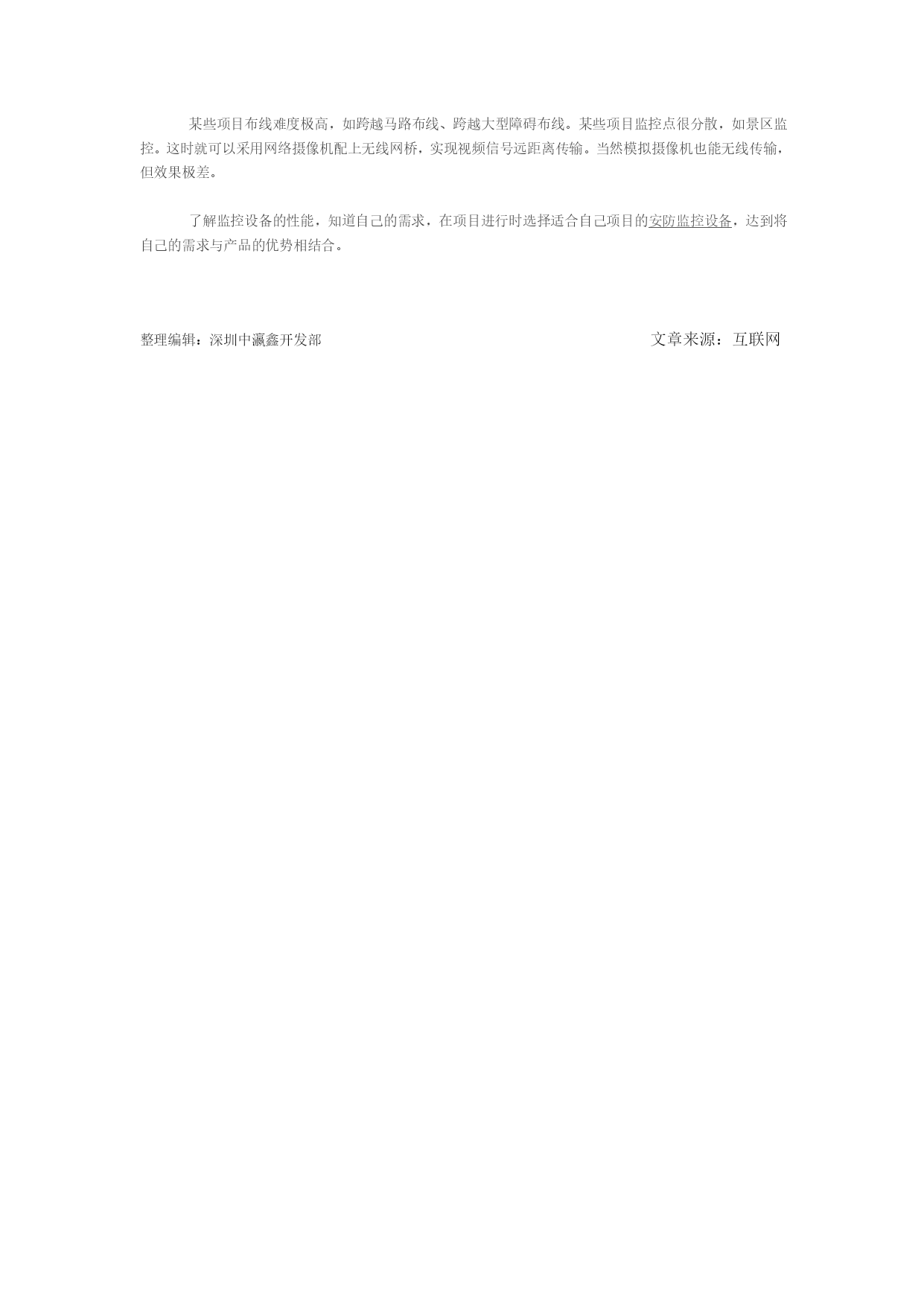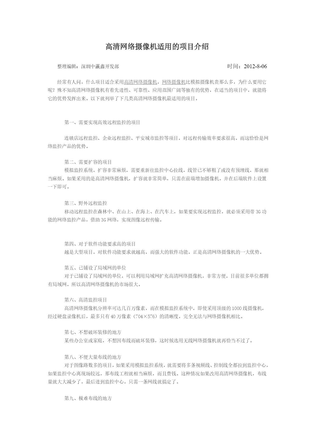 高清网络摄像机适用的项目介绍整理编辑:深圳中瀛鑫开发部时间:2012-8-06经常有人问,什么项目适合采用HYPERLINK"http://www.zyx-pku.com/"高清网络摄像机,HYPERLINK"http://www.zyx-pku.com/"网络摄像机比模拟摄像机贵那么多,为什么要用它呢?殊不知高清网络摄像机有着先进性、可靠性、应用范围广阔等独有的优势,在适当的项目中,就能将它的优势发挥出来。以下就列举了下几类高清网络摄像机最适用的项目。第一、需要实现高效远程监控的项目连锁店远程监控、企业远程监控、平安城市监控等项目,对远程传输效率要求很高,而这恰恰是网络监控产品的优势。第二、需要扩容的项目模拟监控系统,扩容非常麻烦,需要重新往监控中心拉线,线管已不够粗了或没有预埋线,那就相当麻烦。如果采用的是高清网络摄像机,扩容就非常简单,只需在前端增加摄像机,并在后端软件上设置一下即可。第三、野外远程监控移动远程监控在森林中、在山上、在海上、在汽车上,如果要实现远程监控,就必须采用带3G功能的网络监控产品,借助3G网络,实现图像远程传输。第四、对于软件功能要求高的项目越是大型项目,对软件功能要求就越高,而强大的软件功能,正是高清网络摄像机的一大优势。第五、已铺设了局域网的单位对于已铺设了局域网的单位,可以利用局域网扩充高清网络摄像机,非常方便。目前很多单位都拥有局域网,所以高清网络摄像机的市场很大。第六、高清监控项目高清网络摄像机分辨率可达几百万像素,而在模拟监控系统中,即使采用顶级的1000线摄像机,经过硬盘录像机后,最多只有40万像素(704×576)的清晰度,完全无法与网络摄像机相比。第七、不想破坏装修的地方某些办公室或家庭,不想因布线而破坏装修,这时候选用无线网络摄像机就再恰当不过了。第八、不便大量布线的地方对于图像路数多的项目,如果采用模拟监控系统,就需要将多条视频线、控制线全都拉到监控中心,如果监控中心离现场较远,那布线工程就相当麻烦,而且费钱。这种情况如果改用高清网络摄像机,布线量就大大减少了,最后进到监控中心,只需一条网线就搞定了。第九、极难布线的地方某些项目布线难度极高,如跨越马路布线、跨越大型障碍布线。某些项目监控点很分散,如景区监控。这时就可以采用网络摄像机配上无线网桥,实现视频信号远距离传输。当然模拟摄像机也能无线传输,但效果极差。了解监控设备的性能,知道自己的需求,在项目进行时选择适合自己项目的HYPERLINK"http://www.zyx-pku.com/productclass.asp"\o"安防监控设备"安防监控设备,达到将自己的需求与产品的优势相结合。整理编辑:深圳中瀛鑫开发部文章来源:互联网