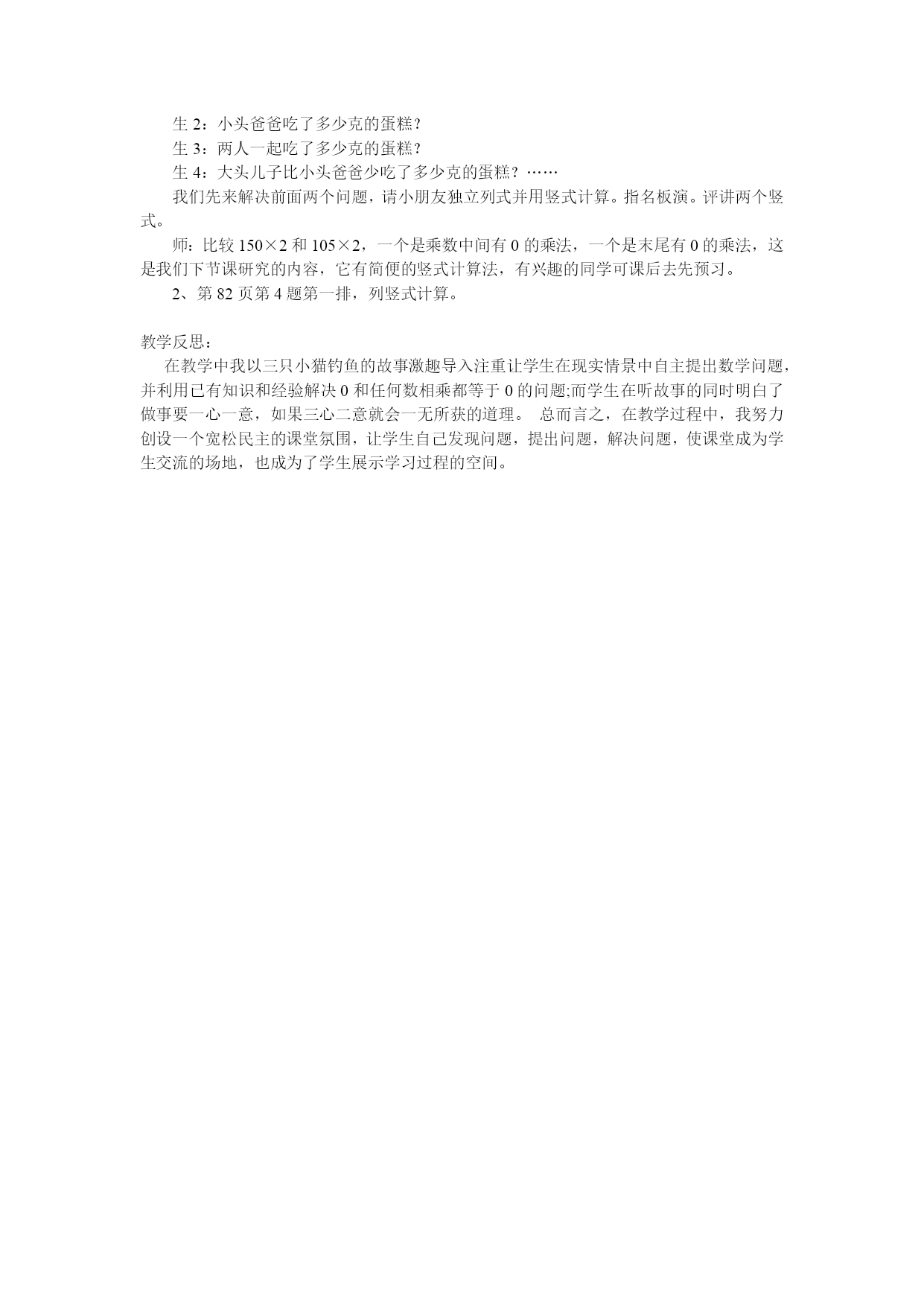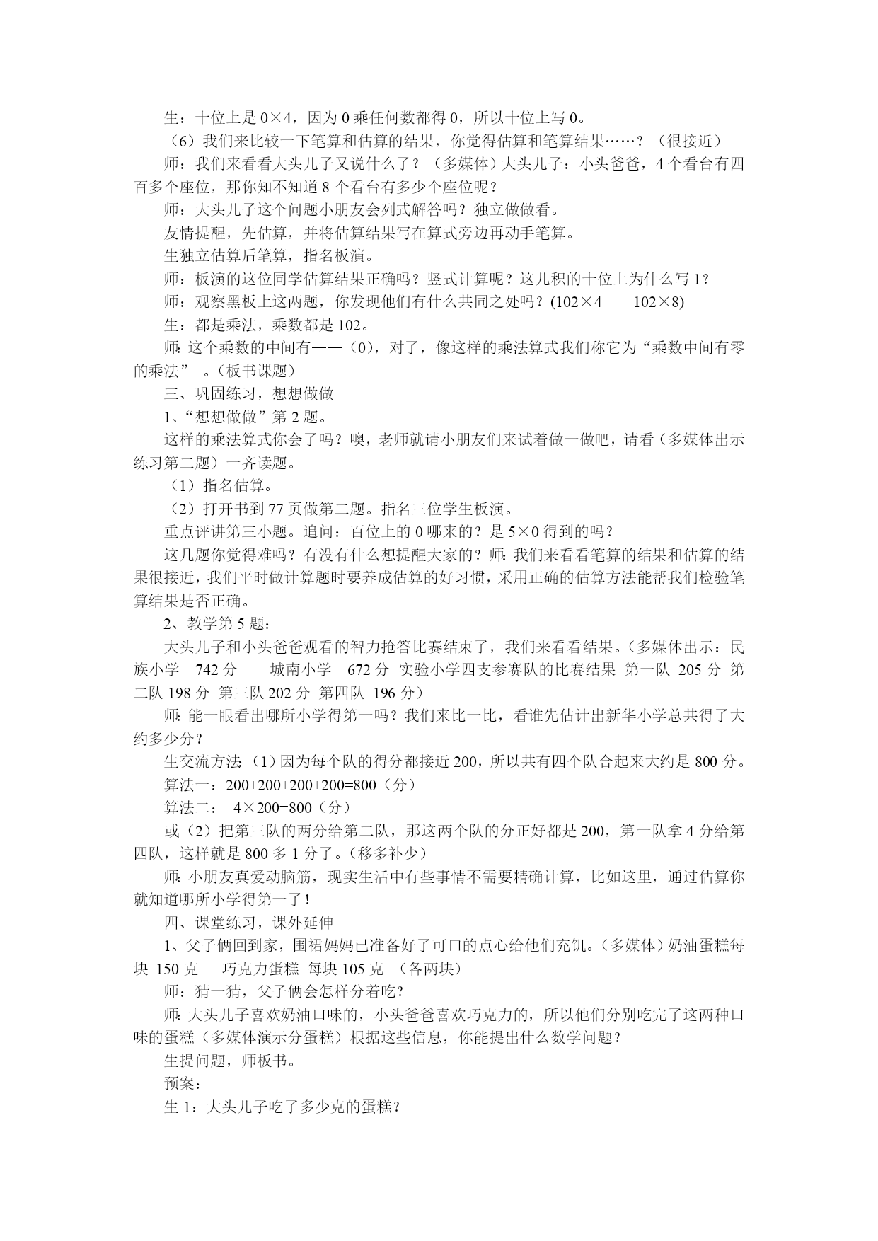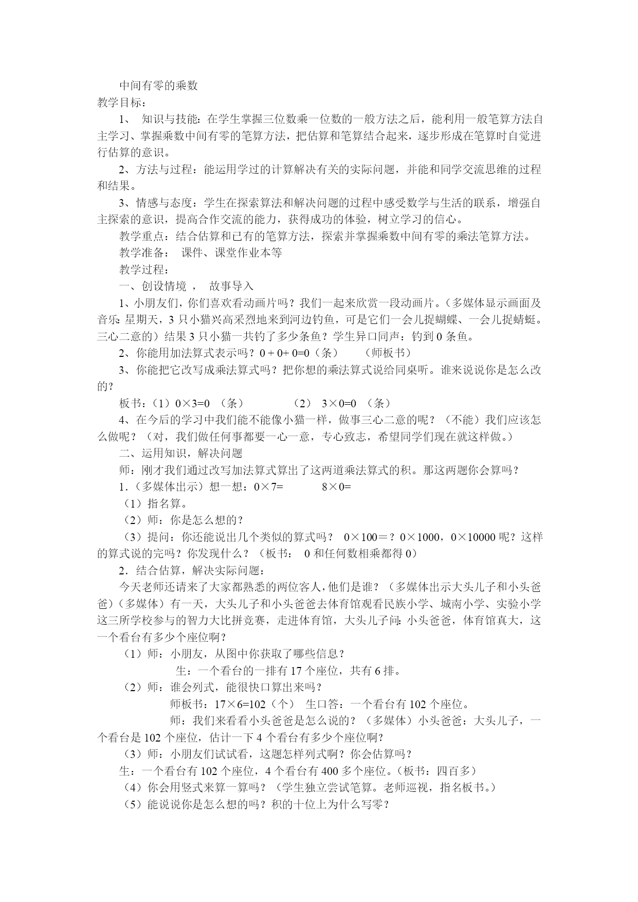 中间有零的乘数教学目标:1、知识与技能:在学生掌握三位数乘一位数的一般方法之后,能利用一般笔算方法自主学习、掌握乘数中间有零的笔算方法,把估算和笔算结合起来,逐步形成在笔算时自觉进行估算的意识。2、方法与过程:能运用学过的计算解决有关的实际问题,并能和同学交流思维的过程和结果。3、情感与态度:学生在探索算法和解决问题的过程中感受数学与生活的联系,增强自主探索的意识,提高合作交流的能力,获得成功的体验,树立学习的信心。教学重点:结合估算和已有的笔算方法,探索并掌握乘数中间有零的乘法笔算方法。教学准备:课件、课堂作业本等教学过程:一、创设情境,故事导入1、小朋友们,你们喜欢看动画片吗?我们一起来欣赏一段动画片。(多媒体显示画面及音乐:星期天,3只小猫兴高采烈地来到河边钓鱼,可是它们一会儿捉蝴蝶、一会儿捉蜻蜓。三心二意的)结果3只小猫一共钓了多少条鱼?学生异口同声:钓到0条鱼。2、你能用加法算式表示吗?0+0+0=0(条)(师板书)3、你能把它改写成乘法算式吗?把你想的乘法算式说给同桌听。谁来说说你是怎么改的?板书:(1)0×3=0(条)(2)3×0=0(条)4、在今后的学习中我们能不能像小猫一样,做事三心二意的呢?(不能)我们应该怎么做呢?(对,我们做任何事都要一心一意,专心致志,希望同学们现在就这样做。)二、运用知识,解决问题师:刚才我们通过改写加法算式算出了这两道乘法算式的积。那这两题你会算吗?1.(多媒体出示)想一想:0×7=8×0=(1)指名算。(2)师:你是怎么想的?(3)提问:你还能说出几个类似的算式吗?0×100=?0×1000,0×10000呢?这样的算式说的完吗?你发现什么?(板书:0和任何数相乘都得0)2.结合估算,解决实际问题:今天老师还请来了大家都熟悉的两位客人,他们是谁?(多媒体出示大头儿子和小头爸爸)(多媒体)有一天,大头儿子和小头爸爸去体育馆观看民族小学、城南小学、实验小学这三所学校参与的智力大比拼竞赛,走进体育馆,大头儿子问:小头爸爸,体育馆真大,这一个看台有多少个座位啊?(1)师:小朋友,从图中你获取了哪些信息?生:一个看台的一排有17个座位,共有6排。(2)师:谁会列式,能很快口算出来吗?师板书:17×6=102(个)生口答:一个看台有102个座位。师:我们来看看小头爸爸是怎么说的?(多媒体)小头爸爸:大头儿子,一个看台是102个座位,估计一下4个看台有多少个座位啊?(3)师:小朋友们试试看,这题怎样列式啊?你会估算吗?生:一个看台有102个座位,4个看台有400多个座位。(板书:四百多)(4)你会用竖式来算一算吗?(学生独立尝试笔算。老师巡视,指名板书。)(5)能说说你是怎么想的吗?积的十位上为什么写零?生:十位上是0×4,因为0乘任何数都得0,所以十位上写0。(6)我们来比较一下笔算和估算的结果,你觉得估算和笔算结果……?(很接近)师:我们来看看大头儿子又说什么了?(多媒体)大头儿子:小头爸爸,4个看台有四百多个座位,那你知不知道8个看台有多少个座位呢?师:大头儿子这个问题小朋友会列式解答吗?独立做做看。友情提醒,先估算,并将估算结果写在算式旁边再动手笔算。生独立估算后笔算,指名板演。师:板演的这位同学估算结果正确吗?竖式计算呢?这儿积的十位上为什么写1?师:观察黑板上这两题,你发现他们有什么共同之处吗?(102×4102×8)生:都是乘法,乘数都是102。师:这个乘数的中间有——(0),对了,像这样的乘法算式我们称它为“乘数中间有零的乘法”。(板书课题)三、巩固练习,想想做做1、“想想做做”第2题。这样的乘法算式你会了吗?噢,老师就请小朋友们来试着做一做吧,请看(多媒体出示练习第二题)一齐读题。(1)指名估算。(2)打开书到77页做第二题。指名三位学生板演。重点评讲第三小题。追问:百位上的0哪来的?是5×0得到的吗?这几题你觉得难吗?有没有什么想提醒大家的?师:我们来看看笔算的结果和估算的结果很接近,我们平时做计算题时要养成估算的好习惯,采用正确的估算方法能帮我们检验笔算结果是否正确。2、教学第5题:大头儿子和小头爸爸观看的智力抢答比赛结束了,我们来看看结果。(多媒体出示:民族小学742分城南小学672分实验小学四支参赛队的比赛结果第一队205分第二队198分第三队202分第四队196分)师:能一眼看出哪所小学得第一吗?我们来比一比,看谁先估计出新华小学总共得了大约多少分?生交流方法:(1)因为每个队的得分都接近200,所以共有四个队合起来大约是800分。算法一:200+200+200+200=800(分)算法二:4×200=800(分)或(2)把第三队的两分给第二队,那这两个队的分正好都是200,第一队拿4分给第四队,这样就是800多1分了。(移多补少)师:小朋友真爱动脑筋,现实生活中有