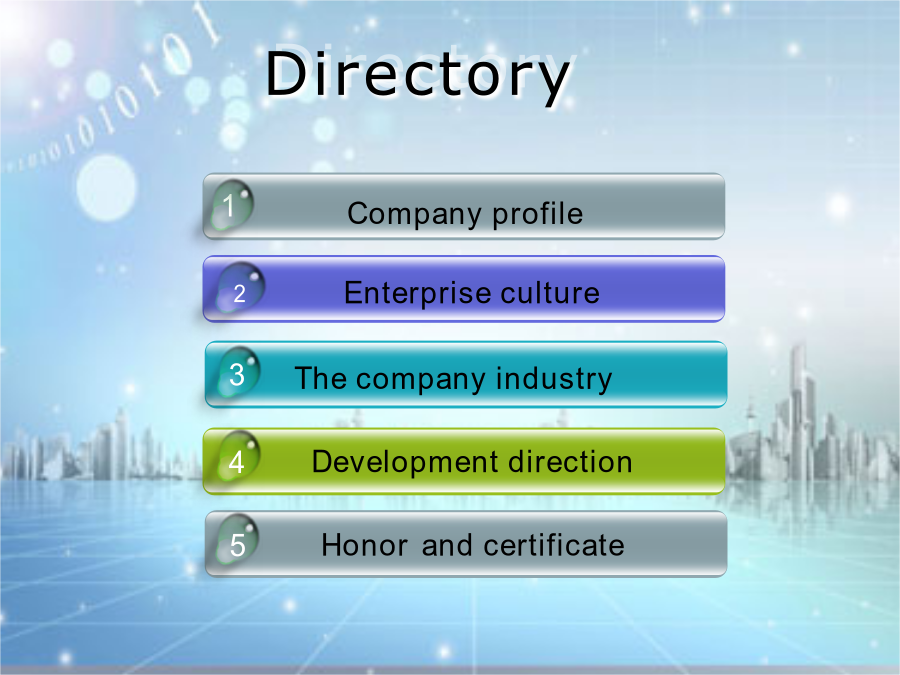DirectoryCompanyprofileThecompany'shistoryEnterprisecultureThecompanyindustryDevelopmentdirectionHonorandcertificateTHANKYOU!