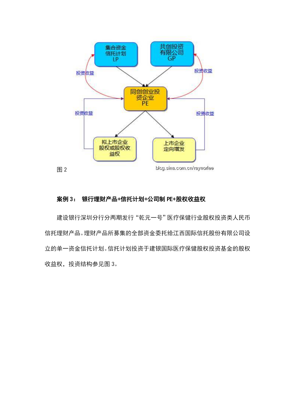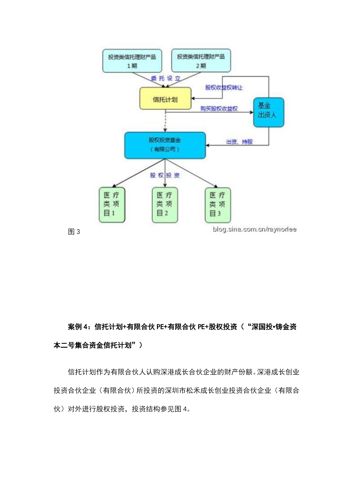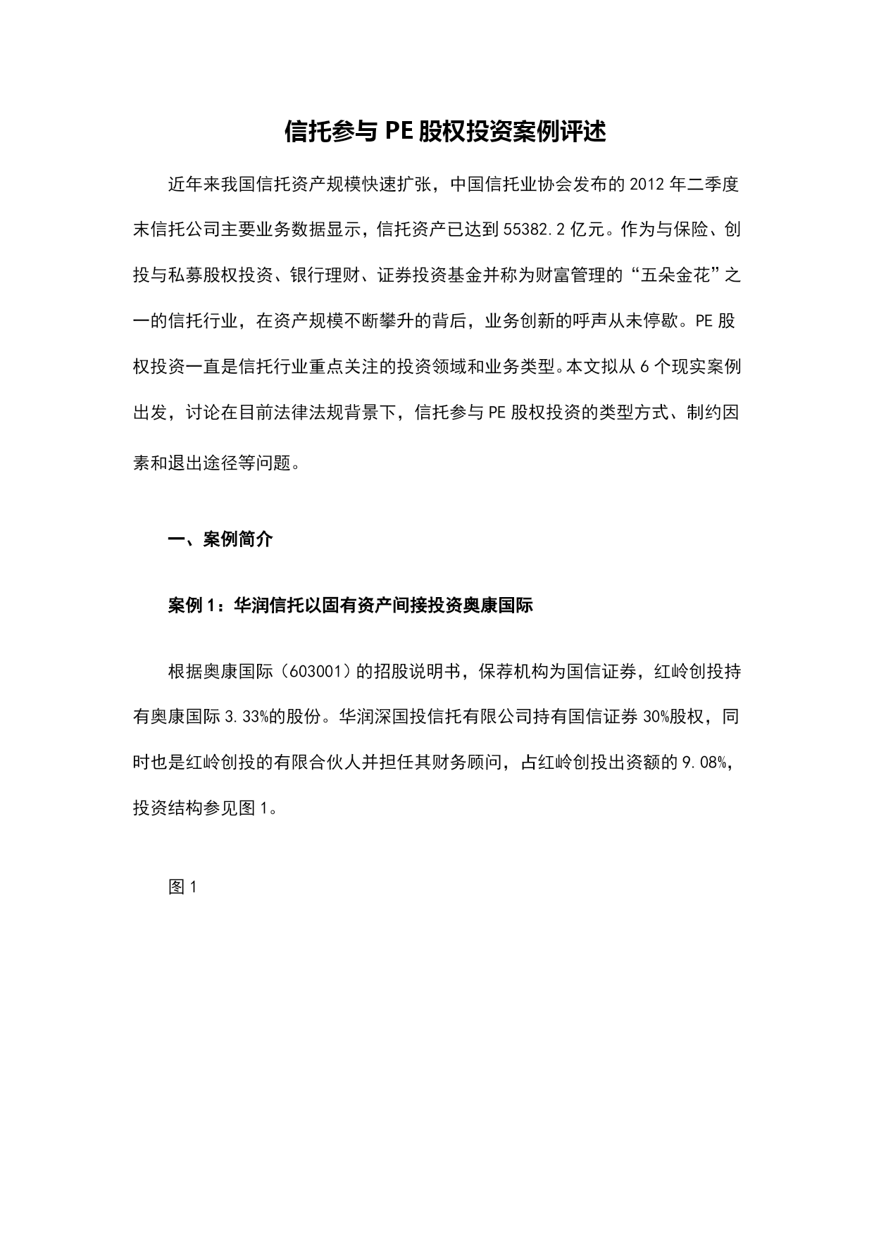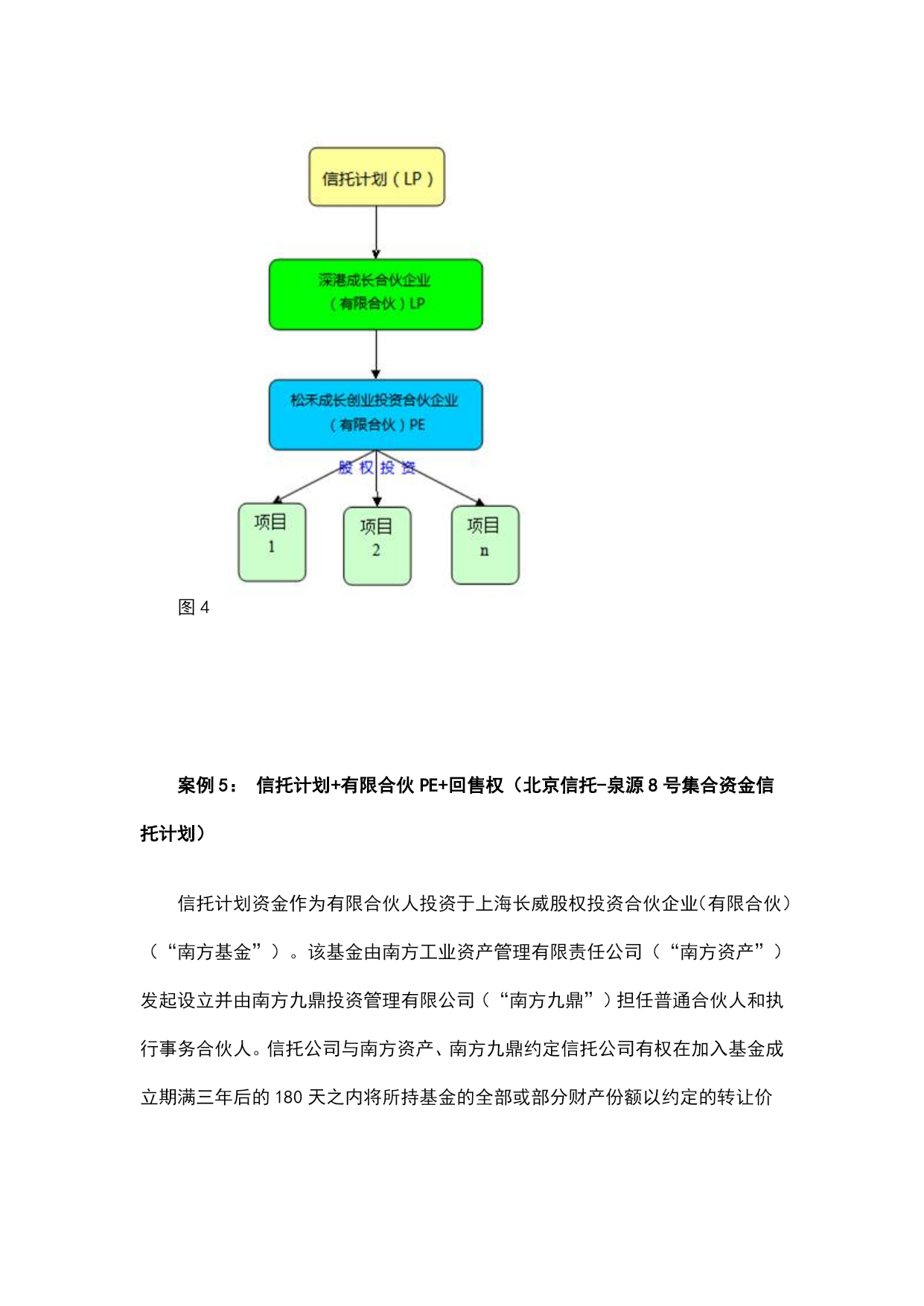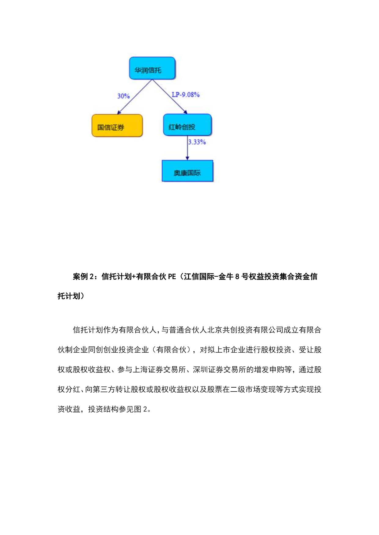 信托参与PE股权投资案例评述近年来我国信托资产规模快速扩张,中国信托业协会发布的2012年二季度末信托公司主要业务数据显示,信托资产已达到55382.2亿元。作为与保险、创投与私募股权投资、银行理财、证券投资基金并称为财富管理的“五朵金花”之一的信托行业,在资产规模不断攀升的背后,业务创新的呼声从未停歇。PE股权投资一直是信托行业重点关注的投资领域和业务类型。本文拟从6个现实案例出发,讨论在目前法律法规背景下,信托参与PE股权投资的类型方式、制约因素和退出途径等问题。一、案例简介案例1:华润信托以固有资产间接投资奥康国际根据奥康国际(603001)的招股说明书,保荐机构为国信证券,红岭创投持有奥康国际3.33%的股份。华润深国投信托有限公司持有国信证券30%股权,同时也是红岭创投的有限合伙人并担任其财务顾问,占红岭创投出资额的9.08%,投资结构参见图1。图1案例2:信托计划+有限合伙PE(江信国际-金牛8号权益投资集合资金信托计划)信托计划作为有限合伙人,与普通合伙人北京共创投资有限公司成立有限合伙制企业同创创业投资企业(有限合伙),对拟上市企业进行股权投资、受让股权或股权收益权、参与上海证券交易所、深圳证券交易所的增发申购等,通过股权分红、向第三方转让股权或股权收益权以及股票在二级市场变现等方式实现投资收益,投资结构参见图2。图2案例3:银行理财产品+信托计划+公司制PE+股权收益权建设银行深圳分行分两期发行“乾元一号”医疗保健行业股权投资类人民币信托理财产品。理财产品所募集的全部资金委托给江西国际信托股份有限公司设立的单一资金信托计划。信托计划投资于建银国际医疗保健股权投资基金的股权收益权,投资结构参见图3。图3案例4:信托计划+有限合伙PE+有限合伙PE+股权投资(“深国投•铸金资本二号集合资金信托计划”)信托计划作为有限合伙人认购深港成长合伙企业的财产份额。深港成长创业投资合伙企业(有限合伙)所投资的深圳市松禾成长创业投资合伙企业(有限合伙)对外进行股权投资,投资结构参见图4。图4案例5:信托计划+有限合伙PE+回售权(北京信托-泉源8号集合资金信托计划)信托计划资金作为有限合伙人投资于上海长威股权投资合伙企业(有限合伙)(“南方基金”)。该基金由南方工业资产管理有限责任公司(“南方资产”)发起设立并由南方九鼎投资管理有限公司(“南方九鼎”)担任普通合伙人和执行事务合伙人。信托公司与南方资产、南方九鼎约定信托公司有权在加入基金成立期满三年后的180天之内将所持基金的全部或部分财产份额以约定的转让价格转让给南方资产。信托公司有权视南方基金投资运作等情况自行决定是否行使上述回售权,投资结构参见图5。图5案例6:信托公司PE征募+投资顾问厦门信托作为有限合伙企业投资顾问,向投资人征募有限合伙企业的有限合伙人。拟成立的厦门佳瑞德投资合伙企业(有限合伙)、厦门御汇鑫投资合伙企业(有限合伙)拟受让云南天素投资有限公司(“云南天素”)持有的曲靖众一精细化工股份有限公司2,400万股股份(众一股份15.4739%的股权)。厦门信托全权代表全体有限合伙人处理合伙企业相关事务。有限合伙企业投资存续期间及期限届满后,由云南天素按约定条件受让有限合伙人的合伙份额,实现有限合伙人的退出及获取相应收益。如云南天素到期不能按时给付投资人的投资本金和投资收益,则由厦门信托处理云南天素持有的第三方公司的股权,用于偿付投资人的投资本金和收益,投资结构参见图6。图6二、案例评述(一)信托参与PE股权投资的主要方式和类型信托参与PE股权投资,从资金来源上看,可以分为固有资产投资及信托资金投资两大类,其中的信托资金投资方式又可分为单一资金信托和集合资金信托两种;从投资方式上看,可以分为直接持有企业股权的直接投资、间接持有企业股权的间接投资以及以其他方式进行PE股权投资或“类股权投资”。信托参与PE股权投资的主要方式和类型参见《表1-信托参与PE股权投资方式一览表》。表1-信托参与PE股权投资方式一览表类型资金来源参与方式退出方式一固有资产直接投资直接持有投资对象的股权或出资份额IPO退出、定向增发、回购、协议转让、产权交易所挂牌转让、固有资产受让信托收益权等间接投资①以固有资产参与私人股权投资信托②以固有资产通过创投机构或PE机构进行股权投资二信托财产(单一、集合信托计划)直接投资信托计划直接持有拟上市企业股权间接投资①信托PE②投资于持有拟上市公司的股权的创投机构的出资份额③投资拟上市公司的股权收益权④投资拟上市公司的股东的股权收益权三其他资金①信托公司不出资,亦不设立信托计划,仅担任项目投资顾问②其他方式类型一——固有资产从事股权投资业务根据银监会发布的《关于支持信托公司创新发展有关问题的通知》(银监发[2009]25号,以下称为“《通知》”),固有资产