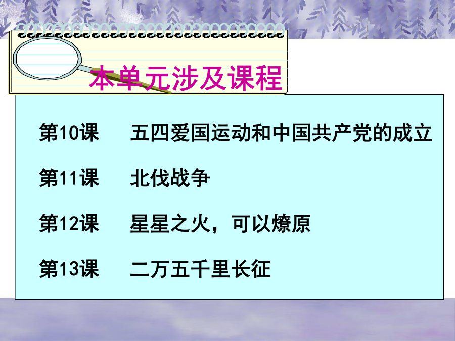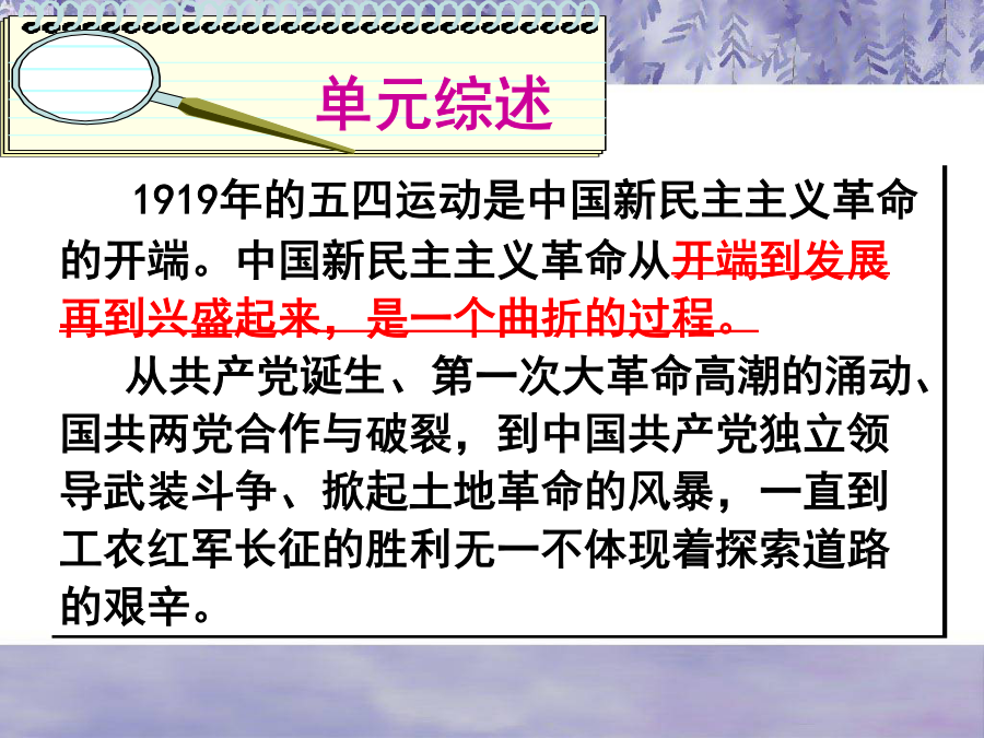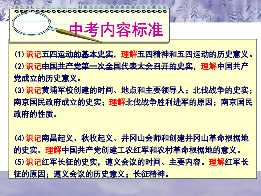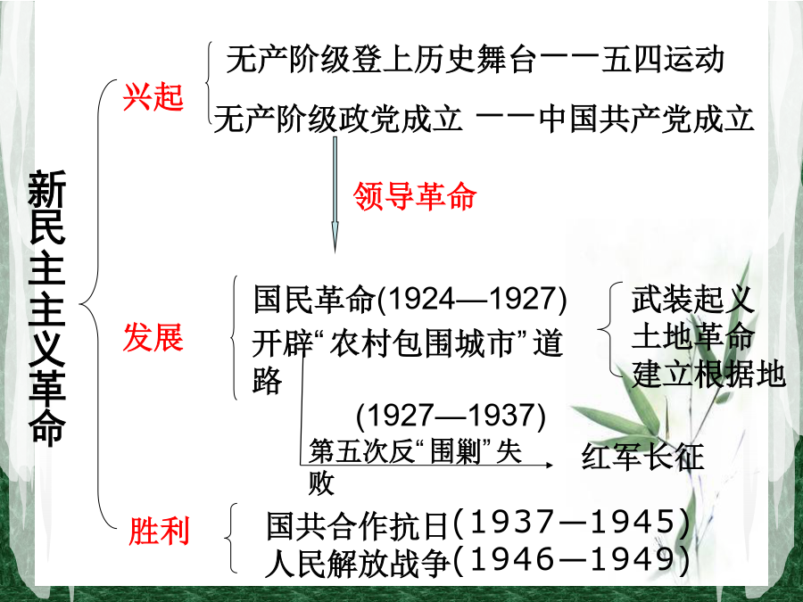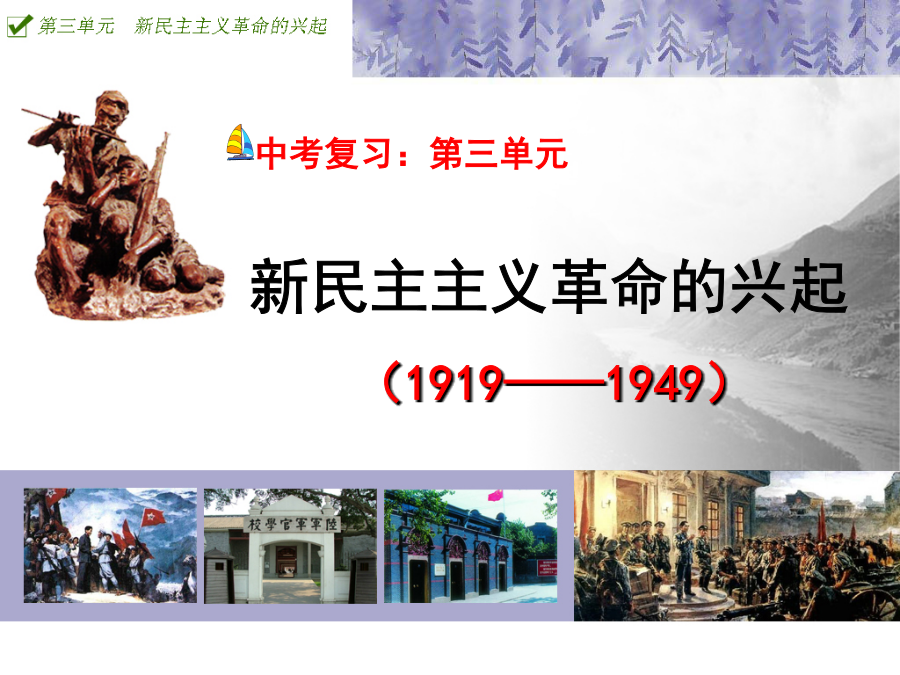 中考复习:第三单元武装起义土地革命建立根据地本单元涉及课程单元综述中考内容标准基础知识回顾知识结构在中国近代史中,我们是如何从走“别人的路”到走“自己的路”?中共在民主革命时期的革命道路时什么?为什么要走这条路?为什么能走出这条路?这条道路时如何探索出来的?单元感悟只有把马克思主义的普遍理论同中国的具体实践相结合,走符合中国国情的道路,才能取得革命和建设的胜利;五四运动中共一大召开第11课北伐战争(国民革命时期)一、黄埔军校的建立方针:p51吴佩孚→孙传芳→张作霖北伐胜利进军的原因三、南京国民政府的建立(革命失败)课堂小结1.担任黄埔军校党代表的是()A、周恩来B、蒋介石C、恽代英D、廖仲恺2.广州国民政府正式出师北伐是在()A、1926年5月B、1926年7月C、1927年5月D、1927年7月3.北伐战争中任北伐军总司令的是()A.蒋介石B、叶挺C.冯玉祥D.廖仲恺4.标志南京政府形式上统一了南北的事件是()A.宁汉合流B.蒋介石建立南京政府C.东北易帜D.北伐部队占领北京星火燎原二万五千里长征单元大练兵2.中国共产党的成立是中国历史上开天辟地的大事,能说明这一点的史实不包括()A.五四运动的初步胜利B.国民大革命运动的兴起C.新中国的成立D.社会主义制度的建立3.下列对中国共产党的认识,正确的()①1921年成立②1921年创建自己的军队③其成立是中国历史上开天辟地的大事④以马克思主义、毛泽东思想、邓小平理论和三个代表为行动指南A.①②③B.①②④C.①②③④D.①③④4.新旧民主主义革命最根本的区别在于()A.革命的性质不同B.革命的任务不同C.革命的指导思想不同D.革命的领导阶级不同5、某校历史兴趣小组计划利用暑假重走长征路,实地考察红军的革命足迹。他们应选择的正确路线是()A、瑞金—赤水河—遵义—泸定桥—会宁B、瑞金—遵义—赤水河—泸定桥—会宁C、遵义—瑞金—泸定桥—赤水河—会宁D、会宁—遵义—赤水河——瑞金—泸定桥7.2006年是红军长征胜利70周年.中国工农红军以血肉之躯谱写了人类历史上无与伦比的英雄史诗。对长征的正确评价是()A.是红军主动进行的战略转移B.其过程体现了红军的革命英雄主义精神C.长征的胜利成为中华民族由衰败到重新振兴的转折点D.是共产党探索农村包围城市、武装夺取政权这一正确革命道路的开始8.红军被迫长征取得胜利,这说明()①中国共产党开始独立领导武装斗争②中国革命重心从城市转移到农村③中国革命道路艰难曲折④中国革命需要正确的路线方针政策A.①②B.②④C.③④D.①③9.史实辨析题某校八年级(1)班的同学围绕《新民主主义革命兴起》这个主题,搜集和整理了一些素材,其中有与史实不符之处。请你逐一列出,并加以改正。A:1919年5月4日,北京大学等学校的学生三千多人,在天安门前集会讲演,随后举行游行示威。国民党政府进行镇压,逮捕学生三十多人。孙中山、李大钊在北京领导学生斗争,积极营救被捕学生。五四运动是一次彻底的反对帝国主义和殖民主义的爱国运动,是中国旧民主主义革命的开端。错误:改正:错误:改正:错误:改正:错误:改正:B:1928年8月1日,在中国共产党领导下,周恩来、贺龙、叶挺等,率革命军举行武昌起义。这年秋天,邓小平领导了秋收起义。这些起义,是中共独立领导武装斗争的开始。它为中国革命从城市转入农村,创建人民军队、建立革命根据地揭开了序幕。错误:改正:错误:改正:错误:改正:10.学科实践.《2004--20l0年全国红色旅游规划纲要》中指出,在今后5年内,我国将在全国范围内重点建设12个大型红色旅游区、30条精品线路和100多个经典景区。井冈山、遵义等被国务院定为红色旅游景区,请你以这些景区导游的身份,用简练的语言介绍中国共产党历史上发生在这些景区的重大革命事件及其深远的历史意义。参考答案(1)井冈山:毛泽东在此创建了第一个农村革命根据地,中国共产党开始探索以农村包围城市、武装夺取政权的革命道路。(2)遵义:遵义会议在此召开,结束了王明“左倾”错误在党中央的领导。确立了以毛泽东为核心的党中央的正确领导。是中国共产党历史上生死牧关的转折点。(此题为开放型试题,学生只要答出与上述两个红色旅游景区相关的革命事件和意义即可)什么是新民主主义革命?它和旧民主主义革命有什么区别,你知道吗?名称中国共产党成立的历史意义总理孙中山1.(2009·长春中考)“帝国主义弄强权,北洋政府行妥协,北京学生齐罢课,上海工人怒罢工”。这段歌谣描述的是()A.戊戌变法B.辛亥革命C.新文化运动D.五四运动【解析】选D。本题考查学生的知识迁移能力。由“学生罢课”“工人罢工”“北京”“上海”可判断是五四爱国运动。2.(2010·东莞学业考试)1919年6月5日,一个日资纱厂的工人,突破租界巡捕的武装包围,举行罢工,声援学生运动