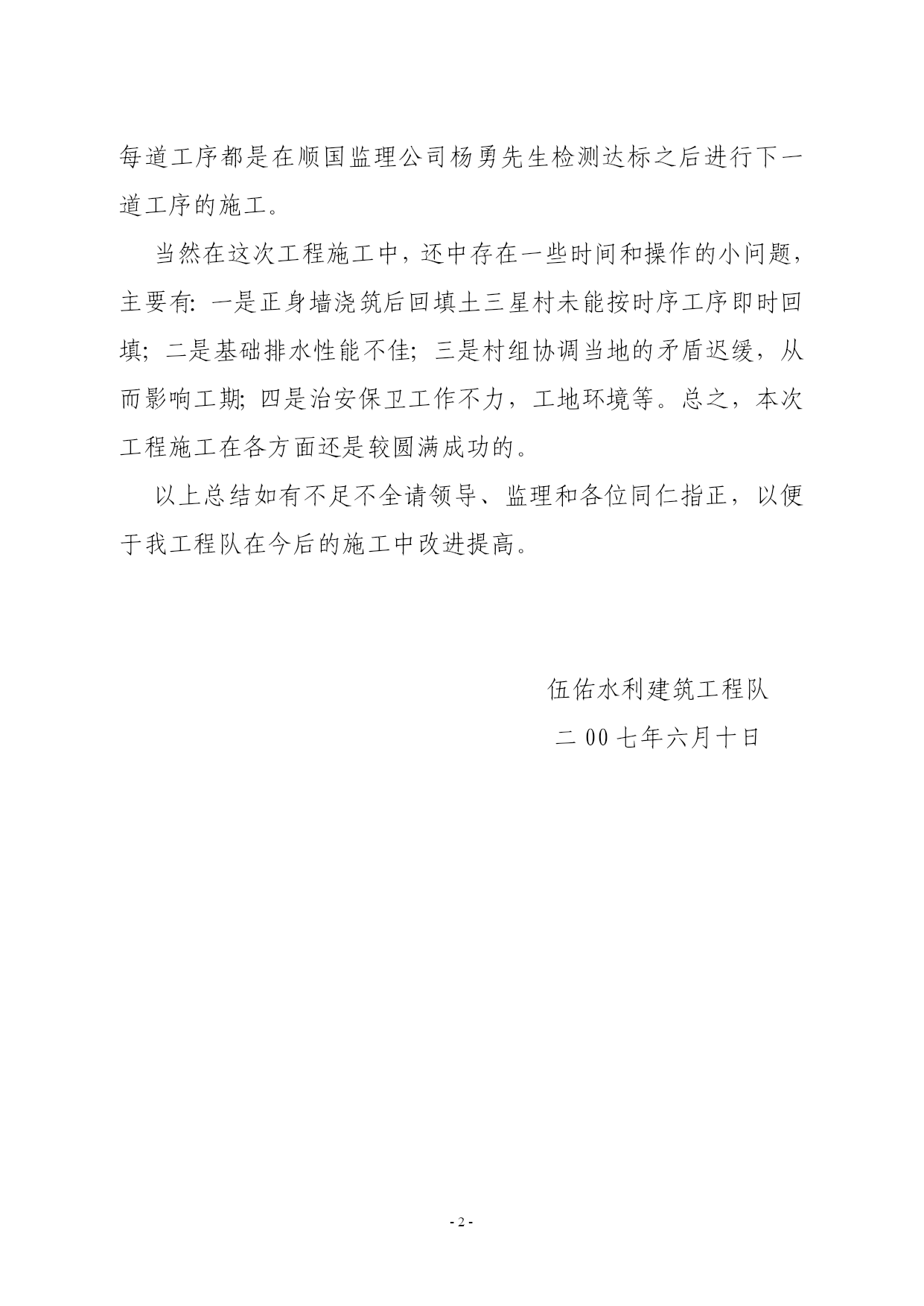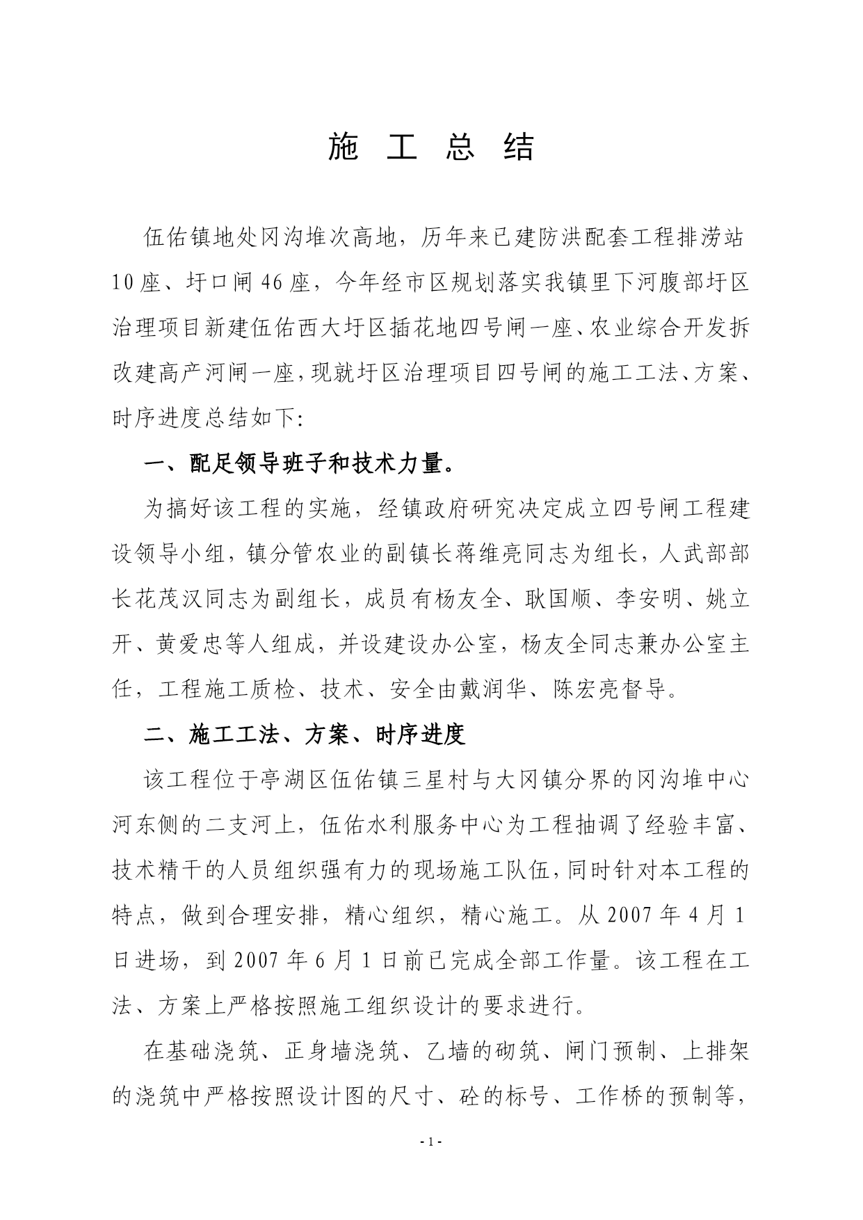 PAGE-2-施工总结伍佑镇地处冈沟堆次高地,历年来已建防洪配套工程排涝站10座、圩口闸46座,今年经市区规划落实我镇里下河腹部圩区治理项目新建伍佑西大圩区插花地四号闸一座、农业综合开发拆改建高产河闸一座,现就圩区治理项目四号闸的施工工法、方案、时序进度总结如下:一、配足领导班子和技术力量。为搞好该工程的实施,经镇政府研究决定成立四号闸工程建设领导小组,镇分管农业的副镇长蒋维亮同志为组长,人武部部长花茂汉同志为副组长,成员有杨友全、耿国顺、李安明、姚立开、黄爱忠等人组成,并设建设办公室,杨友全同志兼办公室主任,工程施工质检、技术、安全由戴润华、陈宏亮督导。二、施工工法、方案、时序进度该工程位于亭湖区伍佑镇三星村与大冈镇分界的冈沟堆中心河东侧的二支河上,伍佑水利服务中心为工程抽调了经验丰富、技术精干的人员组织强有力的现场施工队伍,同时针对本工程的特点,做到合理安排,精心组织,精心施工。从2007年4月1日进场,到2007年6月1日前已完成全部工作量。该工程在工法、方案上严格按照施工组织设计的要求进行。在基础浇筑、正身墙浇筑、乙墙的砌筑、闸门预制、上排架的浇筑中严格按照设计图的尺寸、砼的标号、工作桥的预制等,每道工序都是在顺国监理公司杨勇先生检测达标之后进行下一道工序的施工。当然在这次工程施工中,还中存在一些时间和操作的小问题,主要有:一是正身墙浇筑后回填土三星村未能按时序工序即时回填;二是基础排水性能不佳;三是村组协调当地的矛盾迟缓,从而影响工期;四是治安保卫工作不力,工地环境等。总之,本次工程施工在各方面还是较圆满成功的。以上总结如有不足不全请领导、监理和各位同仁指正,以便于我工程队在今后的施工中改进提高。伍佑水利建筑工程队二00七年六月十日