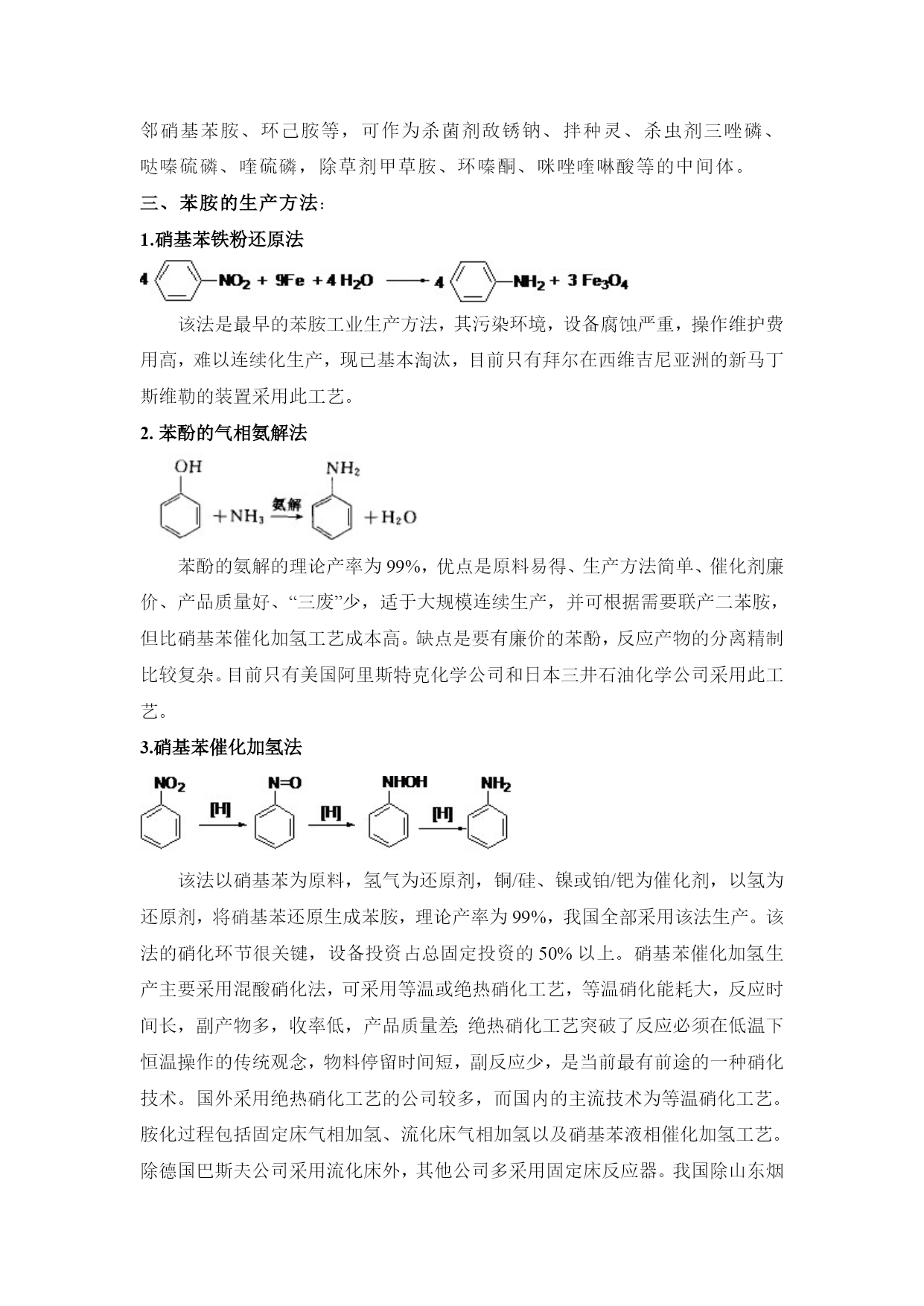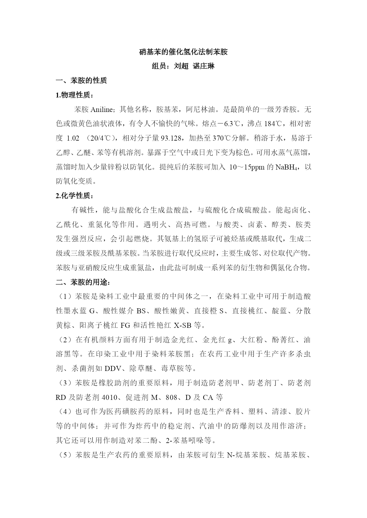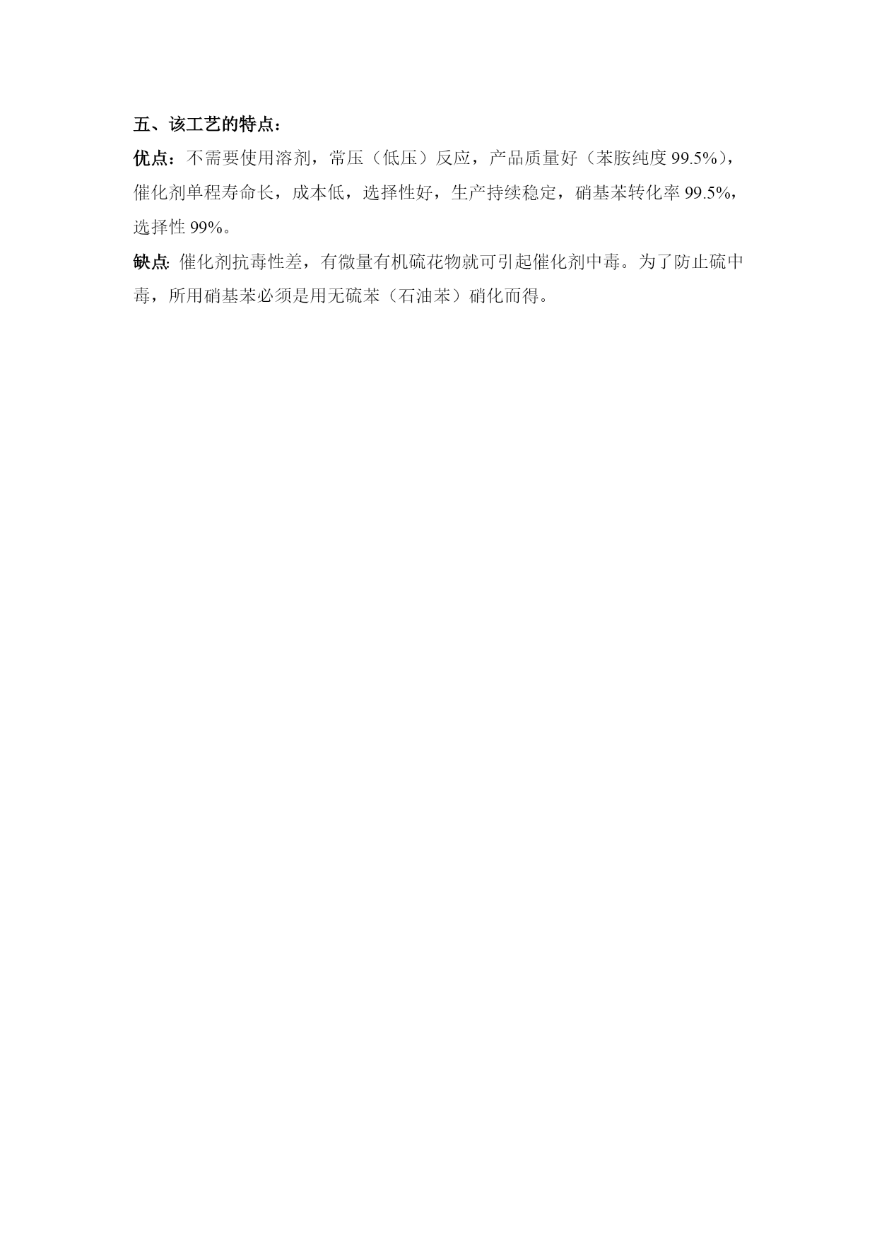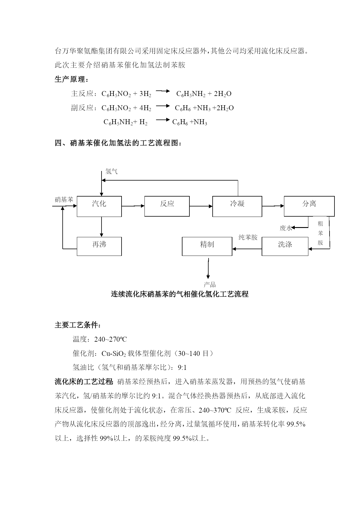 硝基苯的催化氢化法制苯胺组员:刘超谌庄琳一、苯胺的性质1.物理性质:苯胺Aniline;其他名称,胺基苯,阿尼林油。是最简单的一级芳香胺。无色或微黄色油状液体,有令人不愉快的气味。熔点-6.3℃,沸点184℃,相对密度1.02(20/4℃),相对分子量93.128,加热至370℃分解。稍溶于水,易溶于乙醇、乙醚、苯等有机溶剂。暴露于空气中或日光下变为棕色。可用水蒸气蒸馏,蒸馏时加入少量锌粉以防氧化。提纯后的苯胺可加入10~15ppm的NaBH4,以防氧化变质。2.化学性质:有碱性,能与盐酸化合生成盐酸盐,与硫酸化合成硫酸盐。能起卤化、乙酰化、重氮化等作用。遇明火、高热可燃。与酸类、卤素、醇类、胺类发生强烈反应,会引起燃烧。其氨基上的氢原子可被烃基或酰基取代,生成二级或三级苯胺及酰基苯胺。当苯胺进行取代反应时,主要生成邻、对位取代产物。苯胺与亚硝酸反应生成重氮盐,由此盐可制成一系列苯的衍生物和偶氮化合物。二、苯胺的用途:(1)苯胺是染料工业中最重要的中间体之一,在染料工业中可用于制造酸性墨水蓝G、酸性媒介BS、酸性嫩黄、直接橙S、直接桃红、靛蓝、分散黄棕、阳离子桃红FG和活性艳红X-SB等。(2)在有机颜料方面有用于制造金光红、金光红g、大红粉、酚菁红、油溶黑等。在印染工业中用于染料苯胺黑;在农药工业中用于生产许多杀虫剂、杀菌剂如DDV、除草醚、毒草胺等。(3)苯胺是橡胶助剂的重要原料,用于制造防老剂甲、防老剂丁、防老剂RD及防老剂4010、促进剂M、808、D及CA等(4)也可作为医药磺胺药的原料,同时也是生产香料、塑料、清漆、胶片等的中间体;并可作为炸药中的稳定剂、汽油中的防爆剂以及用作溶济;其它还可以用作制造对苯二酚、2-苯基吲哚等。(5)苯胺是生产农药的重要原料,由苯胺可衍生N-烷基苯胺、烷基苯胺、邻硝基苯胺、环己胺等,可作为杀菌剂敌锈钠、拌种灵、杀虫剂三唑磷、哒嗪硫磷、喹硫磷,除草剂甲草胺、环嗪酮、咪唑喹啉酸等的中间体。三、苯胺的生产方法:1.硝基苯铁粉还原法该法是最早的苯胺工业生产方法,其污染环境,设备腐蚀严重,操作维护费用高,难以连续化生产,现已基本淘汰,目前只有拜尔在西维吉尼亚洲的新马丁斯维勒的装置采用此工艺。2.苯酚的气相氨解法苯酚的氨解的理论产率为99%,优点是原料易得、生产方法简单、催化剂廉价、产品质量好、“三废”少,适于大规模连续生产,并可根据需要联产二苯胺,但比硝基苯催化加氢工艺成本高。缺点是要有廉价的苯酚,反应产物的分离精制比较复杂。目前只有美国阿里斯特克化学公司和日本三井石油化学公司采用此工艺。3.硝基苯催化加氢法该法以硝基苯为原料,氢气为还原剂,铜/硅、镍或铂/钯为催化剂,以氢为还原剂,将硝基苯还原生成苯胺,理论产率为99%,我国全部采用该法生产。该法的硝化环节很关键,设备投资占总固定投资的50%以上。硝基苯催化加氢生产主要采用混酸硝化法,可采用等温或绝热硝化工艺,等温硝化能耗大,反应时间长,副产物多,收率低,产品质量差;绝热硝化工艺突破了反应必须在低温下恒温操作的传统观念,物料停留时间短,副反应少,是当前最有前途的一种硝化技术。国外采用绝热硝化工艺的公司较多,而国内的主流技术为等温硝化工艺。胺化过程包括固定床气相加氢、流化床气相加氢以及硝基苯液相催化加氢工艺。除德国巴斯夫公司采用流化床外,其他公司多采用固定床反应器。我国除山东烟台万华聚氨酯集团有限公司采用固定床反应器外,其他公司均采用流化床反应器。此次主要介绍硝基苯催化加氢法制苯胺生产原理:主反应:C6H5NO2+3H2C6H5NH2+2H2O副反应:C6H5NO2+4H2C6H6+NH3+2H2OC6H5NH2+H2C6H6+NH3四、硝基苯催化加氢法的工艺流程图:氢气分离精制洗涤冷凝反应汽化硝基苯粗苯胺废水再沸纯苯胺产品连续流化床硝基苯的气相催化氢化工艺流程主要工艺条件:温度:240~270ºC催化剂:Cu-SiO2载体型催化剂(30~140目)氢油比(氢气和硝基苯摩尔比):9:1流化床的工艺过程:硝基苯经预热后,进入硝基苯蒸发器,用预热的氢气使硝基苯汽化,氢/硝基苯的摩尔比约9:1。混合气体经换热器预热后,从底部进入流化床反应器,使催化剂处于流化状态,在常压、240~370ºC反应,生成苯胺,反应产物从流化床反应器的顶部逸出,经分离,过量氢循环使用,硝基苯转化率99.5%以上,选择性99%以上,的苯胺纯度99.5%以上。五、该工艺的特点:优点:不需要使用溶剂,常压(低压)反应,产品质量好(苯胺纯度99.5%),催化剂单程寿命长,成本低,选择性好,生产持续稳定,硝基苯转化率99.5%,选择性99%。缺点:催化剂抗毒性差,有微量有机硫花物就可引起催化剂中毒。为了防止硫中毒,所用硝基苯必须是用无硫苯(石油苯)硝化而得。化工工艺学专业:09级化学