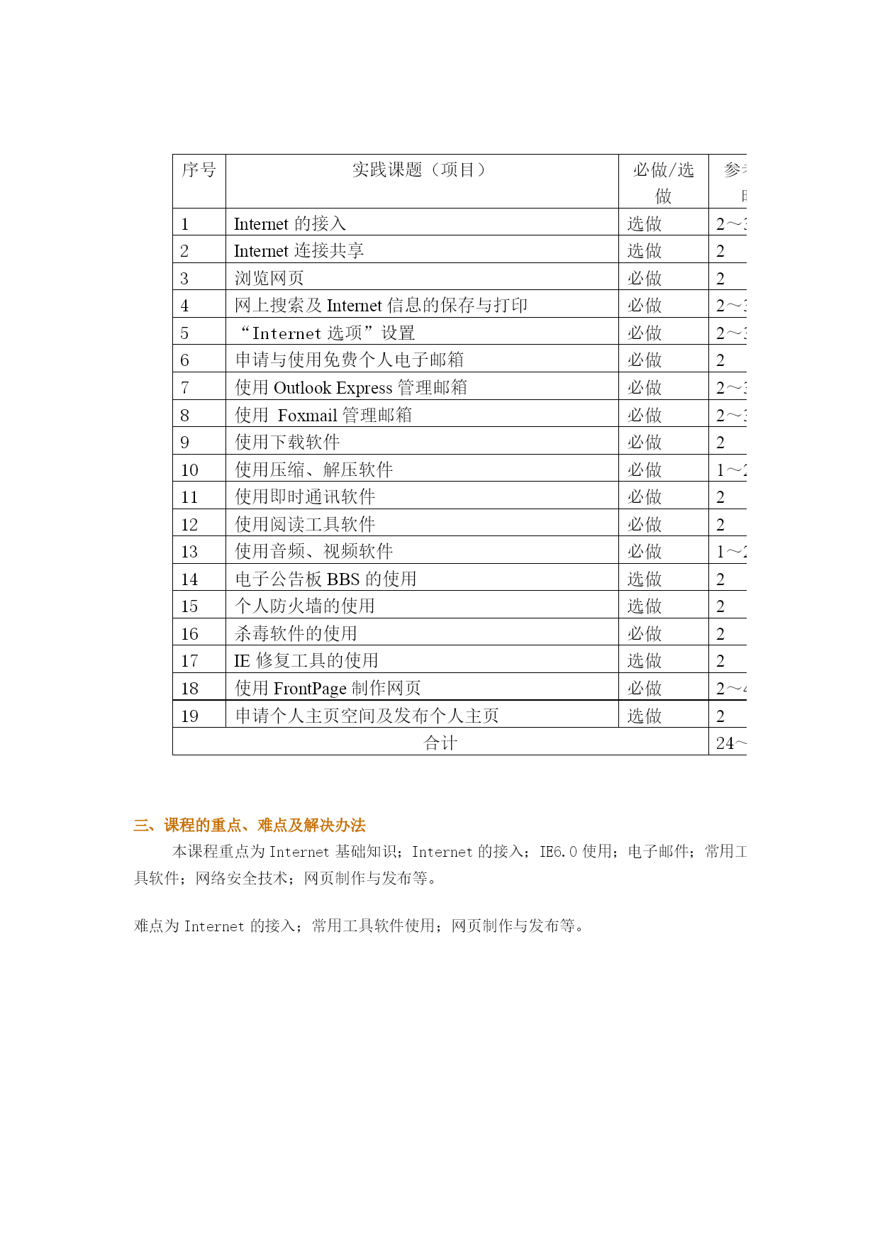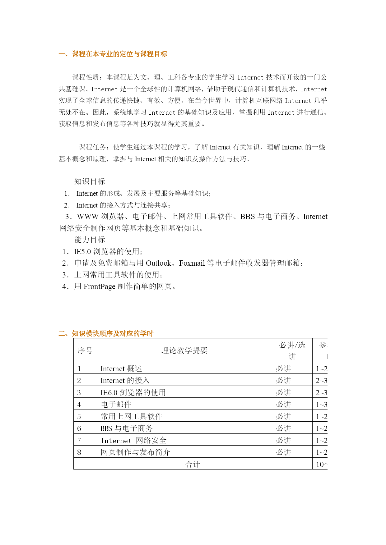 一、课程在本专业的定位与课程目标课程性质:本课程是为文、理、工科各专业的学生学习Internet技术而开设的一门公共基础课。Internet是一个全球性的计算机网络,借助于现代通信和计算机技术,Internet实现了全球信息的传递快捷、有效、方便,在当今世界中,计算机互联网络Internet几乎无处不在。因此,系统地学习Internet的基础知识及应用,掌握利用Internet进行通信、获取信息和发布信息等各种技巧就显得尤其重要。课程任务:使学生通过本课程的学习,了解Internet有关知识,理解Internet的一些基本概念和原理,掌握与Internet相关的知识及操作方法与技巧。知识目标1.Internet的形成、发展及主要服务等基础知识;2.Internet的接入方式与连接共享;3.WWW浏览器、电子邮件、上网常用工具软件、BBS与电子商务、Internet网络安全制作网页等基本概念和基础知识。能力目标1.IE5.0浏览器的使用;2.申请及免费邮箱与用Outlook、Foxmail等电子邮件收发器管理邮箱;3.上网常用工具软件的使用;4.用FrontPage制作简单的网页。二、知识模块顺序及对应的学时序号理论教学提要必讲/选讲参考学时1Internet概述必讲1~22Internet的接入必讲2~33IE6.0浏览器的使用必讲2~34电子邮件必讲1~35常用上网工具软件必讲1~26BBS与电子商务必讲1~27Internet网络安全必讲1~28网页制作与发布简介必讲1~2合计10~19序号实践课题(项目)必做/选做参考学时1Internet的接入选做2~32Internet连接共享选做23浏览网页必做24网上搜索及Internet信息的保存与打印必做2~35“Internet选项”设置必做2~36申请与使用免费个人电子邮箱必做27使用OutlookExpress管理邮箱必做2~38使用Foxmail管理邮箱必做2~39使用下载软件必做210使用压缩、解压软件必做1~211使用即时通讯软件必做212使用阅读工具软件必做213使用音频、视频软件必做1~214电子公告板BBS的使用选做215个人防火墙的使用选做216杀毒软件的使用必做217IE修复工具的使用选做218使用FrontPage制作网页必做2~419申请个人主页空间及发布个人主页选做2合计24~45三、课程的重点、难点及解决办法本课程重点为Internet基础知识;Internet的接入;IE6.0使用;电子邮件;常用工具软件;网络安全技术;网页制作与发布等。难点为Internet的接入;常用工具软件使用;网页制作与发布等。