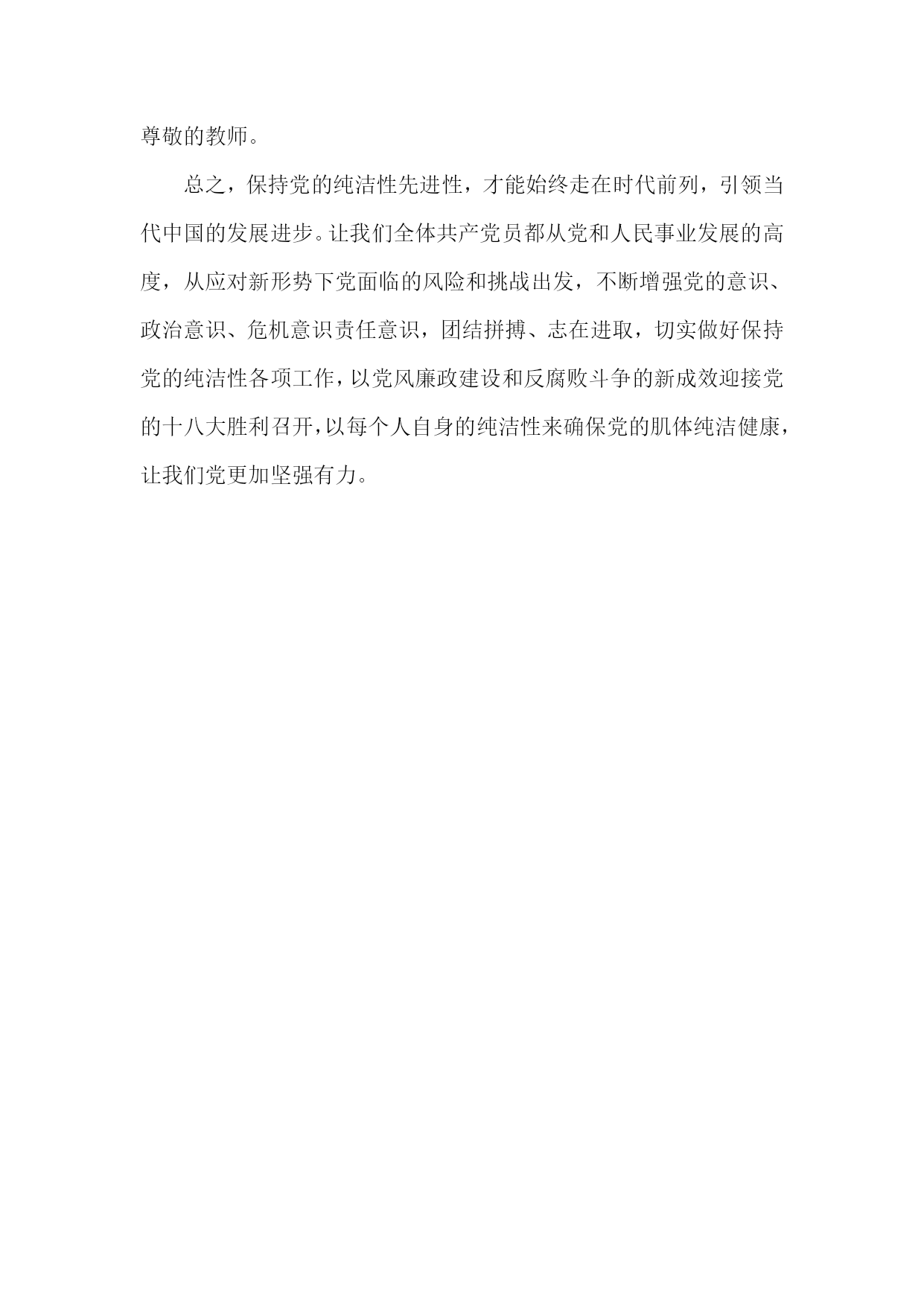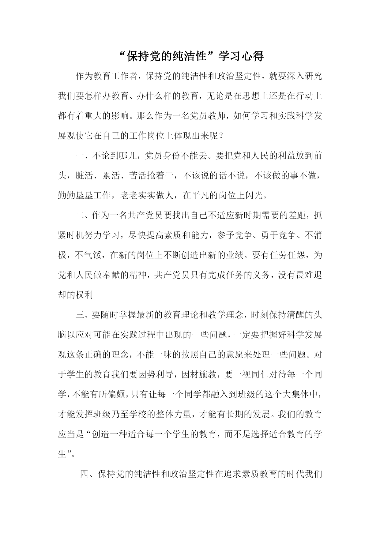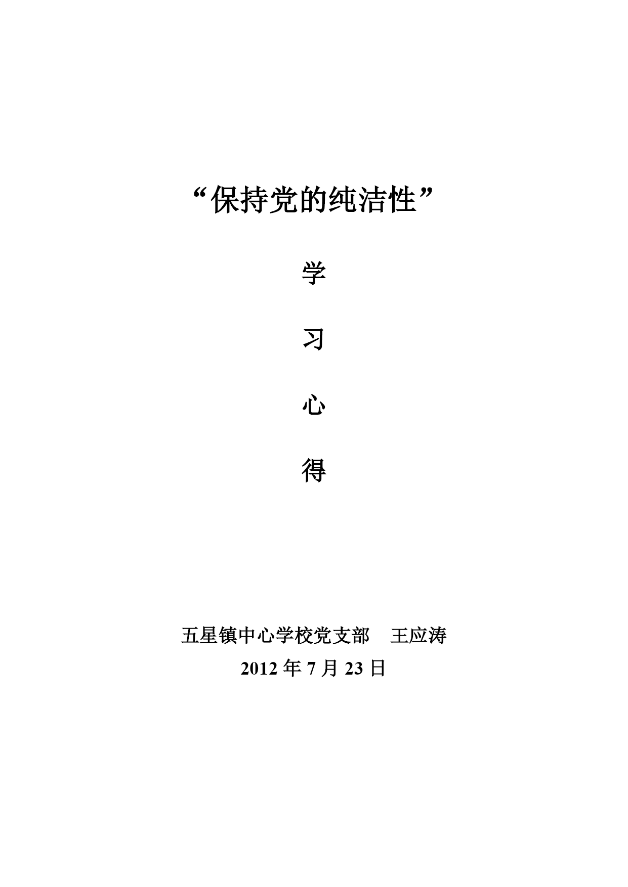 “保持党的纯洁性”学习心得五星镇中心学校党支部王应涛2012年7月23日“保持党的纯洁性”学习心得作为教育工作者,保持党的纯洁性和政治坚定性,就要深入研究我们要怎样办教育、办什么样的教育,无论是在思想上还是在行动上都有着重大的影响。那么作为一名党员教师,如何学习和实践科学发展观使它在自己的工作岗位上体现出来呢?一、不论到哪儿,党员身份不能丢。要把党和人民的利益放到前头,脏活、累活、苦活抢着干,不该说的话不说,不该做的事不做,勤勤垦垦工作,老老实实做人,在平凡的岗位上闪光。二、作为一名共产党员要找出自己不适应新时期需要的差距,抓紧时机努力学习,尽快提高素质和能力,参予竞争、勇于竞争、不消极,不气馁,在新的岗位上不断创造出新的业绩。要有任劳任怨,为党和人民做奉献的精神,共产党员只有完成任务的义务,没有畏难退却的权利三、要随时掌握最新的教育理论和教学理念,时刻保持清醒的头脑以应对可能在实践过程中出现的一些问题,一定要把握好科学发展观这条正确的理念,不能一味的按照自己的意愿来处理一些问题。对于学生的教育我们要因势利导,因材施教,要一视同仁对待每一个同学,不能有所偏颇,只有让每一个同学都融入到班级的这个大集体中,才能发挥班级乃至学校的整体力量,才能有长期的发展。我们的教育应当是“创造一种适合每一个学生的教育,而不是选择适合教育的学生”。四、保持党的纯洁性和政治坚定性在追求素质教育的时代我们要充分本着“一切为了学生,为了一切学生,为了学生一切”的教育理念,在教学工作中要关心学生,无论是学习上还是生活中,充分尊重学生的思想和学习方法。我们还要深入到学生中去,去了解学生的想法和做法。不能一味按照教师自己的意愿来控制学生的一切行为。教师应该最为知识的传授者和引导着,学生才是学习的主题要充分发挥学生主观能动性,调动学生的学习积极性。这样才能让学生热爱学习,从学习中找到乐趣。教师应该是导演的角色,学生是演员,只有演员入戏才能把戏演好。学习就是如此,只有让学生动起来,才能摒弃其他的坏习惯,把精力投入到学习中去。五、学习新的教育理念来武装自己的头脑,学习教学方法提高自己的业务水平。掌握本学科最前沿的研究成果,增强科研意识和改革意识,积极参与教育改革,在实践中提高自己的教育教学能力。现在社会是知识爆炸的年代,我们不能满足现状,而要勇于探索勇于创新勇于在教学过程中实践,争做教学改革的领导者和示范者。六、教师在学生心目中占有很大的位置,教师的一言一行都在潜移默化的影响着学生,一个有良好师德的教师应站在学生和家长的立场及处境思考问题,把学生和家长的意愿与发展需要摆在第一位。良好的师德在学生和家长心中都是受到十分的钦佩和尊敬的。每个家长都希望孩子在良好的教育环境下接受教育,我们教师要提高自身的师德修养。教师还要有奉献精神,要发扬吃苦在前,享受在后的精神。教师这一职业只要有无私的奉献精神,那么你就成功了一半。把科学发展观和奉献精神结合在一起,那么就是一个成功的、高尚的、受人尊敬的教师。总之,保持党的纯洁性先进性,才能始终走在时代前列,引领当代中国的发展进步。让我们全体共产党员都从党和人民事业发展的高度,从应对新形势下党面临的风险和挑战出发,不断增强党的意识、政治意识、危机意识责任意识,团结拼搏、志在进取,切实做好保持党的纯洁性各项工作,以党风廉政建设和反腐败斗争的新成效迎接党的十八大胜利召开,以每个人自身的纯洁性来确保党的肌体纯洁健康,让我们党更加坚强有力。