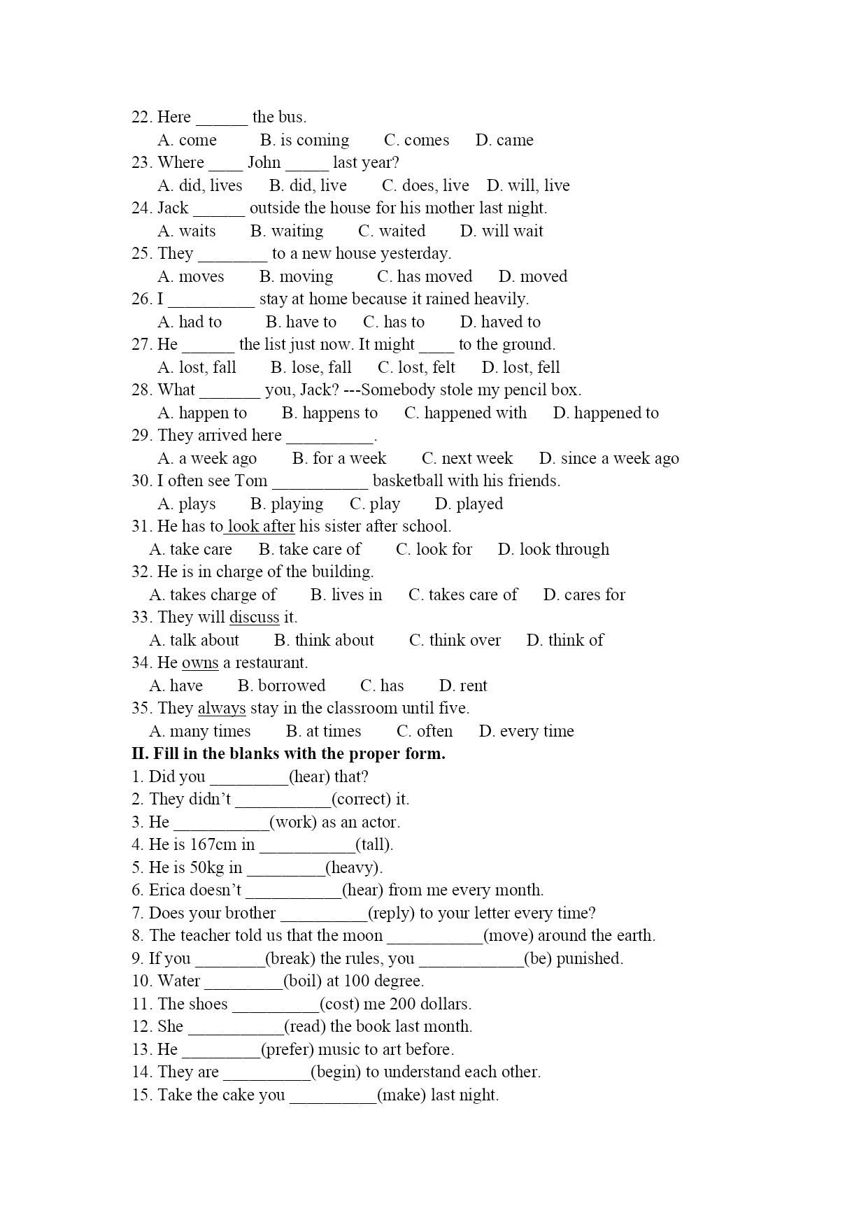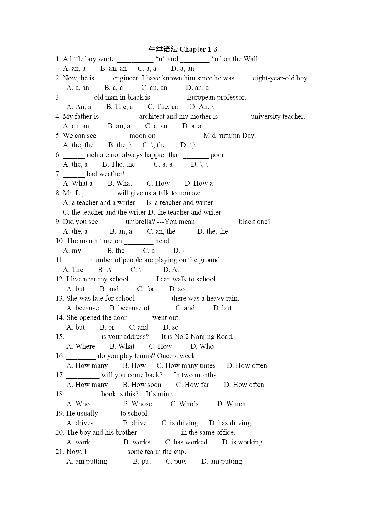 牛津语法Chapter1-31.Alittleboywrote__________“u”and________“n”ontheWall.A.an,aB.an,anC.a,aD.a,an2.Now,heis____engineer.Ihaveknownhimsincehewas____eight-year-oldboy.A.a,anB.a,aC.an,anD.an,a3.________oldmaninblackis_________Europeanprofessor.A.An,aB.The,aC.The,anD.An,\4.Myfatheris__________architectandmymotheris________universityteacher.A.an,anB.an,aC.a,anD.a,a5.Wecansee________moonon____________Mid-autumnDay.A.the,theB.the,\C.\,theD.\,\6.______richarenotalwayshappierthan_______poor.A.the,aB.The,theC.a,aD.\,\7.______badweather!A.WhataB.WhatC.HowD.Howa8.Mr.Li,________willgiveusatalktomorrow.A.ateacherandawriterB.ateacherandwriterC.theteacherandthewriterD.theteacherandwriter9.Didyousee_______umbrella?---Youmean___________blackone?A.the,aB.an,aC.an,theD.the,the10.Themanhitmeon________head.A.myB.theC.aD.\11.______numberofpeopleareplayingontheground.A.TheB.AC.\D.An12.Ilivenearmyschool,______Icanwalktoschool.A.butB.andC.forD.so13.Shewaslateforschool_________therewasaheavyrain.A.becauseB.becauseofC.andD.but14.Sheopenedthedoor______wentout.A.butB.orC.andD.so15._________isyouraddress?--ItisNo.2NanjingRoad.A.WhereB.WhatC.HowD.Who16.________doyouplaytennis?Onceaweek.A.HowmanyB.HowC.HowmanytimesD.Howoften17._________willyoucomeback?Intwomonths.A.HowmanyB.HowsoonC.HowfarD.Howoften18._________bookisthis?It’smine.A.WhoB.WhoseC.Who’sD.Which19.Heusually_____toschool..A.drivesB.driveC.isdrivingD.hasdriving20.Theboyandhisbrother___________inthesameoffice.A.workB.worksC.hasworkedD.isworking21.Now,I__________someteainthecup.A.amputtingB.putC.putsD.amputting22.Here______thebus.A.comeB.iscomingC.comesD.came23.Where____John_____lastyear?A.did,livesB.did,liveC.does,liveD.will,live24.Jack______outsidethehouseforhismotherlastnight.A.waitsB.waitingC.waitedD.willwait25.They________toanewhouseyesterday.A.movesB.movingC.hasmovedD.moved26.I__________stayathomebecauseitrainedheavily.A.hadtoB.havetoC.hastoD.havedto27.He______thelistjustnow.Itmight____totheground.A.lost,fallB.lose,fallC.lost,feltD.lost,fel