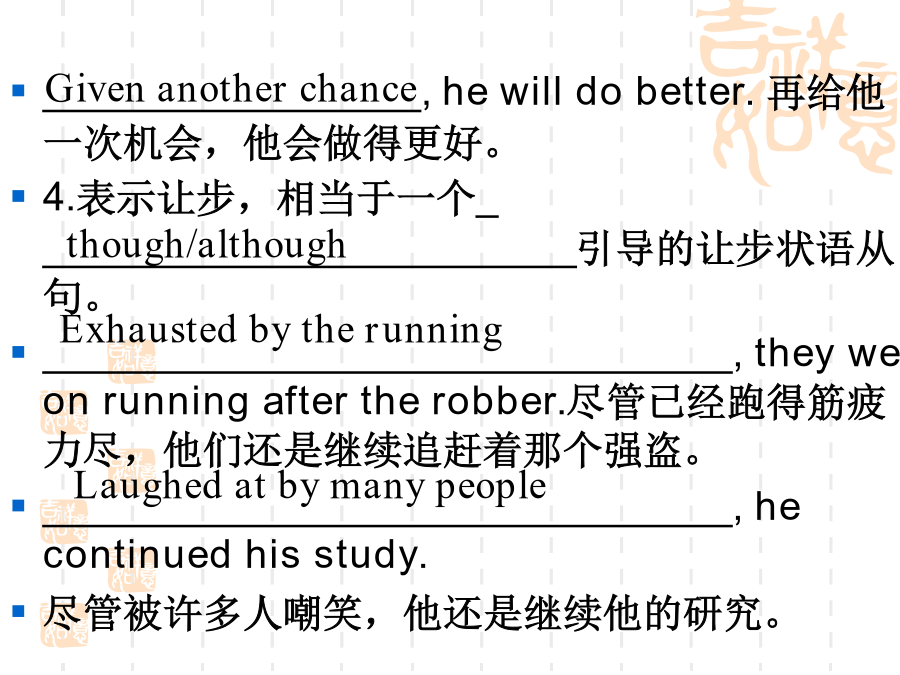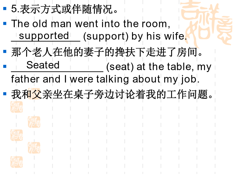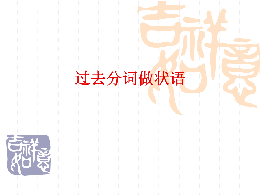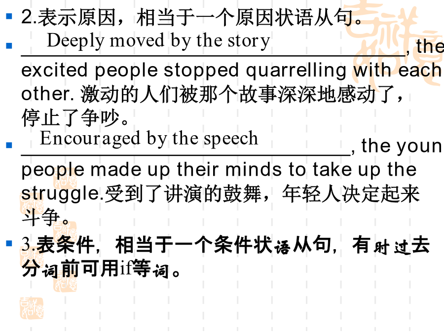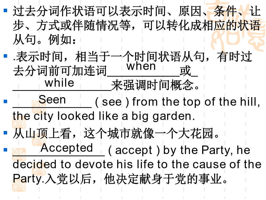 过去分词做状语过去分词作状语可以表示时间、原因、条件、让步、方式或伴随情况等,可以转化成相应的状语从句。例如:.表示时间,相当于一个时间状语从句,有时过去分词前可加连词___________或________________来强调时间概念。____________(see)fromthetopofthehill,thecitylookedlikeabiggarden.从山顶上看,这个城市就像一个大花园。______________(accept)bytheParty,hedecidedtodevotehislifetothecauseoftheParty.入党以后,他决定献身于党的事业。2.表示原因,相当于一个原因状语从句。___________________________________,theexcitedpeoplestoppedquarrellingwitheachother.激动的人们被那个故事深深地感动了,停止了争吵。______________________________,theyoungpeoplemadeuptheirmindstotakeupthestruggle.受到了讲演的鼓舞,年轻人决定起来斗争。3.表条件,相当于一个条件状语从句,有时过去分词前可用if等词。_________________,hewilldobetter.再给他一次机会,他会做得更好。4.表示让步,相当于一个_________________________引导的让步状语从句。_______________________________,theywentonrunningaftertherobber.尽管已经跑得筋疲力尽,他们还是继续追赶着那个强盗。_______________________________,hecontinuedhisstudy.尽管被许多人嘲笑,他还是继续他的研究。5.表示方式或伴随情况。Theoldmanwentintotheroom,____________(support)byhiswife.那个老人在他的妻子的搀扶下走进了房间。________________(seat)atthetable,myfatherandIweretalkingaboutmyjob.我和父亲坐在桌子旁边讨论着我的工作问题。过去分词做状语需要注意的几个问题二.现在分词和过去分词作状语时的用法比较_____________________________________,youwillsucceed.如果你努力,你会成功的。____________________________________,heremainedapopularboxer.虽然他被击败了,但他仍然是一个受人喜爱的拳击手。三.分词的时态和语态牛刀小试:1.Thesecretaryworkedlateintothenight,___alongspeechforthepresident.A.toprepareB.preparingC.preparedD.waspreparing2.___areply,hedecidedtowriteagain.A.NotreceivingB.ReceivingnotC.NothavingreceivedD.Havingnotreceived四.某些分词可用来表示说话人对所说的话所持的看法或态度,它们已变成固定词组,在句中作独立成分,与句子主语无关。这类现在分词常见的有:given(倘若……,假定……),generallyspeaking(一般地说),strictlyspeaking(严格地说),judgingfrom/by...(从……来判断),talkingof...(说到……),considering...(考虑到……),supposing...(假定……)等。Generallyspeaking,itisnoteasyforaforeignertolearnChinesewellinashorttime.五.有些分词已经形容词化,做状语时已看不出被动和完成的意义,常见的有:interested,worried,satisfied,pleased,surprised,disappointed等。Worriedabouthistablemanners,hedecidedtodoeverythingasthehostdid.分词的独立结构2)独立结构有时也可以用“with/without+名词(或代词的宾语)+分词”的结构,表示伴随状况。例如:Theysattheresilently,(with)theireyesfixedonthelake.他们静静地坐在那里,眼睛看着湖面。牛刀小试:1.Fordtrieddividin