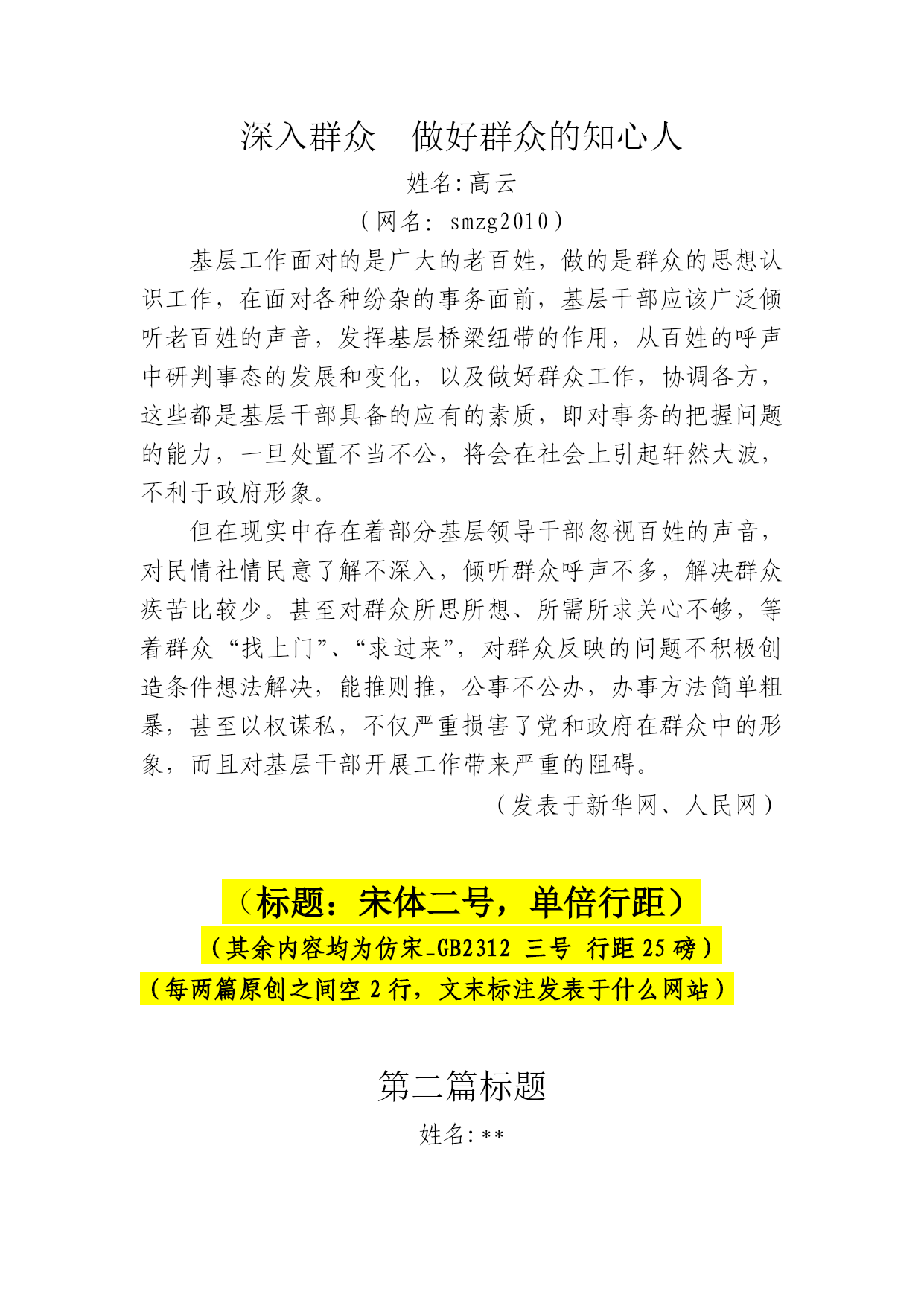 深入群众做好群众的知心人姓名:高云(网名:smzg2010)基层工作面对的是广大的老百姓,做的是群众的思想认识工作,在面对各种纷杂的事务面前,基层干部应该广泛倾听老百姓的声音,发挥基层桥梁纽带的作用,从百姓的呼声中研判事态的发展和变化,以及做好群众工作,协调各方,这些都是基层干部具备的应有的素质,即对事务的把握问题的能力,一旦处置不当不公,将会在社会上引起轩然大波,不利于政府形象。但在现实中存在着部分基层领导干部忽视百姓的声音,对民情社情民意了解不深入,倾听群众呼声不多,解决群众疾苦比较少。甚至对群众所思所想、所需所求关心不够,等着群众“找上门”、“求过来”,对群众反映的问题不积极创造条件想法解决,能推则推,公事不公办,办事方法简单粗暴,甚至以权谋私,不仅严重损害了党和政府在群众中的形象,而且对基层干部开展工作带来严重的阻碍。(发表于新华网、人民网)(标题:宋体二号,单倍行距)(其余内容均为仿宋_GB2312三号行距25磅)(每两篇原创之间空2行,文末标注发表于什么网站)第二篇标题姓名:**(网名:***)