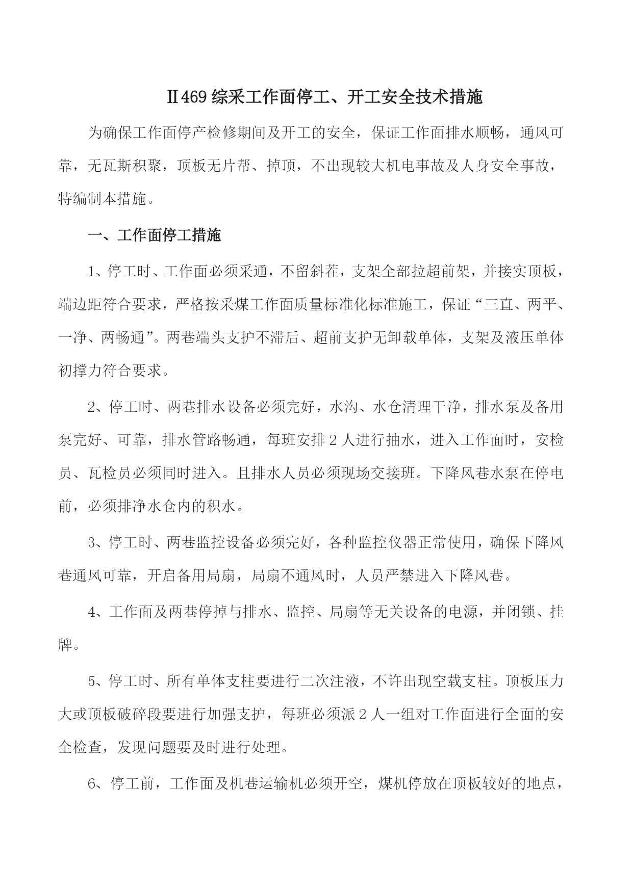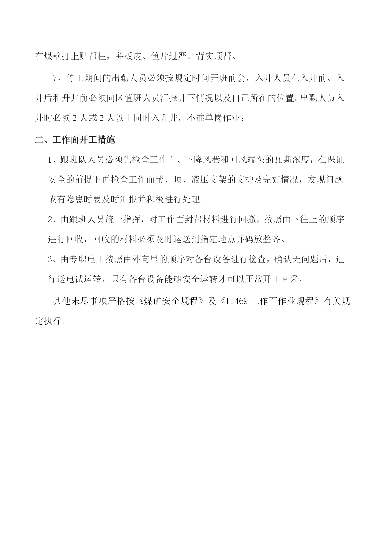 Ⅱ469综采工作面停工、开工安全技术措施为确保工作面停产检修期间及开工的安全,保证工作面排水顺畅,通风可靠,无瓦斯积聚,顶板无片帮、掉顶,不出现较大机电事故及人身安全事故,特编制本措施。一、工作面停工措施1、停工时、工作面必须采通,不留斜茬,支架全部拉超前架,并接实顶板,端边距符合要求,严格按采煤工作面质量标准化标准施工,保证“三直、两平、一净、两畅通”。两巷端头支护不滞后、超前支护无卸载单体,支架及液压单体初撑力符合要求。2、停工时、两巷排水设备必须完好,水沟、水仓清理干净,排水泵及备用泵完好、可靠,排水管路畅通,每班安排2人进行抽水,进入工作面时,安检员、瓦检员必须同时进入。且排水人员必须现场交接班。下降风巷水泵在停电前,必须排净水仓内的积水。3、停工时、两巷监控设备必须完好,各种监控仪器正常使用,确保下降风巷通风可靠,开启备用局扇,局扇不通风时,人员严禁进入下降风巷。4、工作面及两巷停掉与排水、监控、局扇等无关设备的电源,并闭锁、挂牌。5、停工时、所有单体支柱要进行二次注液,不许出现空载支柱。顶板压力大或顶板破碎段要进行加强支护,每班必须派2人一组对工作面进行全面的安全检查,发现问题要及时进行处理。6、停工前,工作面及机巷运输机必须开空,煤机停放在顶板较好的地点,在煤壁打上贴帮柱,并板皮、笆片过严、背实顶帮。7、停工期间的出勤人员必须按规定时间开班前会,入井人员在入井前、入井后和升井前必须向区值班人员汇报井下情况以及自己所在的位置。出勤人员入井时必须2人或2人以上同时入升井,不准单岗作业;二、工作面开工措施1、跟班队人员必须先检查工作面、下降风巷和回风端头的瓦斯浓度,在保证安全的前提下再检查工作面帮、顶、液压支架的支护及完好情况,发现问题或有隐患时要及时汇报并积极进行处理。2、由跟班人员统一指挥,对工作面封帮材料进行回撤,按照由下往上的顺序进行回收,回收的材料必须及时运送到指定地点并码放整齐。3、由专职电工按照由外向里的顺序对各台设备进行检查,确认无问题后,进行送电试运转,只有各台设备能够安全运转才可以正常开工回采。其他未尽事项严格按《煤矿安全规程》及《II469工作面作业规程》有关规定执行。