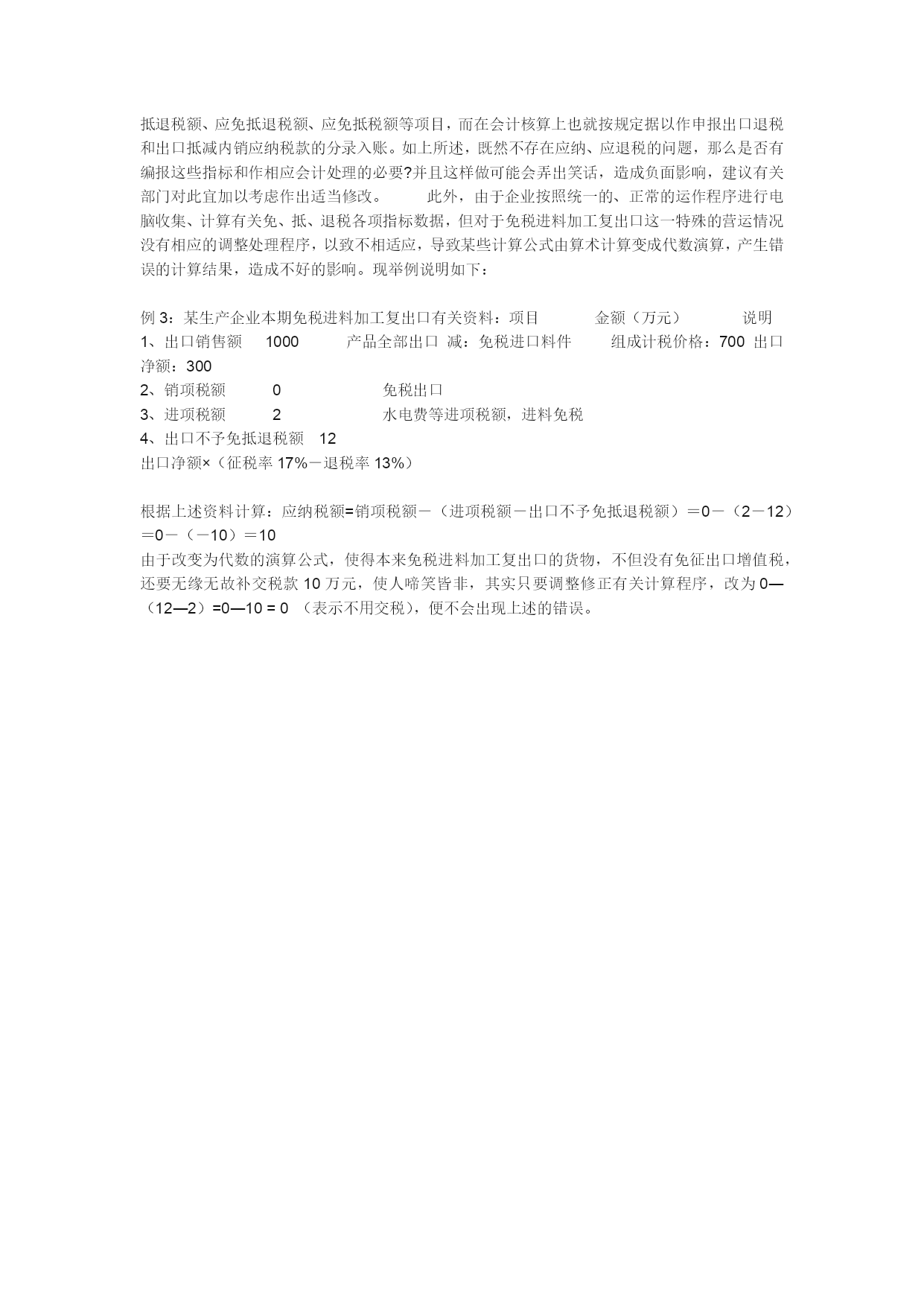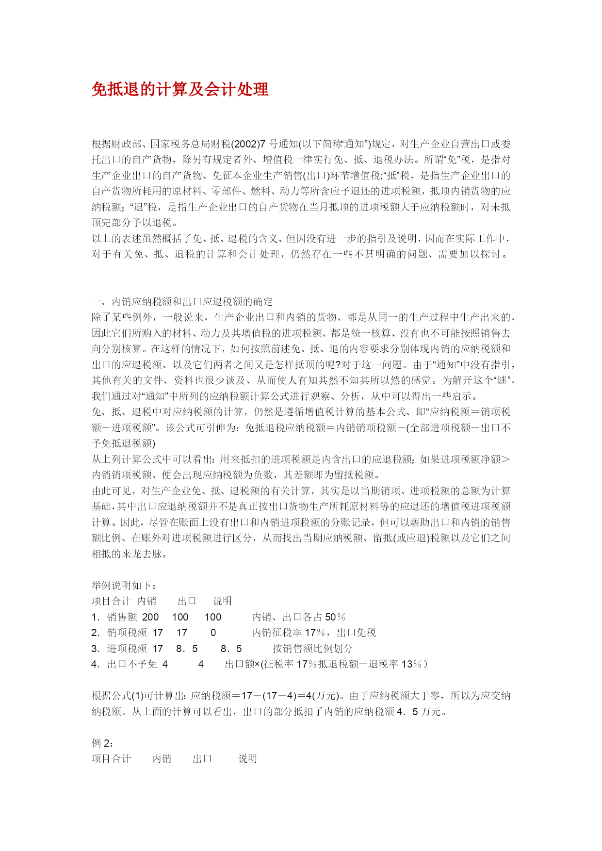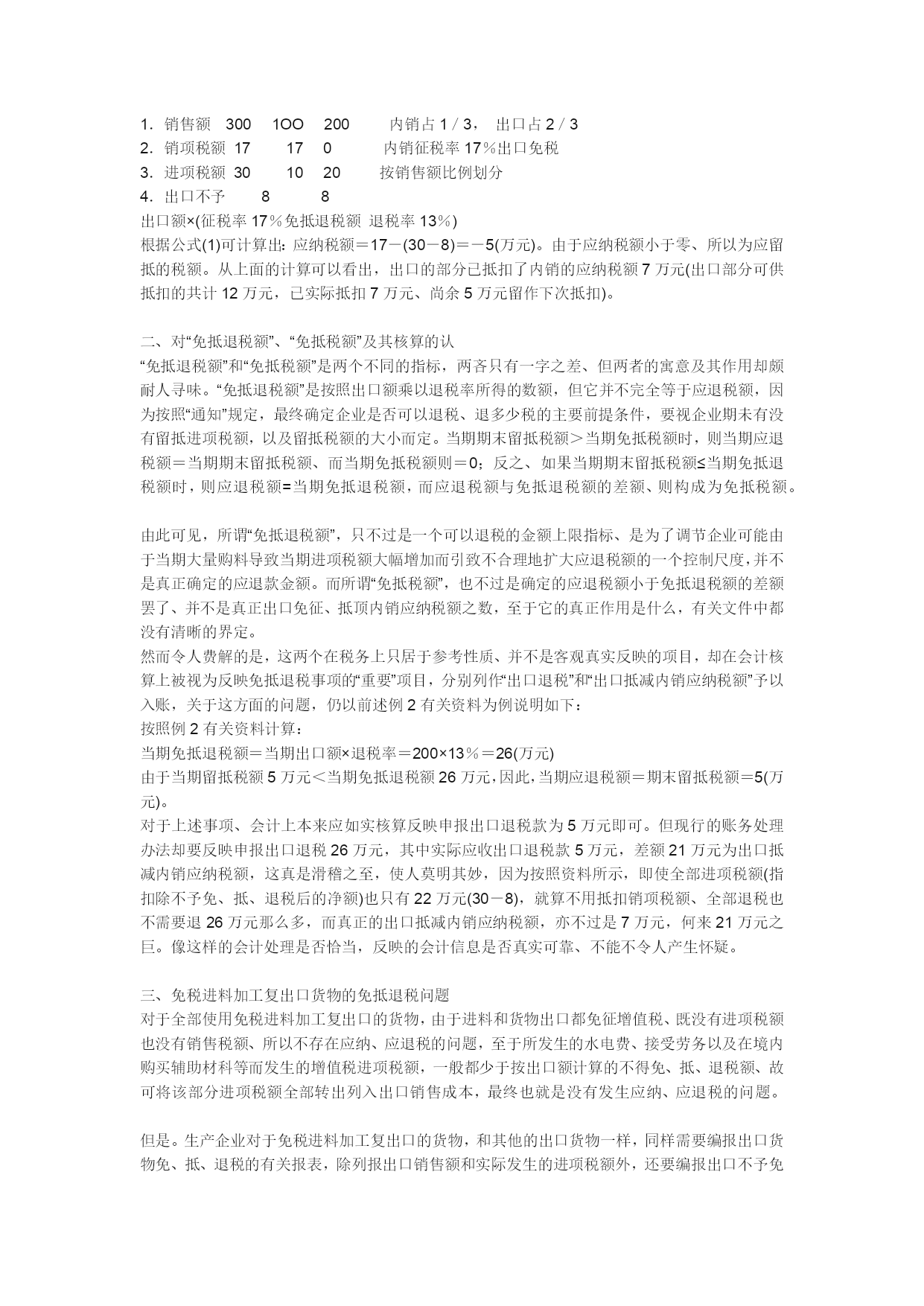免抵退的计算及会计处理根据财政部、国家税务总局财税(2002)7号通知(以下简称“通知”)规定,对生产企业自营出口或委托出口的自产货物,除另有规定者外、增值税一律实行免、抵、退税办法。所谓“免”税,是指对生产企业出口的自产货物、免征本企业生产销售(出口)环节增值税;“抵”税,是指生产企业出口的自产货物所耗用的原材料、零部件、燃科、动力等所含应予退还的进项税额,抵顶内销货物的应纳税额;“退”税,是指生产企业出口的自产货物在当月抵顶的进项税额大于应纳税额时,对未抵顶完部分予以退税。以上的表述虽然概括了免、抵、退税的含义、但因没有进一步的指引及说明,因而在实际工作中,对于有关免、抵、退税的计算和会计处理,仍然存在一些不甚明确的问题、需要加以探讨。一、内销应纳税额和出口应退税额的确定除了某些例外,一般说来,生产企业出口和内销的货物、都是从同一的生产过程中生产出来的,因此它们所购入的材料、动力及其增值税的进项税额、都是统一核算、没有也不可能按照销售去向分别核算。在这样的情况下,如何按照前述免、抵、退的内容要求分别体现内销的应纳税额和出口的应退税额、以及它们两者之间又是怎样抵顶的呢?对于这一问题。由于“通知”中没有指引,其他有关的文件、资料也很少谈及、从而使人有知其然不知其所以然的感觉。为解开这个“谜”,我们通过对“通知”中所列的应纳税额计算公式进行观察、分析,从中可以得出一些启示。免、抵、退税中对应纳税额的计算,仍然是遵循增值税计算的基本公式、即“应纳税额=销项税额-进项税额”。该公式可引伸为:免抵退税应纳税额=内销销项税额-(全部进项税额-出口不予免抵退税额)从上列计算公式中可以看出:用来抵扣的进项税额是内含出口的应退税额;如果进项税额净额>内销销项税额、便会出现应纳税额为负数,其差额即为留抵税额。由此可见,对生产企业免、抵、退税额的有关计算,其实是以当期销项、进项税额的总额为计算基础,其中出口应退纳税额并不是真正按出口货物生产所耗原材料等的应退还的增值税进项税额计算。因此,尽管在账面上没有出口和内销进项税额的分账记录,但可以藉助出口和内销的销售额比例、在账外对进项税额进行区分,从而找出当期应纳税额、留抵(或应退)税额以及它们之间相抵的来龙去脉。举例说明如下:项目合计内销出口说明1.销售额200100100内销、出口各占50%2.销项税额17170内销征税率17%,出口免税3.进项税额178.58.5按销售额比例划分4.出口不予免44出口额×(征税率17%抵退税额-退税率13%)根据公式(1)可计算出:应纳税额=17-(17-4)=4(万元)。由于应纳税额大于零,所以为应交纳纳税额。从上面的计算可以看出,出口的部分抵扣了内销的应纳税额4.5万元。例2:项目合计内销出口说明1.销售额3001OO200内销占1/3,出口占2/32.销项税额17170内销征税率17%出口免税3.进项税额301020按销售额比例划分4.出口不予88出口额×(征税率17%免抵退税额退税率13%)根据公式(1)可计算出:应纳税额=17-(30-8)=-5(万元)。由于应纳税额小于零、所以为应留抵的税额。从上面的计算可以看出,出口的部分已抵扣了内销的应纳税额7万元(出口部分可供抵扣的共计12万元,已实际抵扣7万元、尚余5万元留作下次抵扣)。二、对“免抵退税额”、“免抵税额”及其核算的认“免抵退税额”和“免抵税额”是两个不同的指标,两吝只有一字之差、但两者的寓意及其作用却颇耐人寻味。“免抵退税额”是按照出口额乘以退税率所得的数额,但它并不完全等于应退税额,因为按照“通知”规定,最终确定企业是否可以退税、退多少税的主要前提条件,要视企业期未有没有留抵进项税额,以及留抵税额的大小而定。当期期末留抵税额>当期免抵税额时,则当期应退税额=当期期末留抵税额、而当期免抵税额则=0;反之、如果当期期末留抵税额≤当期免抵退税额时,则应退税额=当期免抵退税额,而应退税额与免抵退税额的差额、则构成为免抵税额。由此可见,所谓“免抵退税额”,只不过是一个可以退税的金额上限指标、是为了调节企业可能由于当期大量购料导致当期进项税额大幅增加而引致不合理地扩大应退税额的一个控制尺度,并不是真正确定的应退款金额。而所谓“免抵税额”,也不过是确定的应退税额小于免抵退税额的差额罢了、并不是真正出口免征、抵顶内销应纳税额之数,至于它的真正作用是什么,有关文件中都没有清晰的界定。然而令人费解的是,这两个在税务上只居于参考性质、并不是客观真实反映的项目,却在会计核算上被视为反映免抵退税事项的“重要”项目,分别列作“出口退税”和“出口抵减内销应纳税额”予以入账,关于这方面的问题,仍以前述例2有关资料为例说明如下:按照例2有关资料计算:当期免抵退税额=当期出口额×退税率=200×13%=26(万元)由于当期留抵税