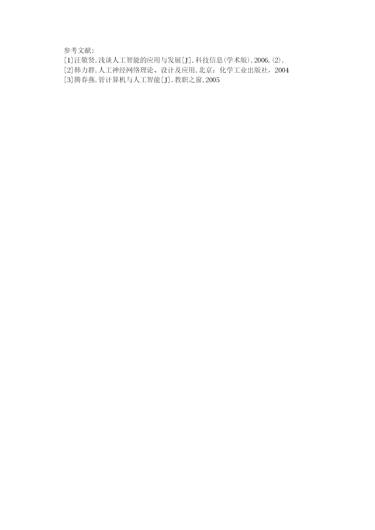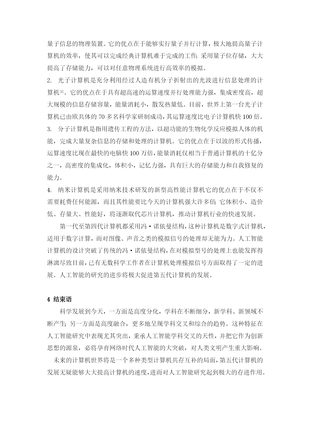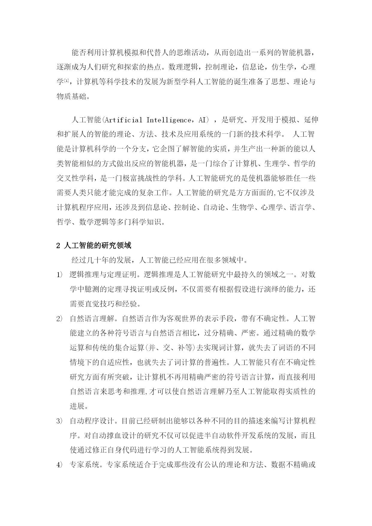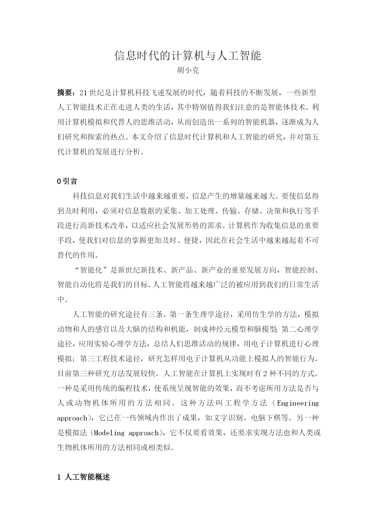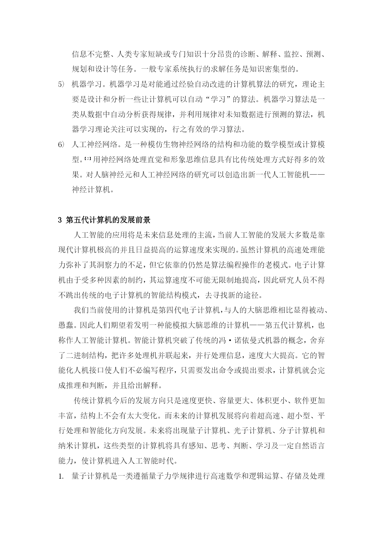 信息时代的计算机与人工智能胡小克摘要:21世纪是计算机科技飞速发展的时代,随着科技的不断发展,一些新型人工智能技术正在走进人类的生活,其中特别值得我们注意的是智能体技术。利用计算机模拟和代替人的思维活动,从而创造出一系列的智能机器,逐渐成为人们研究和探索的热点。本文介绍了信息时代计算机和人工智能的研究,并对第五代计算机的发展进行分析。0引言科技信息对我们生活中越来越重要,信息产生的增量越来越大。要使信息得到及时利用,必须对信息数据的采集、加工处理、传输、存储、决策和执行等手段进行高新技术改革,以适应社会发展形势的需求。计算机作为收集信息的重要手段,使我们对信息的掌握更加及时、便捷,因此在社会生活中越来越起着不可替代的作用。“智能化”是新世纪新技术、新产品、新产业的重要发展方向,智能控制、智能自动化将是我们的目标。人工智能将越来越广泛的被应用到我们的日常生活中。人工智能的研究途径有三条。第一条生理学途径,采用仿生学的方法,模拟动物和人的感官以及大脑的结构和机能,制成神经元模型和脑模型;第二心理学途径,应用实验心理学方法,总结人们思维活动的规律,用电子计算机进行心理模拟;第三工程技术途径,研究怎样用电子计算机从功能上模拟人的智能行为。目前第三种研究方法发展较快。人工智能在计算机上实现时有2种不同的方式。一种是采用传统的编程技术,使系统呈现智能的效果,而不考虑所用方法是否与人或动物机体所用的方法相同。这种方法叫工程学方法(Engineeringapproach),它已在一些领域内作出了成果,如HYPERLINK"http://baike.baidu.com/view/852619.htm"\t"_blank"文字识别、电脑下棋等。另一种是模拟法(Modelingapproach),它不仅要看效果,还要求实现方法也和人类或生物机体所用的方法相同或相类似。1人工智能概述能否利用计算机模拟和代替人的思维活动,从而创造出一系列的智能机器,逐渐成为人们研究和探索的热点。数理逻辑,控制理论,信息论,仿生学,心理学[1],计算机等科学技术的发展为新型学科人工智能的诞生准备了思想、理论与物质基础。人工智能(ArtificialIntelligence,AI),是研究、开发用于模拟、延伸和扩展人的智能的理论、方法、技术及应用系统的一门新的技术科学。人工智能是计算机科学的一个分支,它企图了解智能的实质,并生产出一种新的能以人类智能相似的方式做出反应的智能机器,是一门综合了计算机、生理学、哲学的交叉性学科,是一门极富挑战性的学科。人工智能研究的是使机器能够胜任一些需要人类只能才能完成的复杂工作。人工智能的研究是方方面面的,它不仅涉及计算机程序应用,还涉及到信息论、控制论、自动论、生物学、心理学、语言学、哲学、数学逻辑等多门科学知识。2人工智能的研究领域经过几十年的发展,人工智能已经应用在很多领域中。逻辑推理与定理证明。逻辑推理是人工智能研究中最持久的领域之一。对数学中臆测的定理寻找证明或反例,不仅需要有根据假设进行演绎的能力,还需要直觉技巧和经验。自然语言理解。自然语言作为客观世界的表示手段,带有不确定性。人工智能建立的各种符号语言与自然语言相比,过分精确、严密。通过精确的数学运算和传统的集合运算(并、交、补等)去实现词计算,就失去了词语的不同情境下的自适应性,也就失去了词计算的普遍性。人工智能只有在不确定性研究方面有所突破,让计算机不再用精确严密的符号语言计算,而直接利用自然语言来思考和推理,才可以使自然语言理解乃至人工智能取得实质性的进展。自动程序设计。目前已经研制出能够以各种不同的目的描述来编写计算机程序。对自动撑血设计的研究不仅可以促进半自动软件开发系统的发展,而且使通过修正自身代码进行学习的人工智能系统得到发展。专家系统。专家系统适合于完成那些没有公认的理论和方法、数据不精确或信息不完整、人类专家短缺或专门知识十分昂贵的诊断、解释、监控、预测、规划和设计等任务。一般专家系统执行的求解任务是知识密集型的。机器学习。机器学习是对能通过经验自动改进的计算机算法的研究,理论主要是设计和分析一些让HYPERLINK"http://zh.wikipedia.org/wiki/%E8%AE%A1%E7%AE%97%E6%9C%BA"\o"计算机"计算机可以自动“HYPERLINK"http://zh.wikipedia.org/wiki/%E5%AD%A6%E4%B9%A0"\o"学习"学习”的算法。机器学习算法是一类从数据中自动分析获得规律,并利用规律对未知数据进行预测的算法,机器学习理论关注可以实现的,行之有效的学习算法。人工神经网络。是一种模仿HYPERLINK"http://zh.wikipedia.org/wiki/%E7%94