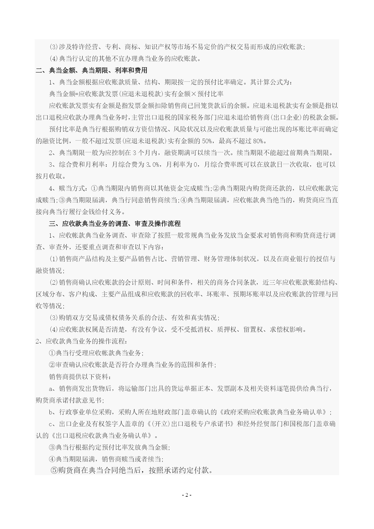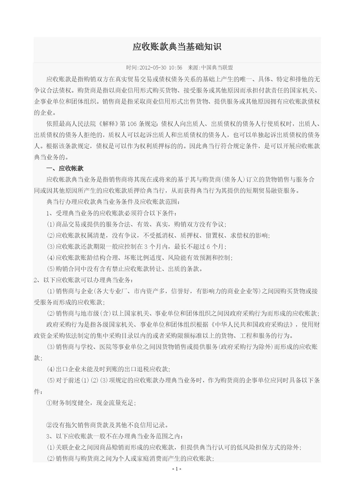 PAGE-2-应收账款典当基础知识时间:2012-05-3010:56来源:中国典当联盟应收账款是指购销双方在真实贸易交易或债权债务关系的基础上产生的唯一、具体、特定和排他的无争议合法债权。购货商是指以商业信用形式购买货物、接受服务或其他原因而承担付款责任的国家机关、企事业单位和团体组织。销售商是指采取商业信用形式出售货物、提供服务或其他原因拥有应收账款债权的企业。依照最高人民法院《解释》第106条规定:债权人向出质人、出质债权的债务人行使质权时,出质人、出质债权的债务人拒绝的,质权人可以起诉出质人和出质债权的债务人,也可以单独起诉出质债权的债务人。根据该条款规定,债权是可以作为权利质押标的的。因此典当行符合规定条件,是可以开展应收帐款典当业务的。一、应收帐款应收帐款典当业务是指销售商将其现在或将来的基于其与购货商(债务人)订立的货物销售与服务合同或因其他原因所产生的应收账款质押给典当行,从而获得典当行为其提供的短期贸易融资服务。典当行办理应收款典当业务条件及应收账款范围:1、受理典当业务的应收账款必须符合以下条件:(1)商品交易或提供的服务合法、有效、真实,购销双方没有争议;(2)应收账款权属清楚,没有争议,不受抵消权、质押权、留置权、求偿权的影响;(3)应收账款还款期限一般应控制在3个月内,最长不超过6个月;(4)应收账款账龄结构合理、坏账比例适度、风险能有效预测和控制;(5)购销合同中没有含有禁止应收账款转让、出质的条款。2、以下应收账款可以办理典当业务:(1)销售商与企业(各大专业厂、市内资产多,信誉好,有影响力的商业企业等)之间因购买货物或接受服务而形成的应收账款;(2)销售商与地市级(含)以上国家机关、事业单位和团体组织之间因政府采购行为而形成的应收账款;政府采购行为是指各级国家机关、事业单位和团体组织根据《中华人民共和国政府采购法》,使用财政资金采购依法制定的集中采购目录以内的或者采购限额标准以上的货物、工程和服务的行为。(3)销售商与学校、医院等事业单位之间因货物销售或提供服务(政府采购行为除外)而形成的应收账款;(4)出口企业未能及时到账的出口退税应收款;(5)对于前述(1)(2)(3)项规定的应收账款办理典当业务时,作为购货商的企事单位应同时具备以下条件:①财务制度健全,现金流量充足;②没有拖欠销售商货款及其他不良信用记录。3、以下应收账款一般不在办理典当业务范围之内:(1)关联企业之间因商品赊销而形成的应收账款,但提供典当行认可的低风险担保方式的除外;(2)销售商与购货商之间为个人或家庭消费而产生的应收账款;(3)涉及特许经营、专利、商标、知识产权等市场不易定价的产权交易而形成的应收账款;(4)典当行认定的其他不宜办理典当业务的应收账款。二、典当金额、典当期限、利率和费用1、典当金额根据应收账款质量、结构、期限按一定的预付比率确定。其计算公式为:典当金额=应收账款发票(应退未退税款)实有金额×预付比率应收账款发票实有金额是指发票金额扣除销售商已回笼货款后的余额。应退未退税款实有金额是指以出口退税应收款办理典当业务时,主管出口退税的国家税务部门应退未退给销售商(出口企业)的税款金额。预付比率是典当行根据购销双方资信情况、风险状况以及应收账款质量与可能出现的坏账比率而确定的融资比例,一般不超过发票(应退未退税款)实有金额的50%,最高不超过80%。2、典当期限一般为应控制在3个月内,融资期满可以续当一次。续当期限不能超过前期典当期限。3、综合费和月利率:月综合费为3.0%,月利率为0,月综合费率既可以在放款日一次收取,也可以按月收取。4、赎当方式:①典当期限内销售商以其他资金完成赎当;②典当期限内购货商还款的,以应收帐款完成赎当;③典当期限届满,典当行同意销售商续当;④典当期限届满,应收帐款典当绝当的,购货商应当直接向典当行履行金钱给付义务。三、应收款典当业务的调查、审查及操作流程1、应收帐款典当业务调查、审查除了按照一般常规典当业务发放当金要求对销售商和购货商进行调查、审查外,还要重点调查和审查以下内容:(1)销售商产品结构及主要产品销售占比、营销管理、财务管理体制状况,以及在商业银行的授信与融资情况;(2)销售商确认应收账款的会计原则、时间和条件,相关的商务合同条款,近三年应收账款账龄结构、区域分布、客户构成、主要产品组成和应收账款的回收率、坏账率、预期坏账率以及应收账款的管理与回收等情况;(3)购销双方交易或债权债务关系的合法、有效和真实情况;(4)应收账款权属是否清楚,有没有争议,受不受抵消权、质押权、留置权、求偿权影响。2、应收款典当业务的操作流程:①典当行受理应收帐款典当业务;②审查确认应收账款是否符合办理典当业务的范围和条件;销售商提供以下资料:a、销售商发出货物后,将运输部